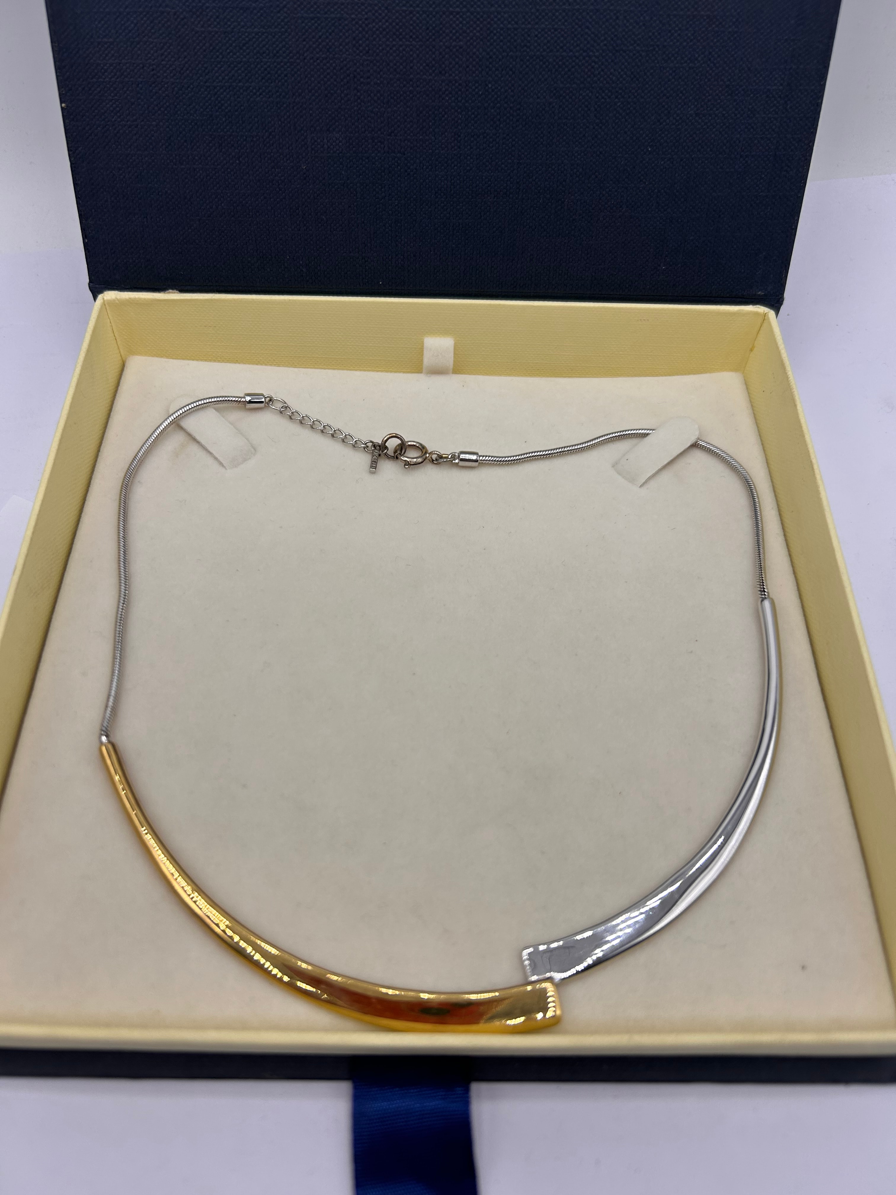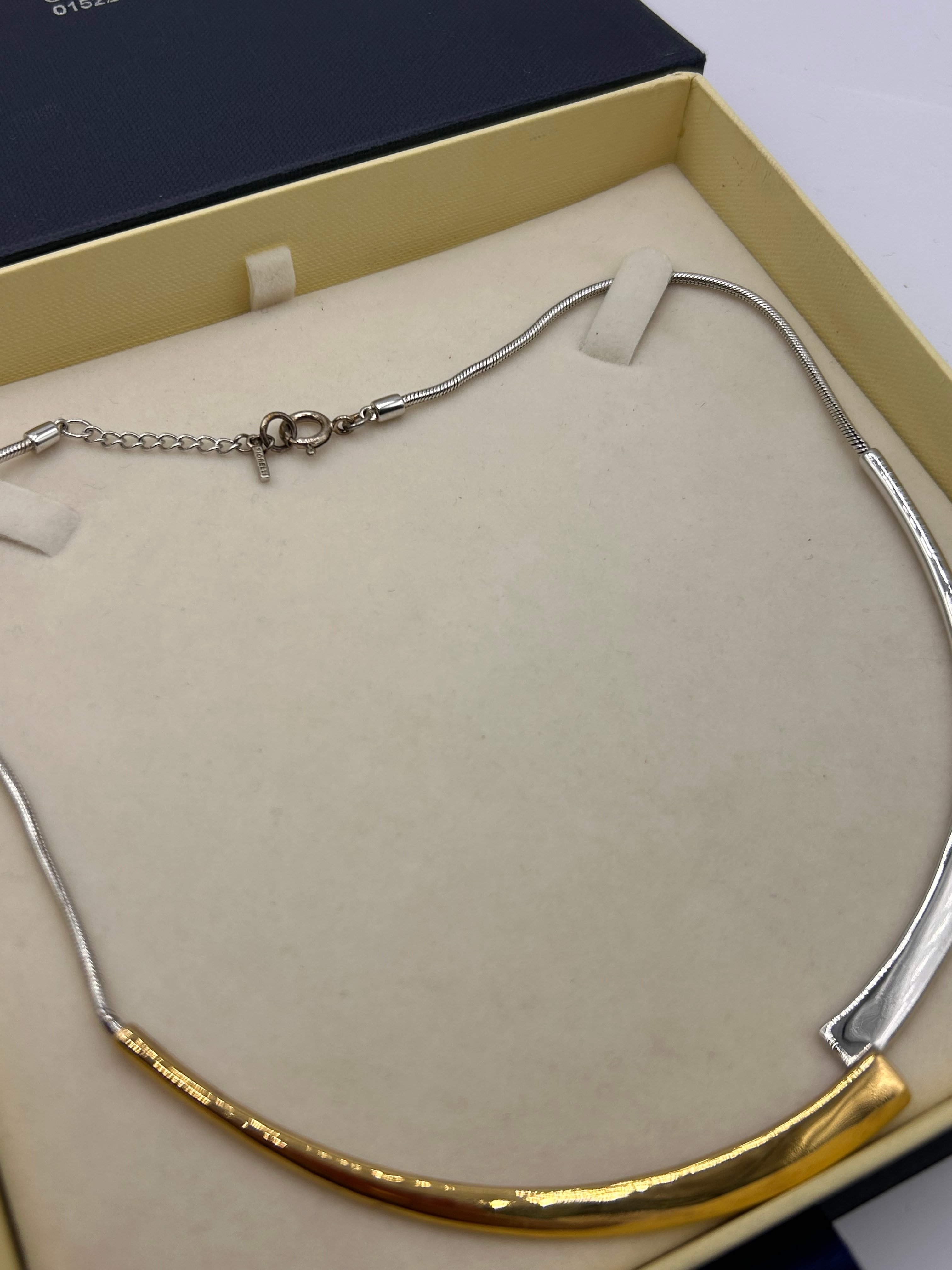 A Fiorelli bi-color collar necklace. This modern-style necklace features a rigid, curved front section crafted from silver, with a prominent gilded segment transitioning to a polished silver segment. It is completed by a flexible silver snake chain leading to a lobster claw clasp and an adjustable extender chain. A small rectangular tag attached near the clasp is clearly marked ‘FIORELLI’. The necklace is presented within a padded, two-piece gift box.