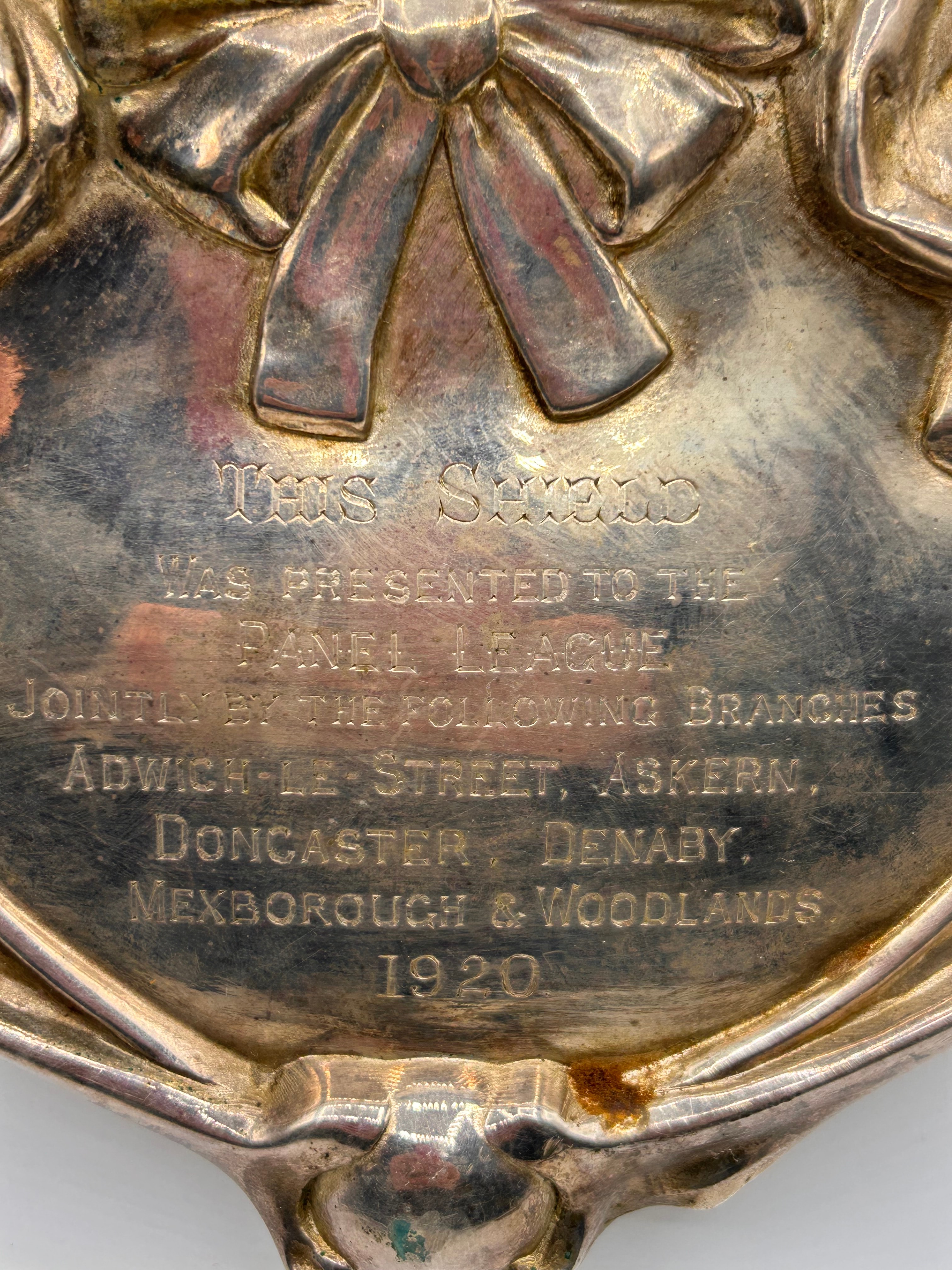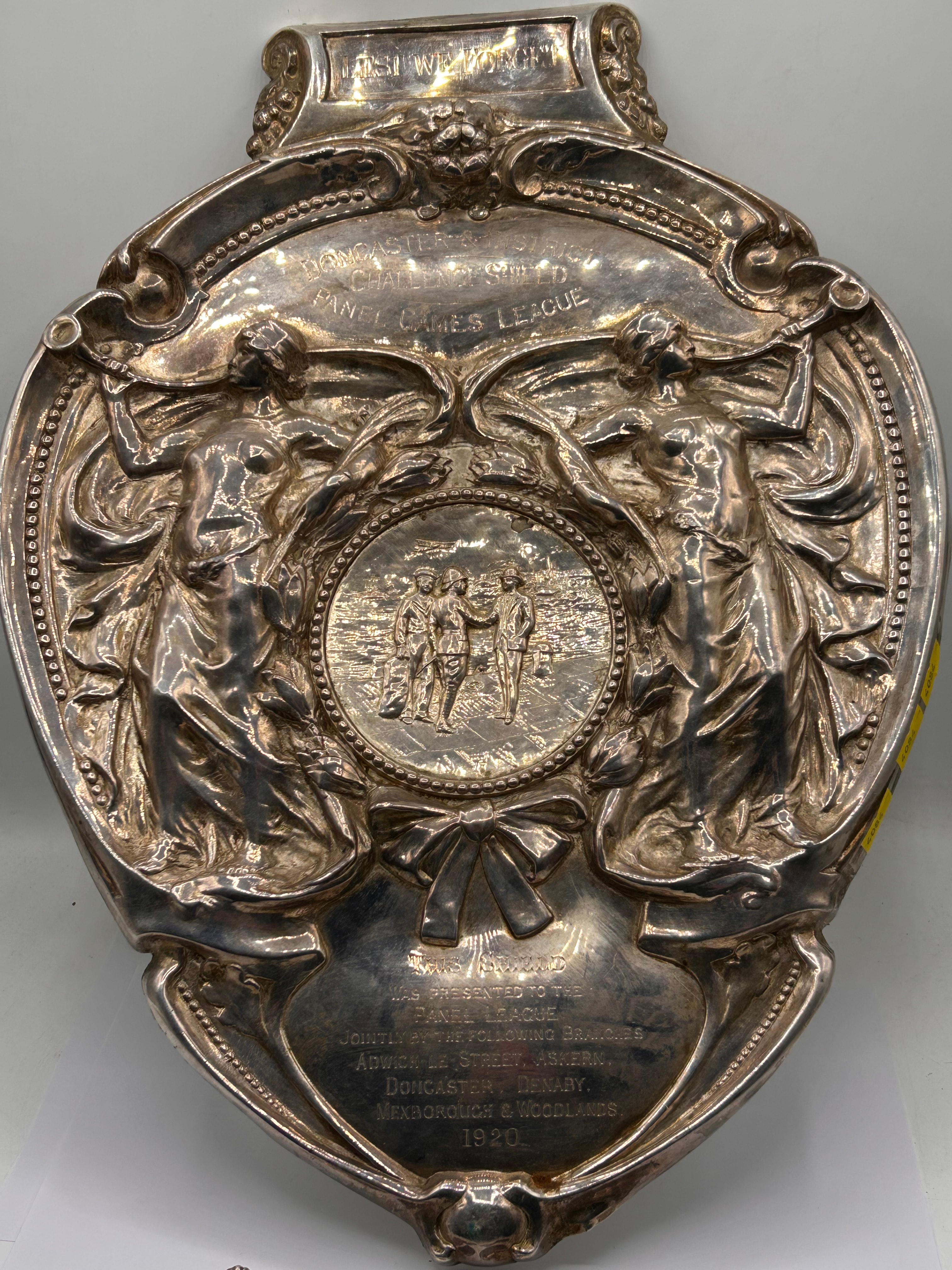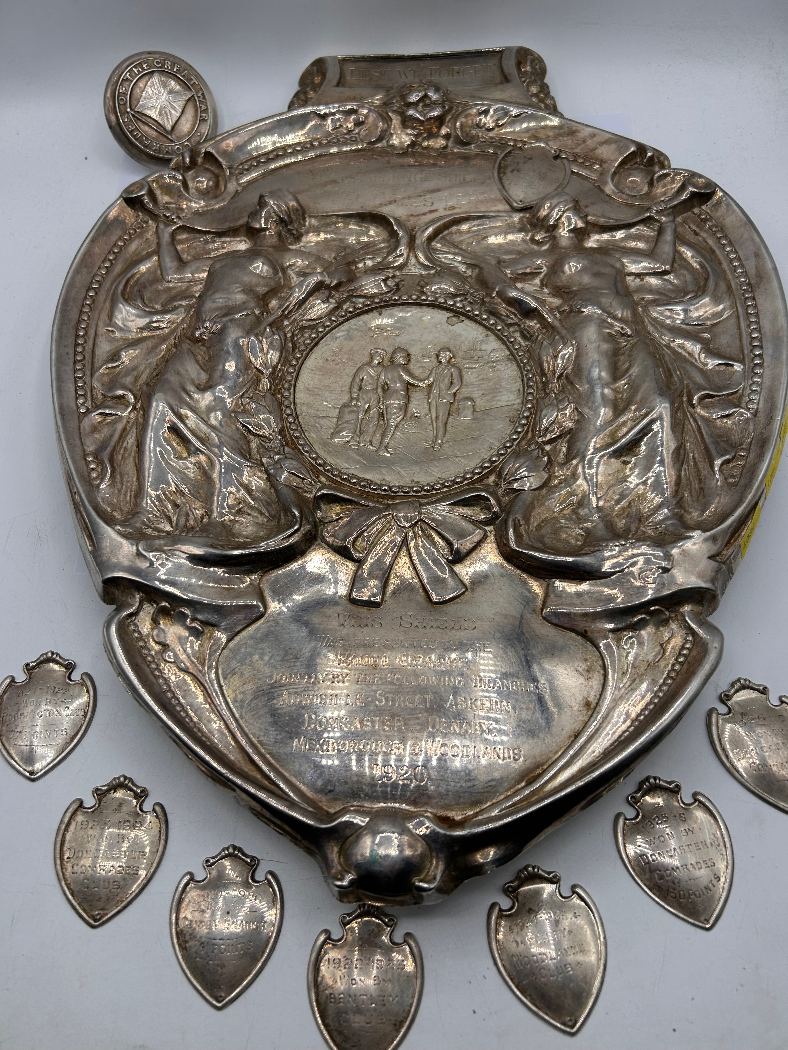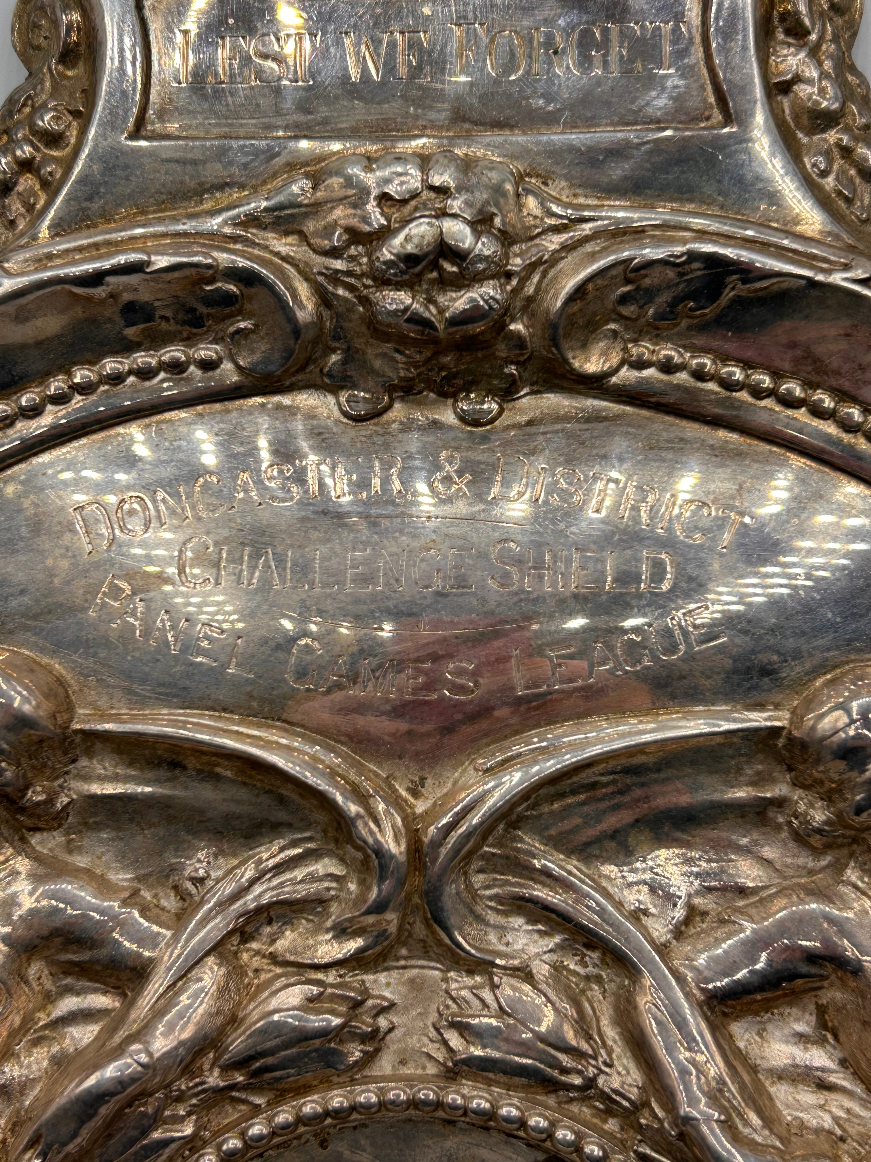 A large, ornate metal challenge shield, likely silver-plated, featuring elaborate relief decoration typical of the early 20th century. The central design depicts two allegorical female figures flanking a medallion with three male figures in an industrial or port landscape. Engraved text at the top reads “LEST WE FORGET”, followed by “DONCASTER & DISTRICT CHALLENGE SHIELD” and “PANEL GAMES LEAGUE”. Below a decorative bow, further inscription details: “This Shield WAS PRESENTED TO THE PANEL LEAGUE JOINTLY BY THE FOLLOWING BRANCHES ADWICK-LE-STREET, ASKERN, DONCASTER, DENABY, MEXBOROUGH & WOODLANDS 1920”. Accompanying the main shield is a group of smaller, detached shield-shaped plaques, intended as annual winner plates. These plaques display engraved dates ranging from “1920-1921” to “1926-7”, along with “WON BY” and various club names including “ROSSINGTON CLUB”, “WOODLANDS CLUB”, “DONCASTER COMRADES”, “BENTLEY CLUB”, and “ADWICK LE STREET BRANCH”.