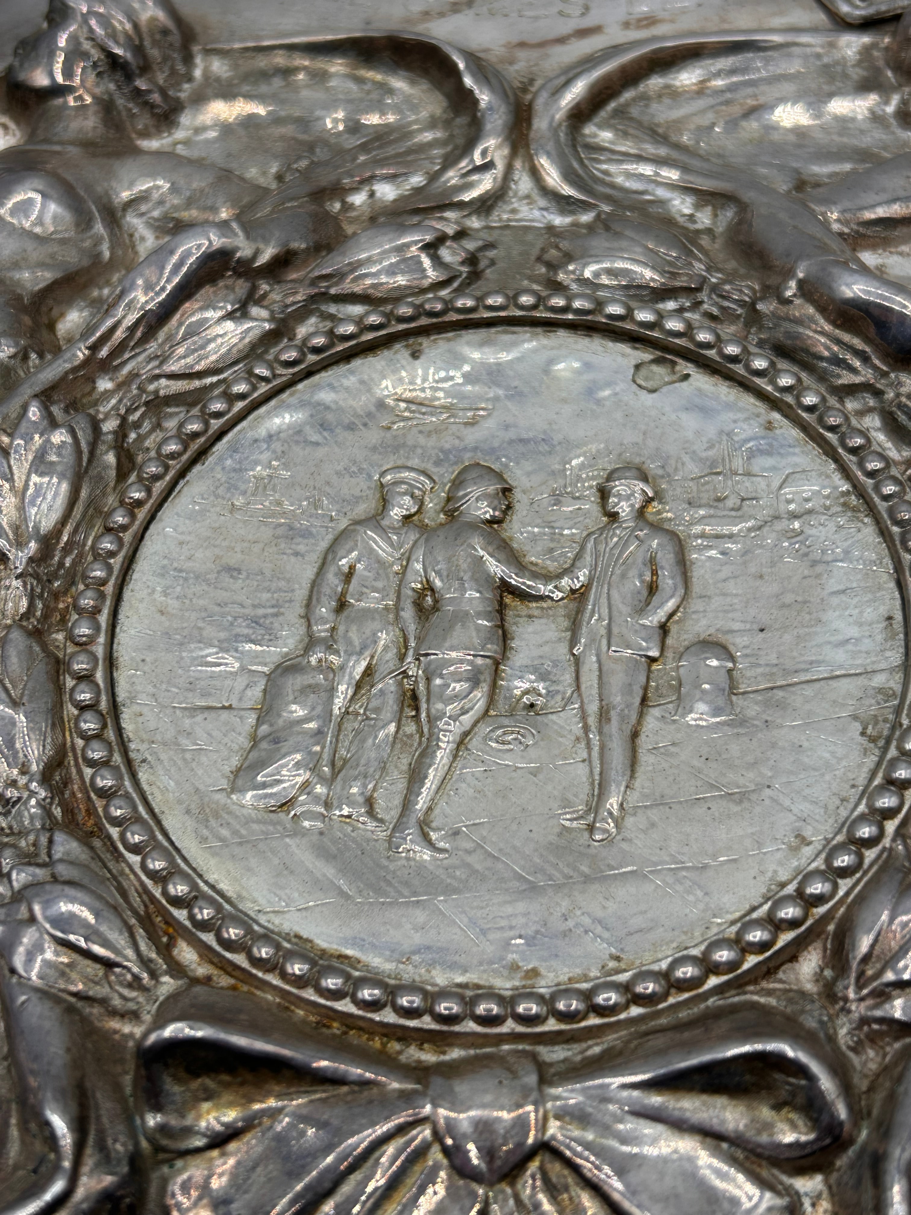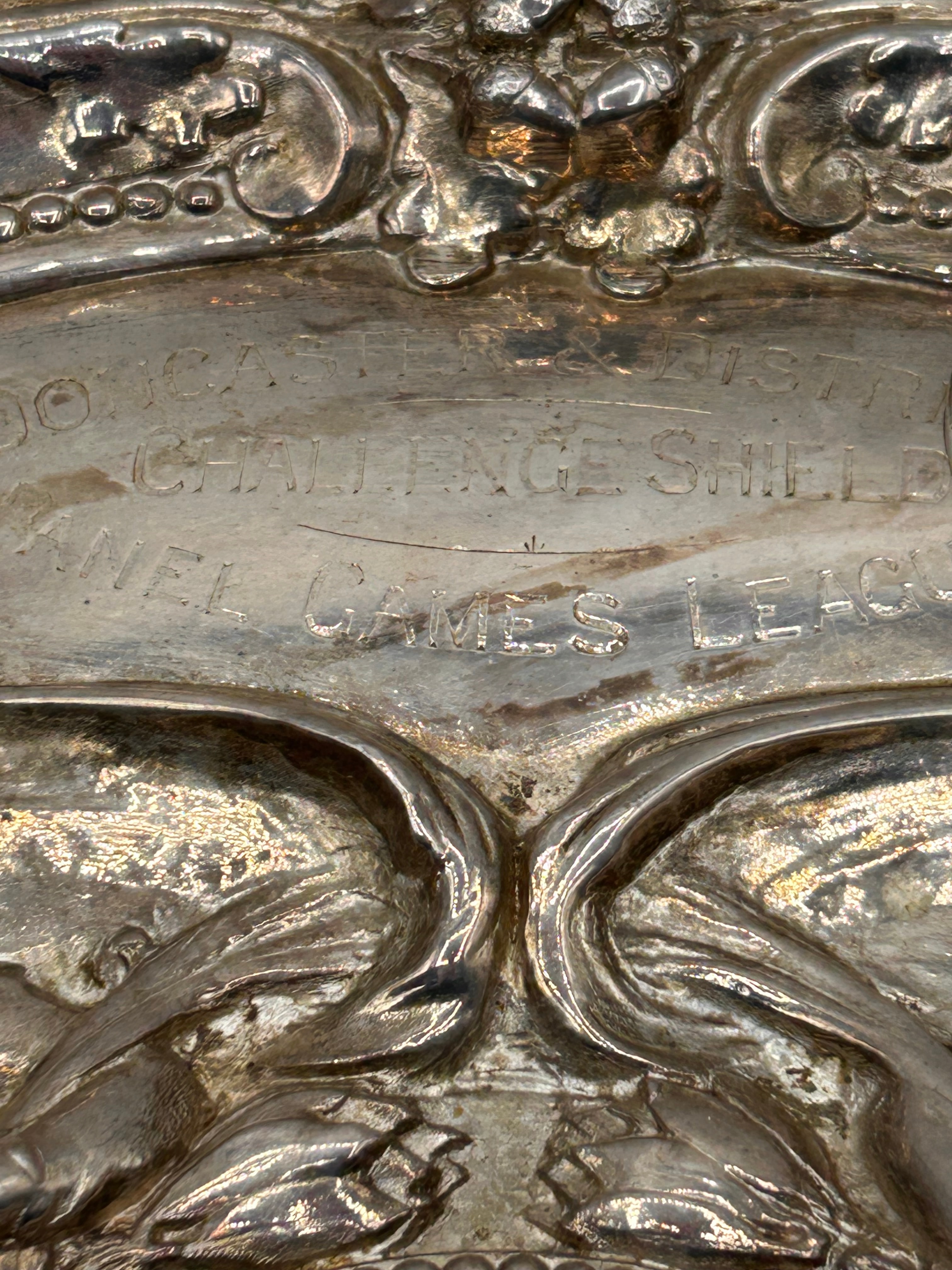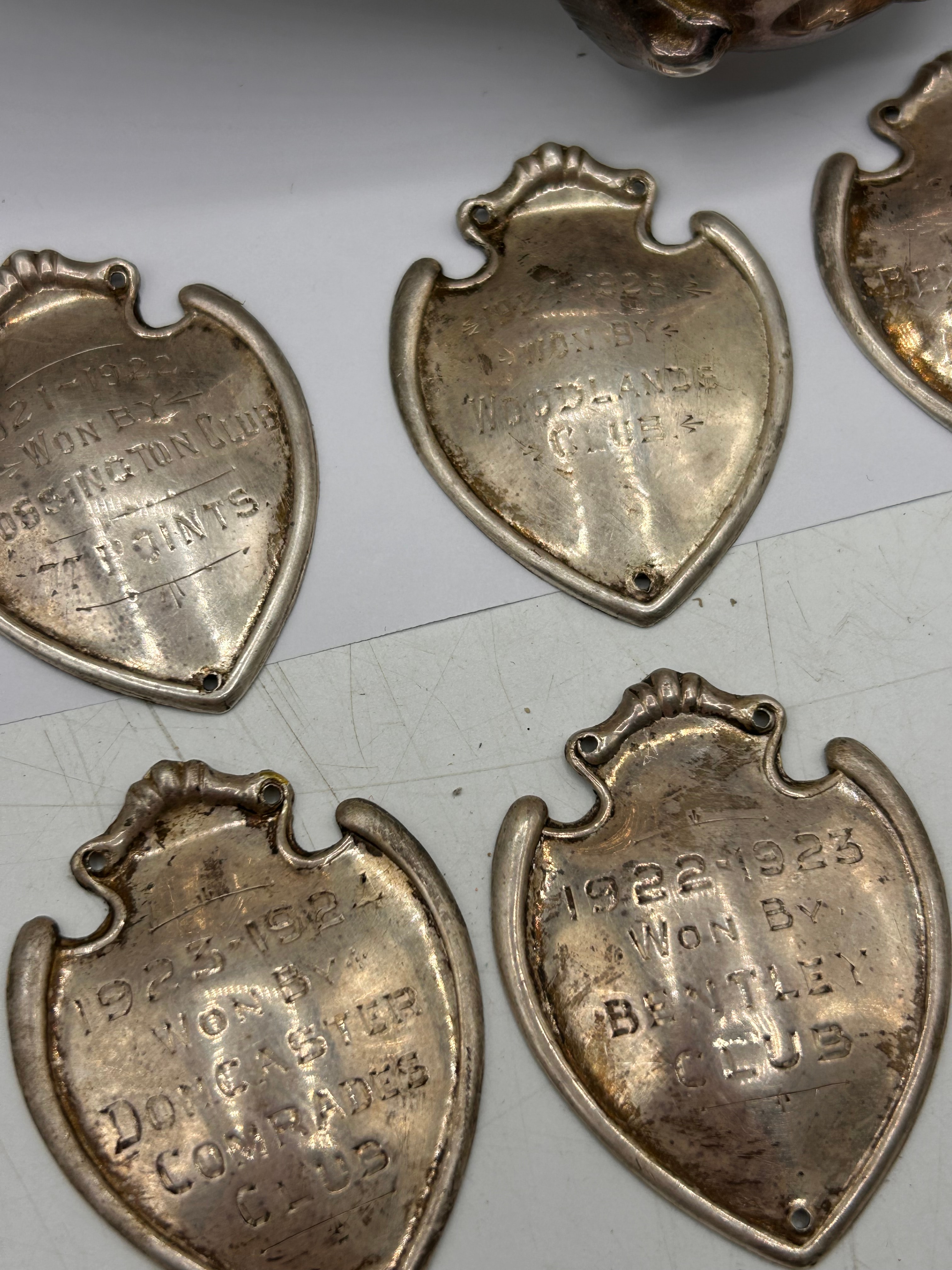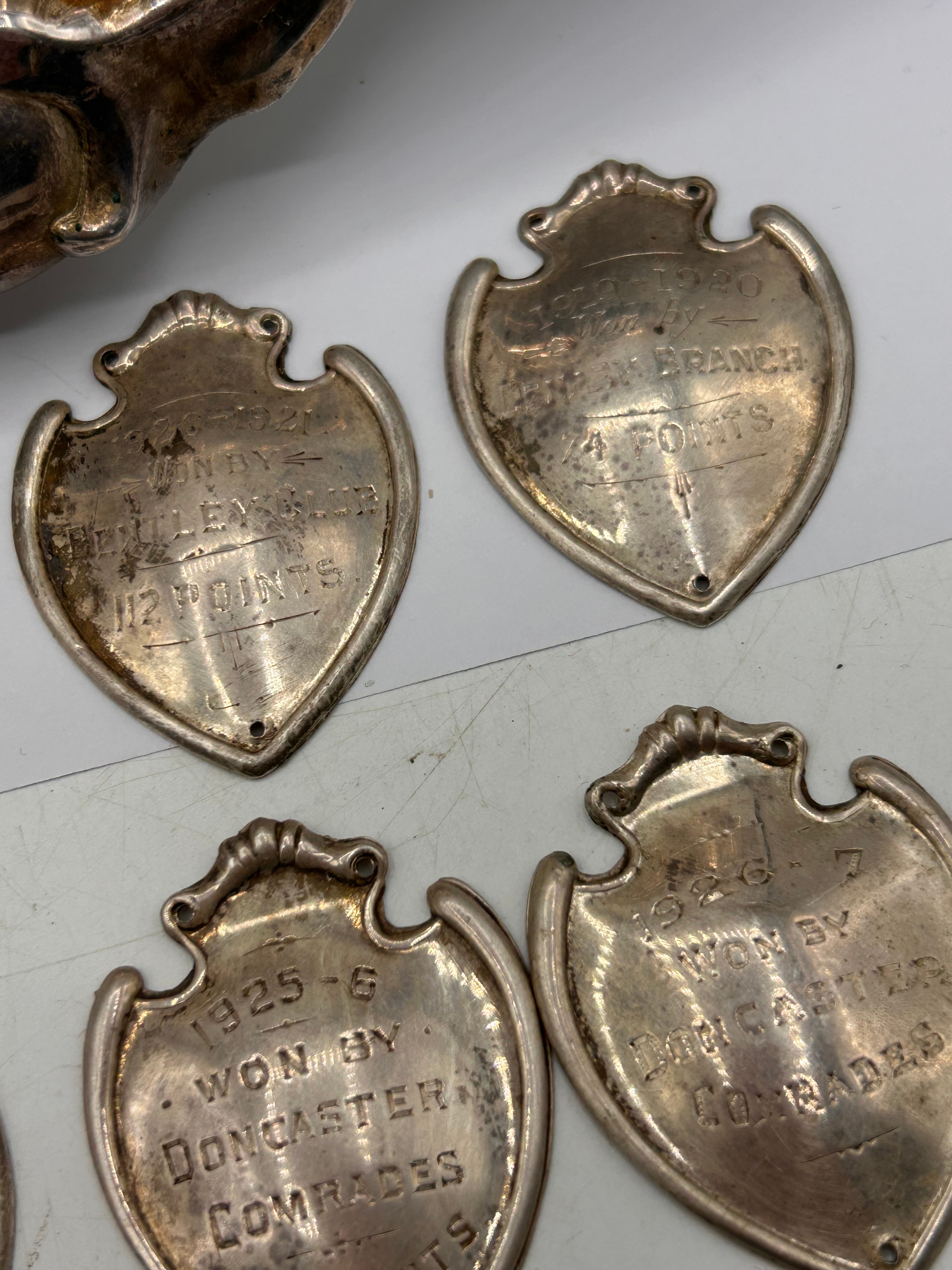 A large, ornate metal challenge shield, likely silver-plated, featuring elaborate relief decoration typical of the early 20th century. The central design depicts two allegorical female figures flanking a medallion with three male figures in an industrial or port landscape. Engraved text at the top reads “LEST WE FORGET”, followed by “DONCASTER & DISTRICT CHALLENGE SHIELD” and “PANEL GAMES LEAGUE”. Below a decorative bow, further inscription details: “This Shield WAS PRESENTED TO THE PANEL LEAGUE JOINTLY BY THE FOLLOWING BRANCHES ADWICK-LE-STREET, ASKERN, DONCASTER, DENABY, MEXBOROUGH & WOODLANDS 1920”. Accompanying the main shield is a group of smaller, detached shield-shaped plaques, intended as annual winner plates. These plaques display engraved dates ranging from “1920-1921” to “1926-7”, along with “WON BY” and various club names including “ROSSINGTON CLUB”, “WOODLANDS CLUB”, “DONCASTER COMRADES”, “BENTLEY CLUB”, and “ADWICK LE STREET BRANCH”.