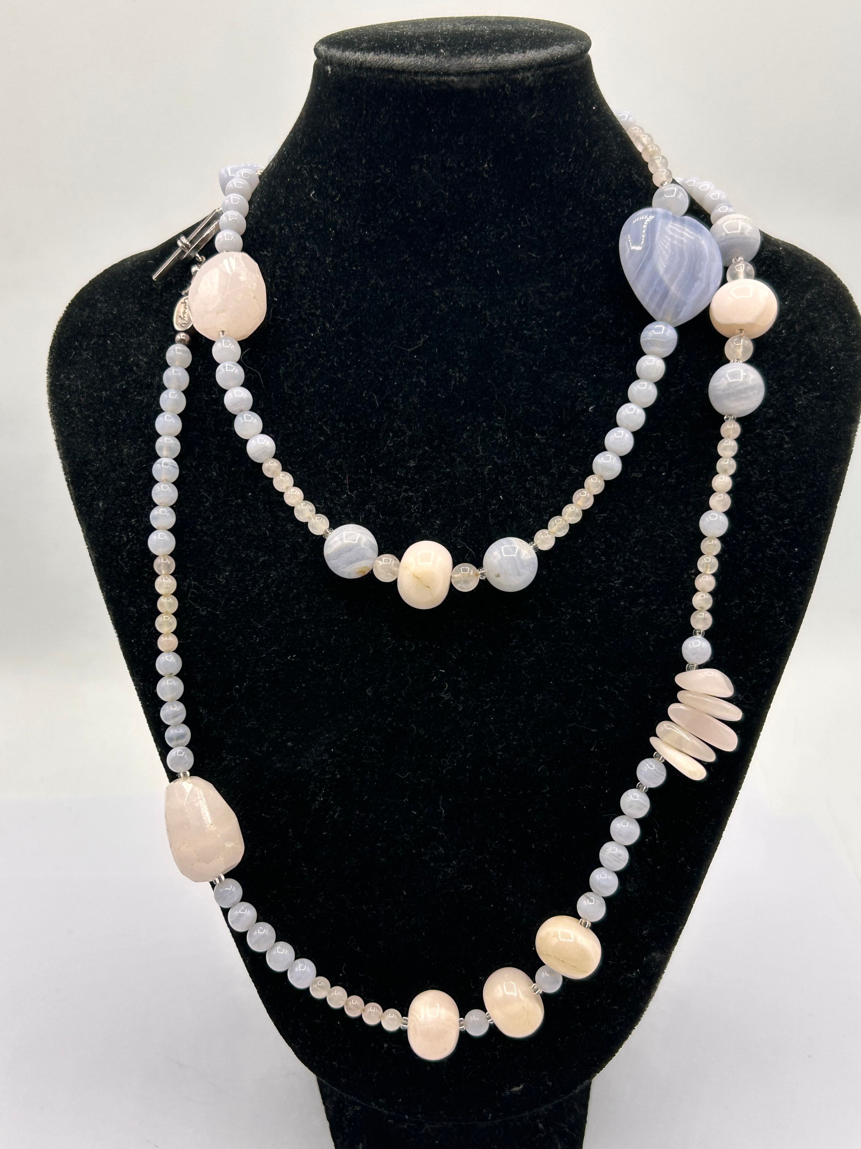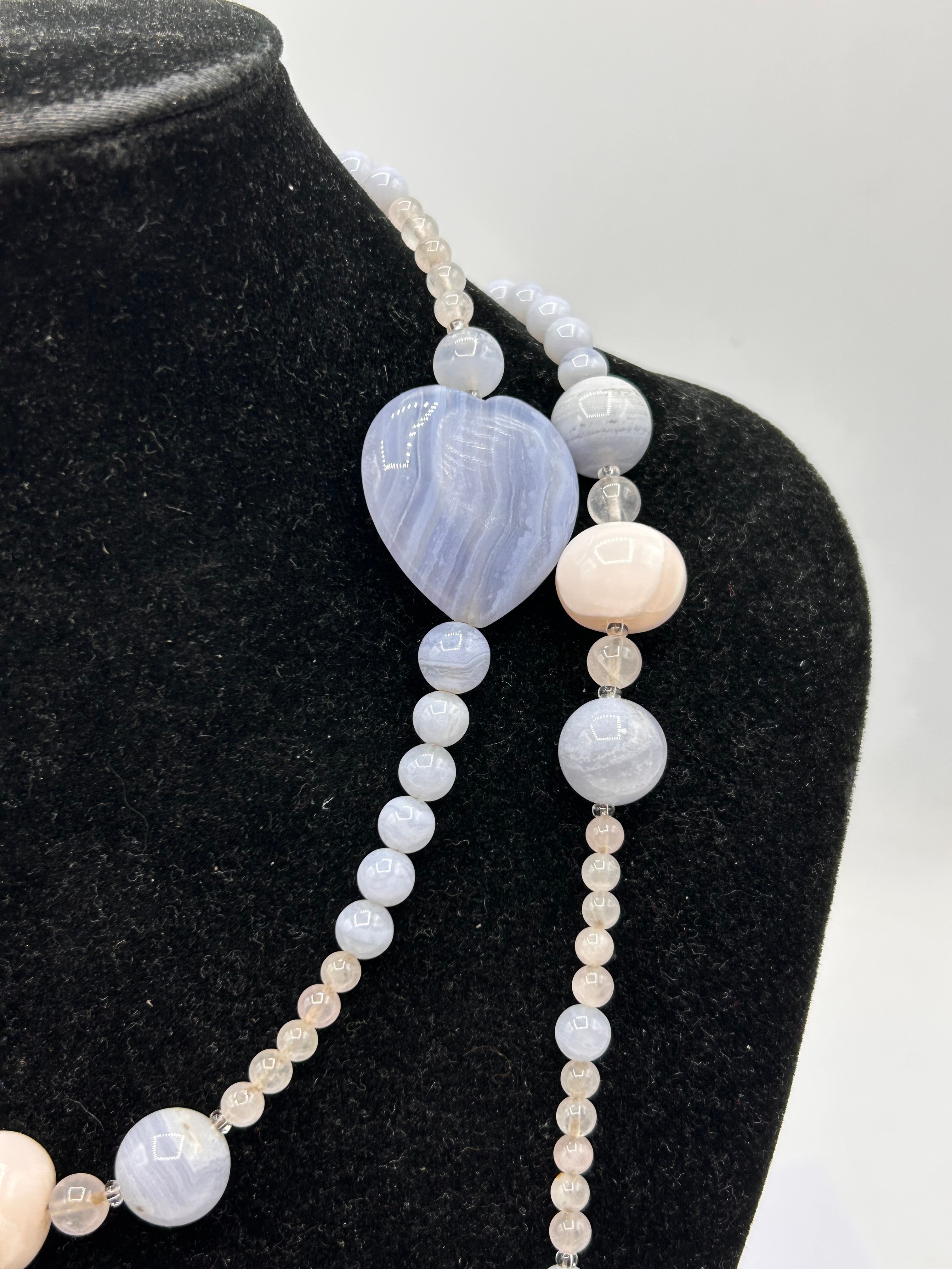 A Ginny D contemporary beaded necklace, featuring polished natural stone beads in varying sizes and shapes. The design incorporates translucent light blue beads, resembling blue lace agate with natural banding, alongside opaque light peachy-pink beads, possibly chalcedony or rose quartz. Smaller clear faceted spacer beads are interspersed throughout. A prominent heart-shaped bead in the light blue stone serves as a key design element, complemented by irregular nugget-shaped pink beads. The necklace secures with a silver-toned metal toggle clasp, to which an oval metal tag engraved with the script name “Cindy” is attached.