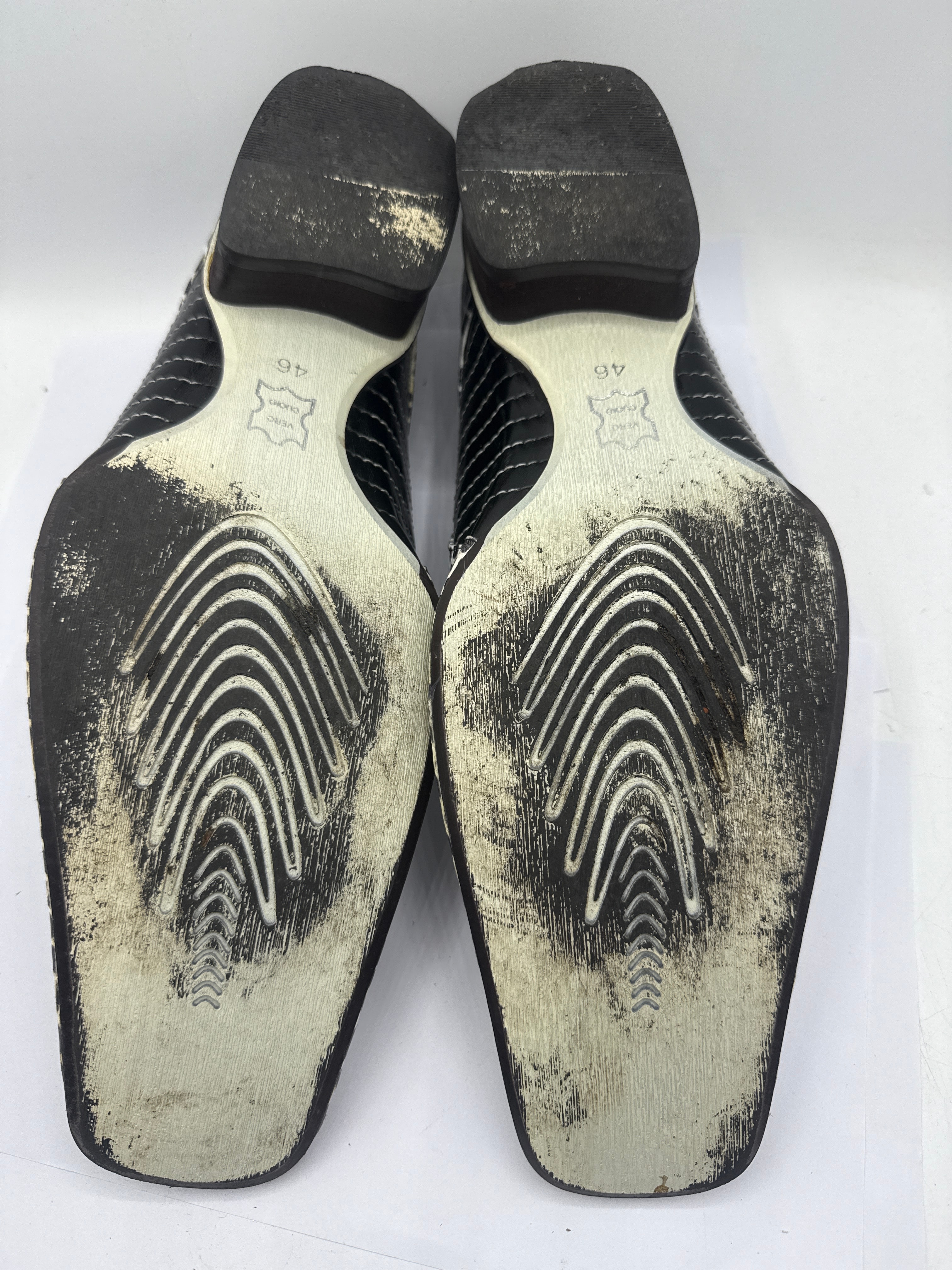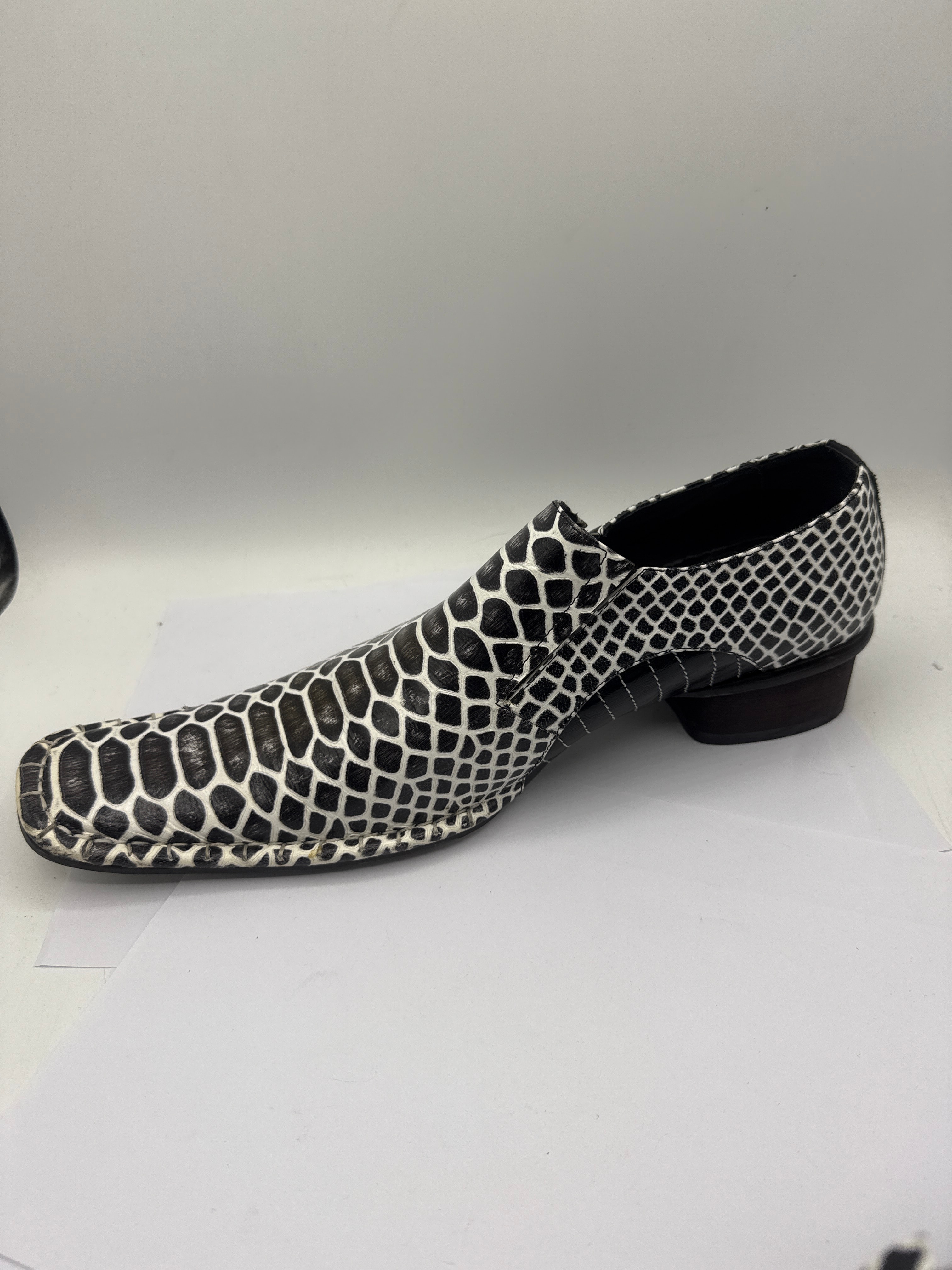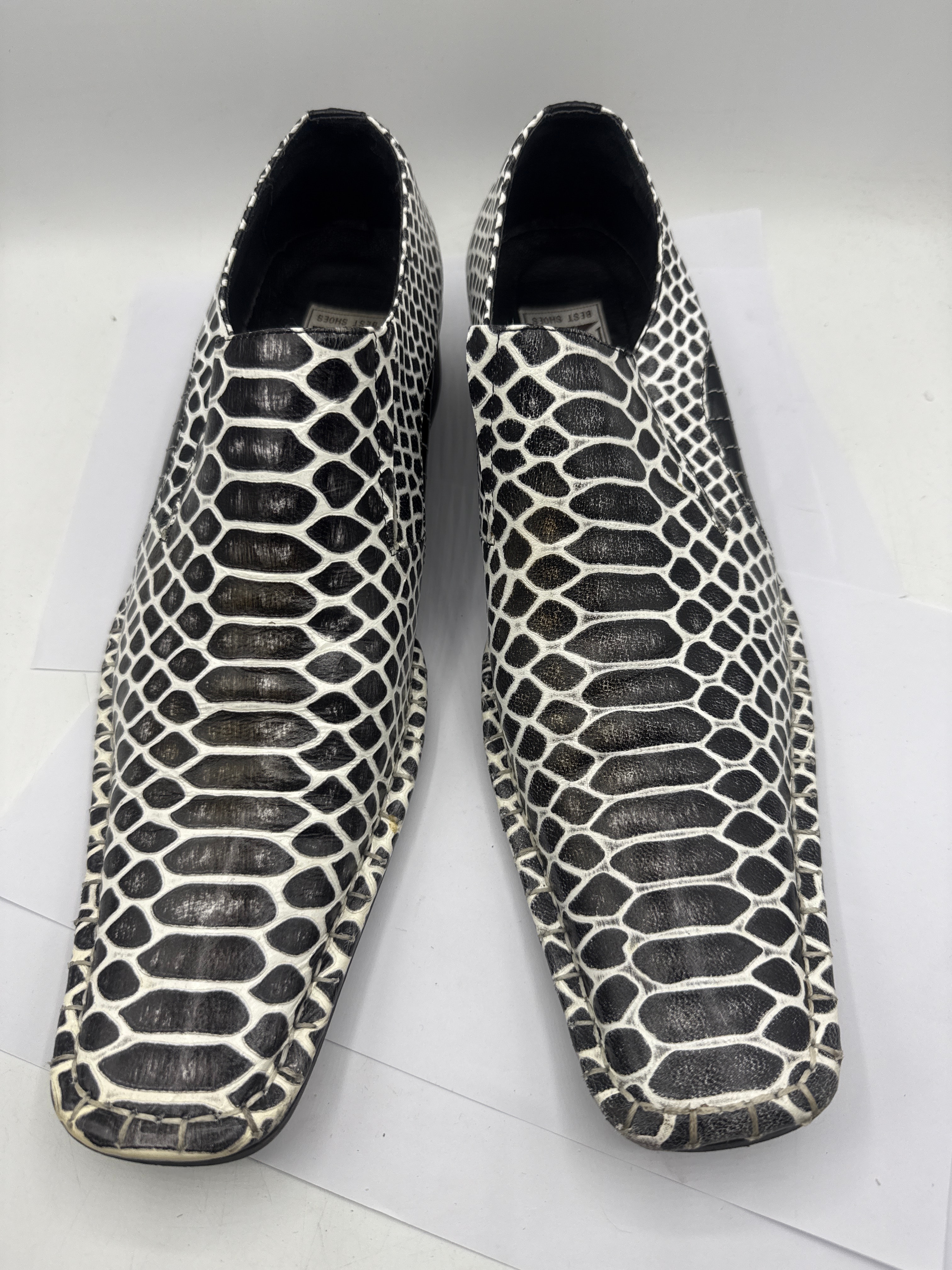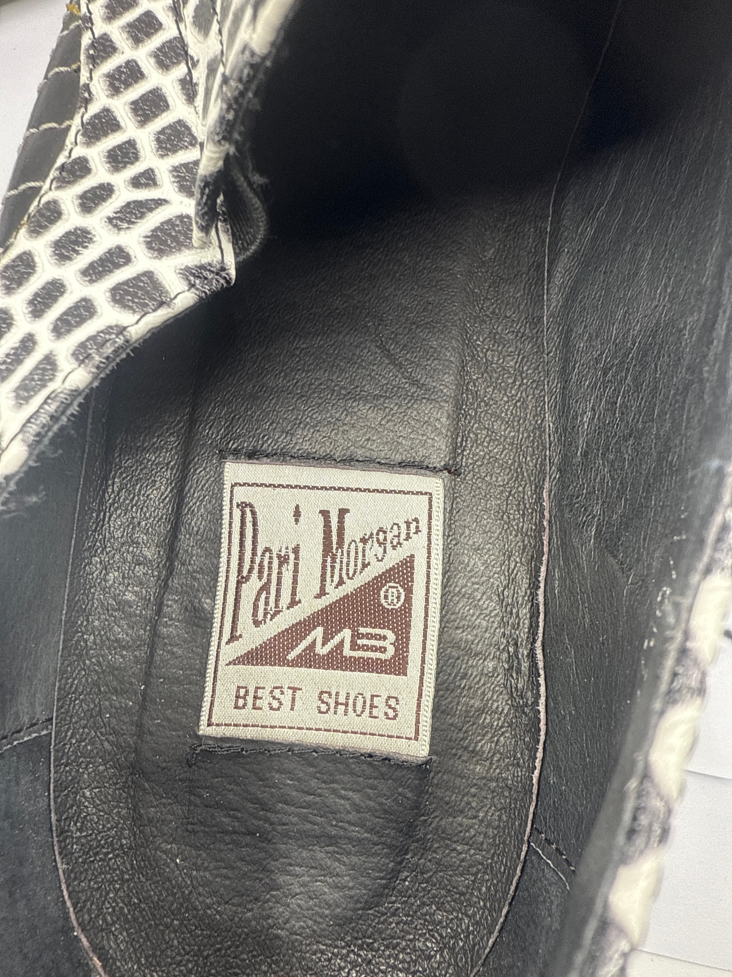 A pair of men’s slip-on dress shoes, featuring a bold black and white exotic skin pattern across the entire upper, likely python or snake. They are designed with a distinct square toe and a low block heel. Inside each shoe, a fabric label reads “Pari Morgan” above an “MB” logo and “BEST SHOES.” The black outsoles are marked with “46” and “VERO CUOIO” (Genuine Leather) accompanied by a stylized hide symbol.