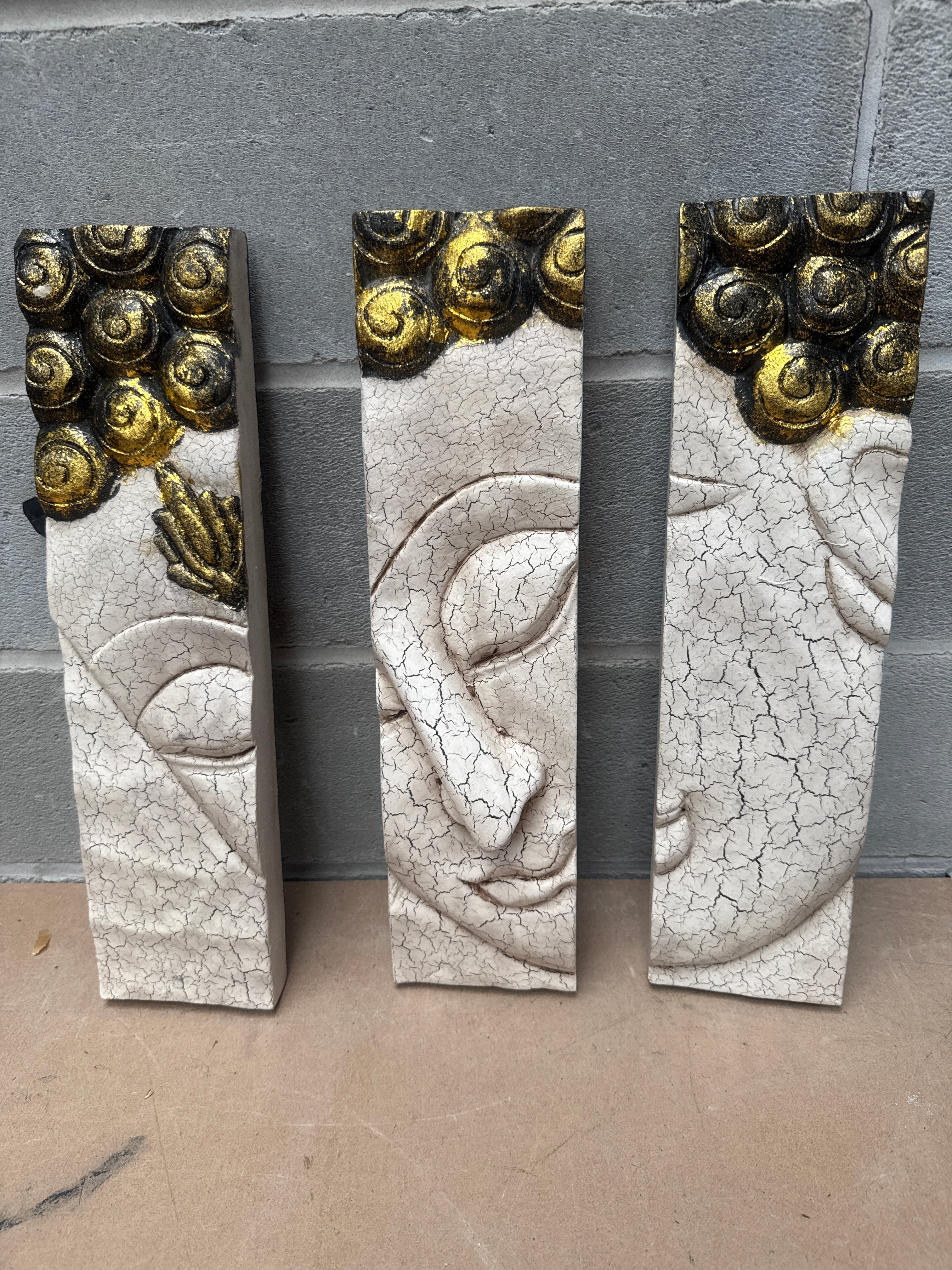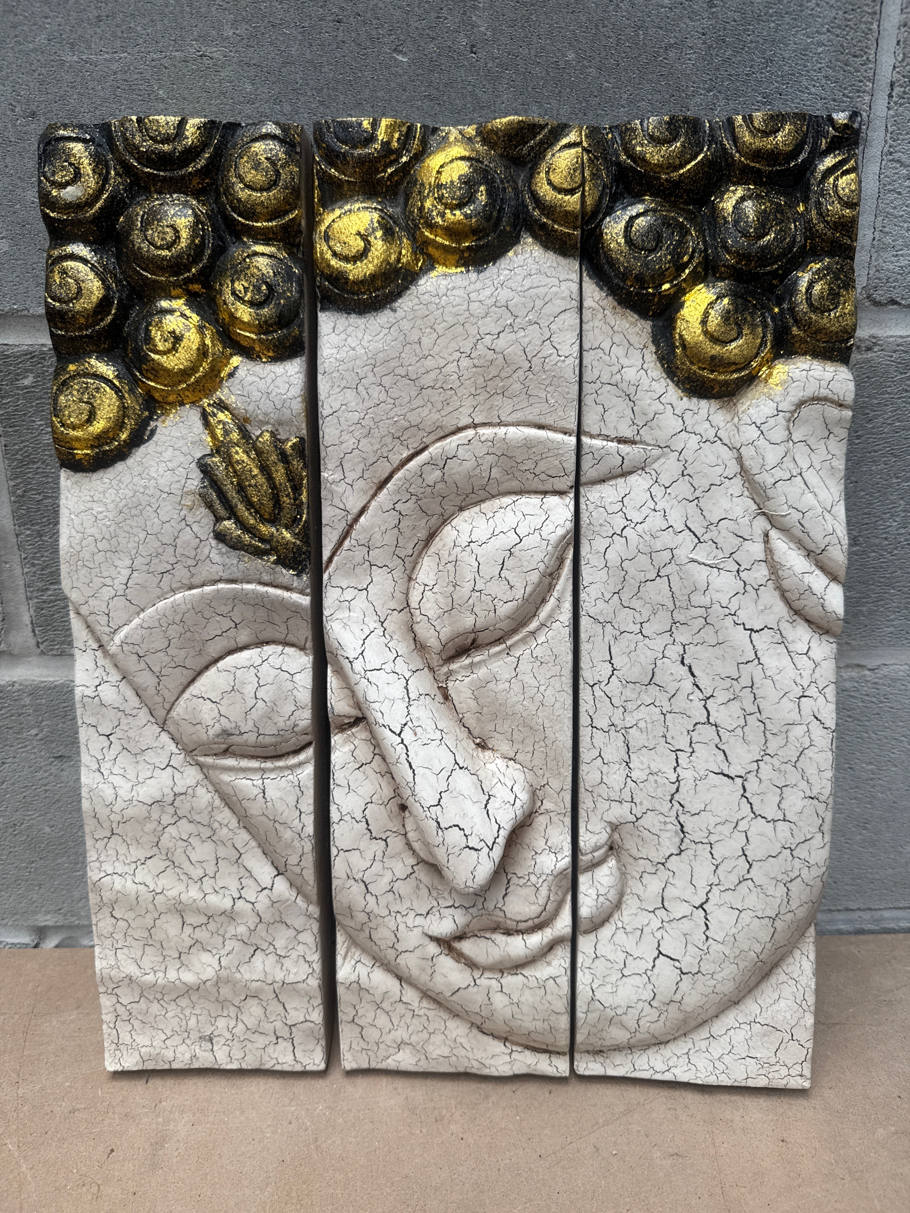 AeraVida Silver Crackle Buddha Face Three-Panel Hanging Handmade Wall Art. This lot comprises three vertical decorative panels, crafted from Wood. The relief sculpture depicts the serene face of Buddha with closed eyes, a prominent nose, and tightly curled hair. The panels are finished with an intentional crackle-effect, off-white paint over the facial features, while the hair and ushnisha are accented with a textured black and glittery gold finish. No visible text or markings are present.