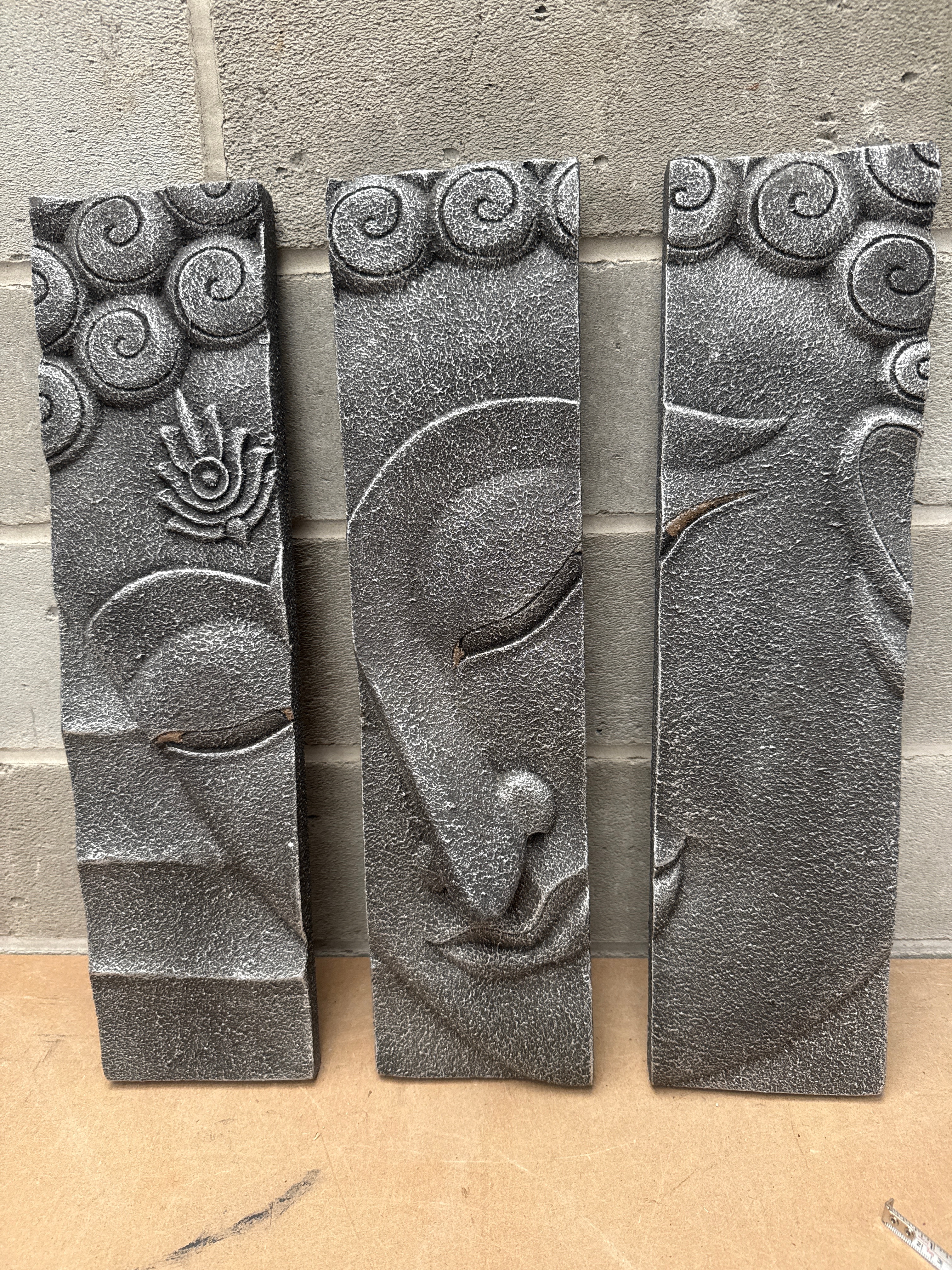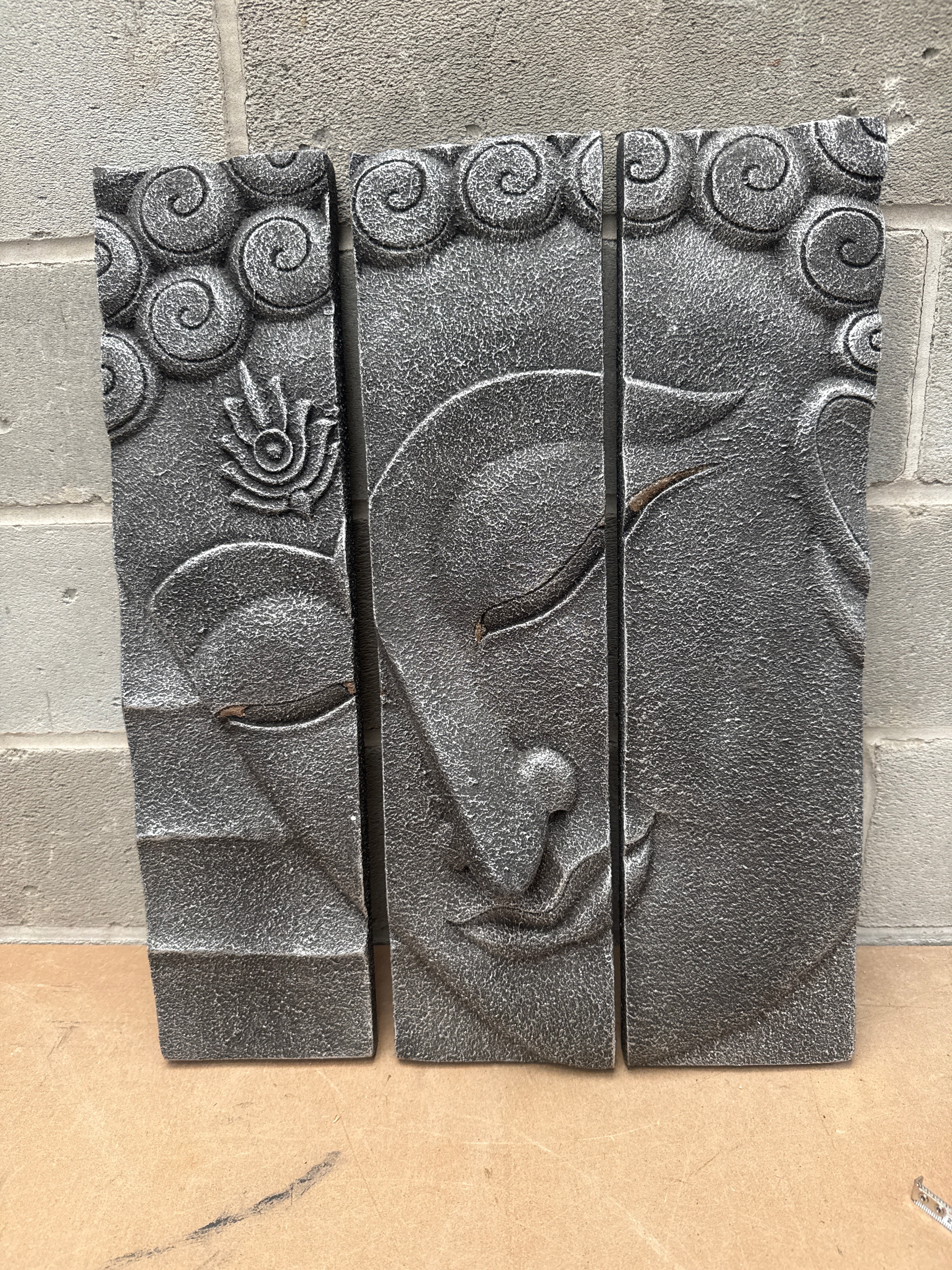 A set of three ebonized carved wood wall panels, depicting a unified relief of a serene Buddha face. The design incorporates traditional Buddhist iconography, including tightly coiled hair, closed eyes, and an urna (dot between the eyebrows) on the central panel, with an additional stylized flame or leaf-like emblem visible on the leftmost panel. The panels exhibit a coarse, textured finish in dark grey with subtle silvery accents. No discernible text or manufacturer markings are visible.