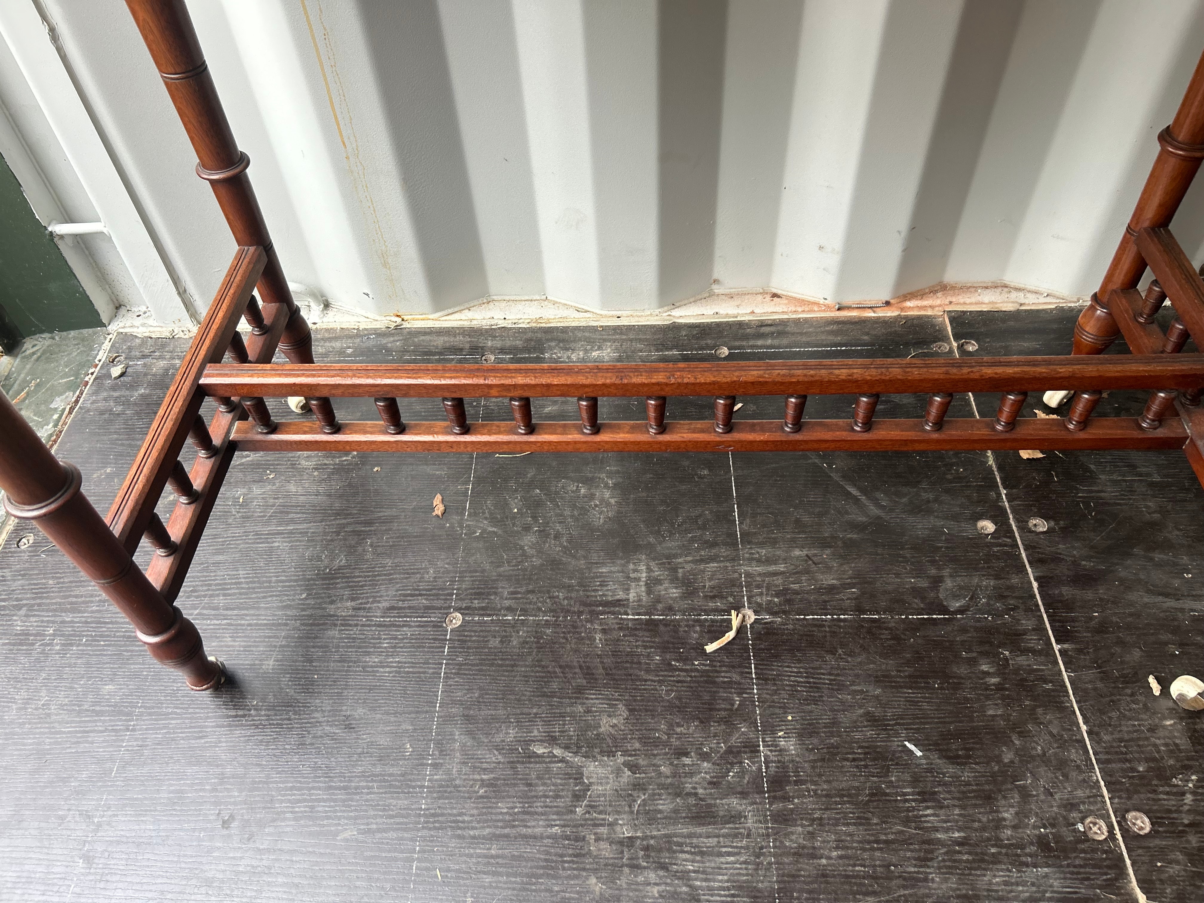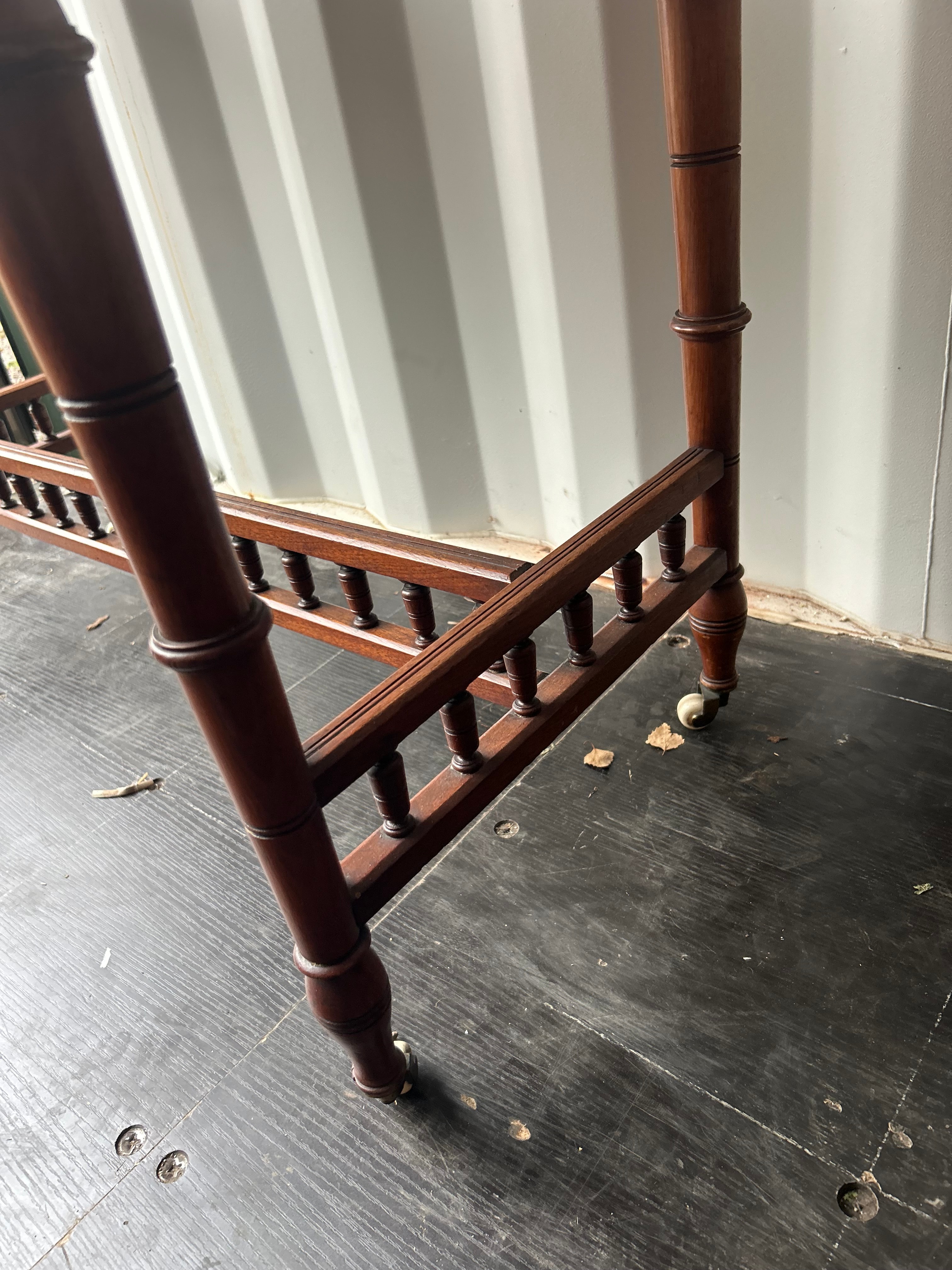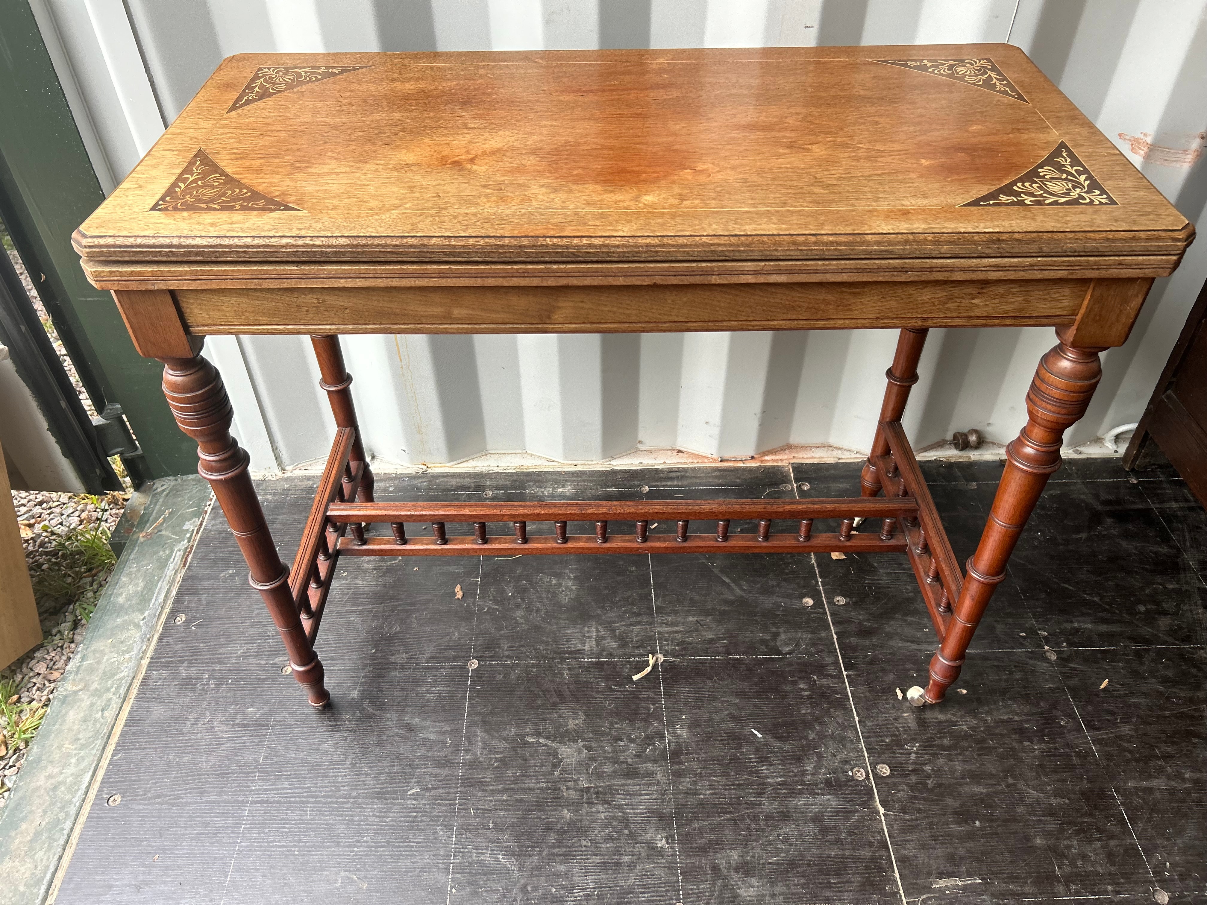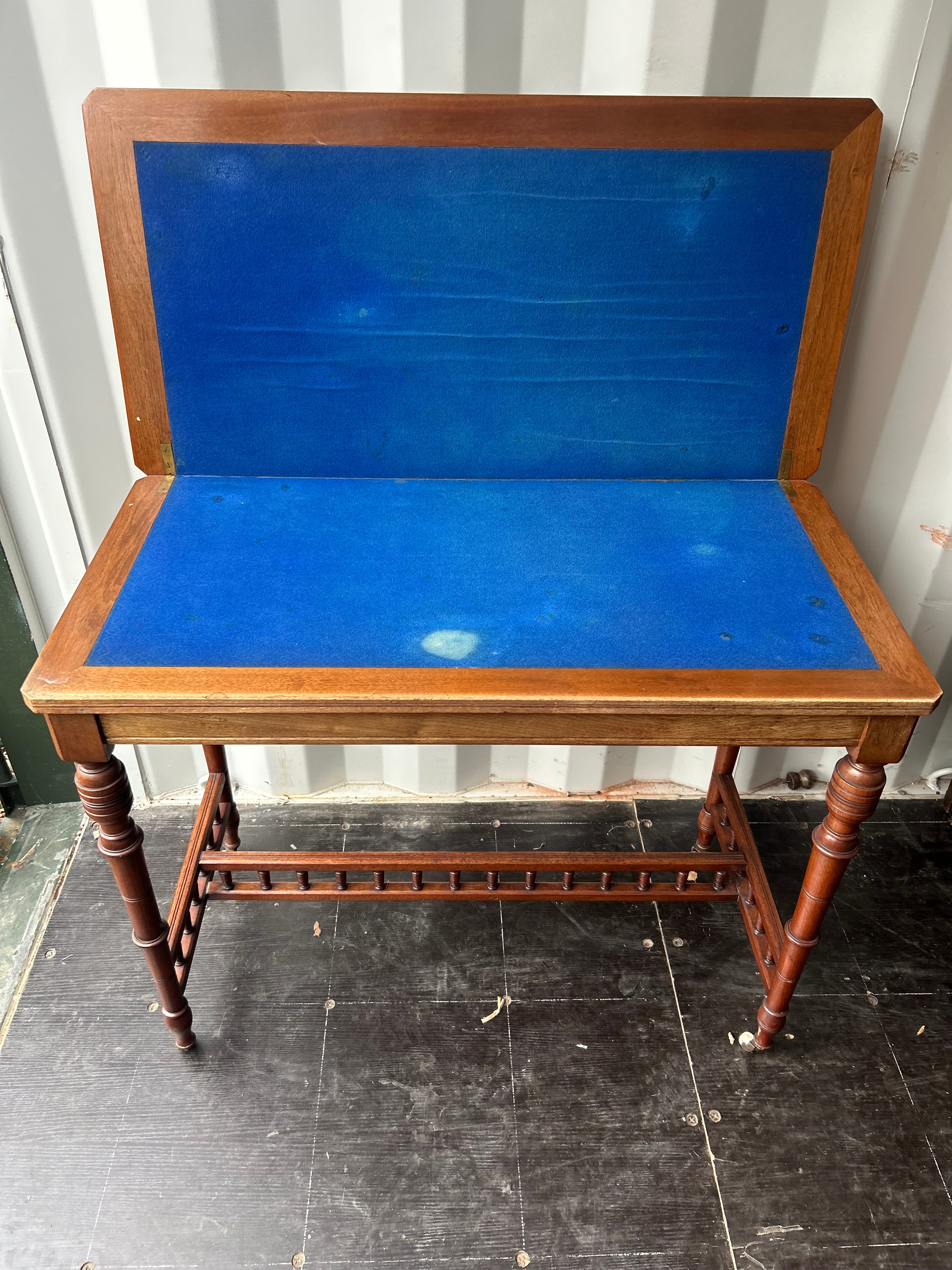 A late Victorian or Edwardian-style folding card table crafted from a warm-toned, stained hardwood, possibly mahogany or walnut. The rectangular top features decorative gilded or inlaid scrollwork in each corner and opens to reveal a royal blue felt playing surface. The base is supported by four turned legs with ring-and-vase motifs, connected by a stretcher bar embellished with multiple small spindles, and rests on small casters. No visible text or manufacturer’s markings are apparent.