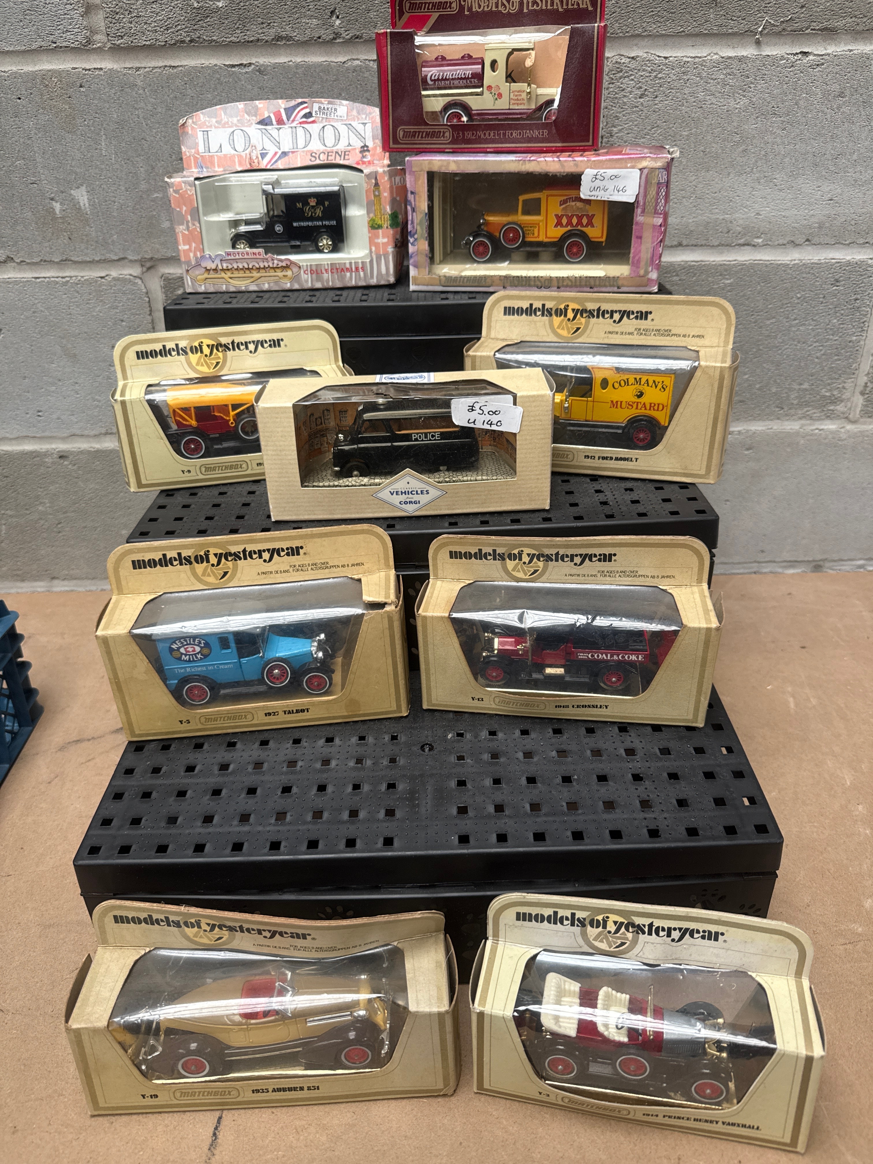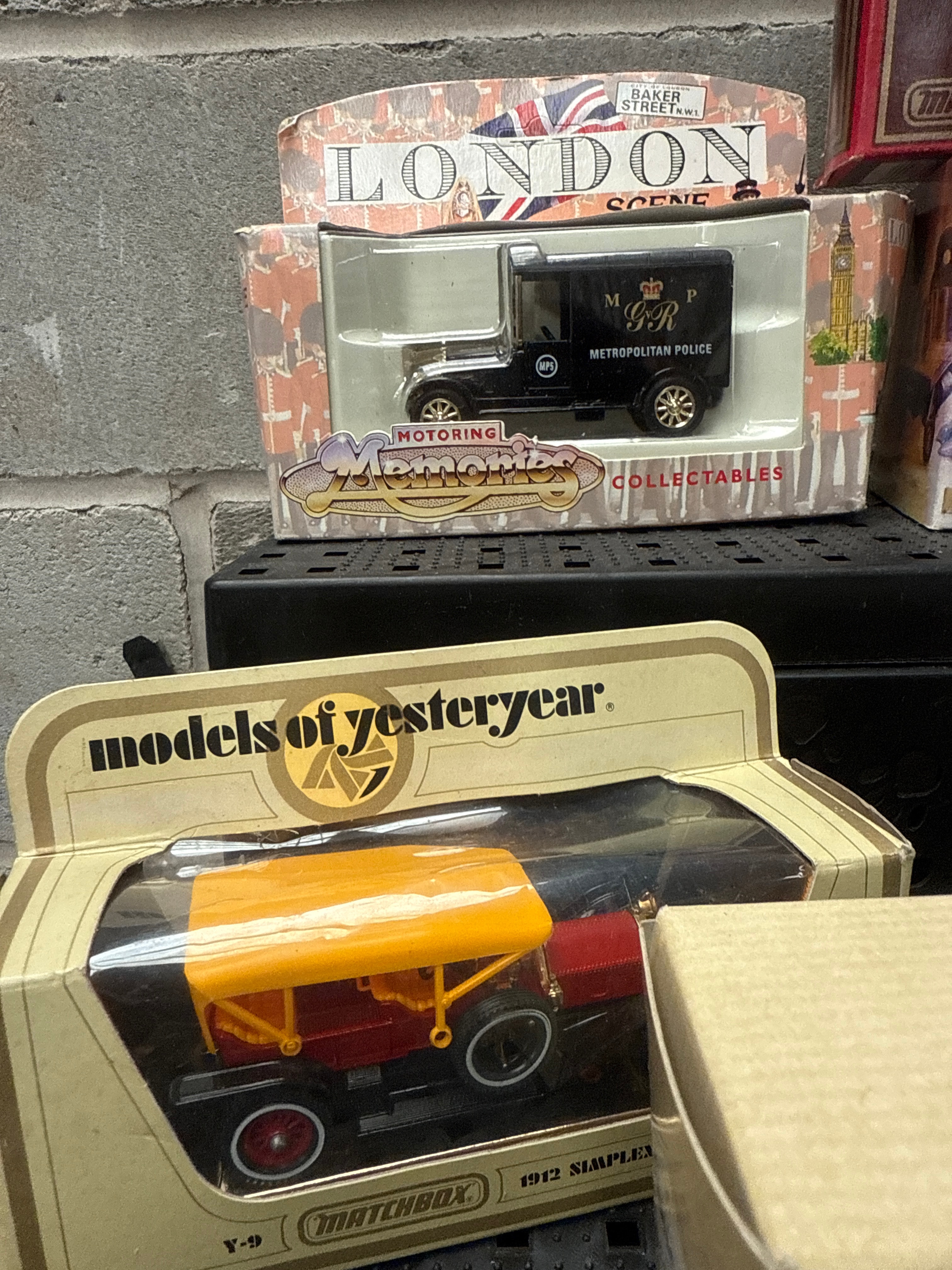 A collection of 10 die-cast model vehicles, primarily from the ‘Matchbox Models of Yesteryear’ series, alongside a ‘Corgi’ and a ‘Motoring Memories London Scene’ item. Many of the Matchbox models are produced in 1:48 scale. All items are presented in their original cardboard and plastic display boxes. The models are replicas of classic cars and trucks from the early 20th century, with visible years ranging from 1912 (e.g., Ford Tanker, Simplex, Crossley) to 1933 (e.g., Austin). Specific models display liveries such as ‘COLMAN’S MUSTARD,’ ‘POLICE,’ ‘METROPOLITAN POLICE,’ and ‘Esso.’ The packaging includes affixed price stickers (e.g., ‘£5.00’) and multilingual age recommendations, ‘A partir de 8 ans. Toys and novelties’.