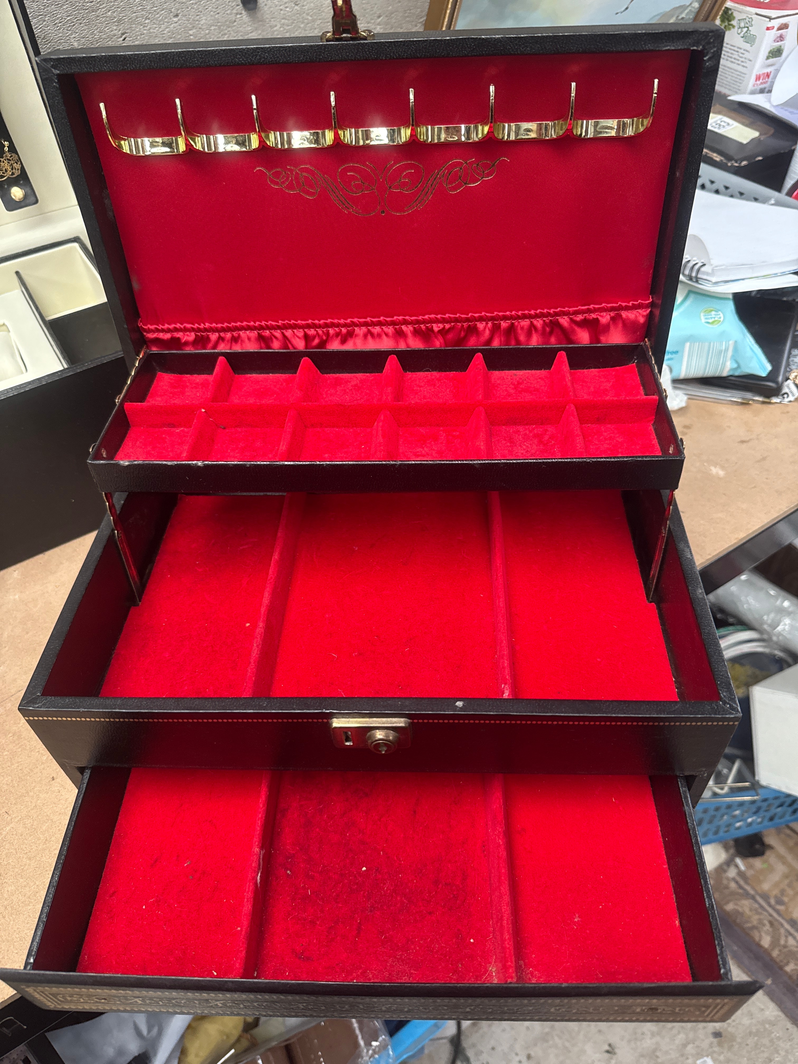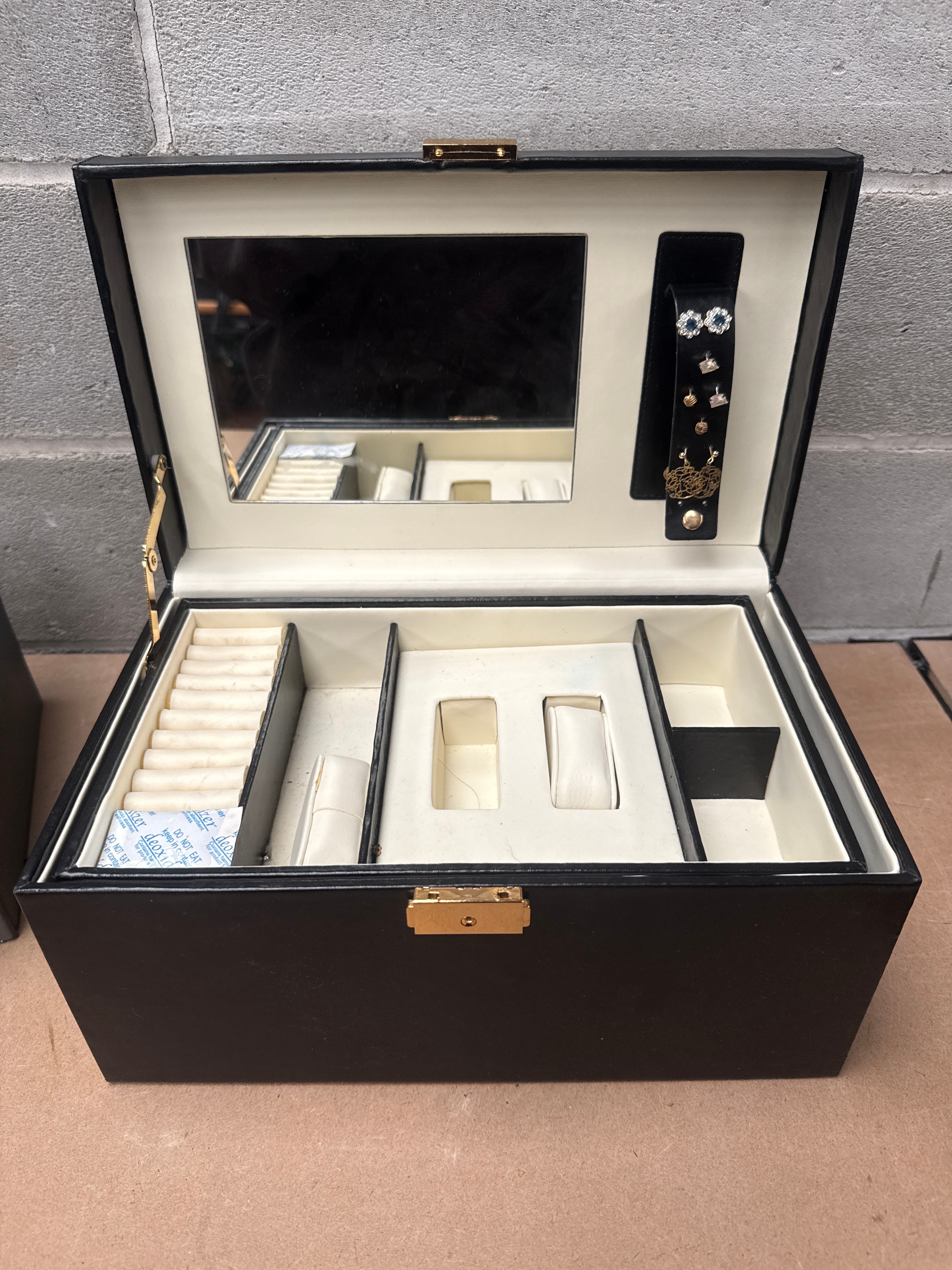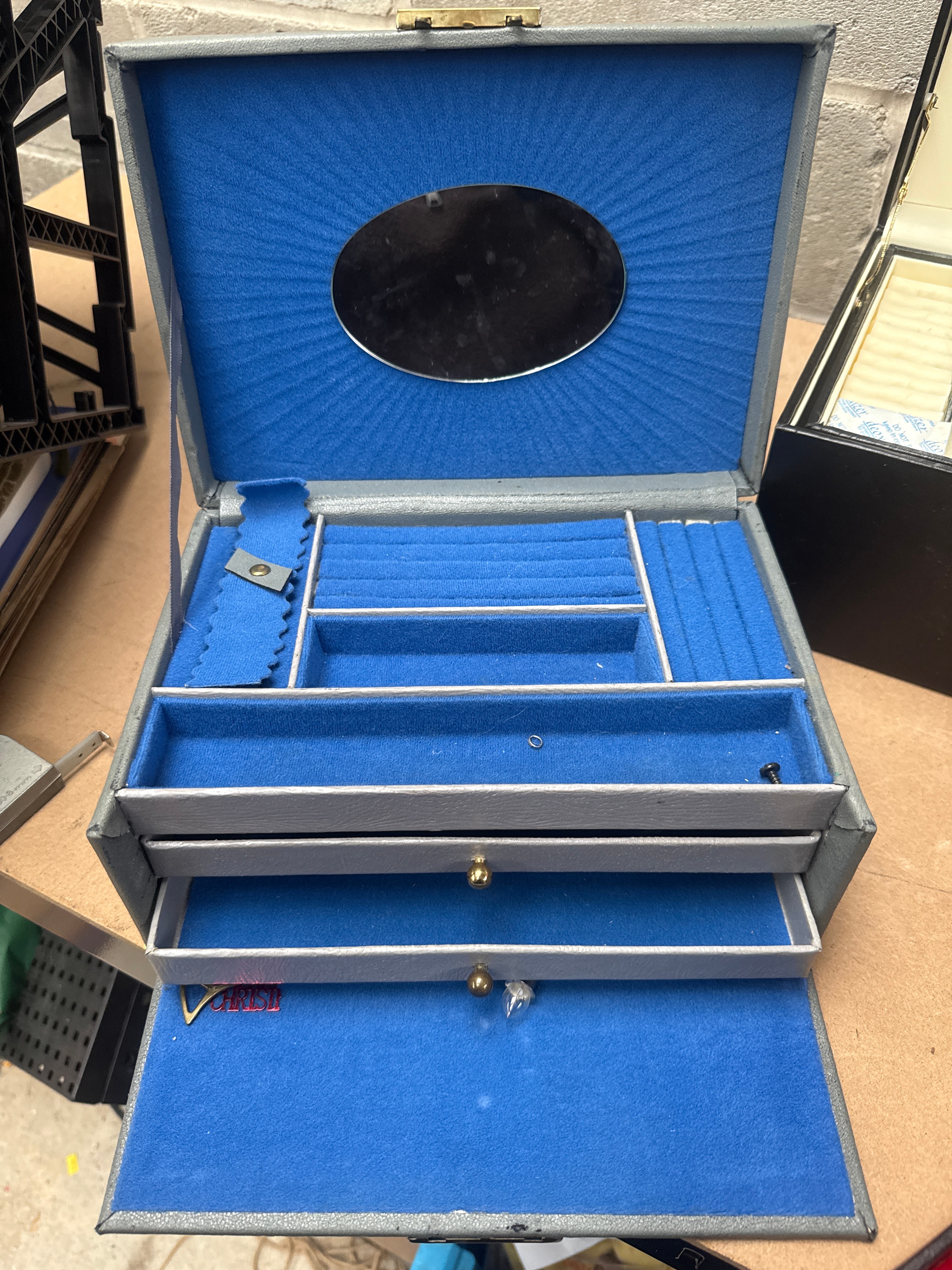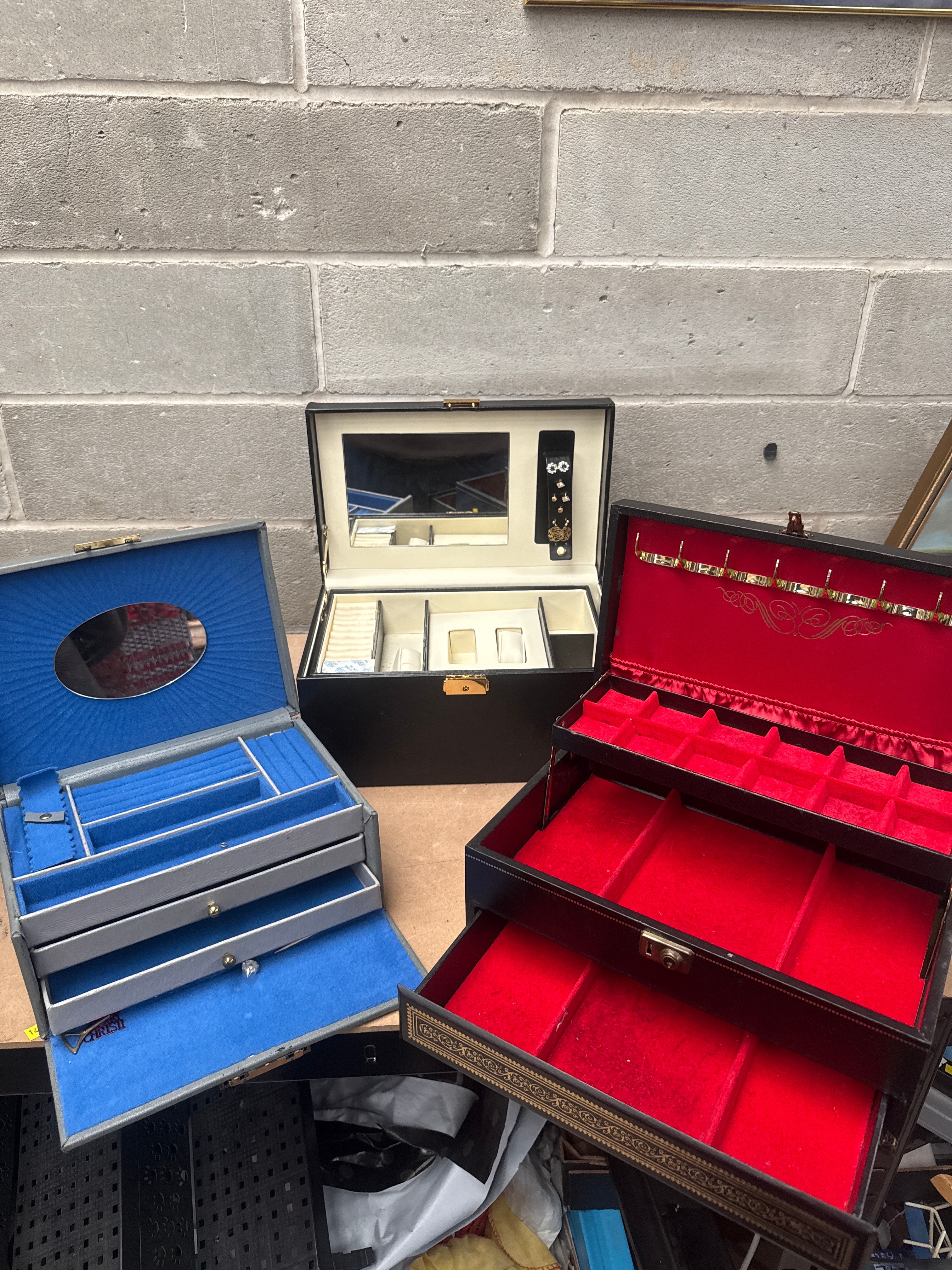This lot comprises three jewelry or accessory storage boxes, likely dating from the 20th to early 21st century. The first is a multi-tiered grey-toned case featuring a blue velvet-lined interior, an oval mirror on the lid, and a partially visible ‘ABELT’ marking on the bottom drawer. The second is a multi-tiered black case with a vibrant red velvet-lined interior, ornate gold-tone motifs, and necklace hooks on the lid. The third is a rectangular black case with a cream/white lined interior, containing a rectangular lid mirror and specialized compartments for rings, watches, and earrings (some of which are present). All cases feature faux leather or vinyl exteriors with soft fabric linings.