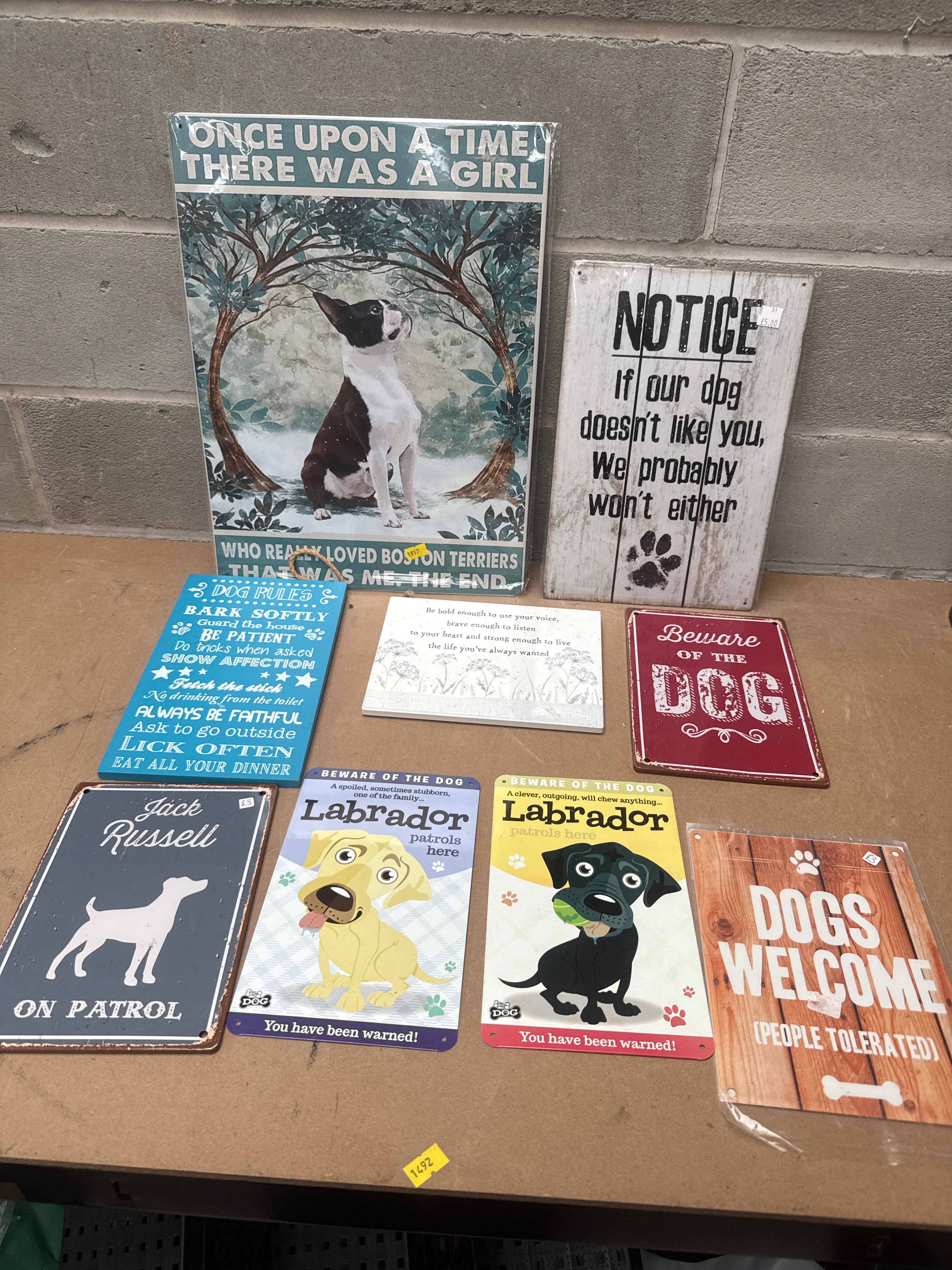 This collection comprises nine contemporary decorative signs and plaques. Eight items are printed metal, likely tin or aluminum, featuring various dog-related themes. These include whimsical and cartoonish illustrations of specific breeds such as Boston Terriers, Labradors, and Jack Russells, alongside humorous text-based warnings and rules. Visible English text includes phrases such as “ONCE UPON A TIME THERE WAS A GIRL WHO REALLY LOVED BOSTON TERRIERS,” “NOTICE If our dog doesn’t like you, We probably won’t either,” “BEWARE OF THE DOG,” “Jack Russell ON PATROL,” and “DOGS WELCOME (PEOPLE TOLERATED).” The prominent sign, identified through web intelligence, features a Boston Terrier illustration with the text “ONCE UPON A TIME THERE WAS A GIRL WHO REALLY LOVED BOSTON TERRIERS.” The collection also includes one white plaque, possibly wood, MDF, or heavy card, with a botanical motif and an inspirational quote about using one’s voice and living authentically. Many signs incorporate rustic or vintage-inspired distressed edges. Several items show drilled holes for hanging, and visible price stickers and inventory numbers indicate a commercial retail context.