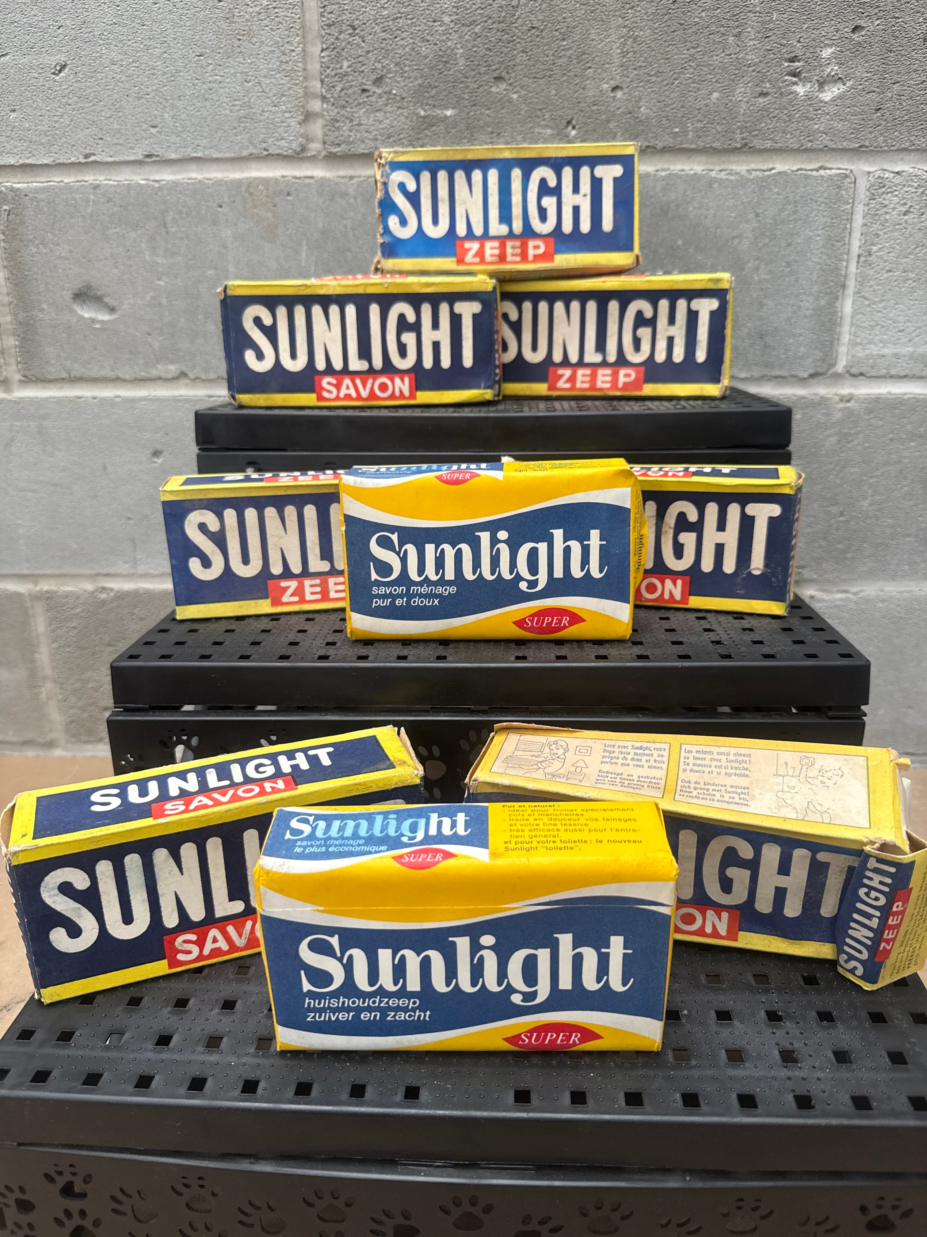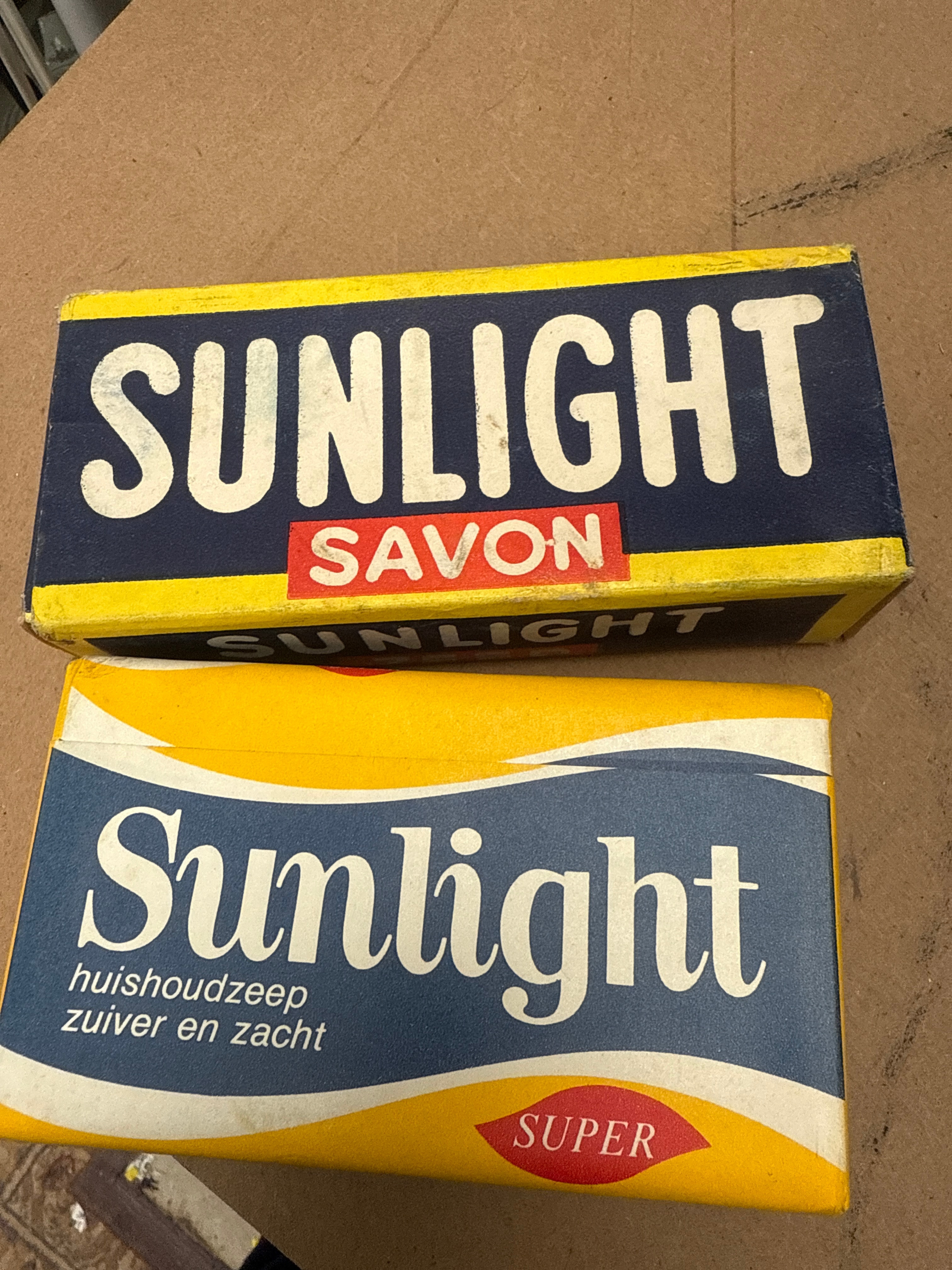 A collection of vintage Sunlight household soap bars, housed in predominantly cardboard boxes. The packaging features a distinct blue and yellow color palette with white lettering, displaying various design iterations that suggest different periods or regional distributions. Visible text includes “SUNLIGHT”, “ZEEP” (Dutch for soap), “SAVON” (French for soap), and “SUPER”. Further markings specify “savon ménage pur et doux” (French for household soap, pure and mild) and “huishoudzeep zuiver en zacht” (Dutch for household soap, pure and mild).
