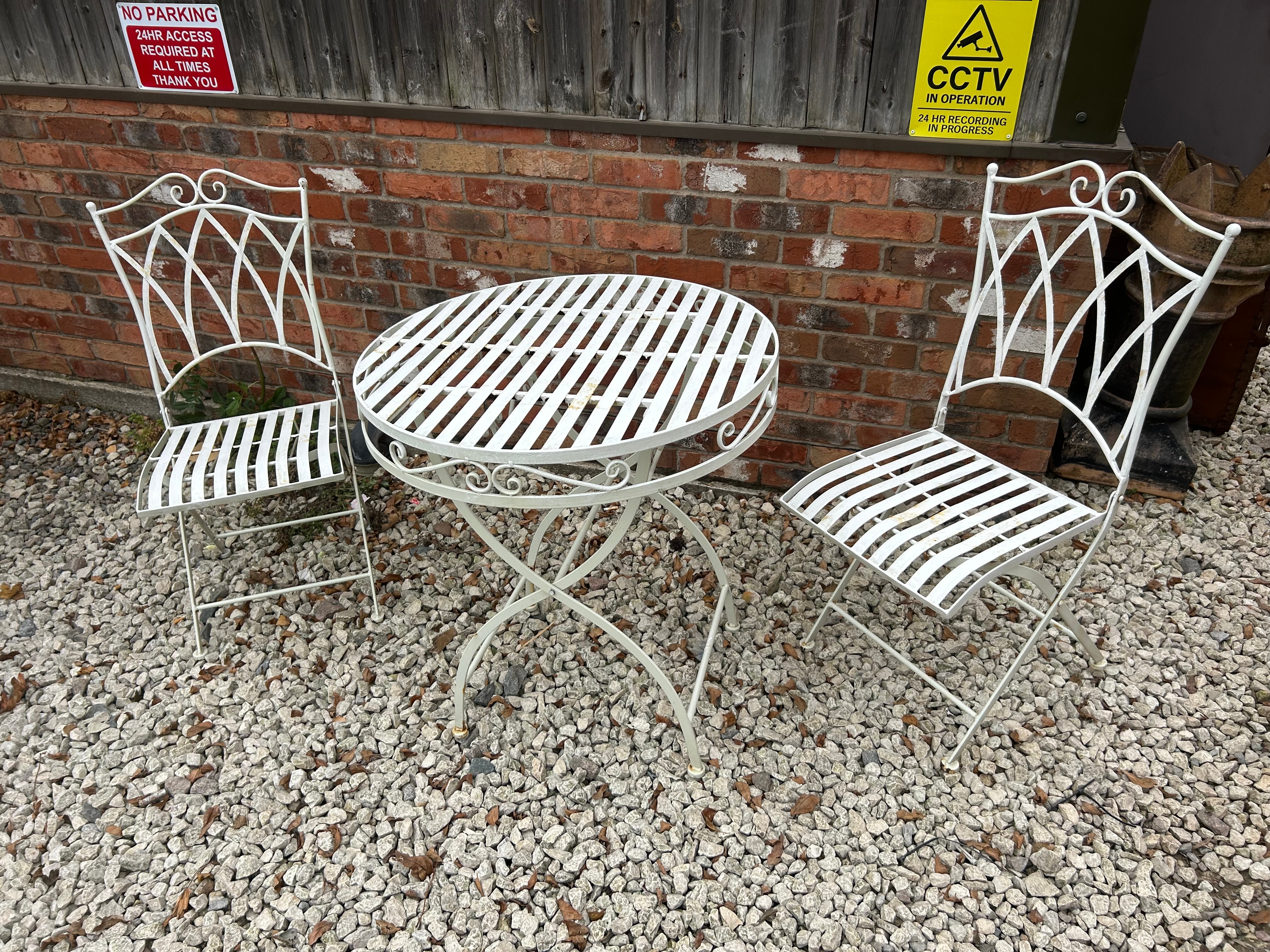 A three-piece white-painted metal garden or bistro set, comprising two chairs and one circular table. The chairs and table are styled with ornate scrolled backs featuring a central lyre-like motif, and slatted seats and tabletop. The table is supported by elegantly crossed legs. Constructed from metal, likely wrought iron or cast aluminum. No manufacturer’s marks or specific period indicators are visible.