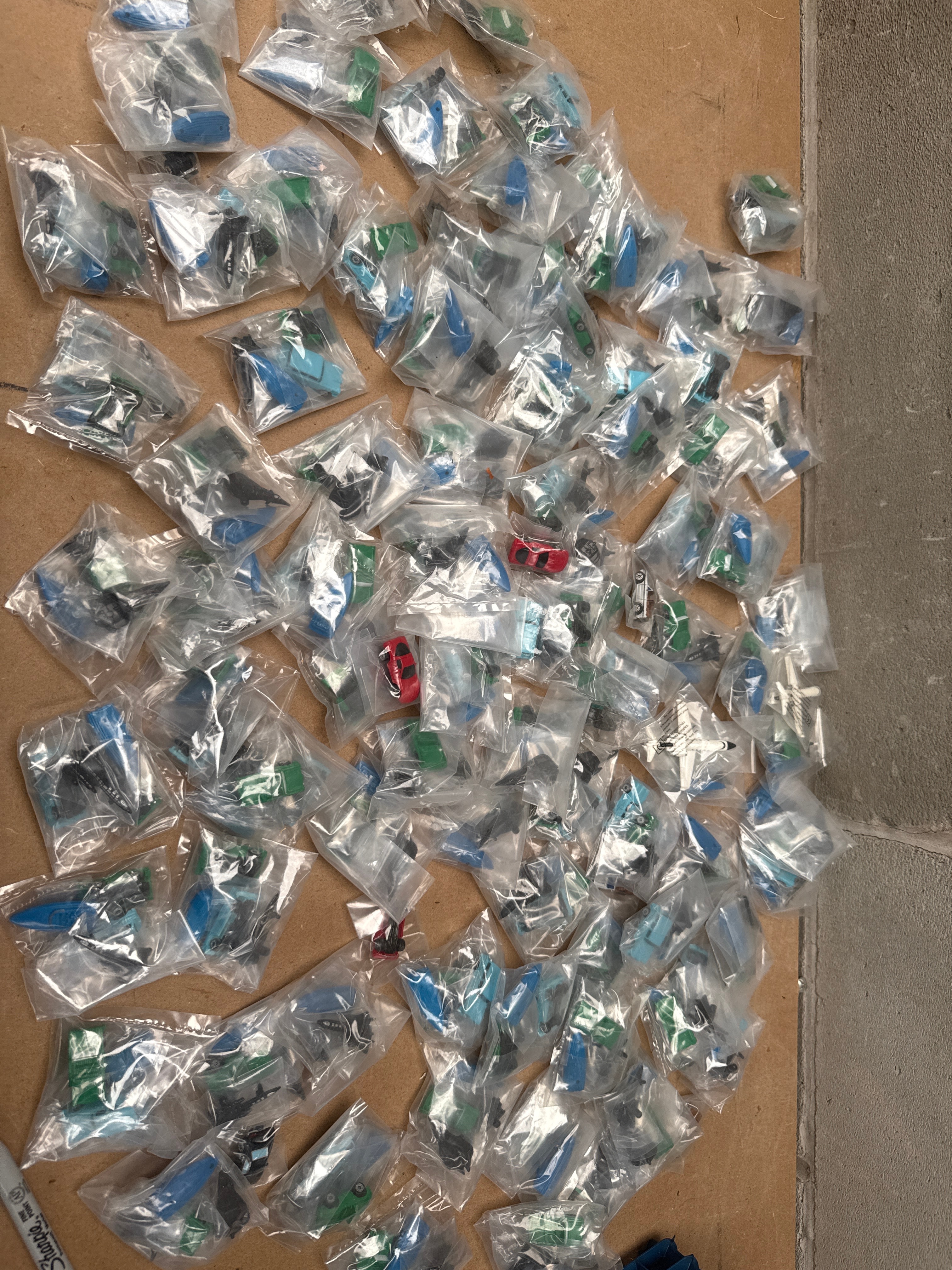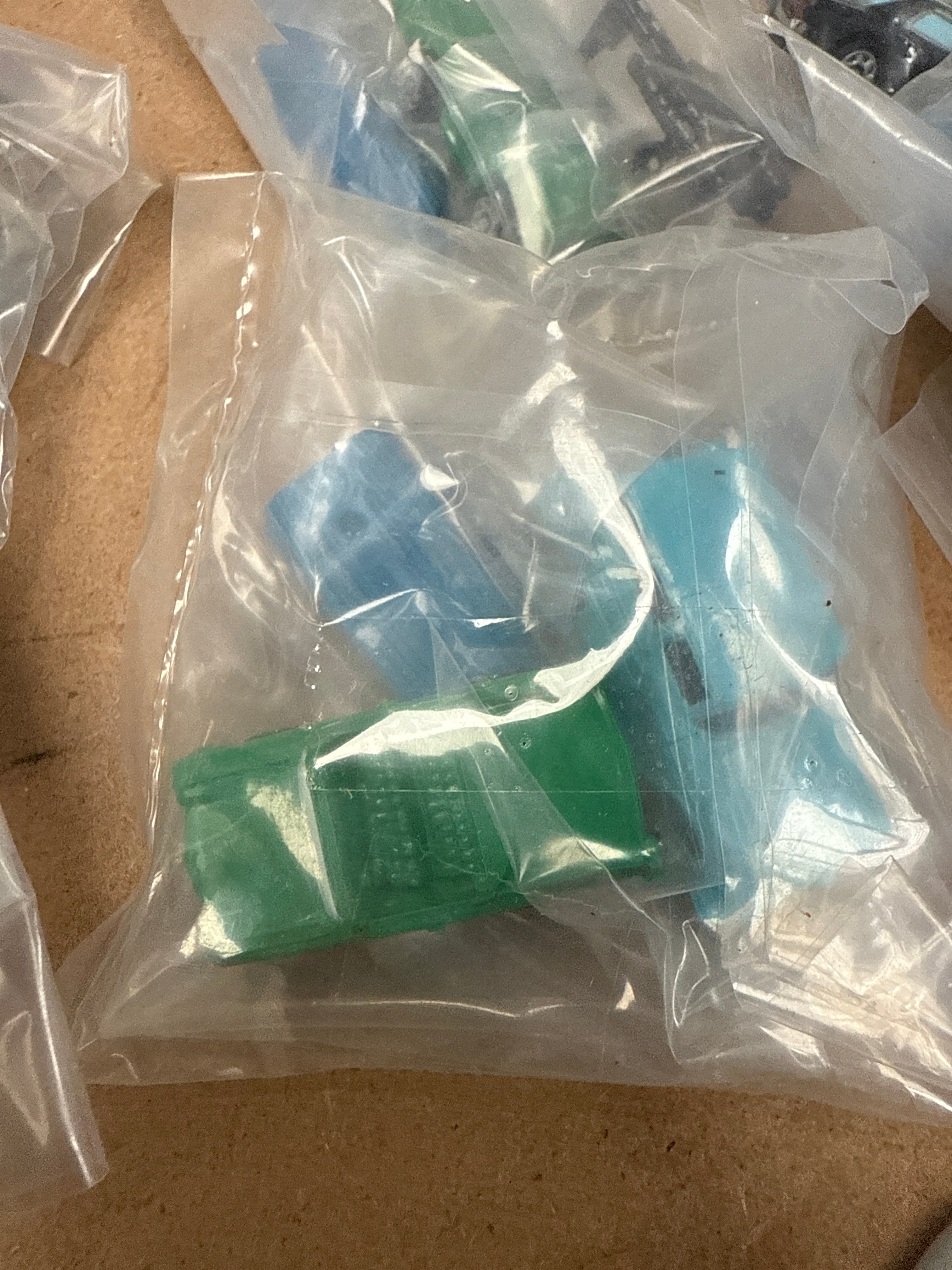 A collection of Micro Machines miniature vehicles, predominantly cars but potentially including other types, individually sealed within clear plastic bags. The vehicles are constructed from die-cast metal and/or plastic, displaying a variety of colors, primarily shades of green and blue, with some red and black examples visible. Their style suggests mass-produced toy vehicles, likely from the late 20th or early 21st century. Raised details on one green vehicle are suggestive of potential identification.
