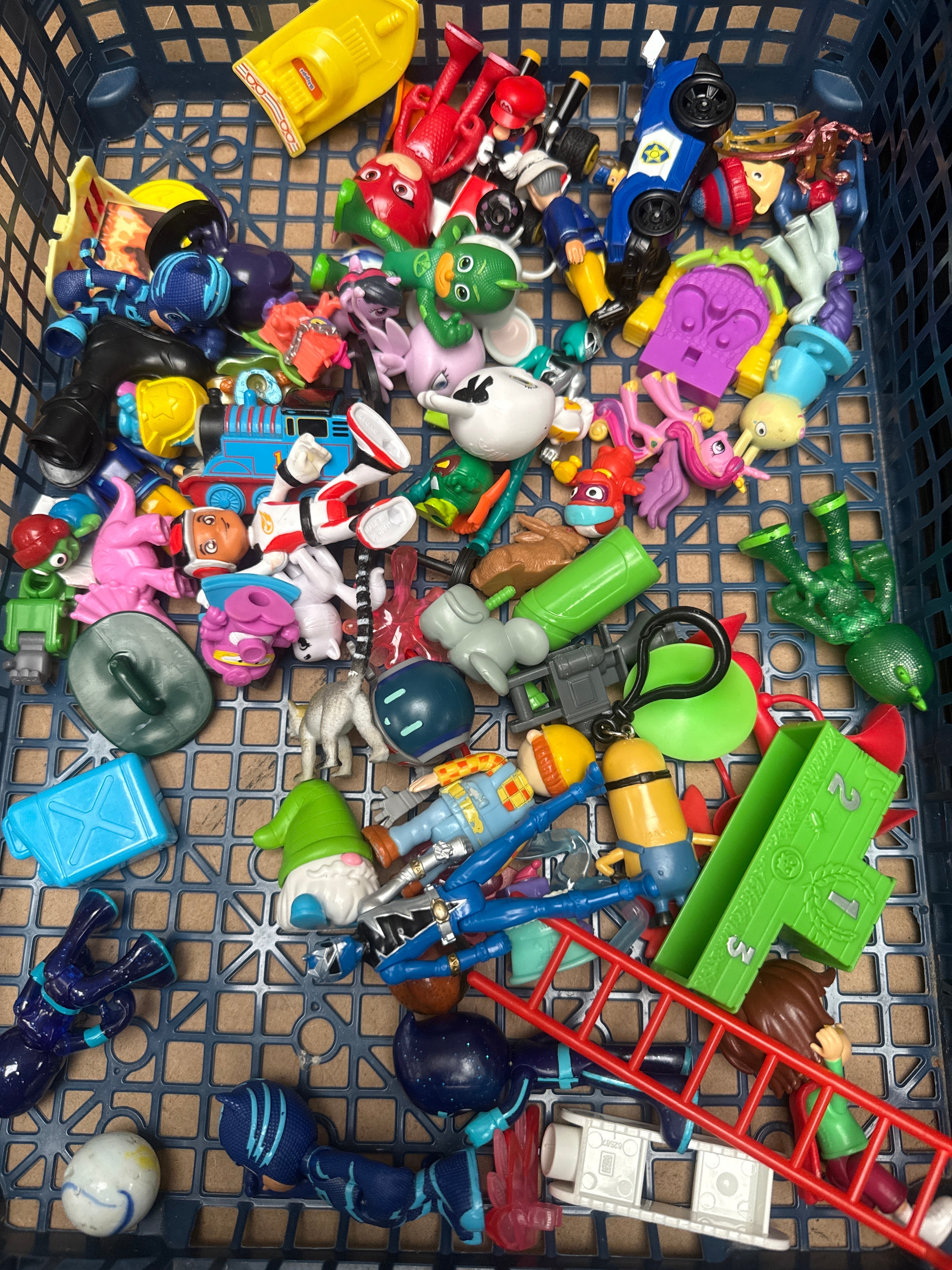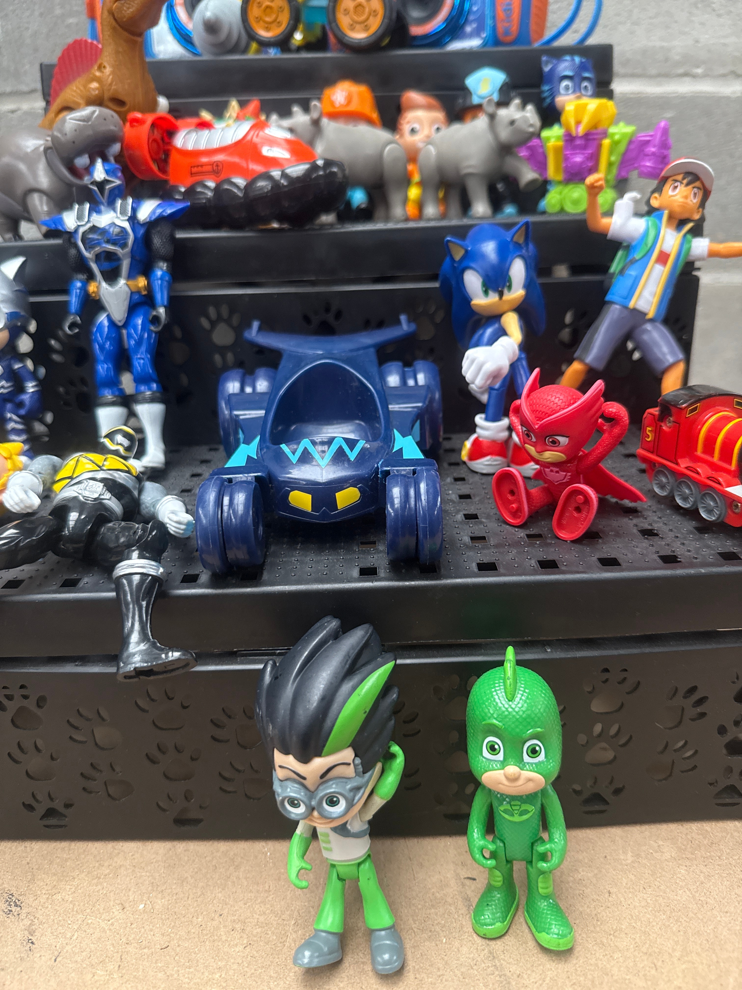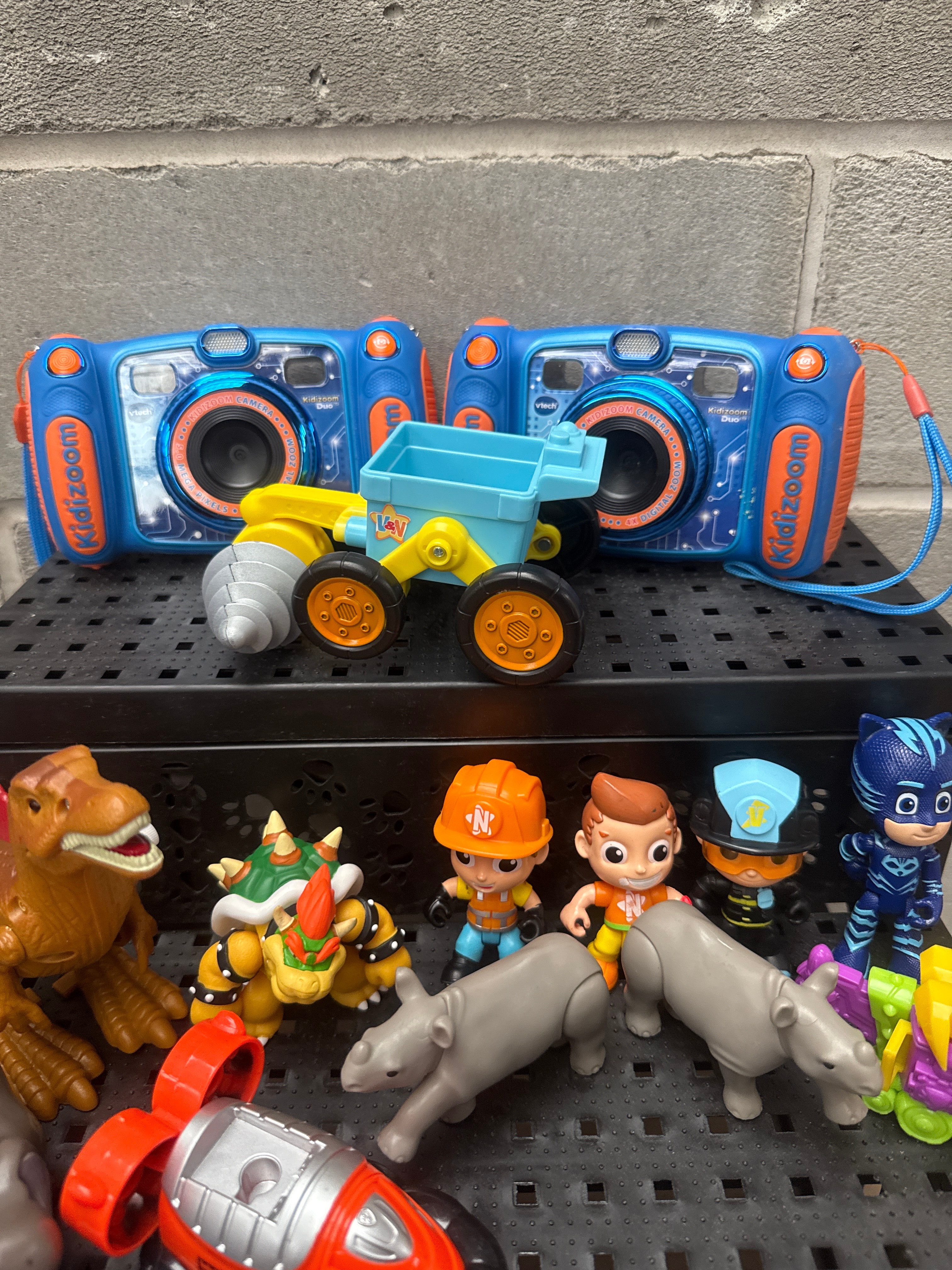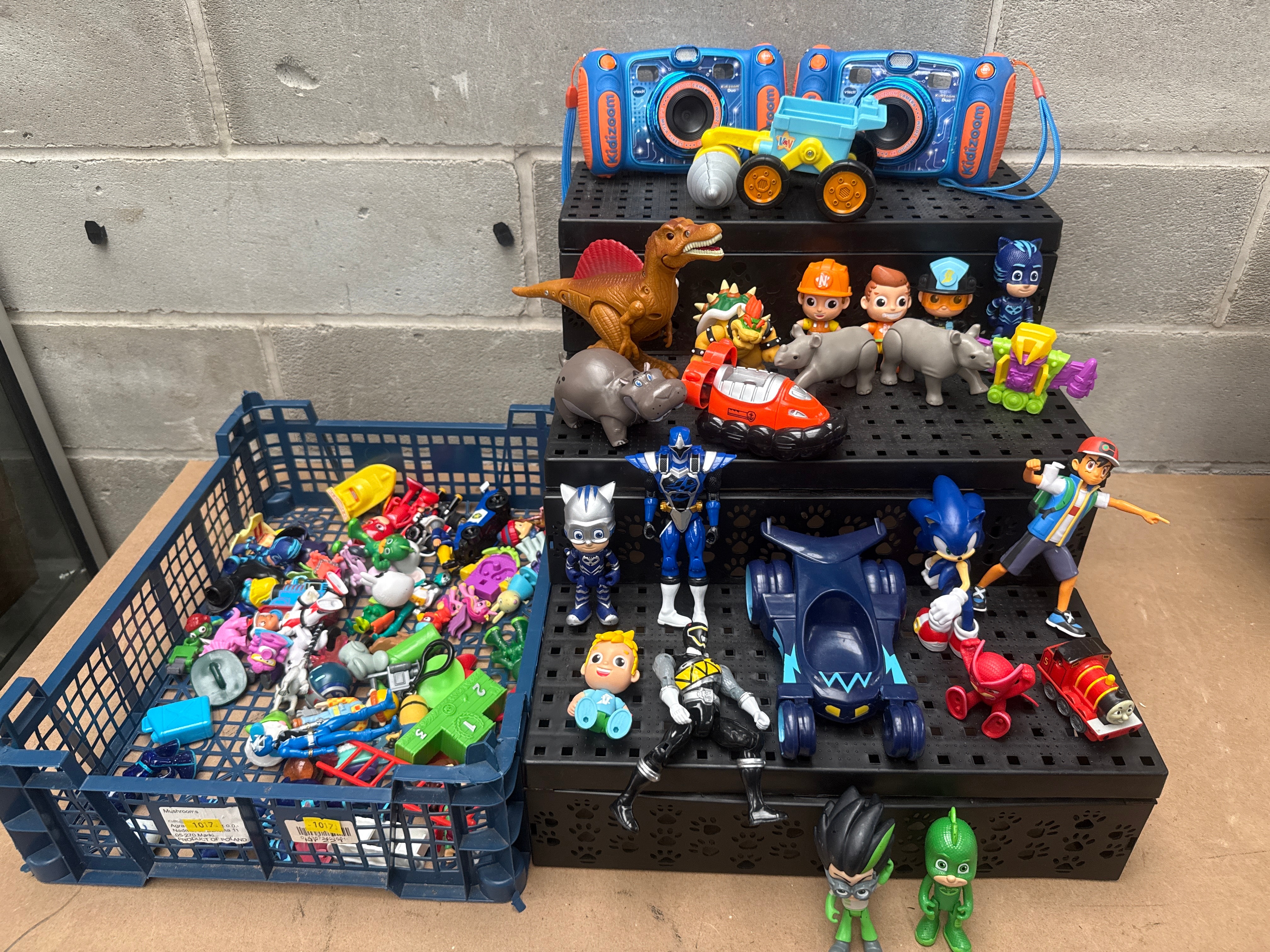 A substantial collection of modern children’s plastic toys, primarily featuring a large group of PJ Masks figures, vehicles (including Owlette’s vehicle), and accessories. Also included are two blue and orange VTech Kidizoom digital cameras, a small blue and yellow plastic construction vehicle, and numerous other plastic action figures and character toys. Specifically identifiable figures and items include a brown dinosaur, Bowser from the Mario series, Sonic the Hedgehog, generic construction worker figures, rhinoceros toys, and a red train engine, alongside various other small vehicles and assorted character figures. The items are primarily constructed from molded plastic, representing typical mass-produced toy styles of the 21st century. The collection is arranged partly on a tiered black display stand and partly within a blue plastic utility crate.