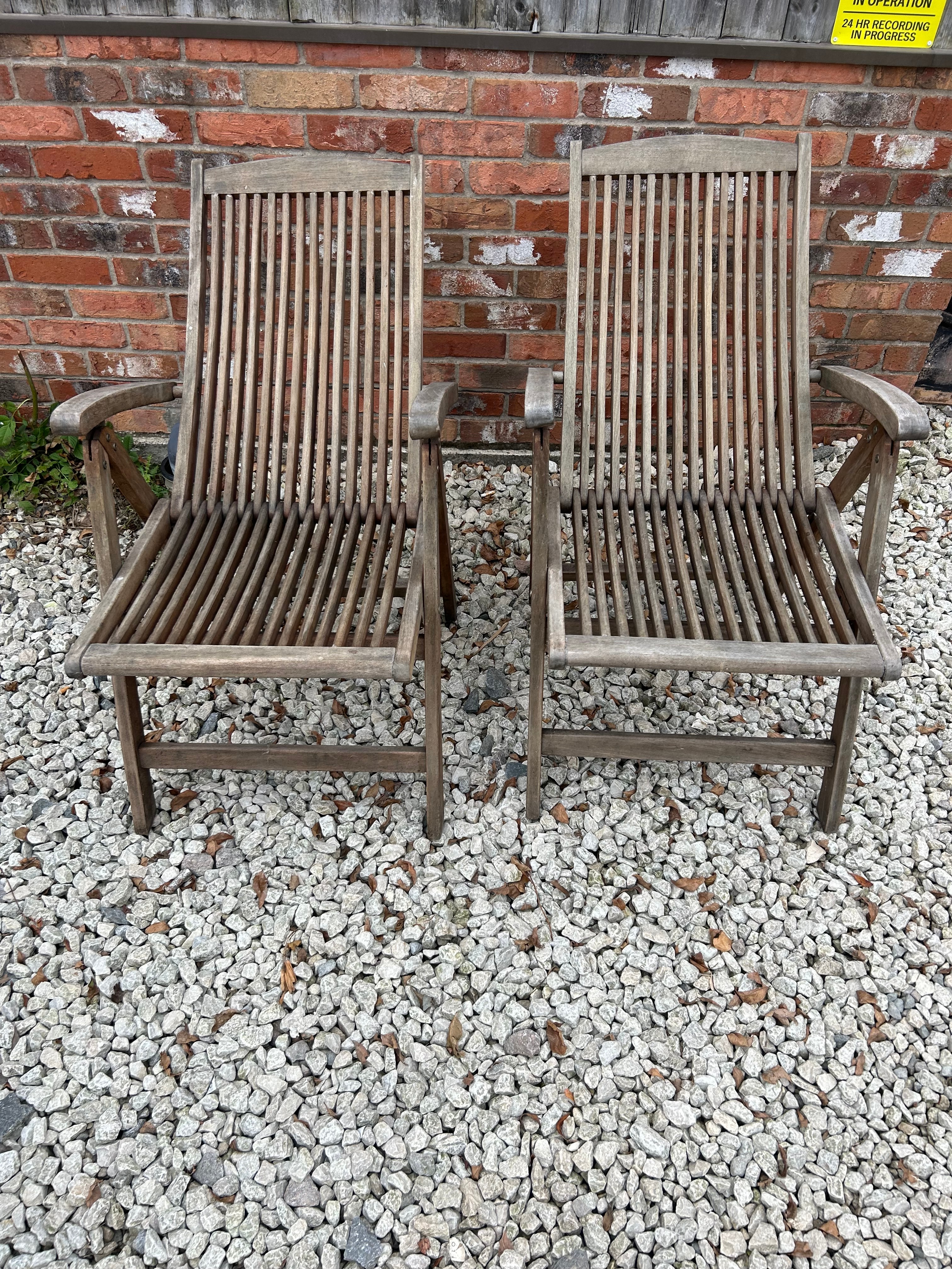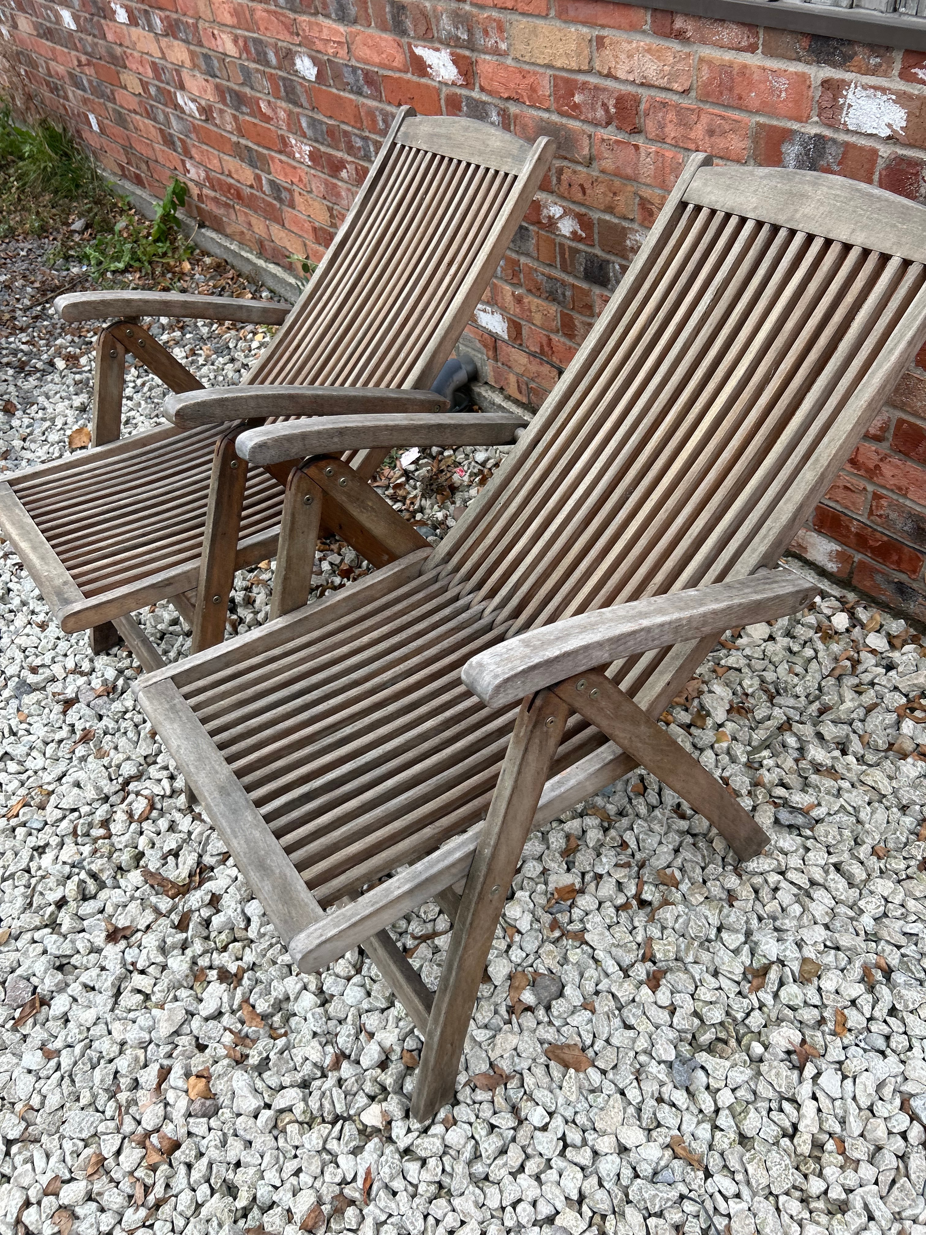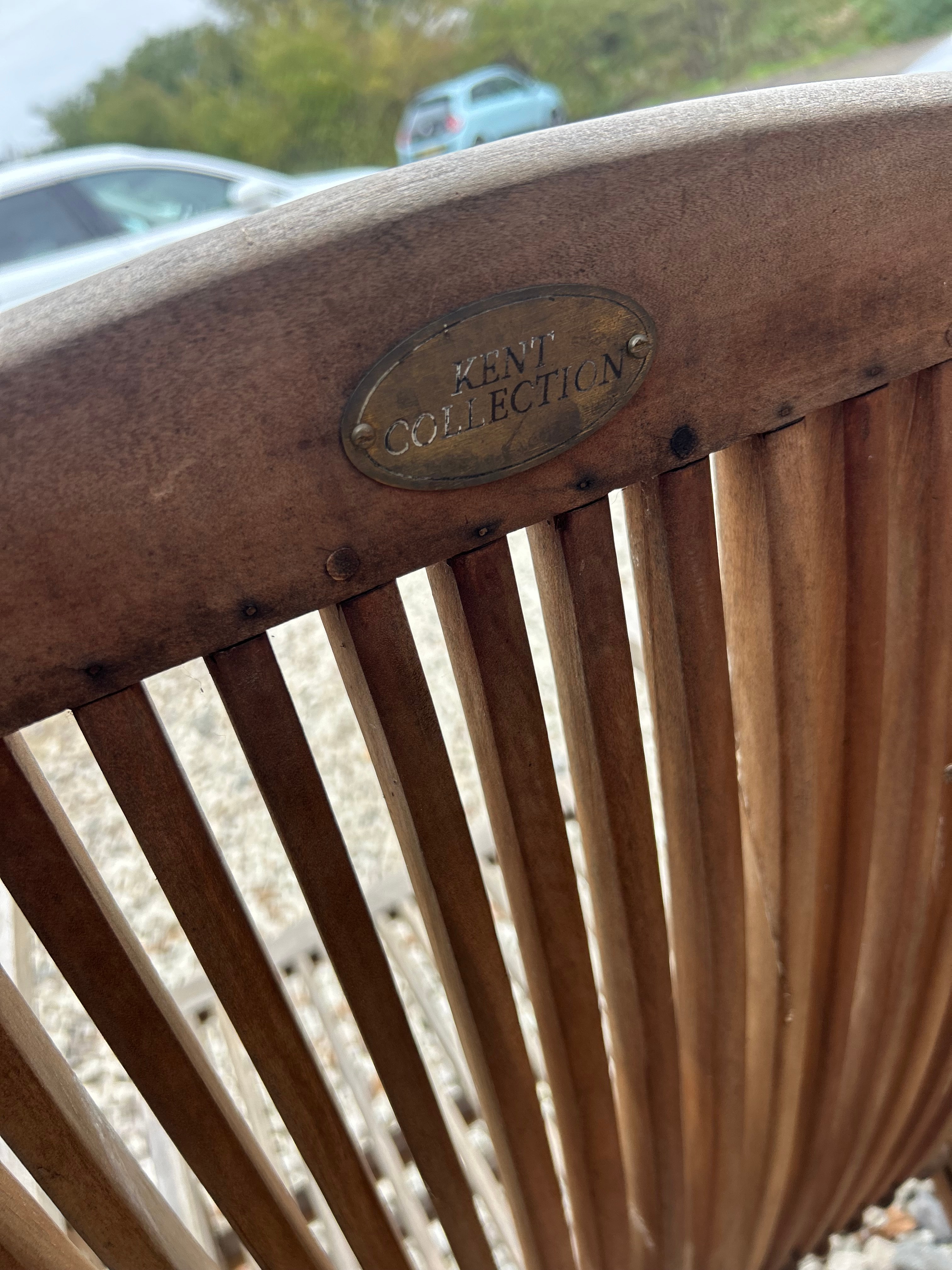 A pair of modern outdoor reclining chairs, branded ‘Kent Collection’, constructed from weathered hardwood, likely teak. Each chair features slatted seats and backs with broad armrests and a foldable design. One chair bears an oval brass-toned plaque on its backrest, engraved ‘KENT COLLECTION’.