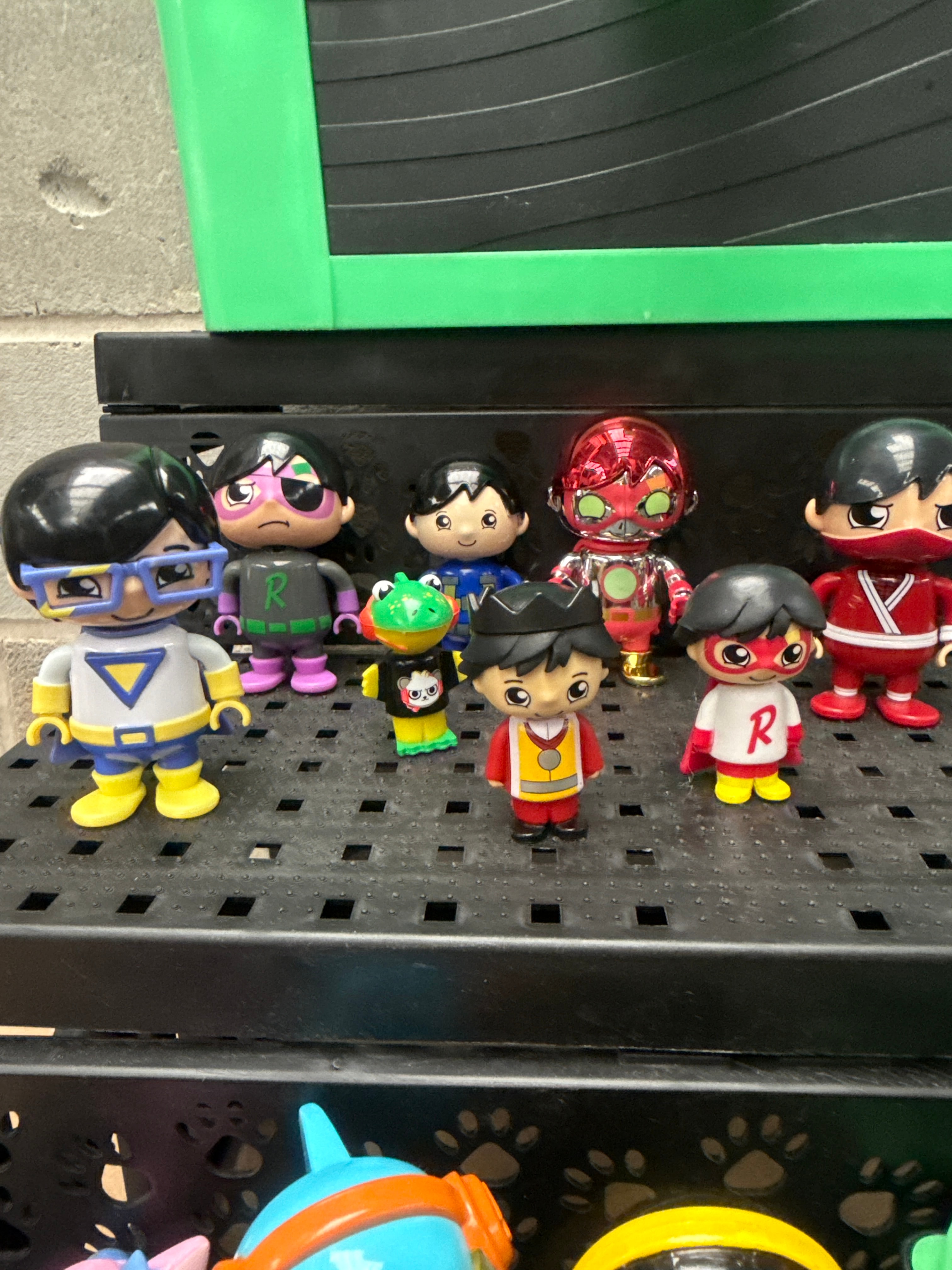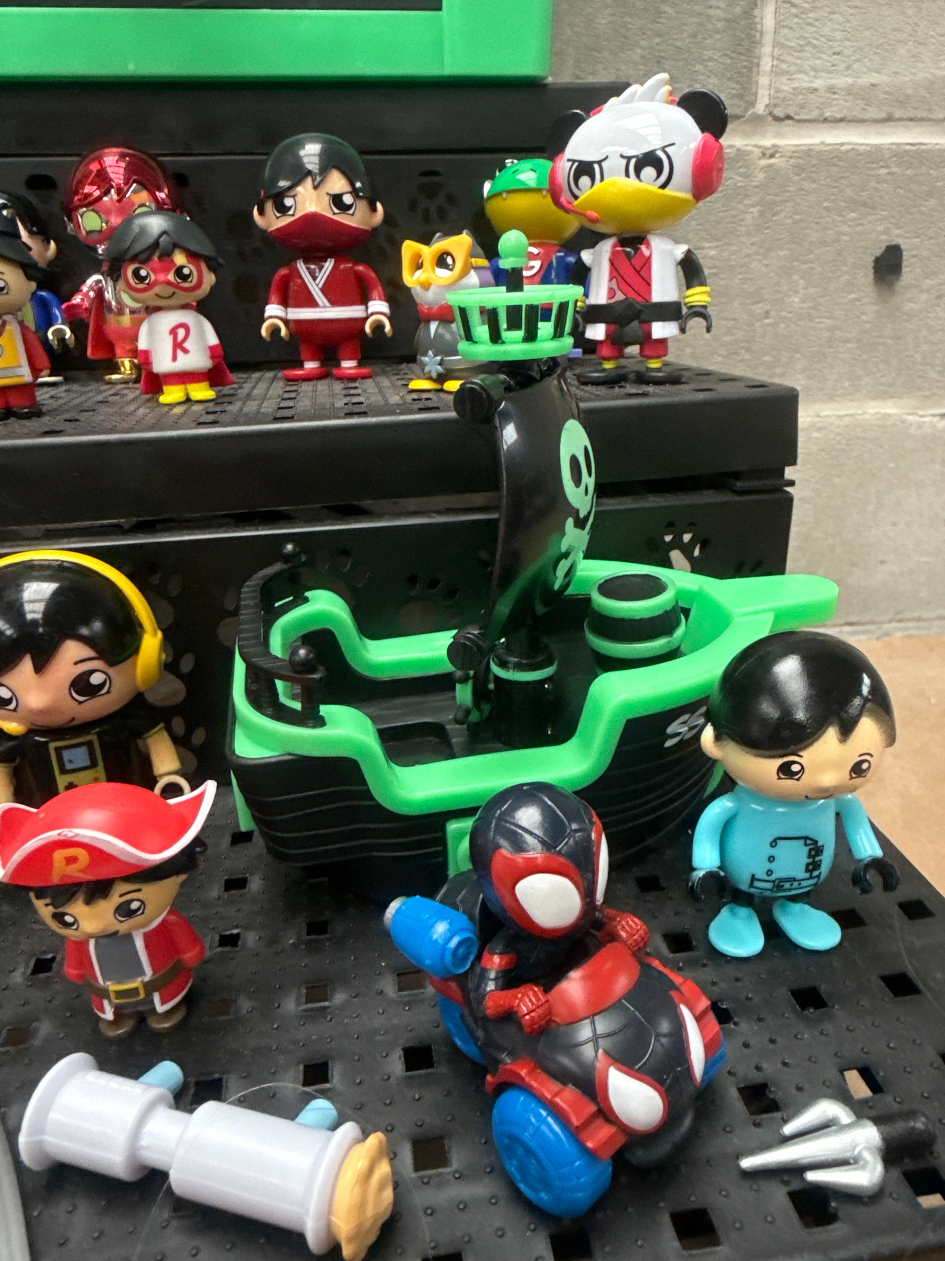A collection of Ryan’s World action figures and accessories. The lot comprises numerous modern plastic action figures and various playset accessories. The primary component is a bright green plastic toy treasure chest featuring a black corrugated front panel. The figures are predominantly stylized with large heads, small bodies, and black hair, often depicted in costumes such as superheroes, ninjas, and a pirate. Several figures bear a prominent red ‘R’ marking on their chests. Other included items consist of a small green and black plastic pirate ship, a spider-themed character on a vehicle, a megaphone-like accessory, small tools, and metallic-finish spheres.