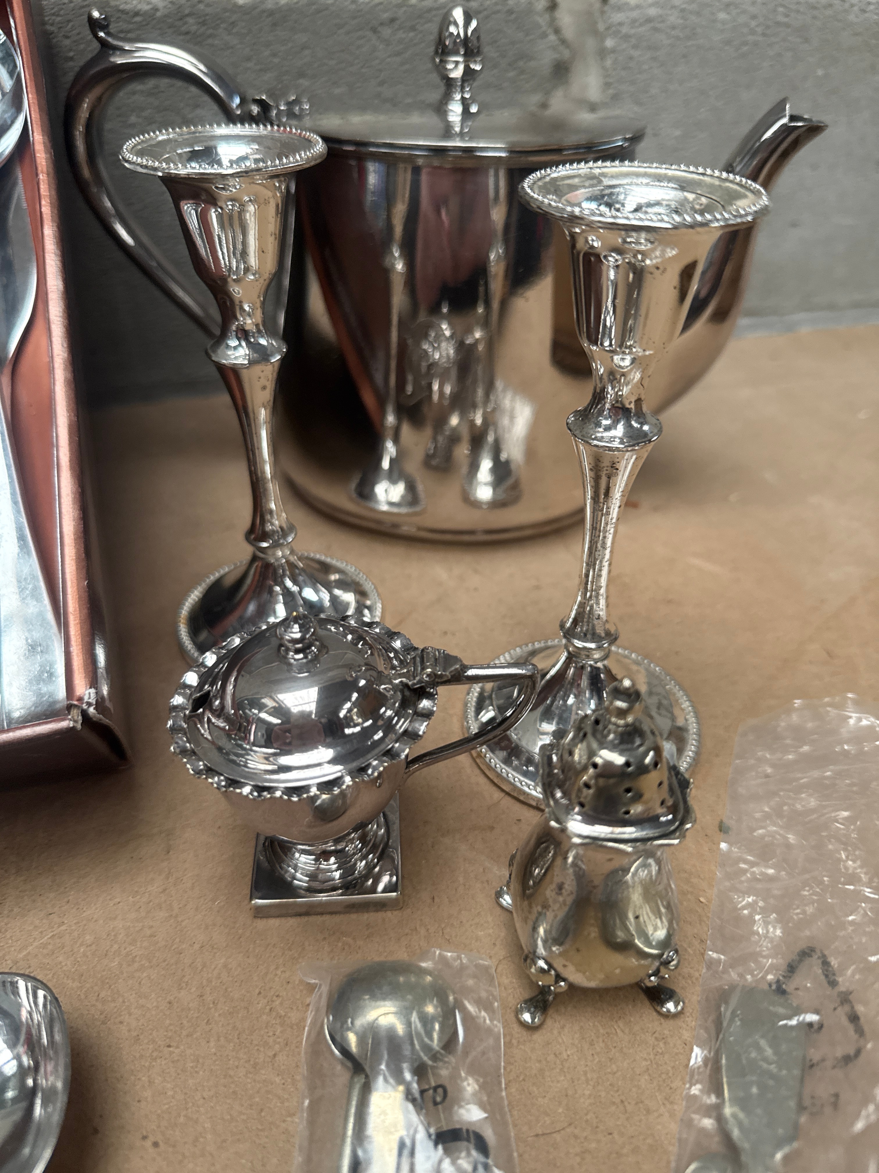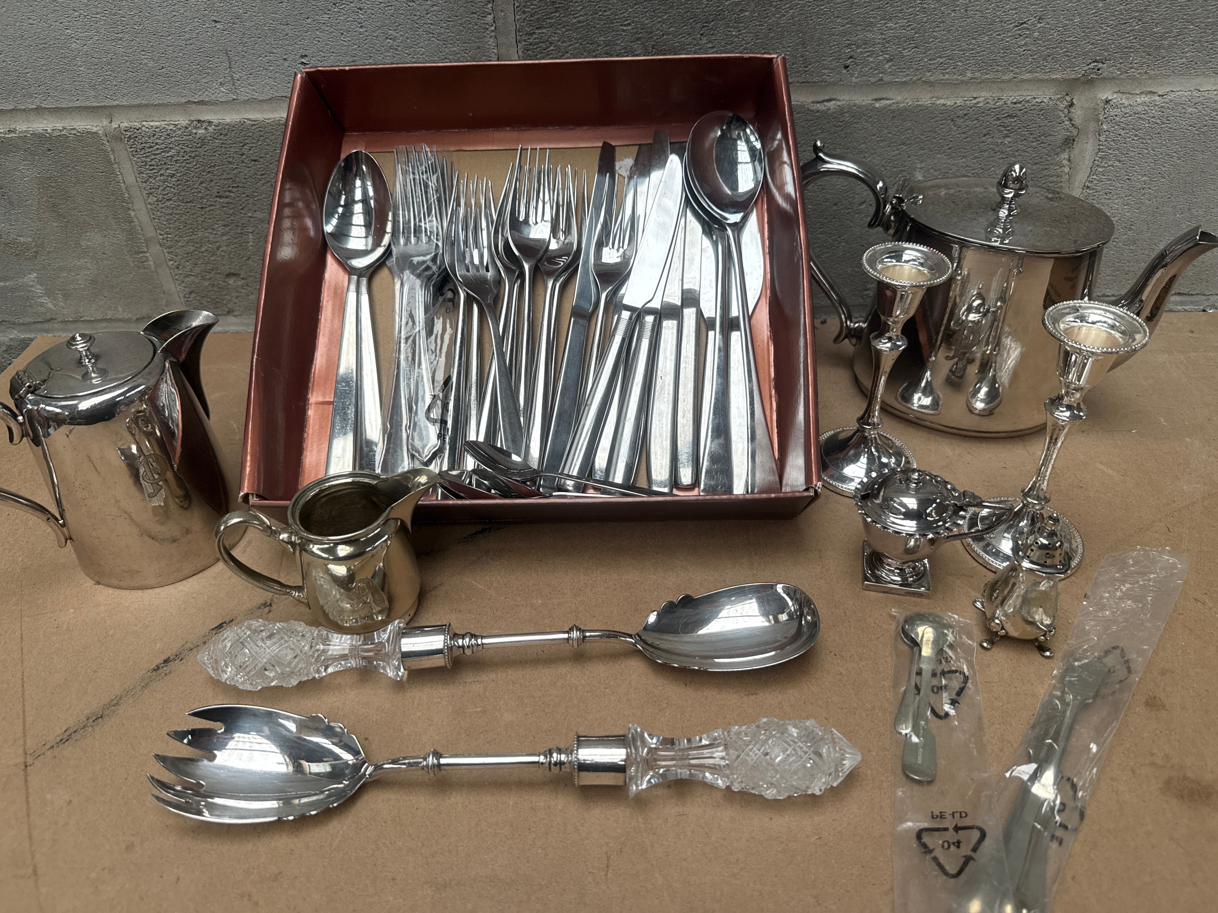 This lot comprises a diverse collection of silver-toned metalware. It features a substantial quantity of flatware, including spoons, forks, and knives, presented within a copper-toned metal storage tray. Adjacent items include two lidded pitchers, two single-light candleholders with reeded stems, and a linked condiment set consisting of a lidded bowl and a shaker. Also present are two elaborate serving utensils, each featuring faceted clear glass or crystal handles and silver-toned heads. The overall aesthetic is traditional/classical. The material appears to be predominantly silver-toned metal, likely silver plate or stainless steel, with glass/crystal elements. Visible markings include a ‘PP 04’ recycling symbol on clear plastic packaging around some smaller items.