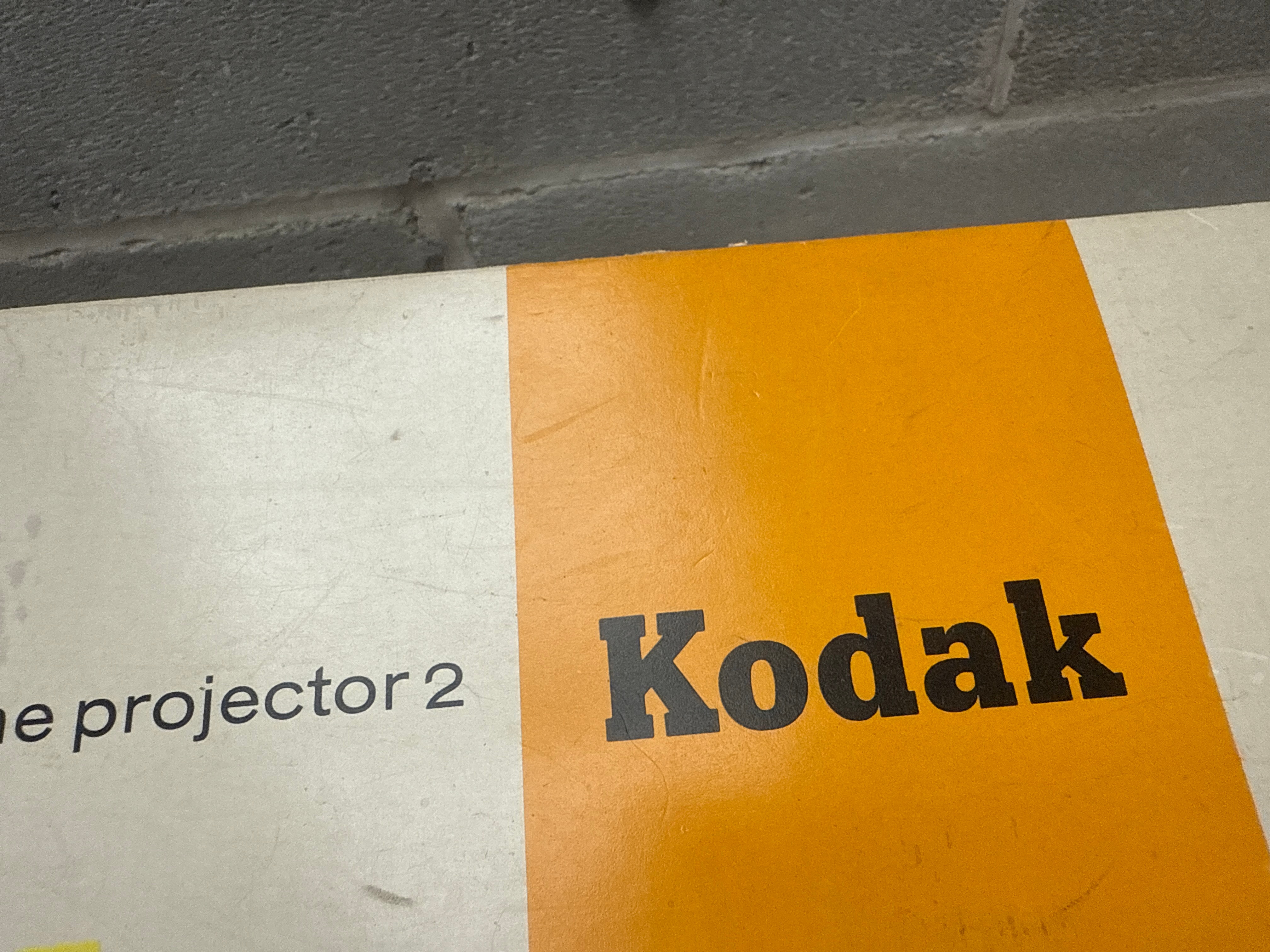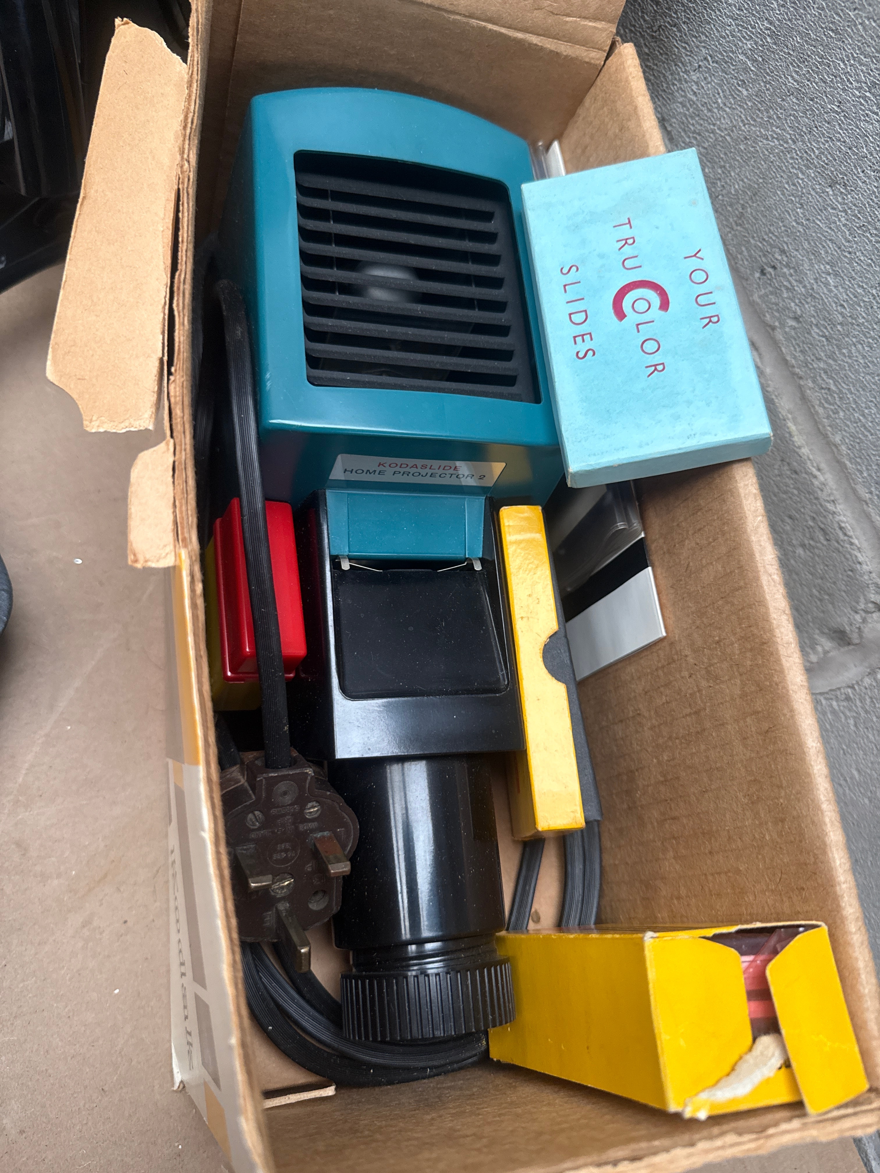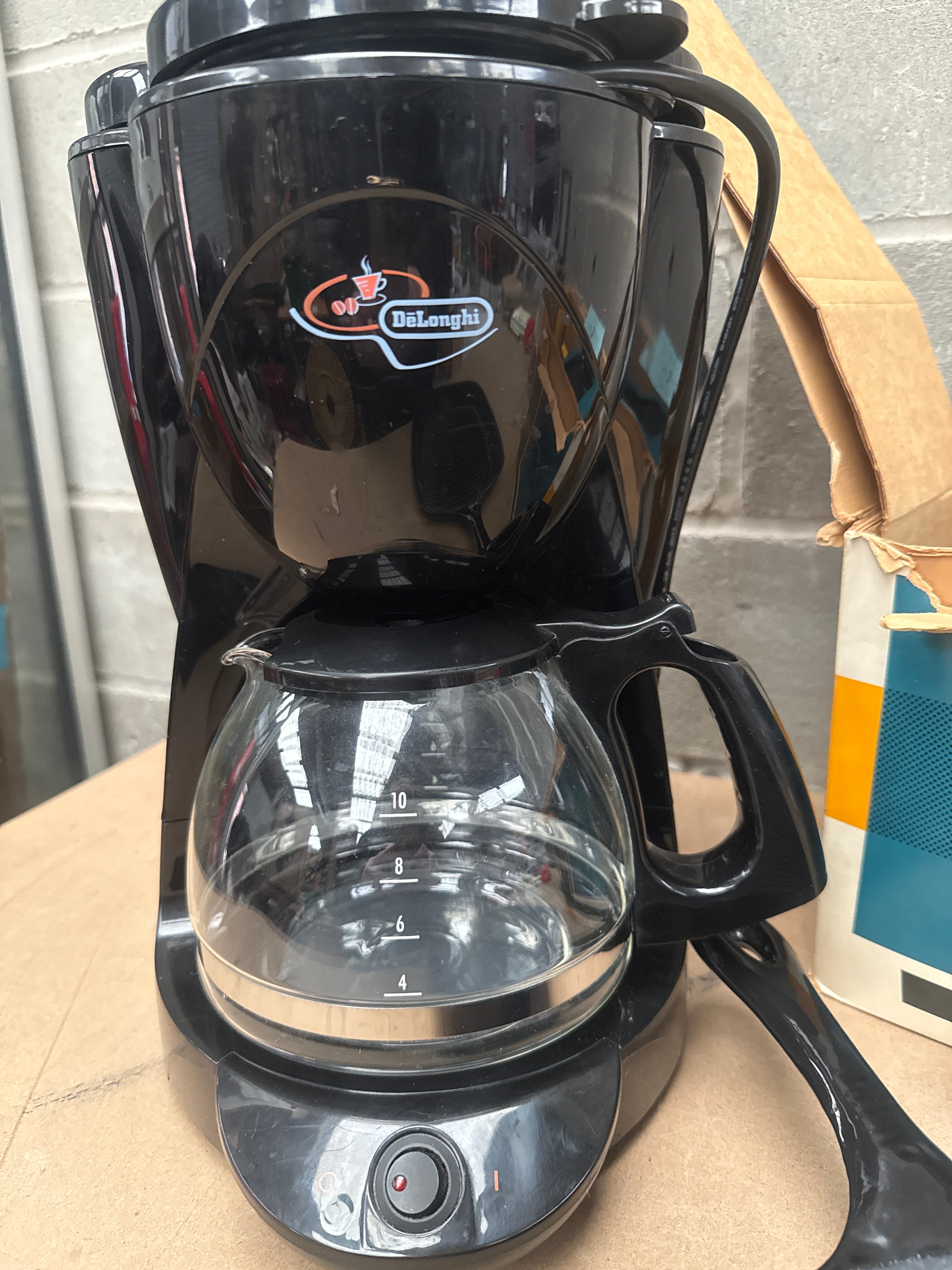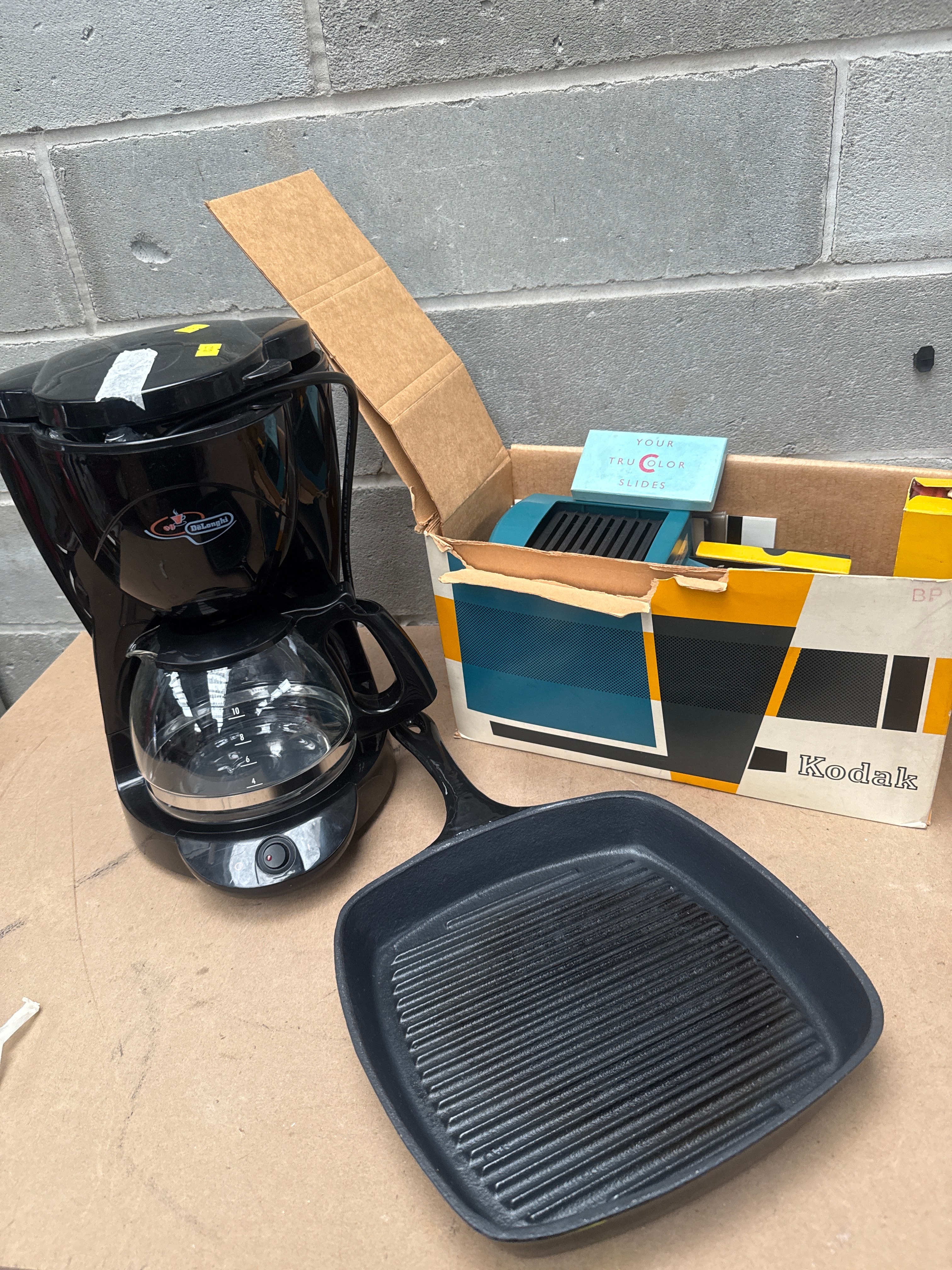 This lot comprises three distinct items. The first is a De’Longhi ICM2.B 10-Cup Filter Coffee Maker, designed for 220/240V operation. It is constructed primarily of black plastic with silver-toned accents and features a glass carafe with volume markings up to 10. The second item is a black square cast iron grill pan. The third item is a vintage Kodak “Kodavision Home Projector 2”, housed in its original orange and white cardboard box. The projector itself is turquoise-colored with black details and is accompanied by various cables and accessories, including a separate small blue box marked “YOUR TRU COLOR SLIDES”.