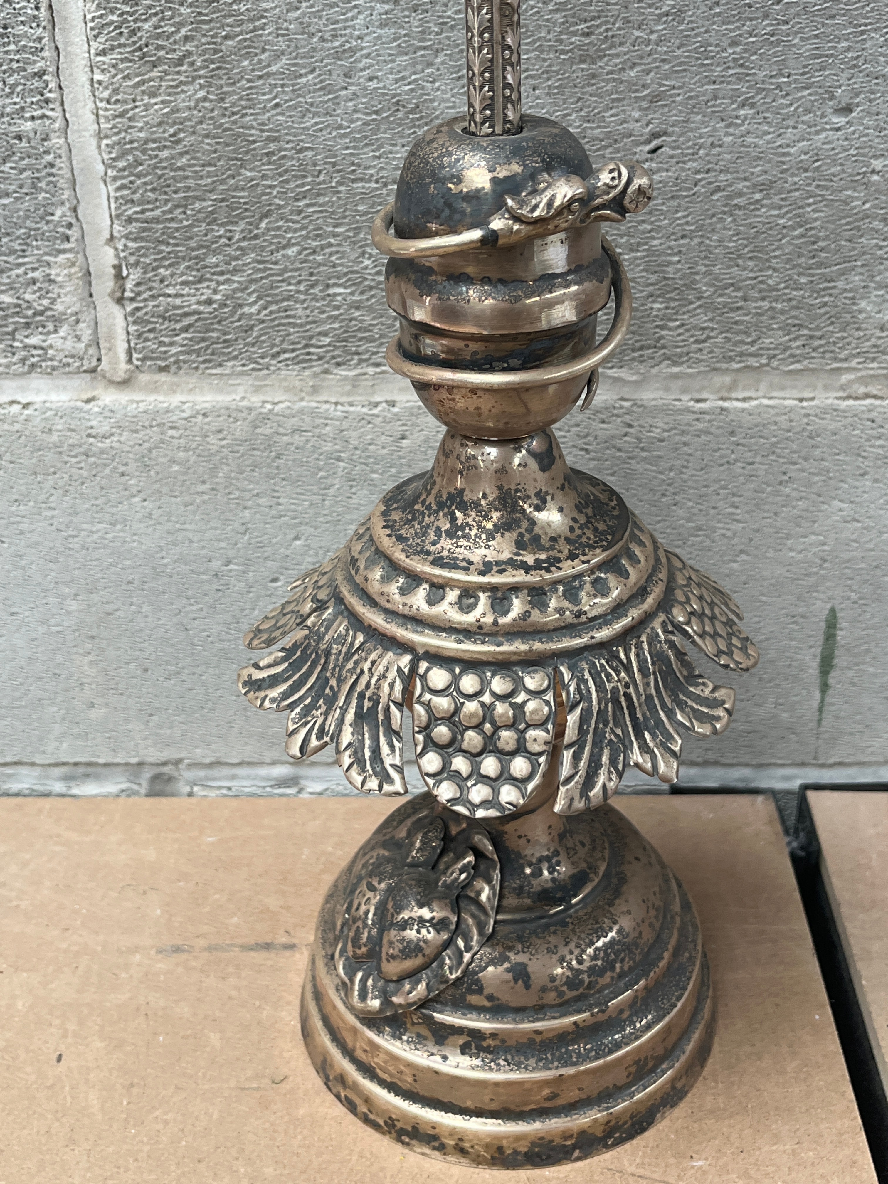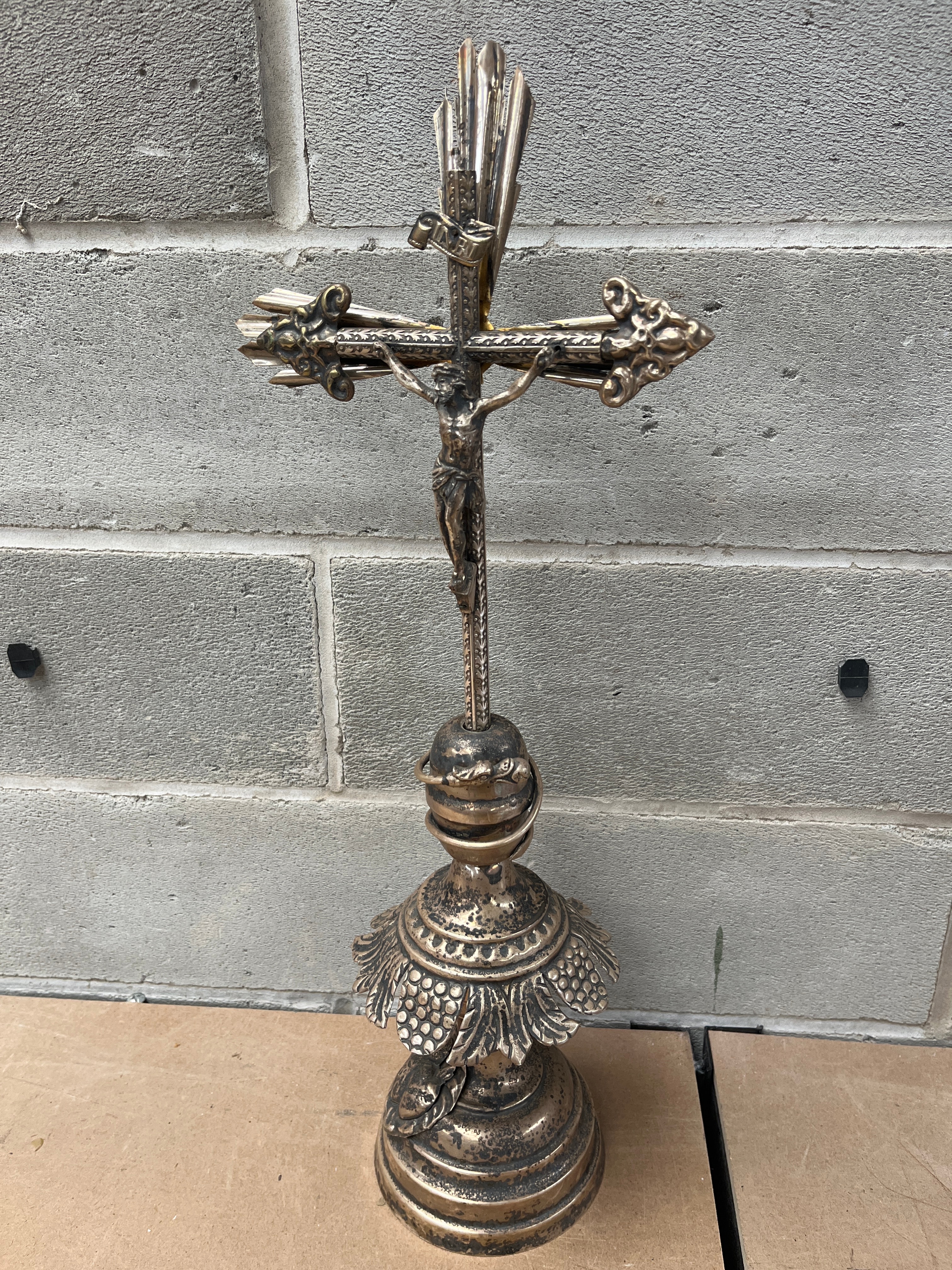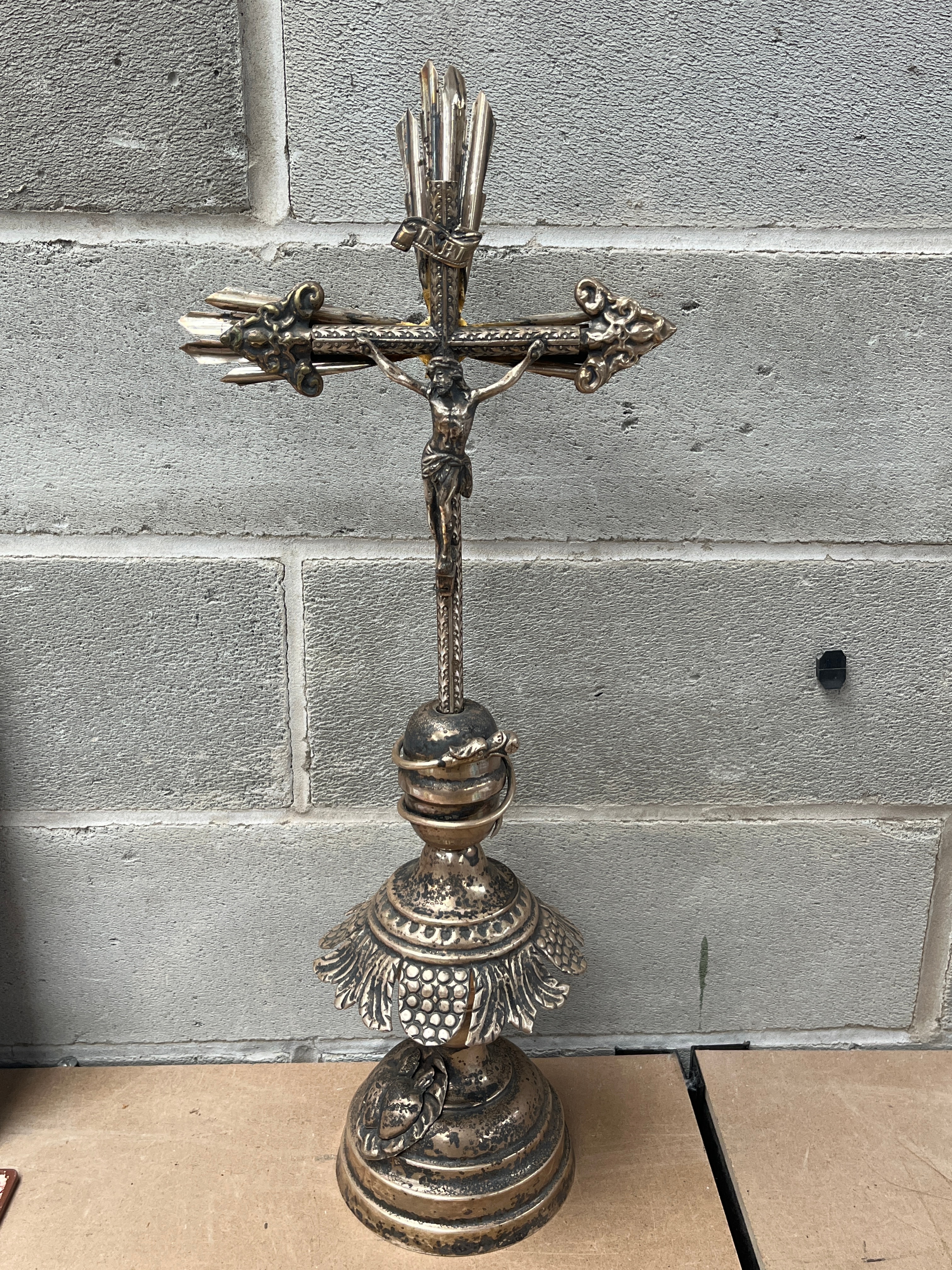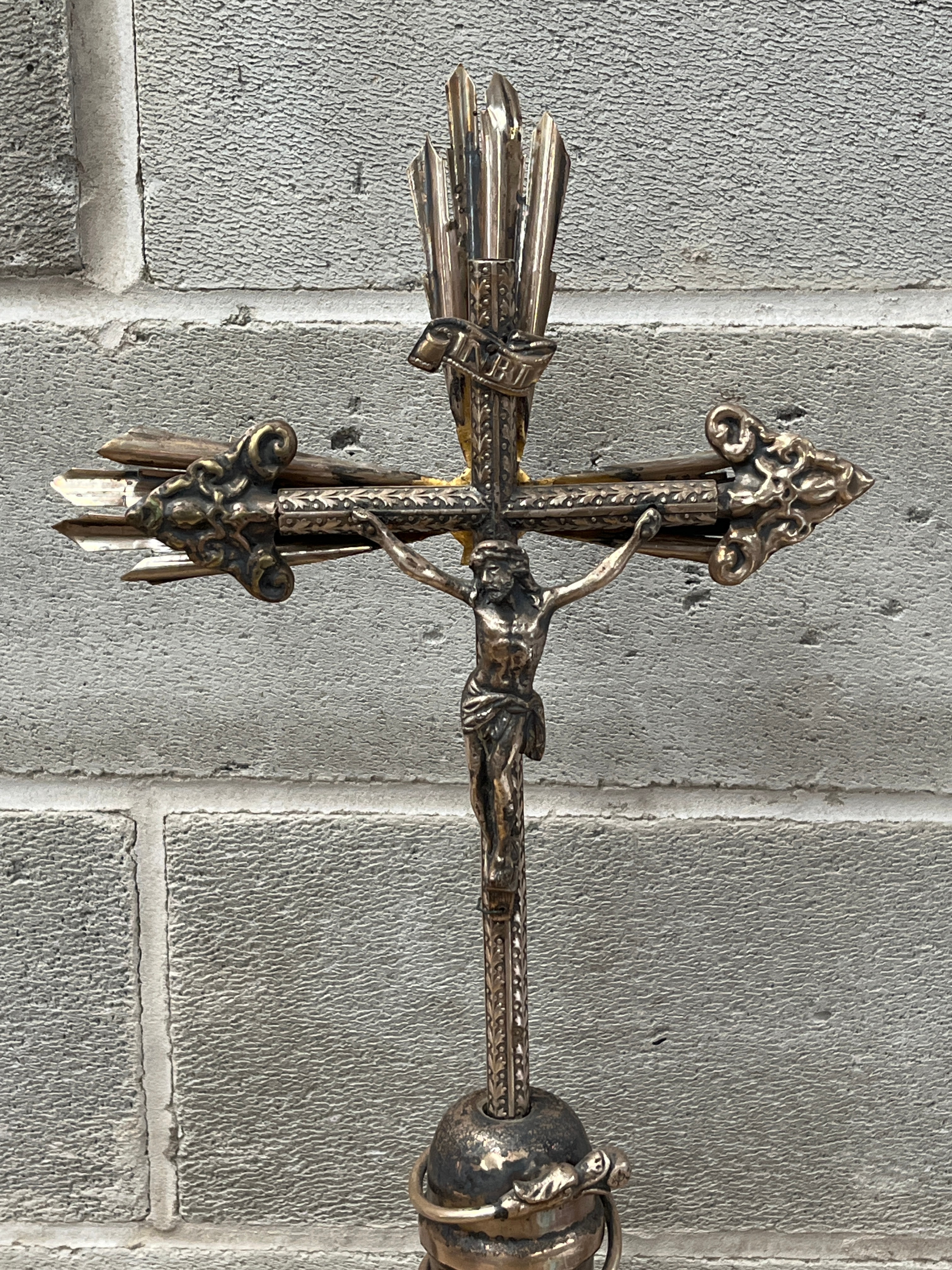 An Antique French Metal Altar Crucifix, likely cast from a patinated bronze or brass alloy. The cross features a detailed corpus of Christ, with flared, decorative terminals and a radiating sunburst motif above, where the titulus is inscribed ‘INRI’ (Iesus Nazarenus Rex Iudaeorum – Jesus of Nazareth, King of the Jews). The cross is supported by an elaborately turned stem which incorporates a spherical element encircled by a coiled serpent. The multi-tiered base is highly decorative, featuring scalloped edges, a berry-like texture, and relief elements at the bottom, including a skull and crossbones, symbolic of Golgotha. The item exhibits an aged, dark patina.