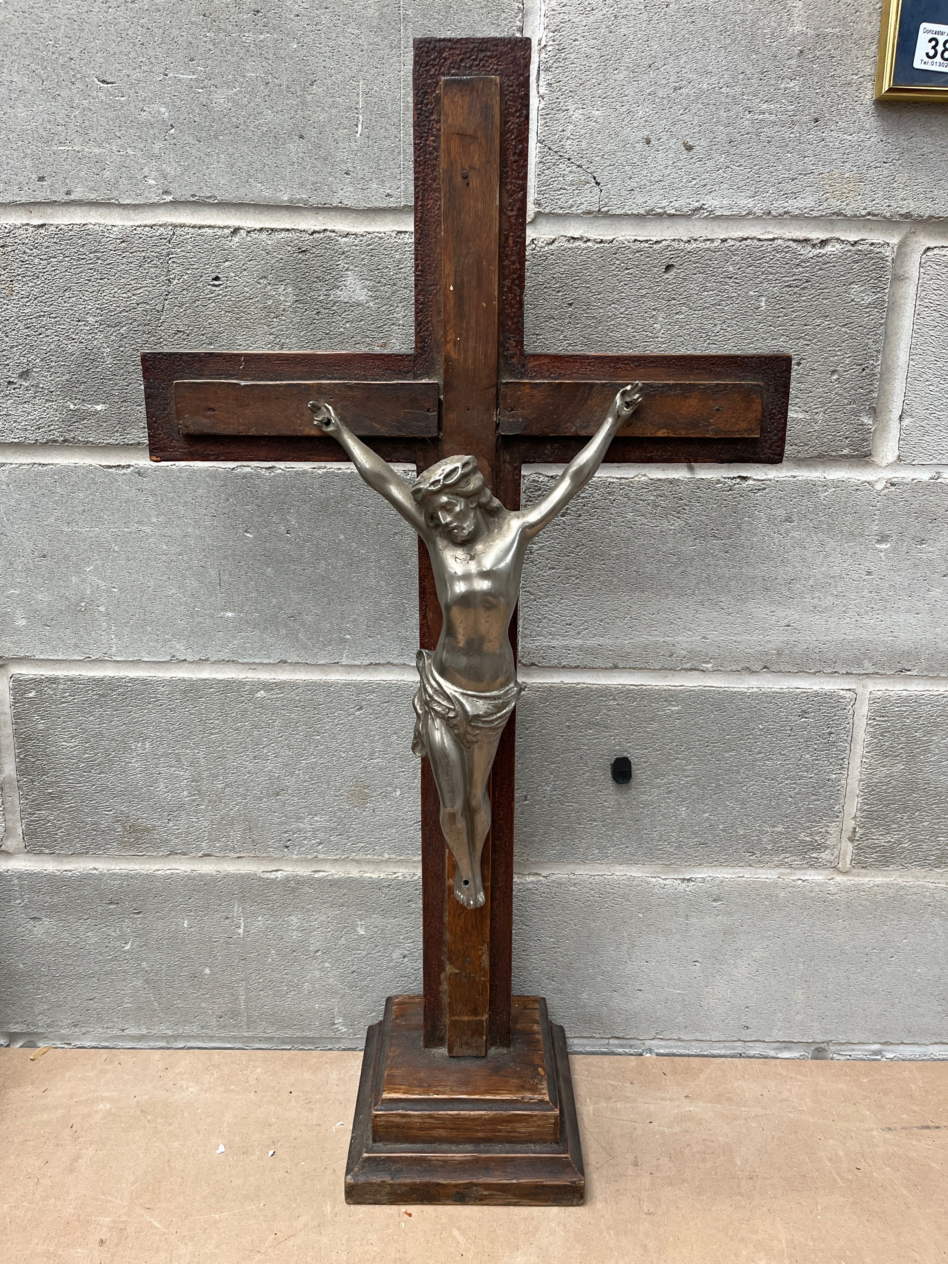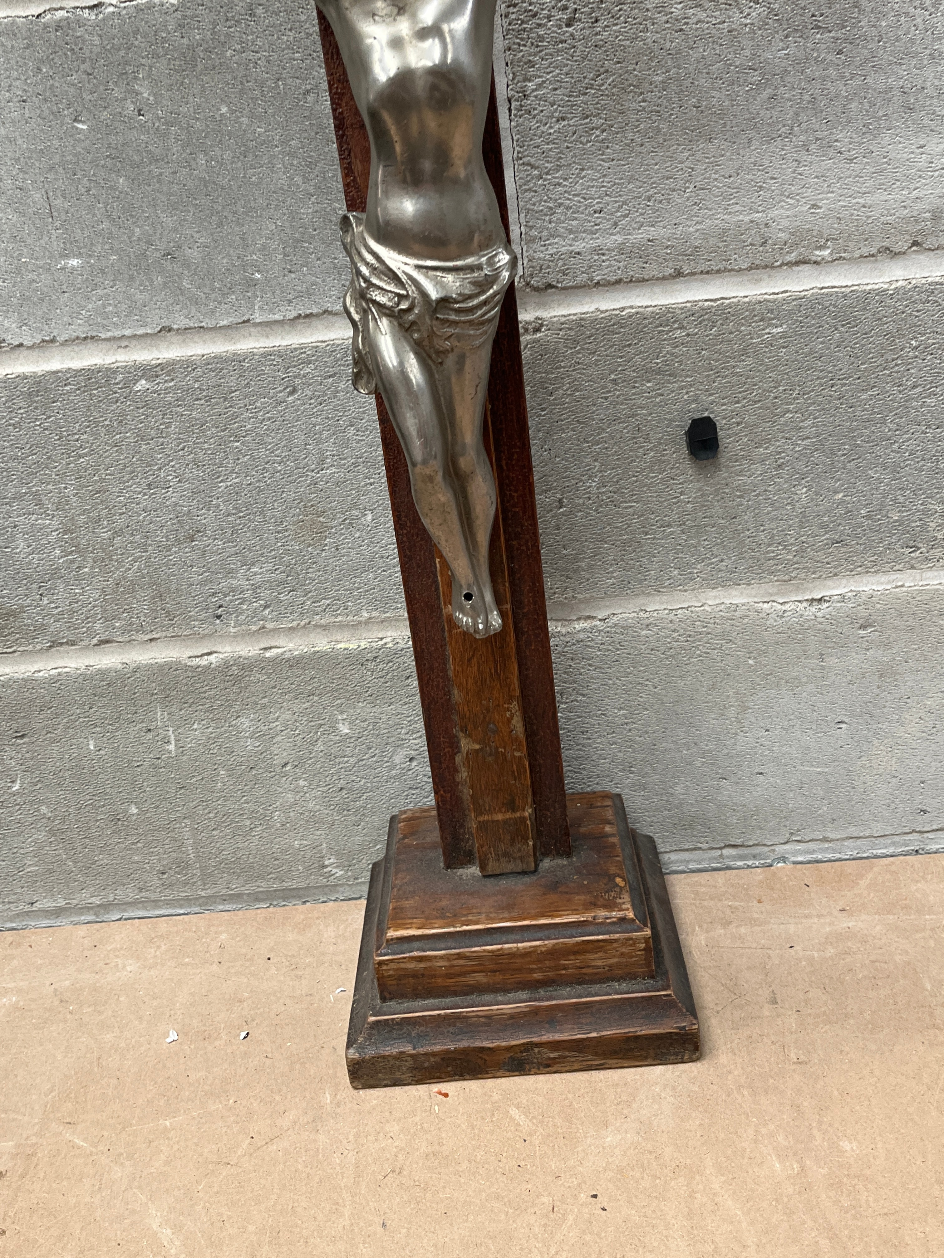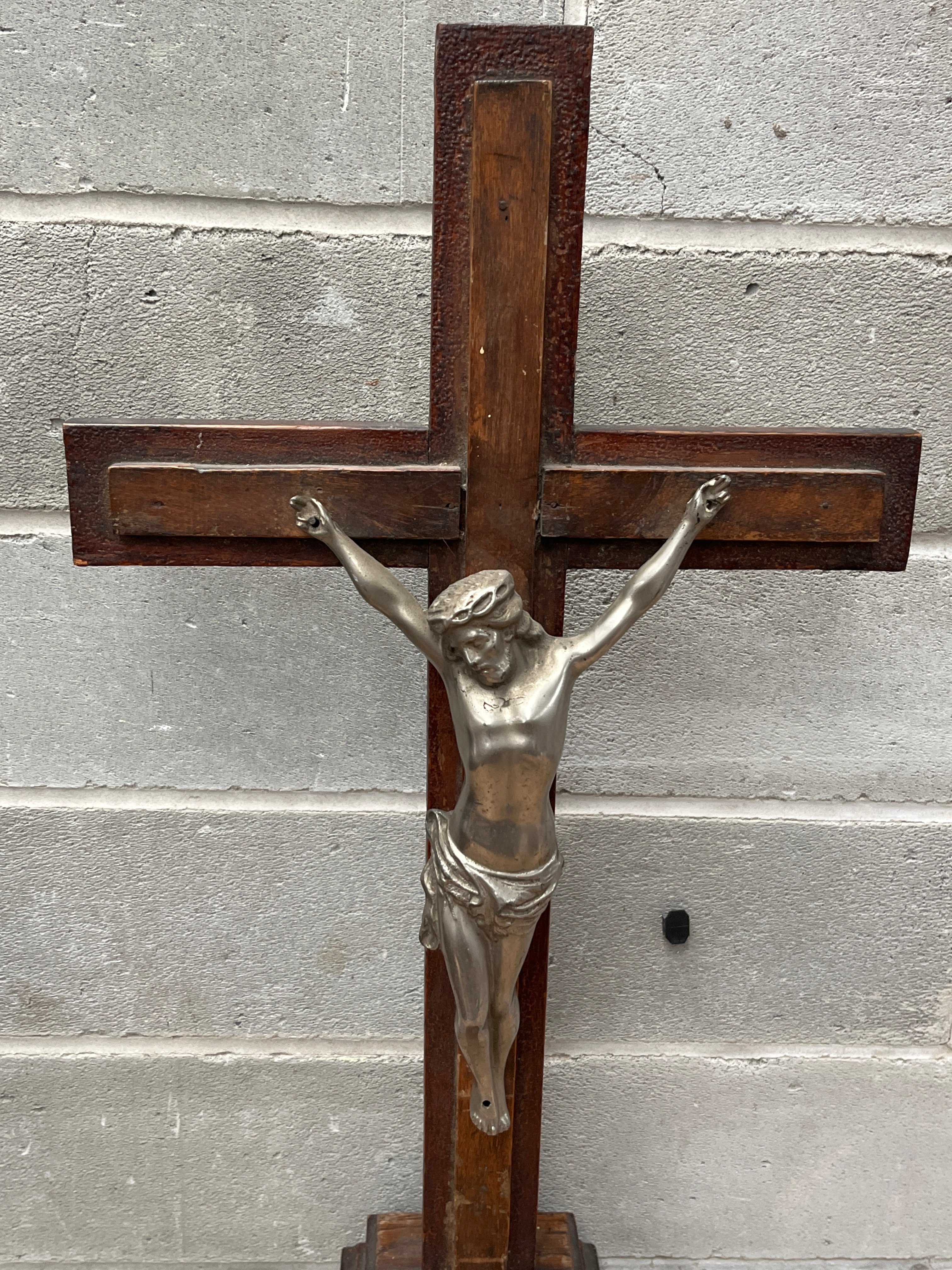 An antique French standing crucifix, featuring a silver-toned metal corpus of Christ, depicted with a crown of thorns and a loincloth. The corpus is affixed to a dark stained or polished wooden cross, which is mounted on a matching stepped wooden base. The piece presents in a traditional religious devotional style. No visible text or maker’s marks are discernible on the item itself.