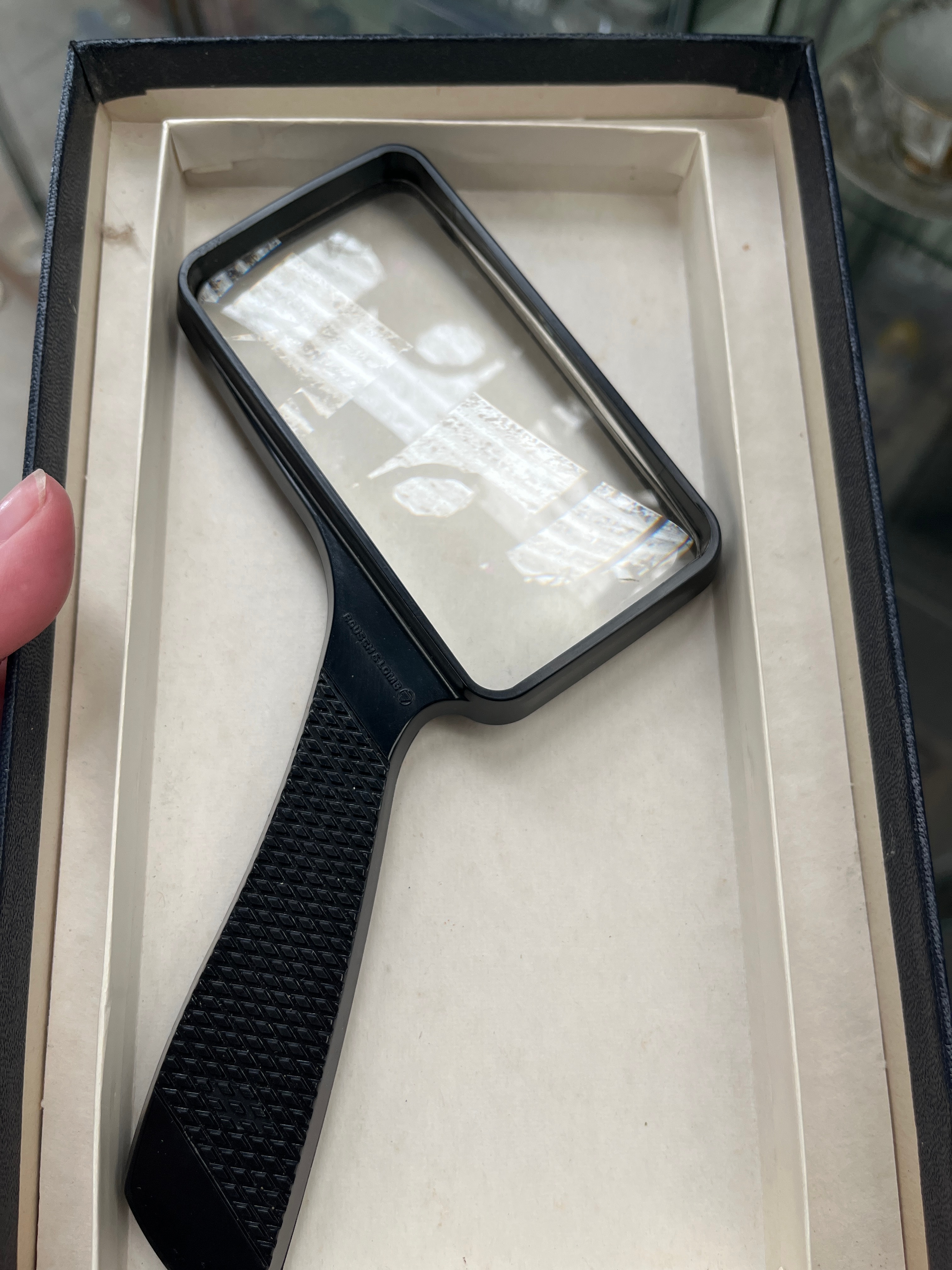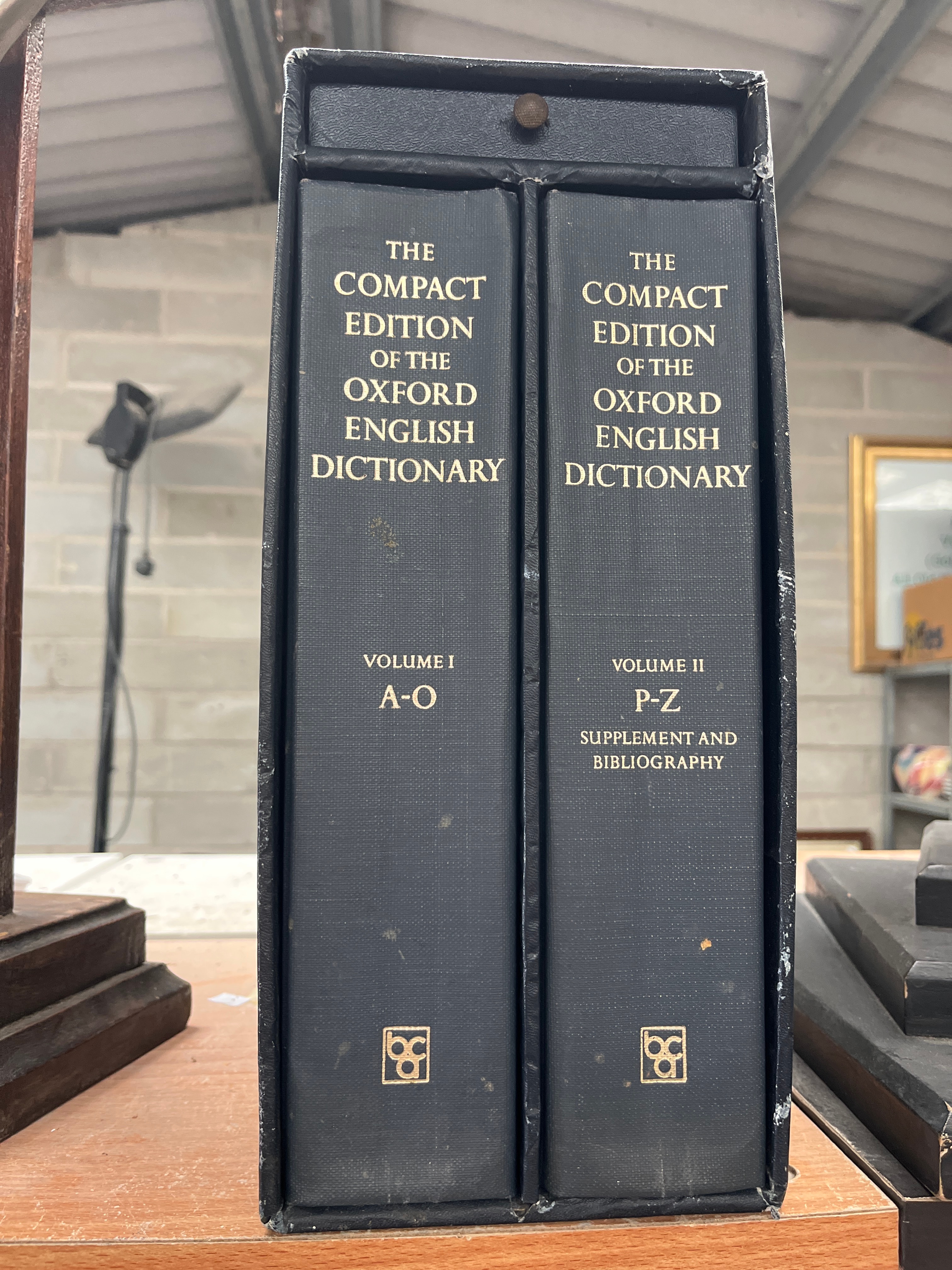 The Compact Edition Of The Oxford English Dictionary, a two-volume set, housed within a dark, likely cloth-covered slipcase. Both volumes are bound in a matching dark material with gilt lettering, identifying them as “VOLUME I A-O” and “VOLUME II P-Z SUPPLEMENT AND BIBLIOGRAPHY.” Each spine features a distinctive gold double ‘O’ or similar stylized logo at the base. Integrated within the slipcase is a rectangular magnifying glass with a black plastic handle and frame, marked “MADE IN HONG KONG.”
