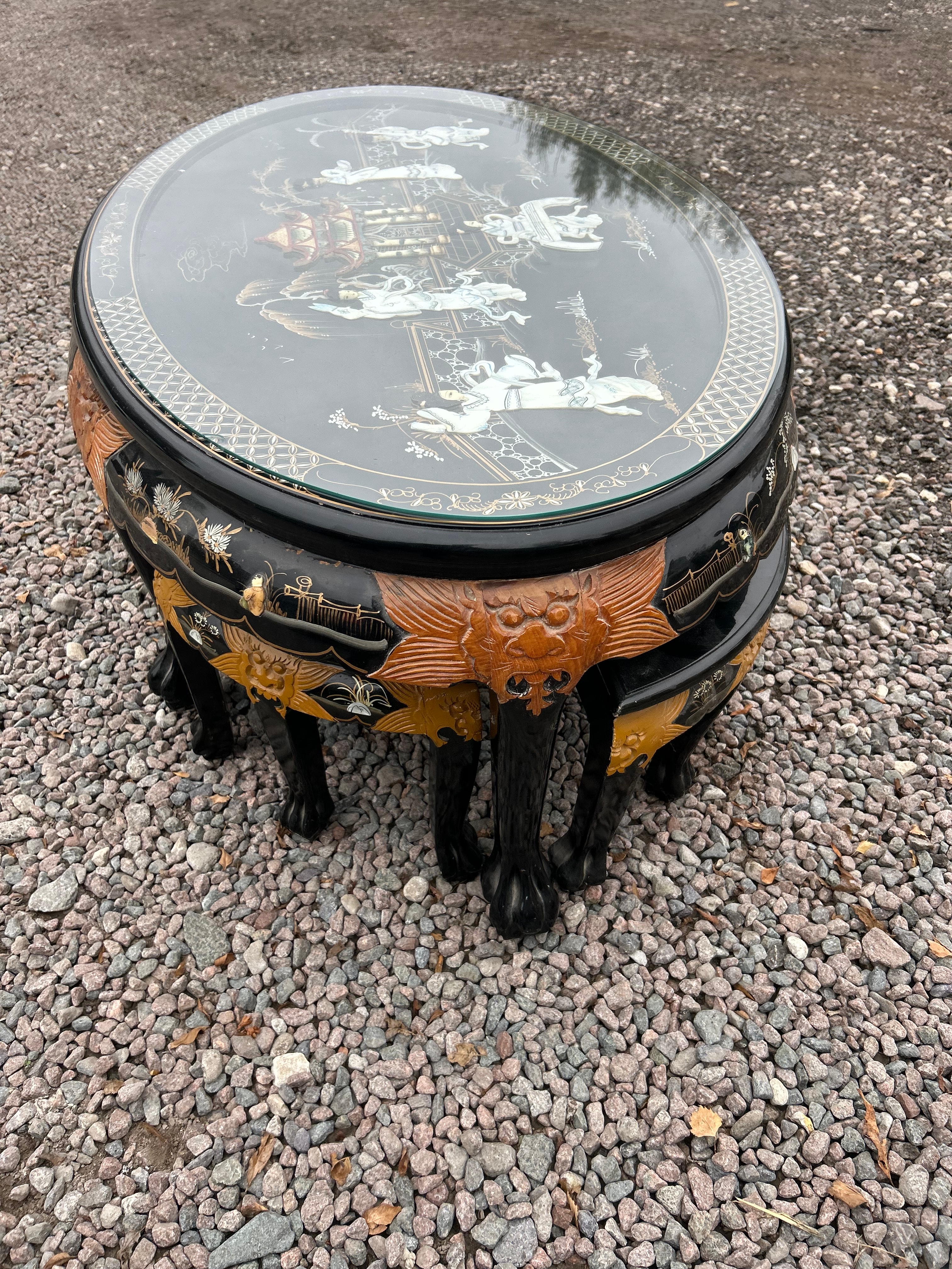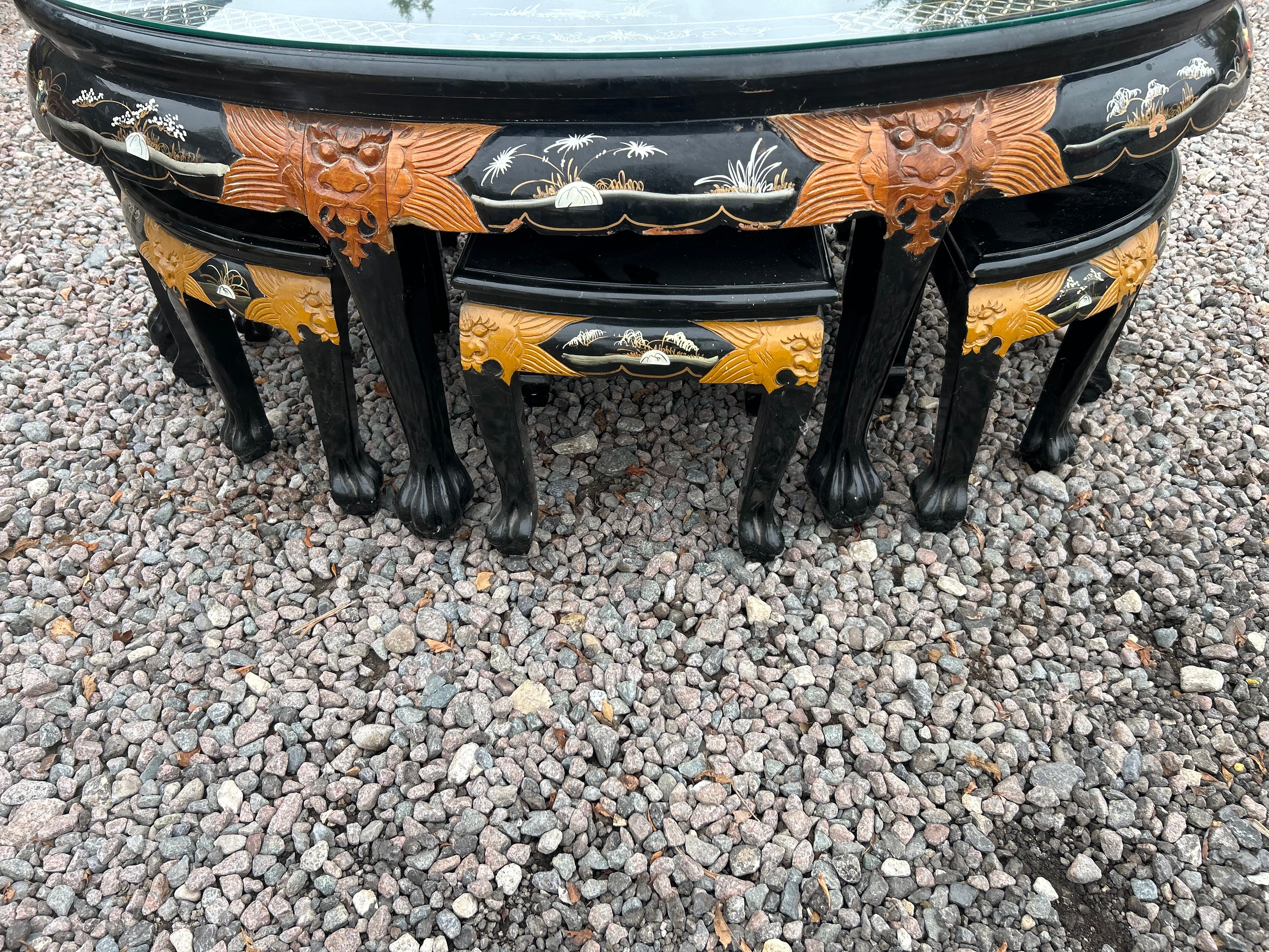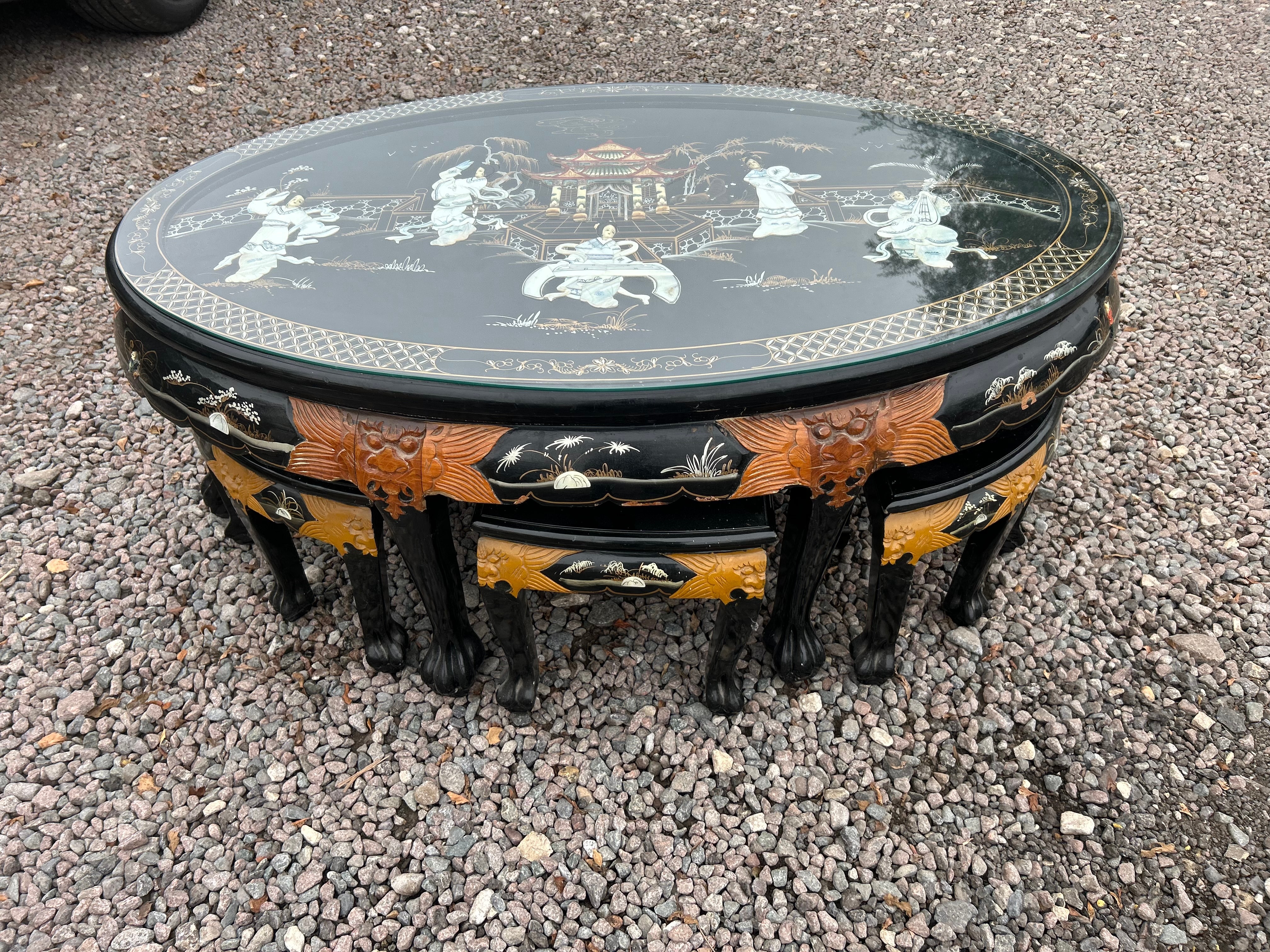 A Chinese-style nesting coffee table set, comprising a large black lacquered wood oval coffee table with four smaller matching tables or stools stored beneath. The surfaces are richly decorated with shell inlay and gilded accents, depicting an intricate scene on the main tabletop under a protective glass panel. This scene features figures in traditional attire, a pagoda, and various landscape elements. The table aprons and legs, including carved dragon heads and clawed feet, are also adorned with decorative patterns. No discernible text or manufacturer’s markings are visible.