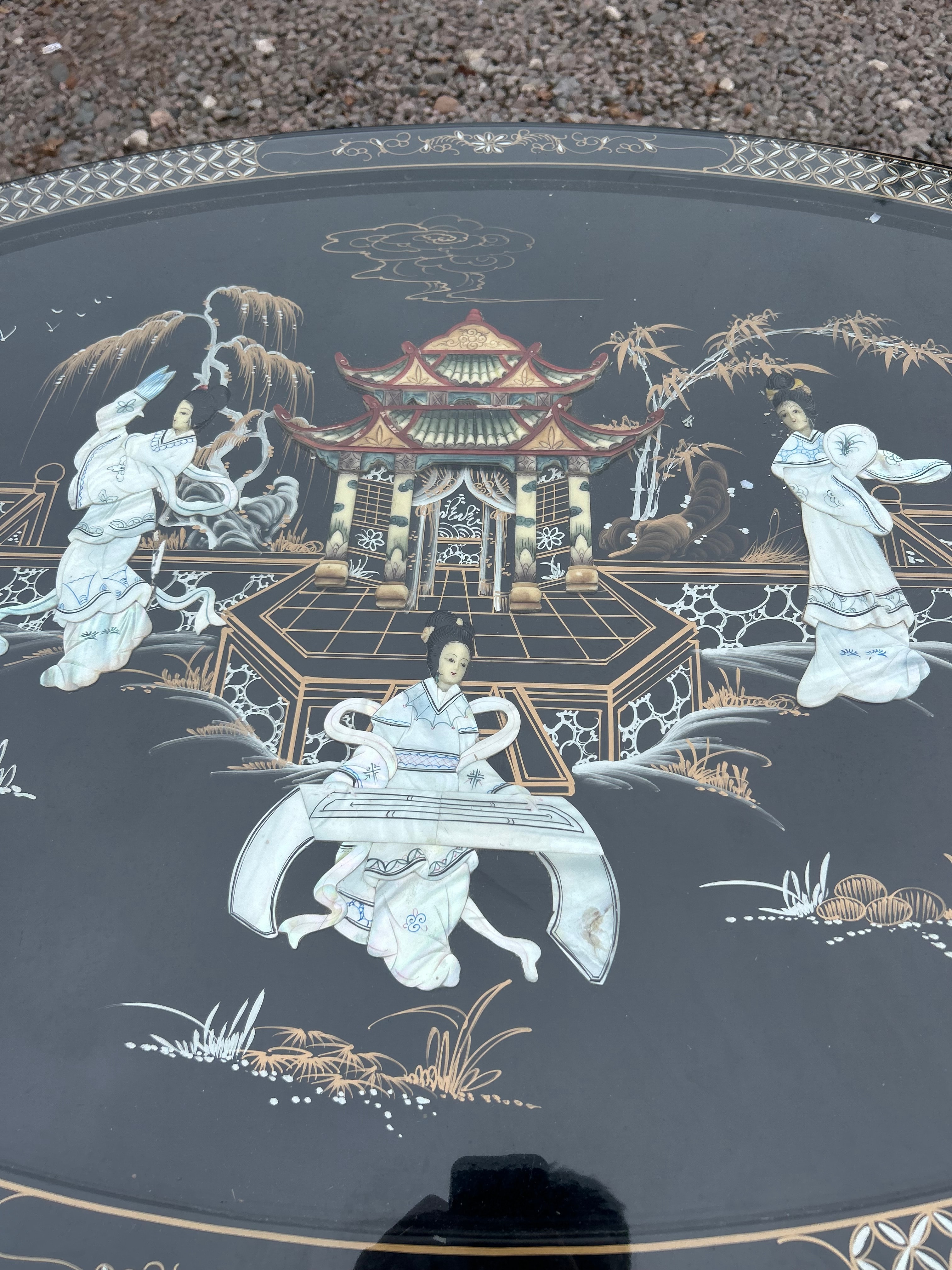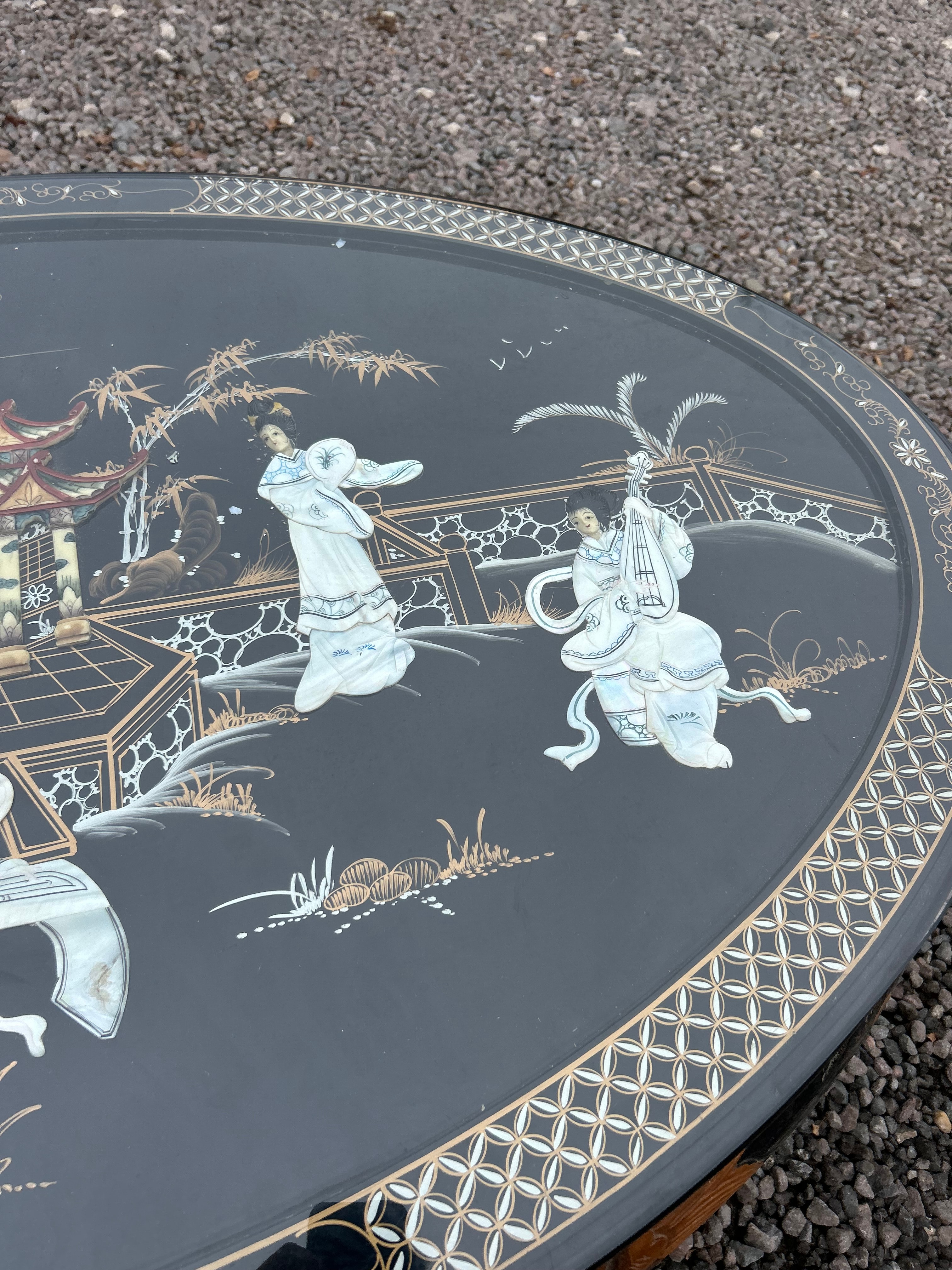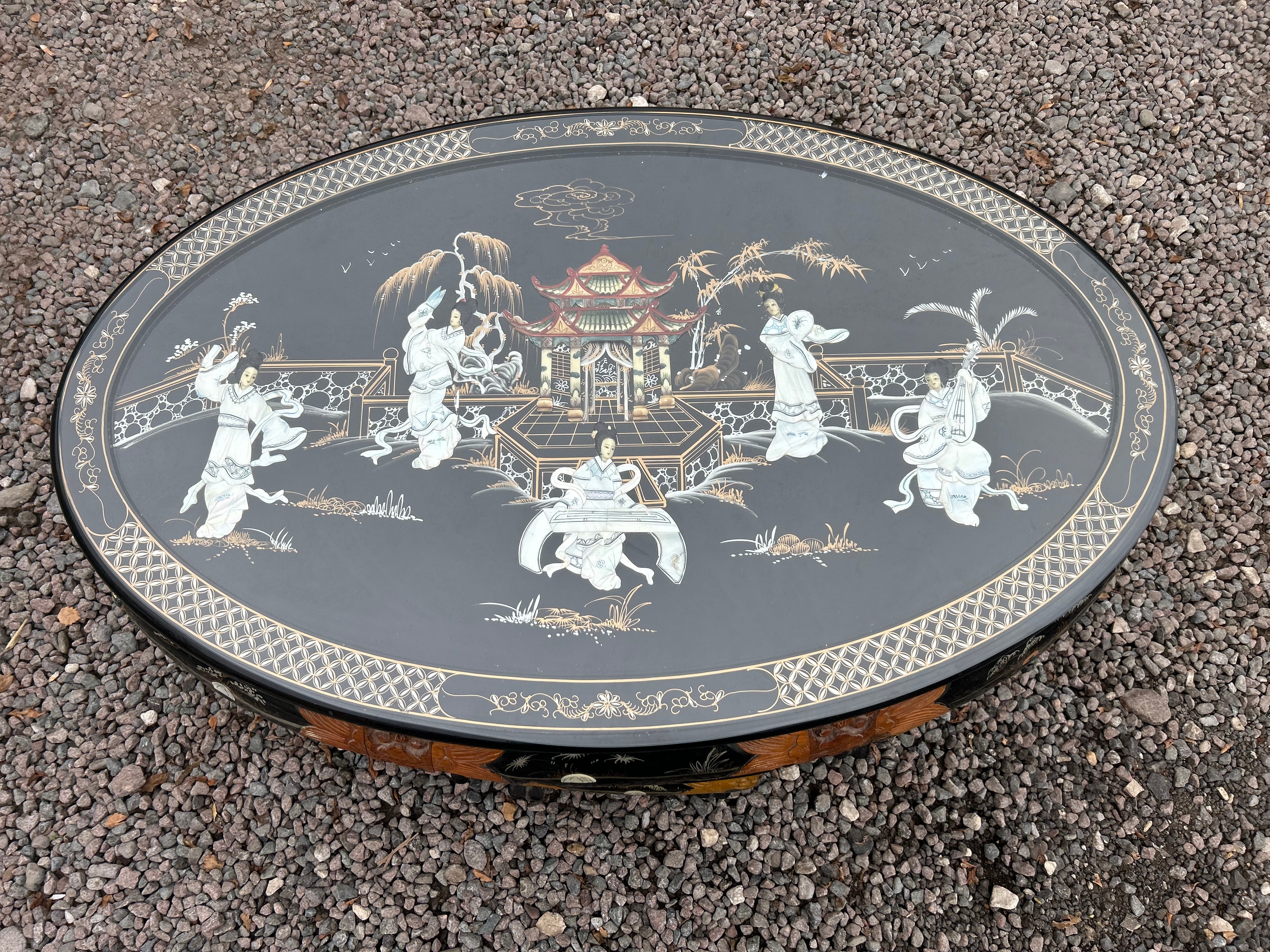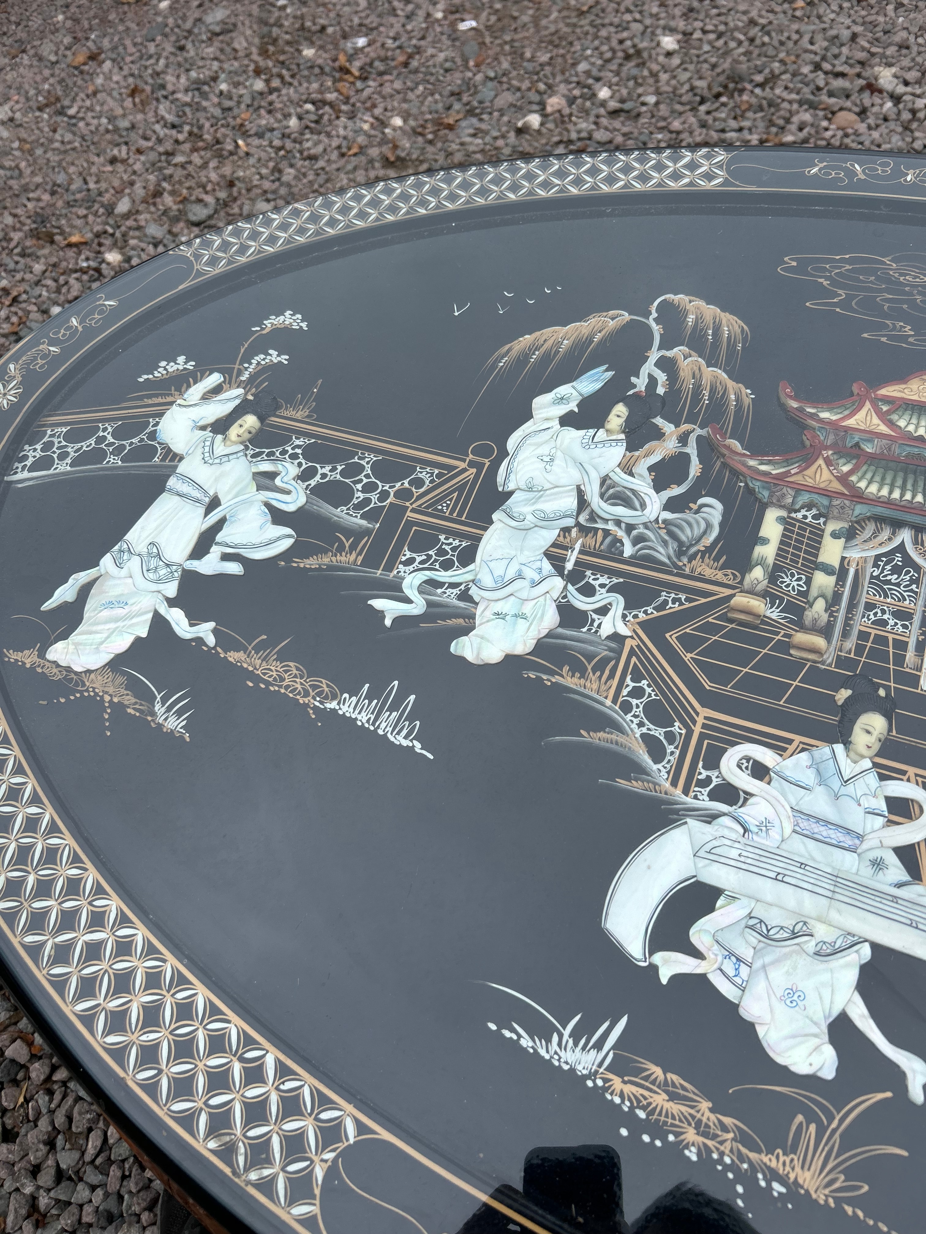 A Chinese-style nesting coffee table set, comprising a large black lacquered wood oval coffee table with four smaller matching tables or stools stored beneath. The surfaces are richly decorated with shell inlay and gilded accents, depicting an intricate scene on the main tabletop under a protective glass panel. This scene features figures in traditional attire, a pagoda, and various landscape elements. The table aprons and legs, including carved dragon heads and clawed feet, are also adorned with decorative patterns. No discernible text or manufacturer’s markings are visible.
