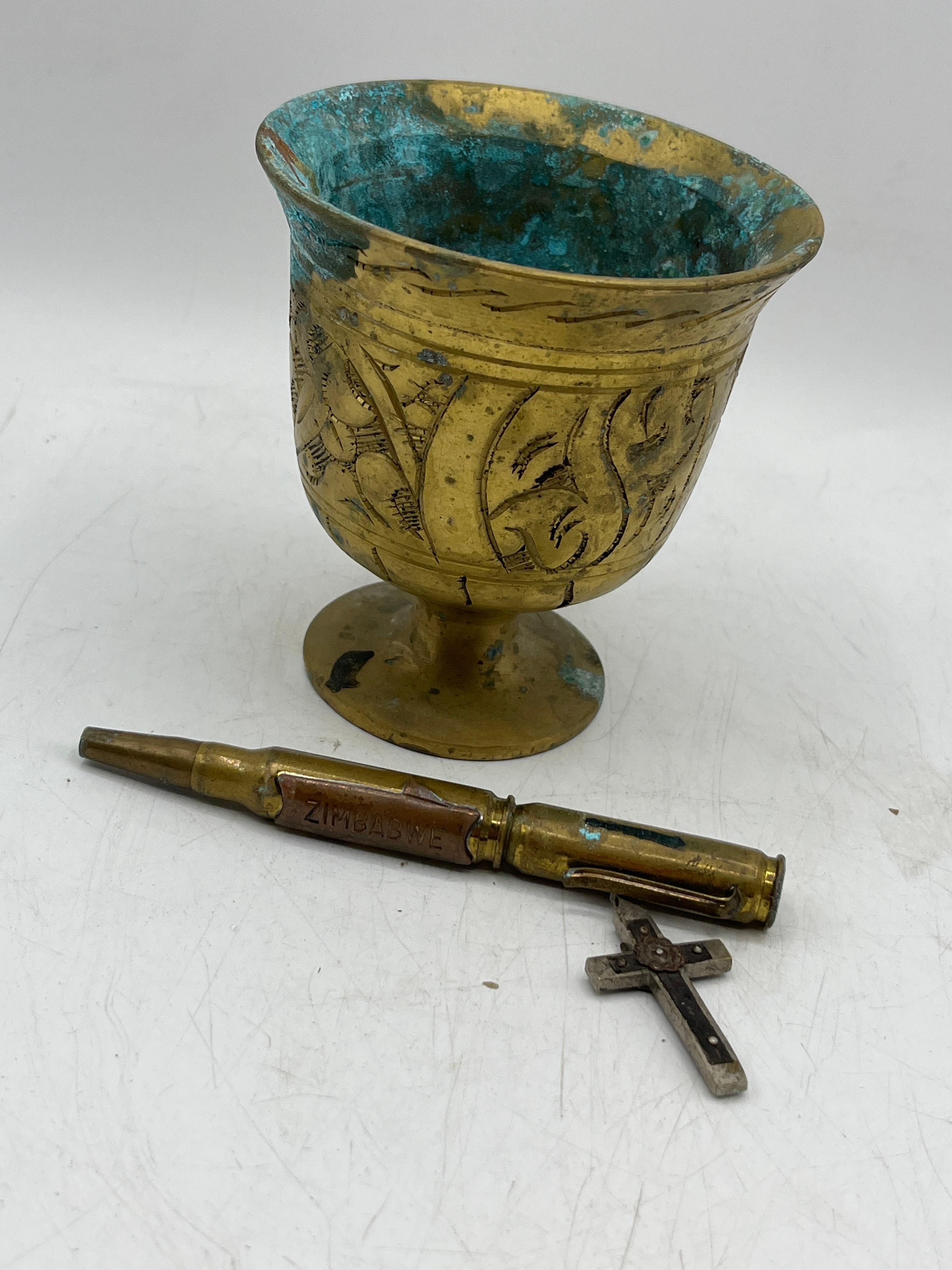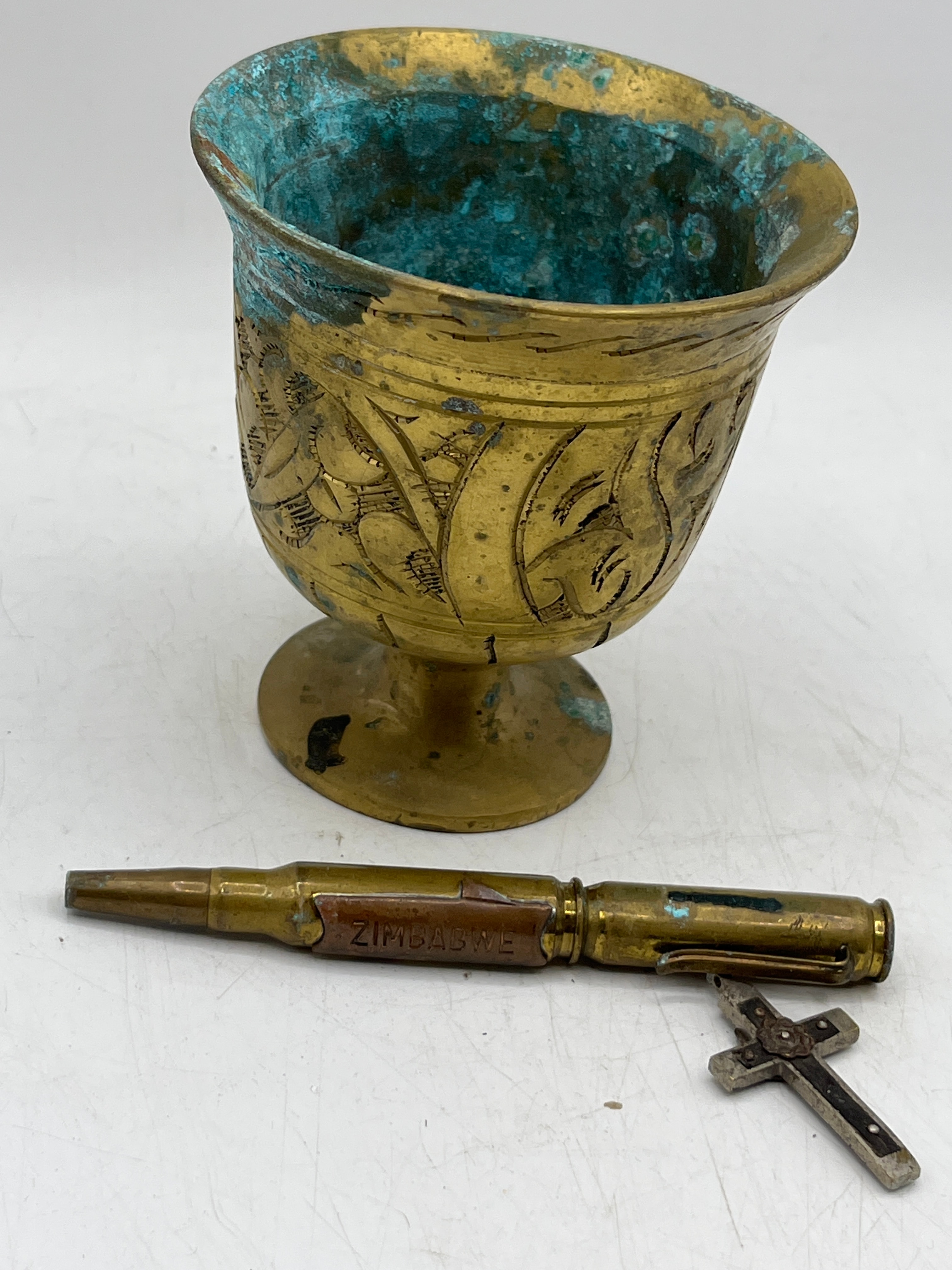 A group of two items, comprising an engraved brass chalice and a repurposed bullet casing. The footed, cup-shaped vessel is crafted from brass or bronze and features deeply engraved foliate designs. The second item is a large-caliber brass bullet casing, repurposed as a decorative object, with a central plaque embossed “ZIMBABWE” and an attached small, silver-toned metal cross pendant. Both items display signs of wear and patination consistent with their respective materials.