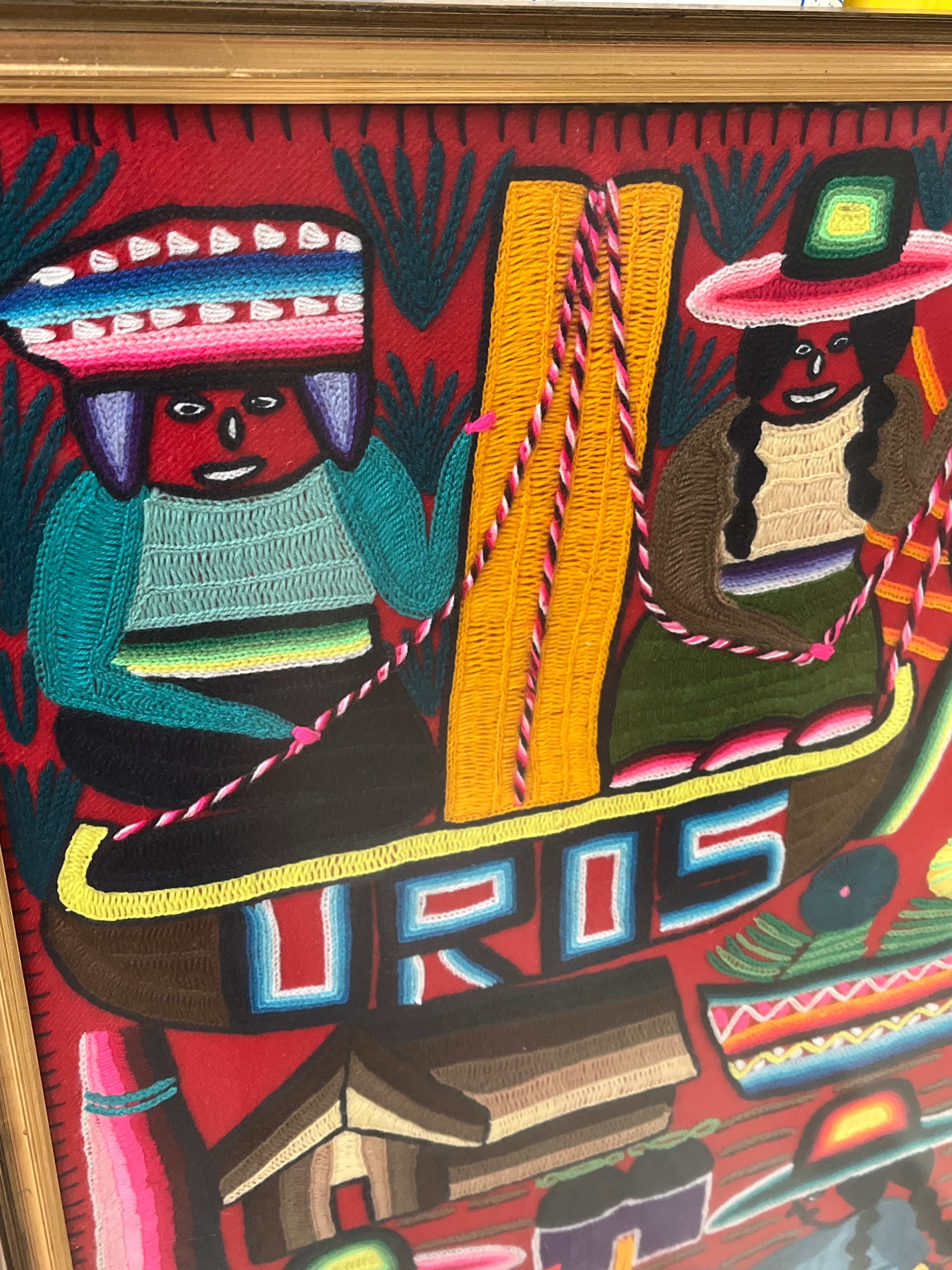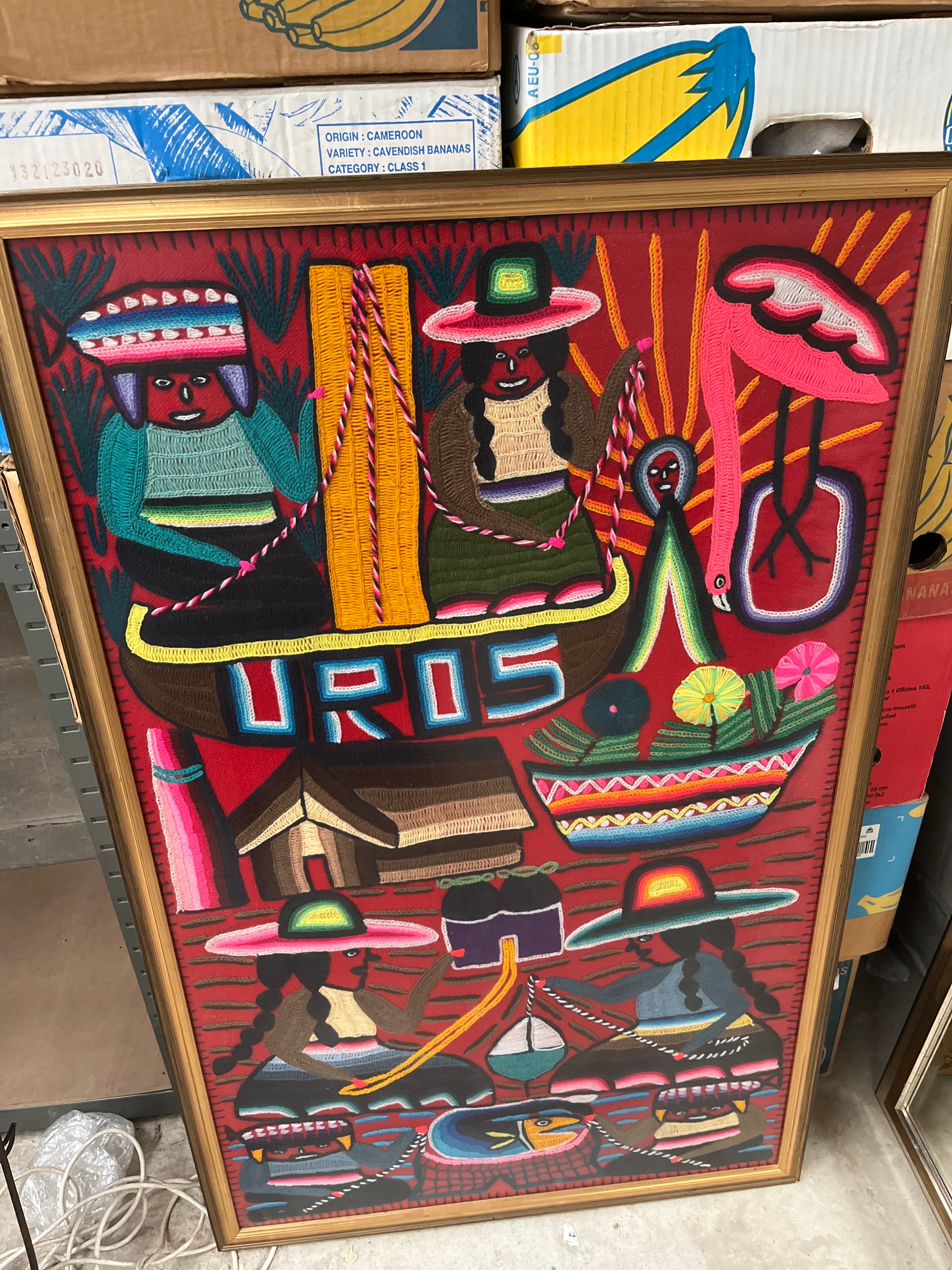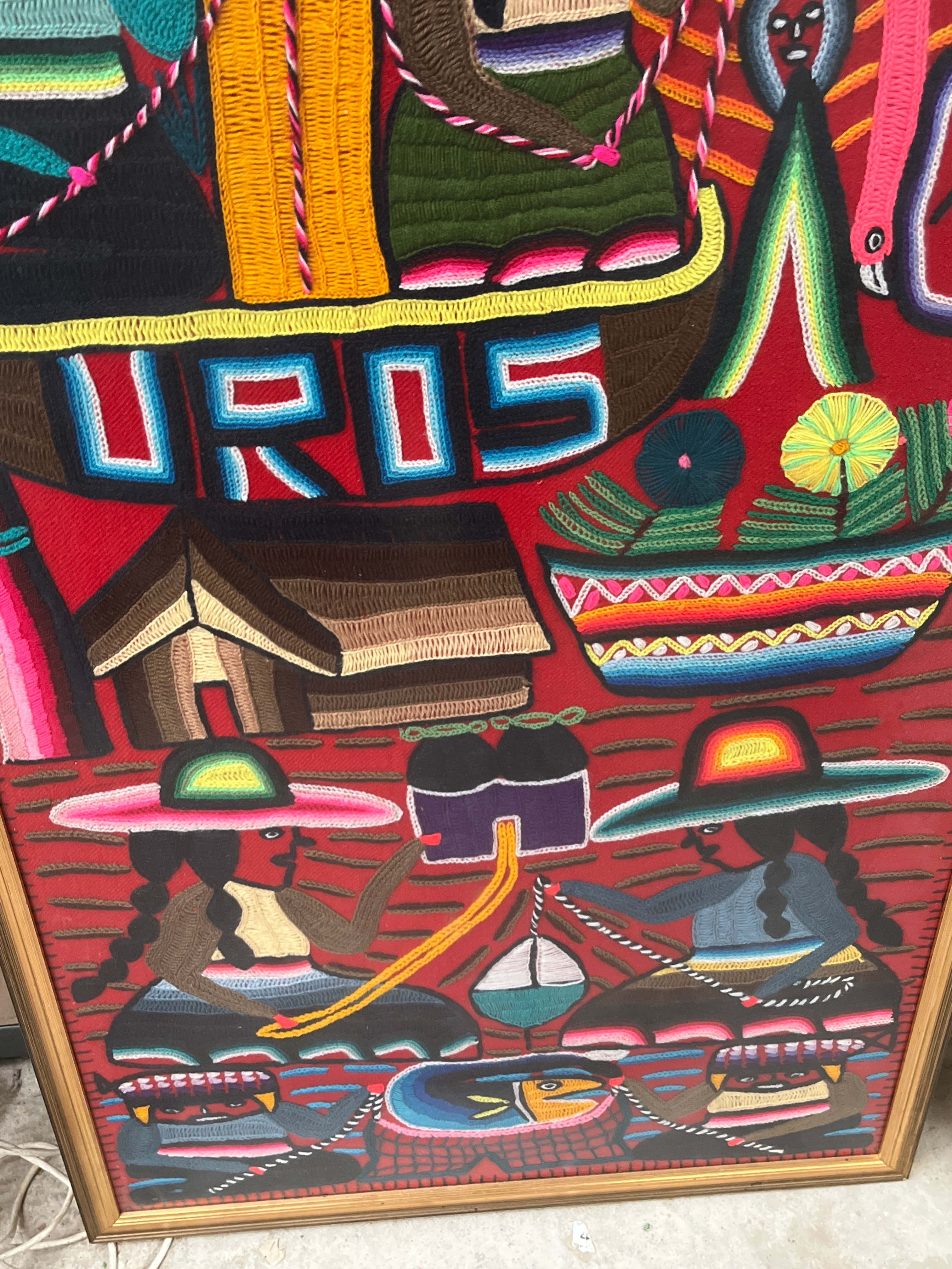 A framed textile art piece, identified as an arpilleria, depicting a vibrant folk art scene. The artwork is crafted from various colorful textiles, yarns, and embroidery floss, appliquéd onto a red fabric ground to create a three-dimensional, relief effect. The composition features stylized figures in traditional dress, some in boats, alongside dwellings and a flamingo. The word “UROS” is prominently stitched in multi-colored block letters across a central boat, referencing the Uros people and their floating islands. The piece is housed within a simple, gold-toned wooden frame.