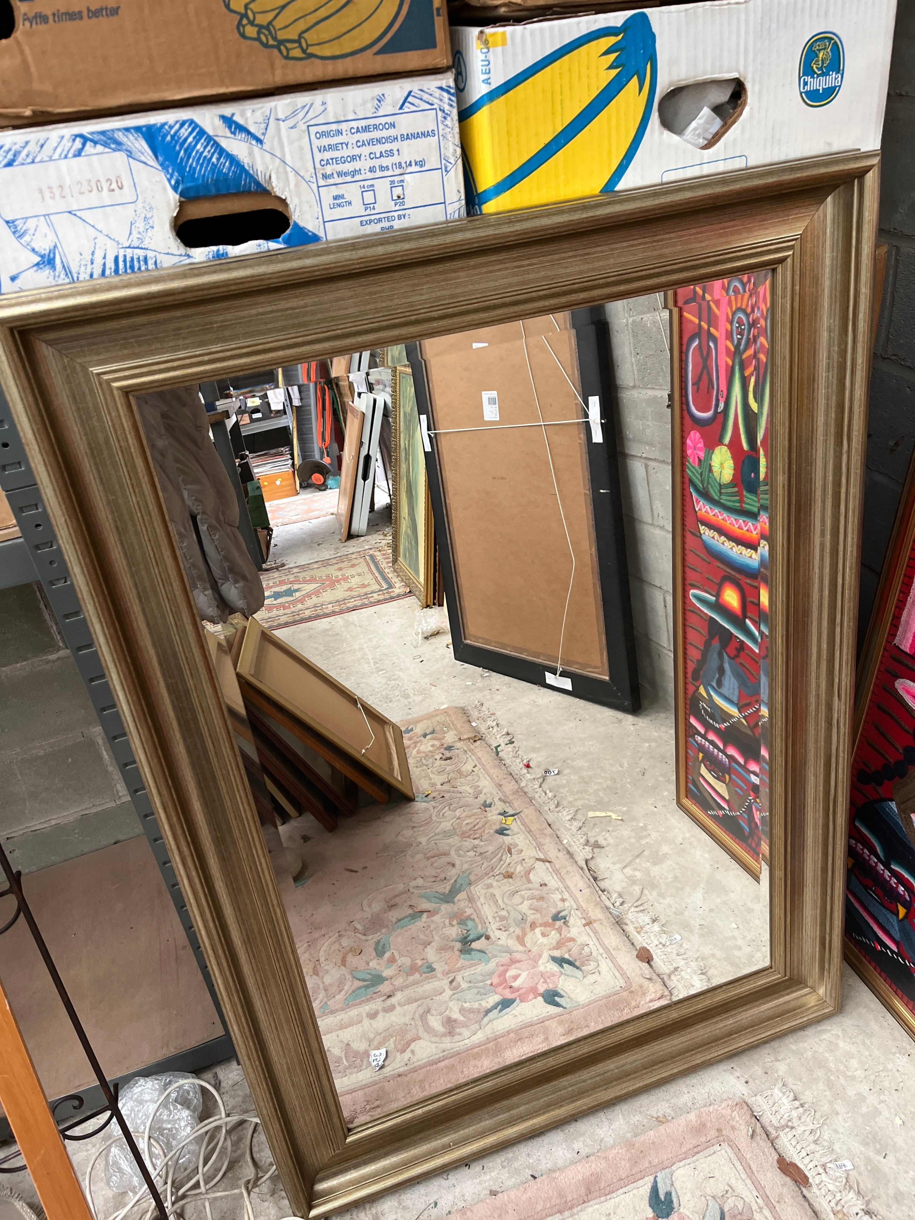 A large rectangular framed wall mirror, featuring a multi-tiered, gold-toned frame with mitered corners. The frame design incorporates both smooth and vertically ribbed or reeded sections, suggesting a versatile transitional or contemporary style. It is constructed from wood or composite material with a metallic gilt-effect finish. The mirror glass itself is intact and reflective. Web intelligence suggests a likely USA origin, and similar mirrors are designed to hang horizontally or vertically.