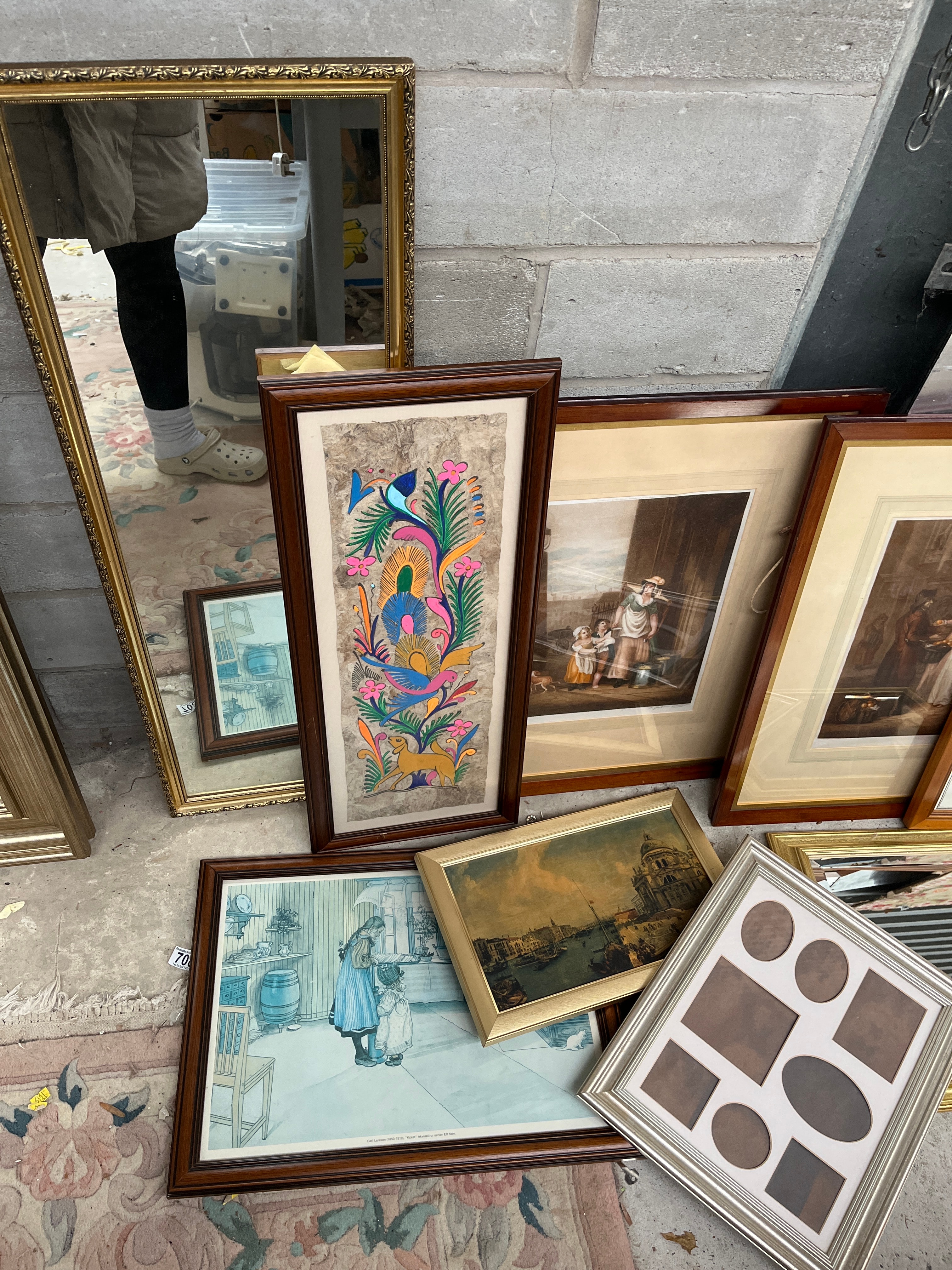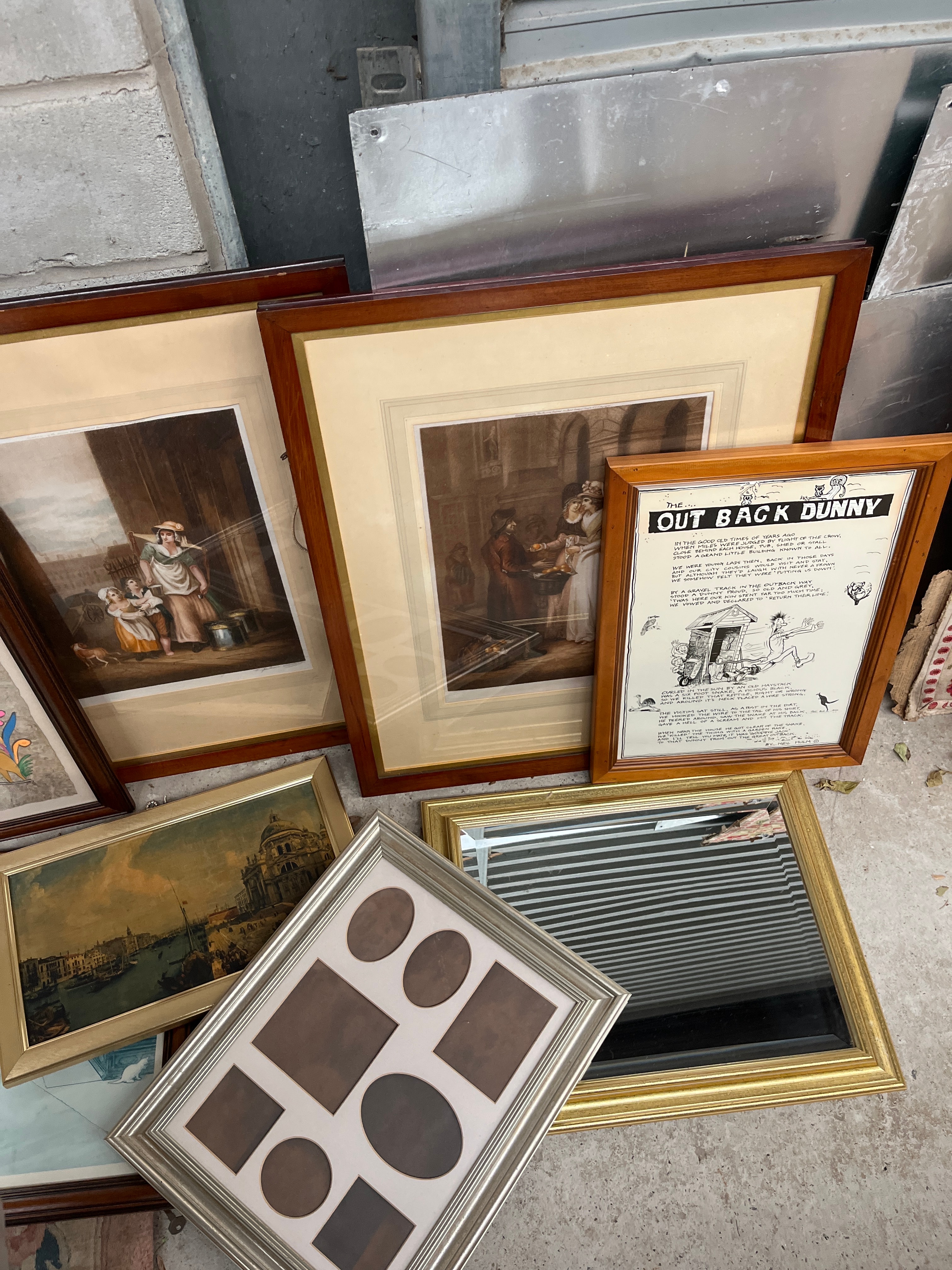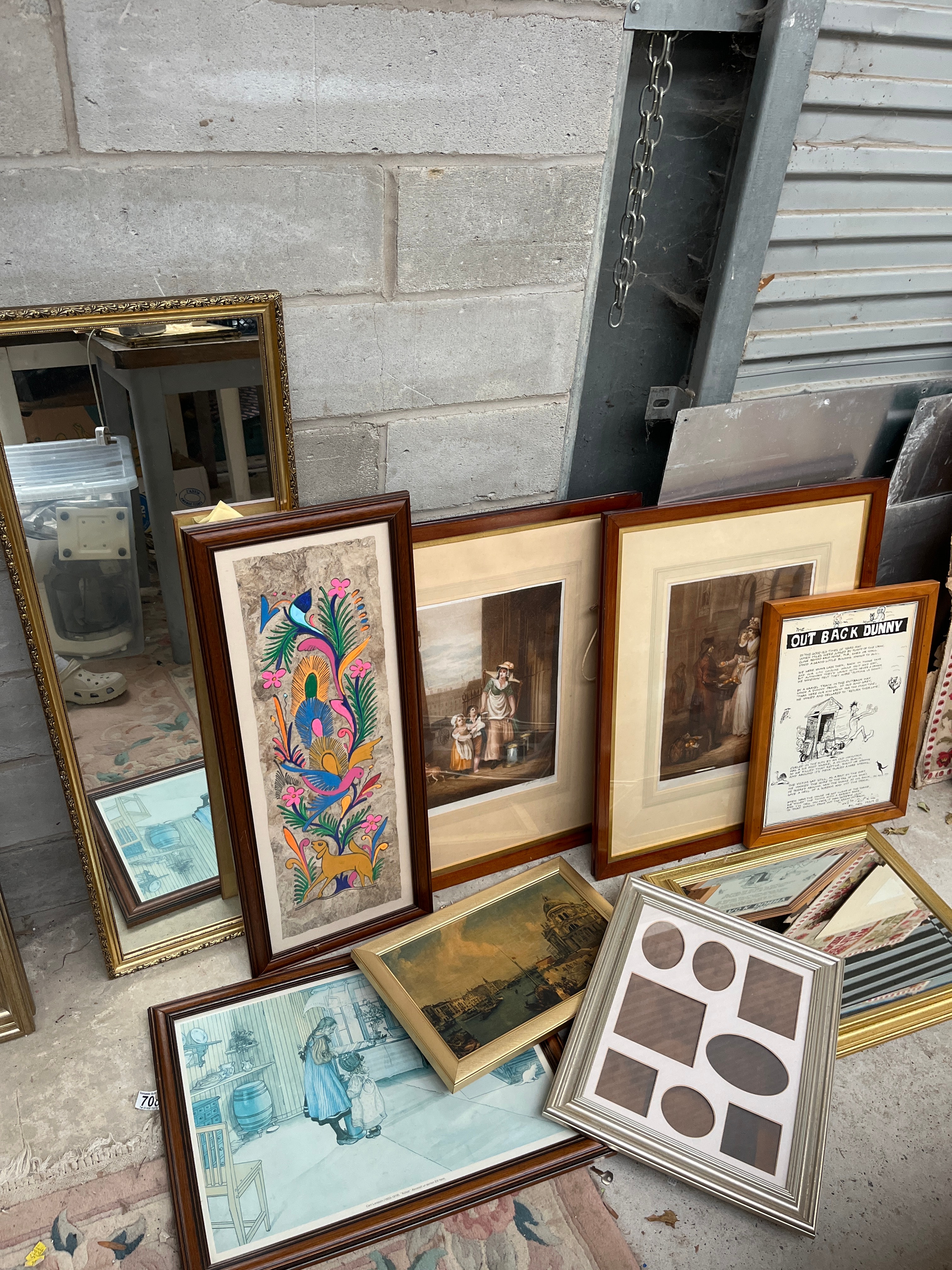 A pair of framed engraved prints by Francis Wheatley (English, 1747–1801), depicting ‘Cries of London’, specifically Plates 2 and 12. These prints are presented in dark brown wooden frames with glass. The lot also includes a diverse collection of additional framed items: a large ornate gold-framed mirror, a vibrant, stylized bird and floral motif print on textured ground, a landscape depicting a canal city, a humorous cartoon titled ‘OUT BACK DUNNY’, and an additional silver-toned, multi-aperture photo frame. Other framed prints include classical or genre scenes. Frames are predominantly wood in gold-toned, dark brown, and natural finishes. A ’70’ sticker is present on one item.
