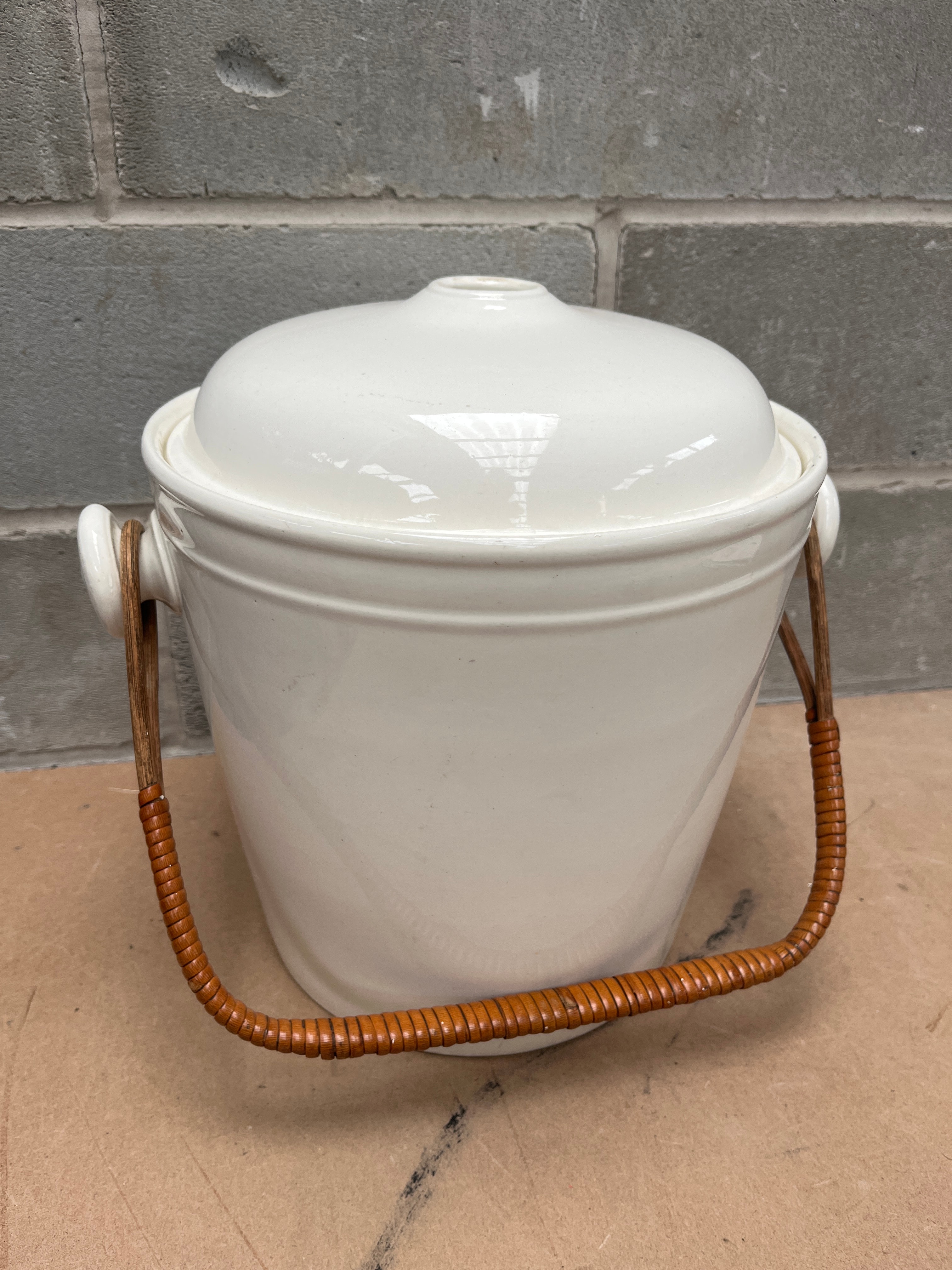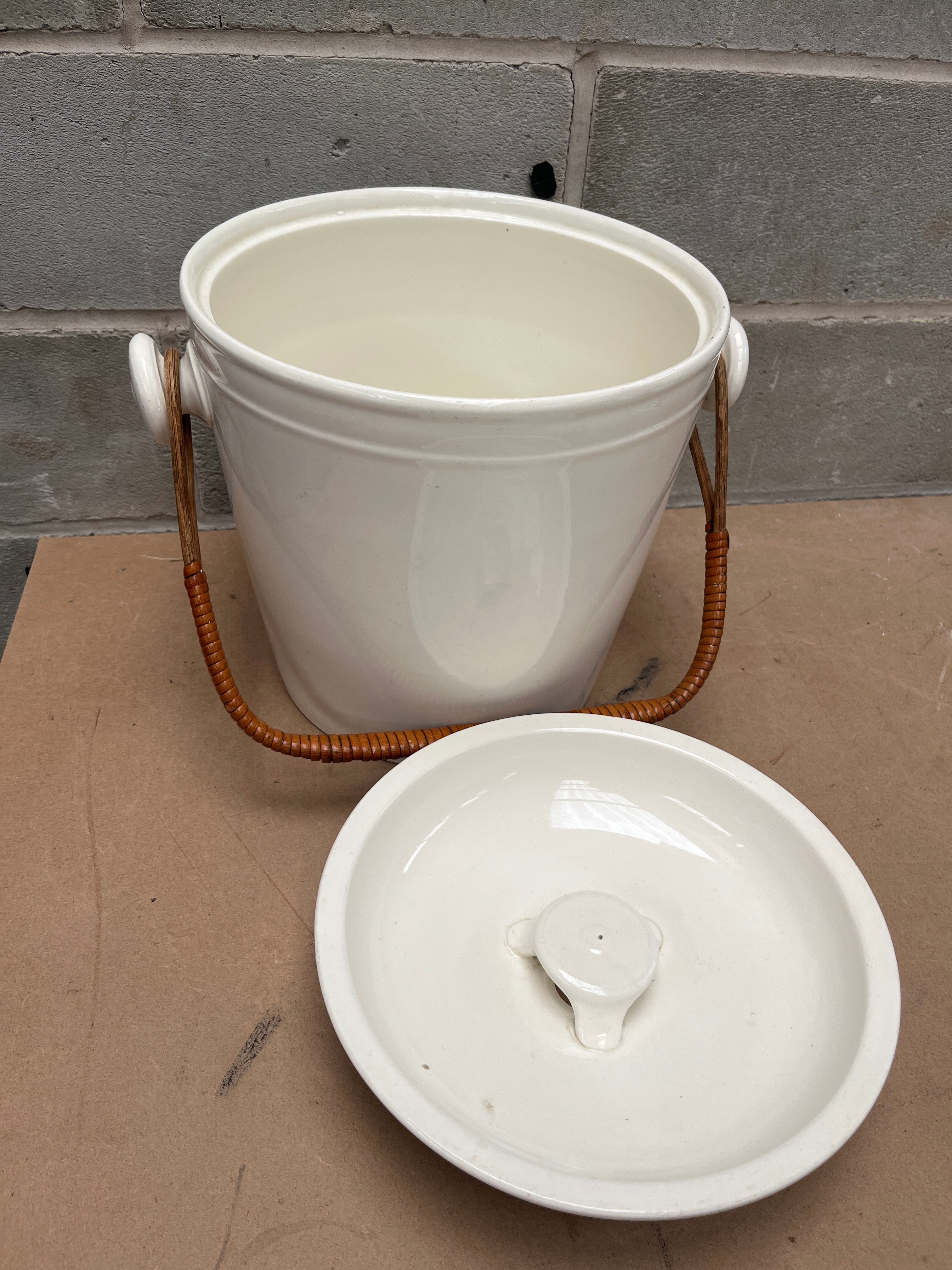 A vintage ceramic slop bucket. This lidded, bucket-shaped container is crafted from creamy white, glossy glazed ceramic. It features a complementary ceramic lid with a small central vent and a fixed, arched handle constructed from woven natural rattan or wicker, attached to ceramic lugs on the body. The design presents a utilitarian aesthetic, consistent with mid-20th century or later production.