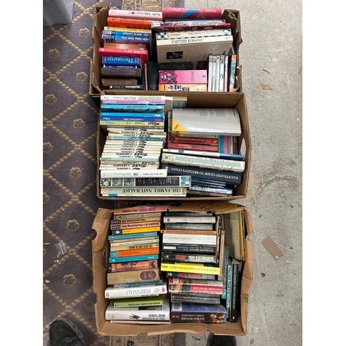 A collection of books presented in three cardboard boxes. The lot comprises a diverse collection of hardcovers and paperbacks, varying in size, age, and color. Visible titles include reference works such as “Thesaurus,” cookbooks like “Everyday Cooking,” travel guides including “New York City” and an “Illustrated Guide To Britain’s Coast,” nature books such as “The Family Naturalist” and “Perennials,” and fiction such as “Sacred Hunger.”