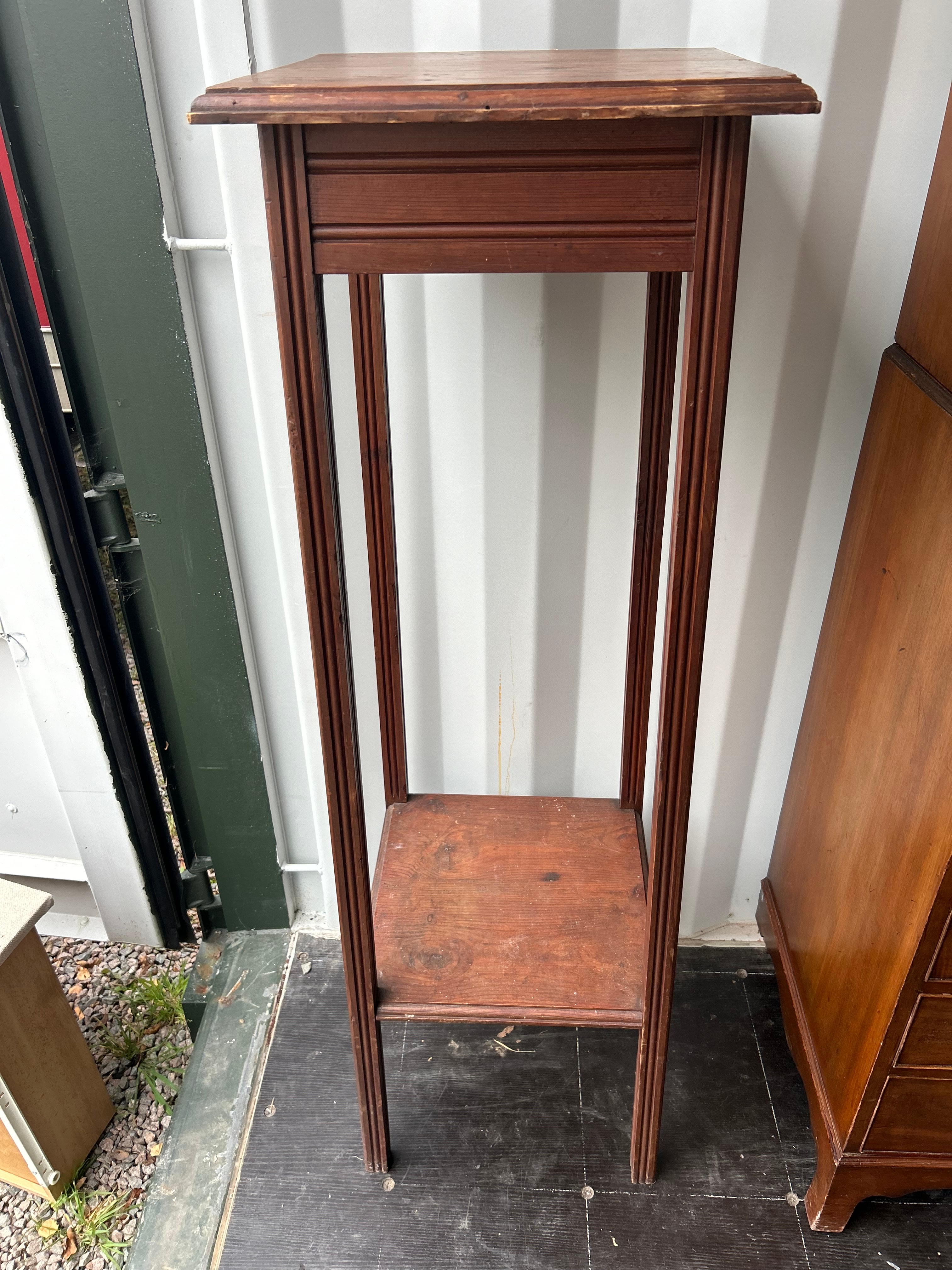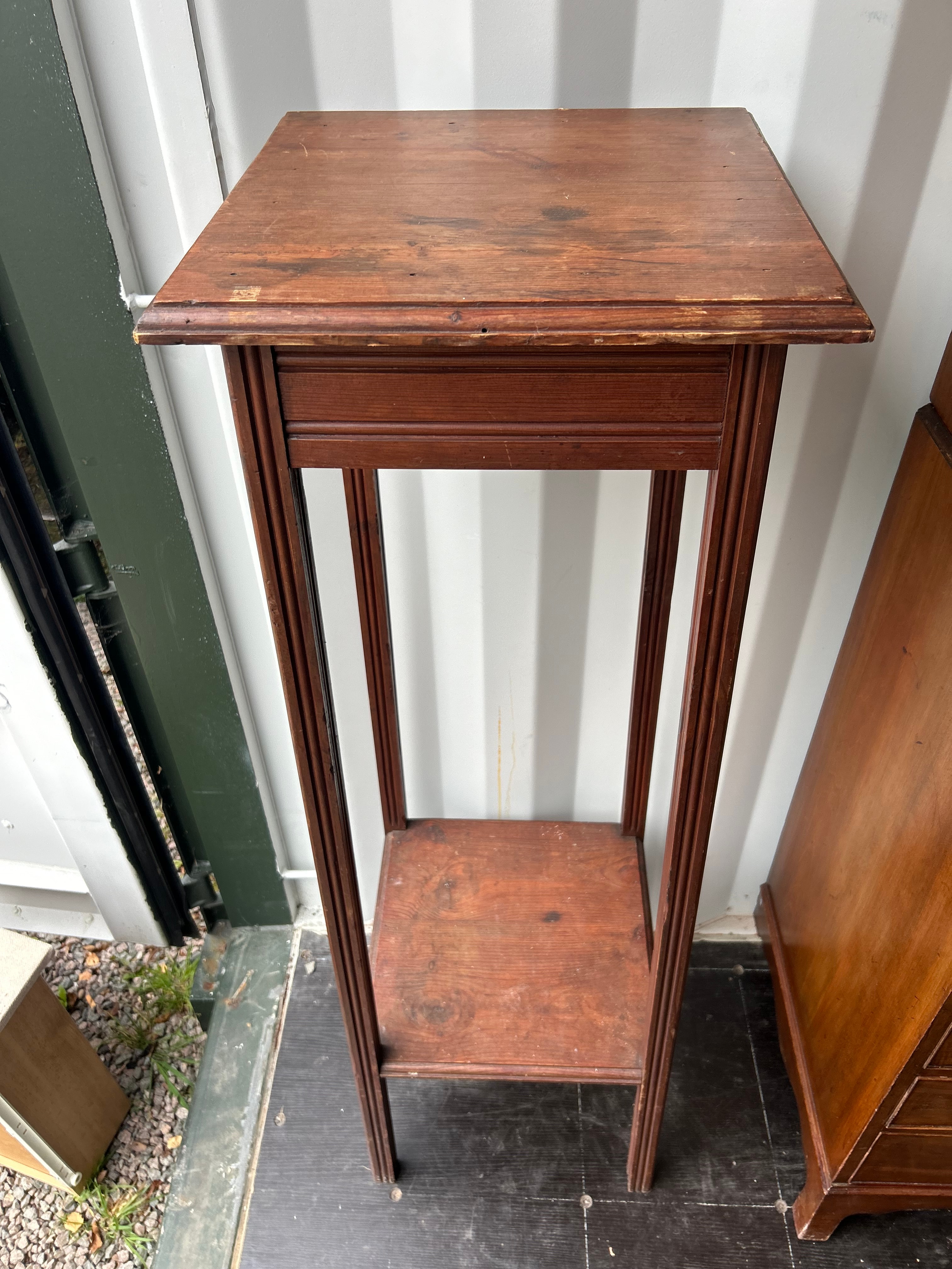 An Edwardian dark-stained hardwood plant stand, featuring a tall, narrow form. It is designed with a rectangular top above a molded frieze, supported by four square-sectioned legs with vertical linear detailing, leading to a fixed rectangular lower shelf.