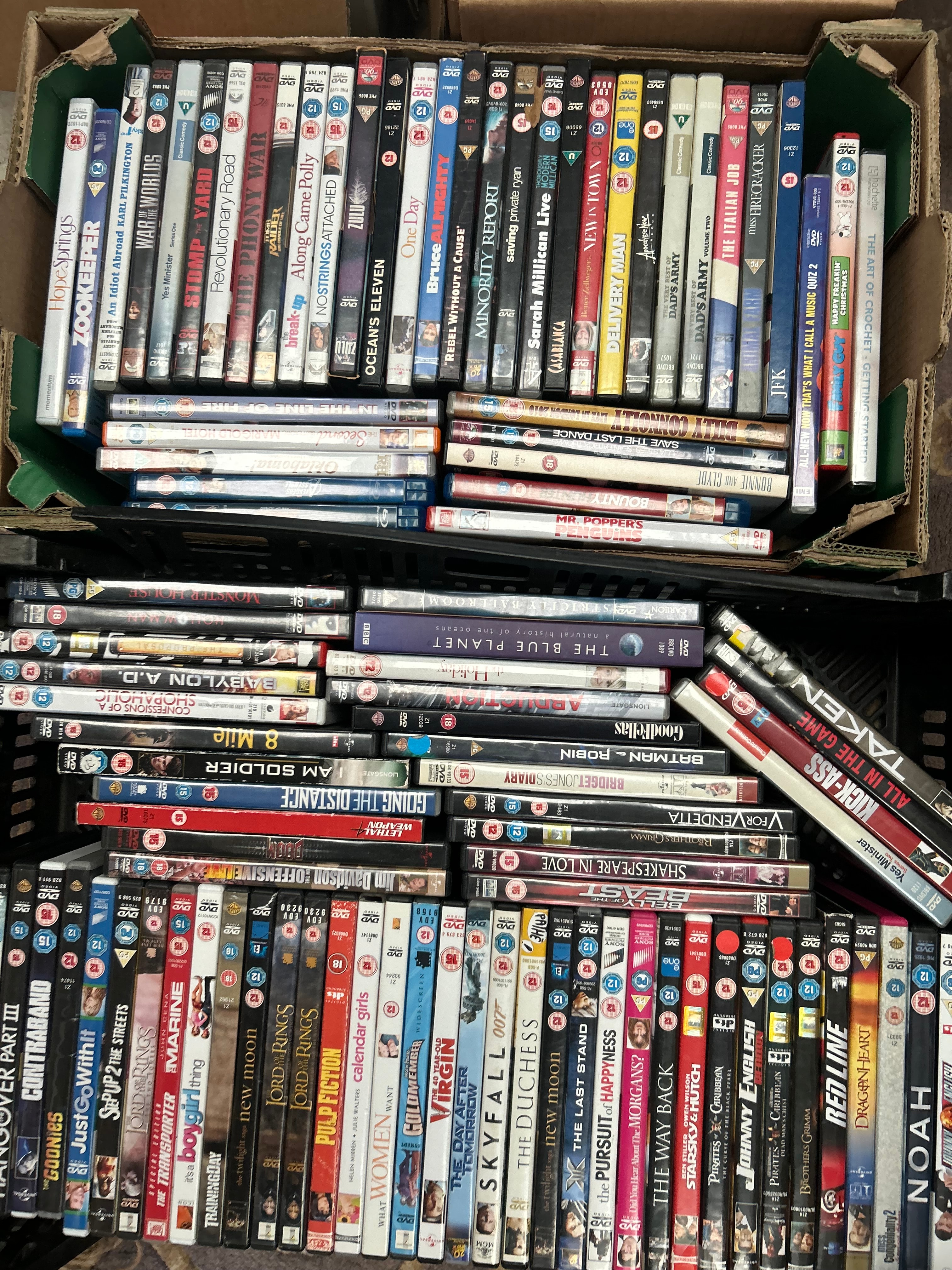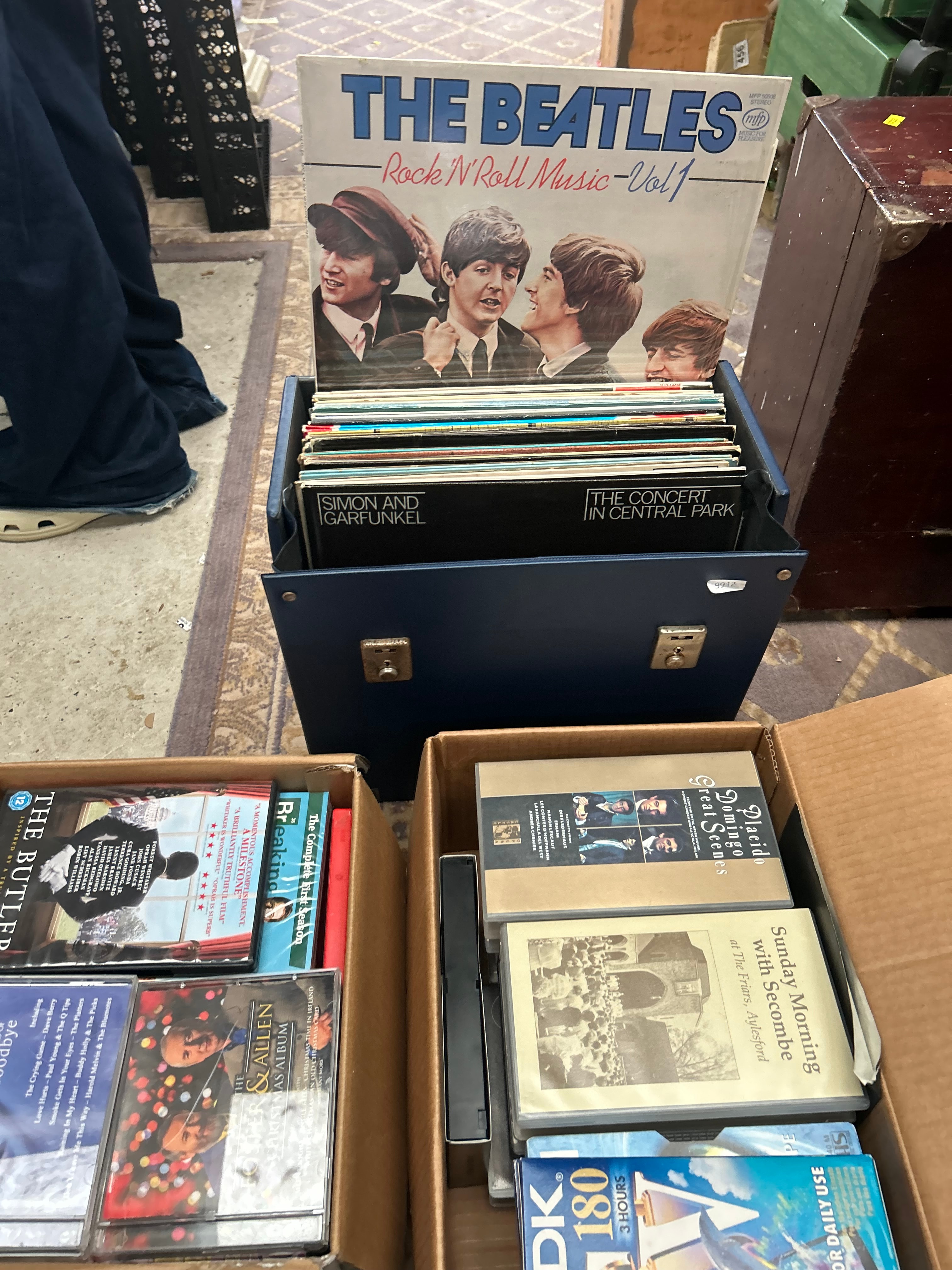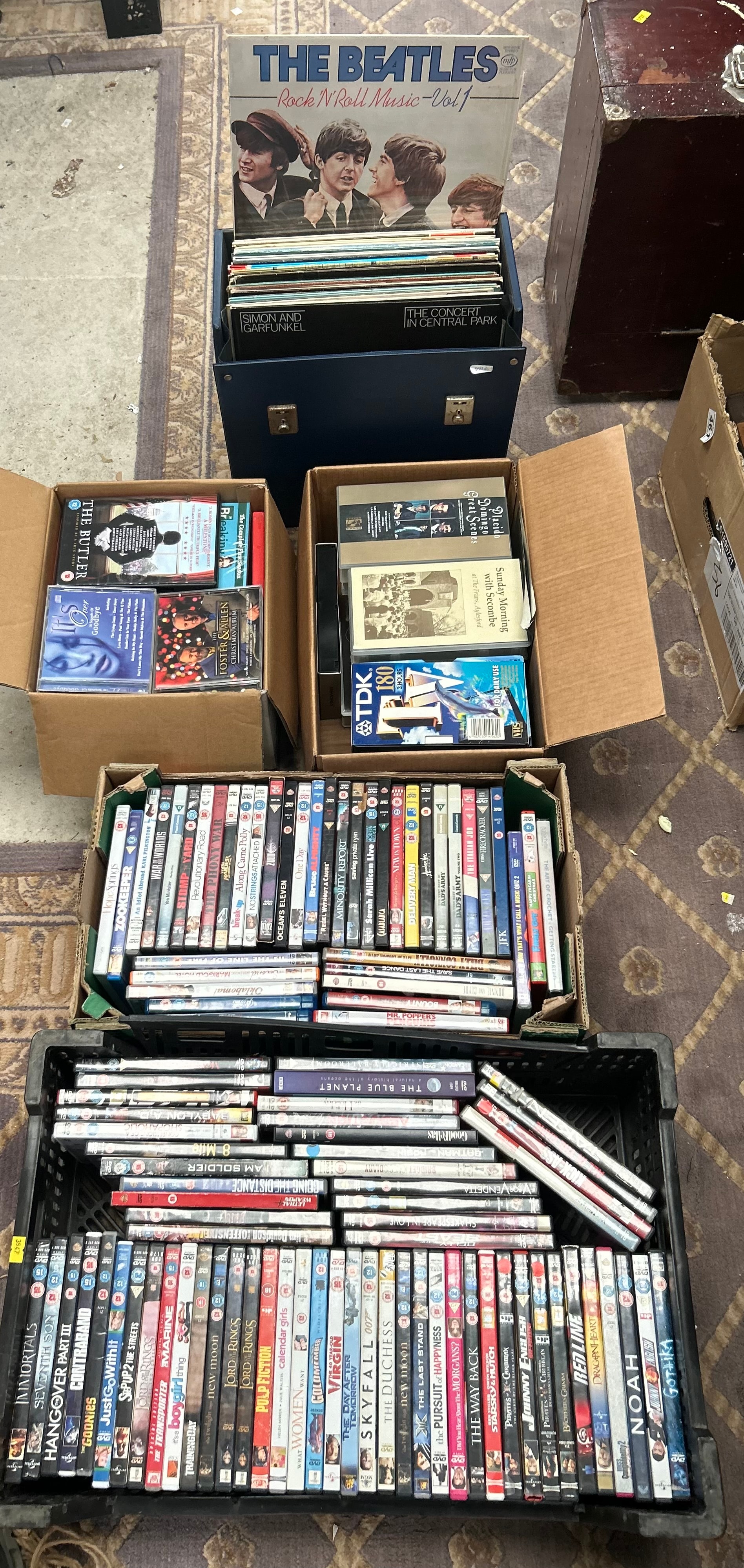 A substantial collection of mixed entertainment media, primarily comprising DVDs and CDs, alongside vinyl records and audio cassette tapes. The vinyl records, housed in a blue carrying case, include a selection of titles such as “THE BEATLES – Rock ‘n’ Roll Music – Vol 1” and “SIMON AND GARFUNKEL – THE CONCERT IN CENTRAL PARK.” A group of audio cassette tapes includes “The Butler” and “Neil Diamond – The Christmas Album.” The majority of the collection consists of a large assortment of DVDs and potentially some CDs, housed in multiple cardboard boxes and a black plastic crate. Visible titles span various genres and periods, including popular films such as “Skyfall,” “The Hangover Part III,” “Goodfellas,” “The Blue Planet,” “8 Mile,” “The Italian Job,” and “Noah,” among many others. A “DK 3 HOURS” branded item suggests educational media.