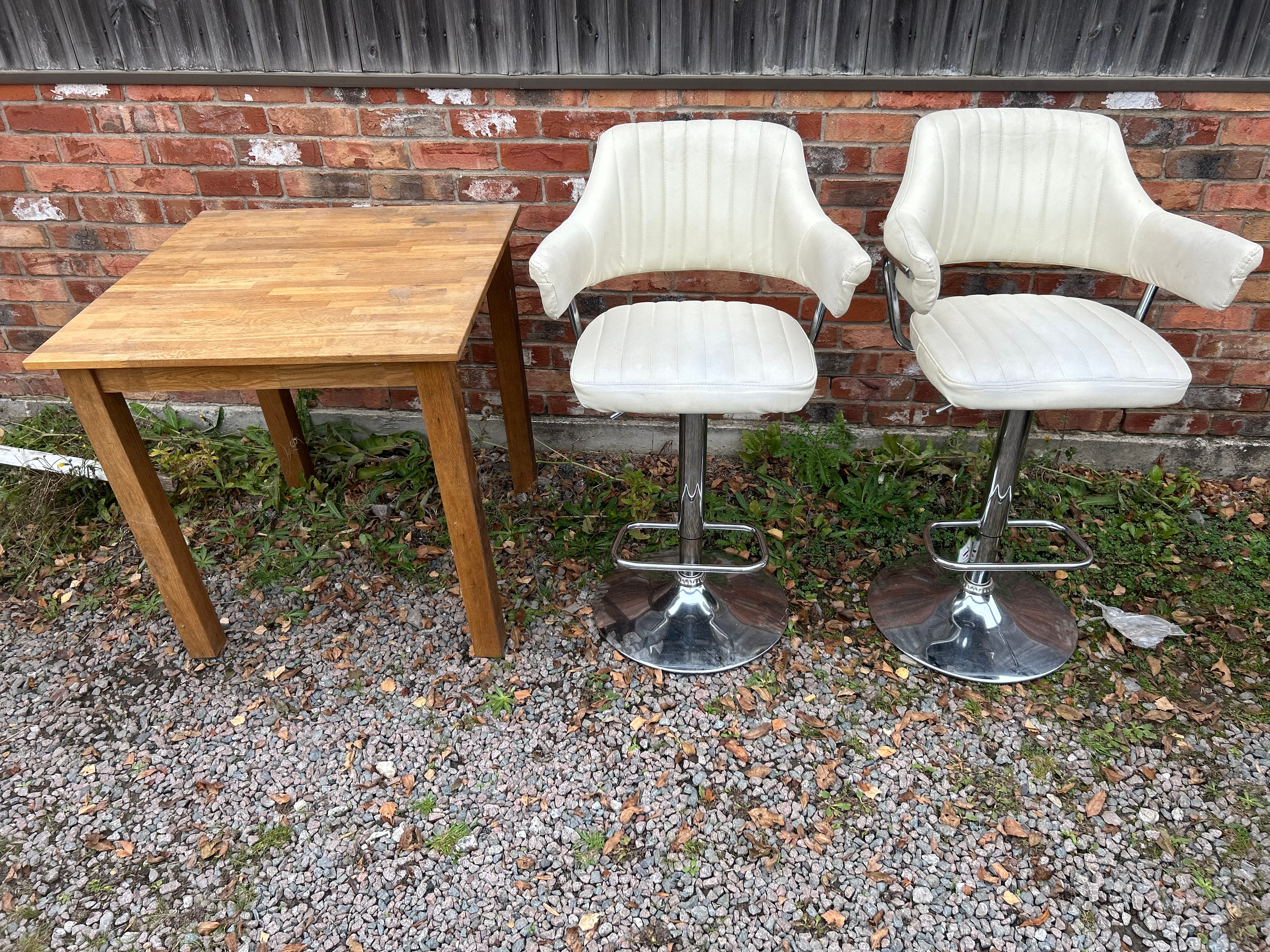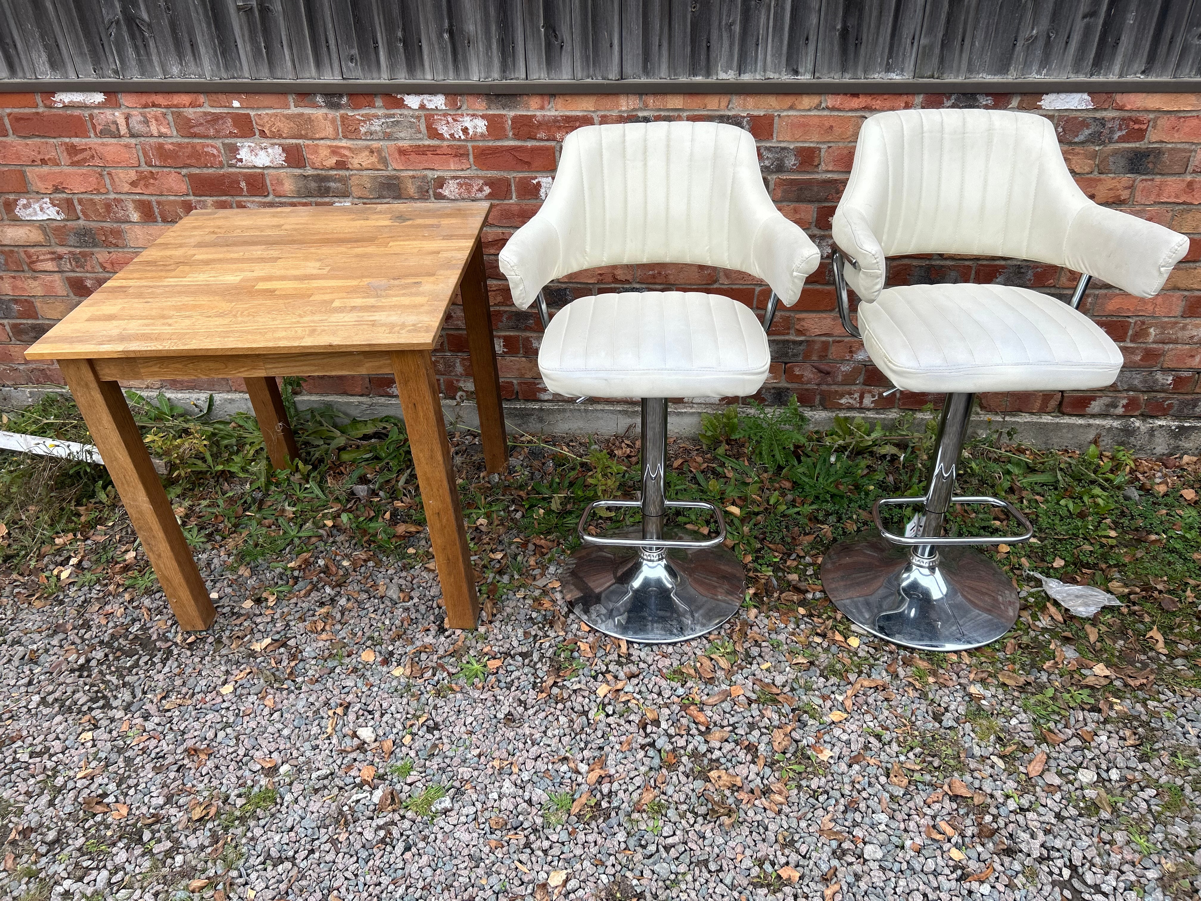 The lot comprises a small, square wooden table and a pair of contemporary-style adjustable-height bar stools. The table features a light-toned wooden top and legs, likely solid wood or veneer. The two bar stools are upholstered in cream or off-white faux leather, presenting a high back with vertical channel tufting and integrated armrests, all supported by chrome-plated metal adjustable bases with circular footrests.