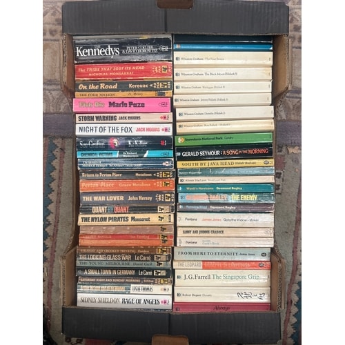 A collection of approximately 50-60 paperback books presented within a cardboard box, predominantly comprising 20th-century popular fiction. Visible titles and authors include “Kennedys,” “On the Road” by Kerouac, “Triple Hits” by Mario Puzo, “Storm Warning” and “Night of the Fox” by Jack Higgins, “The War Lover” by John Hersey, “The Looking Glass War” and “A Small Town in Germany” by Le Carré, “Rage of Angels” by Sidney Sheldon, “From Here to Eternity” by James Jones, and multiple works by Winston Graham and Nicholas Monsarrat. The books are constructed from paper with printed card covers. All visible text is in English, with no other languages or unusual markings immediately discernible.