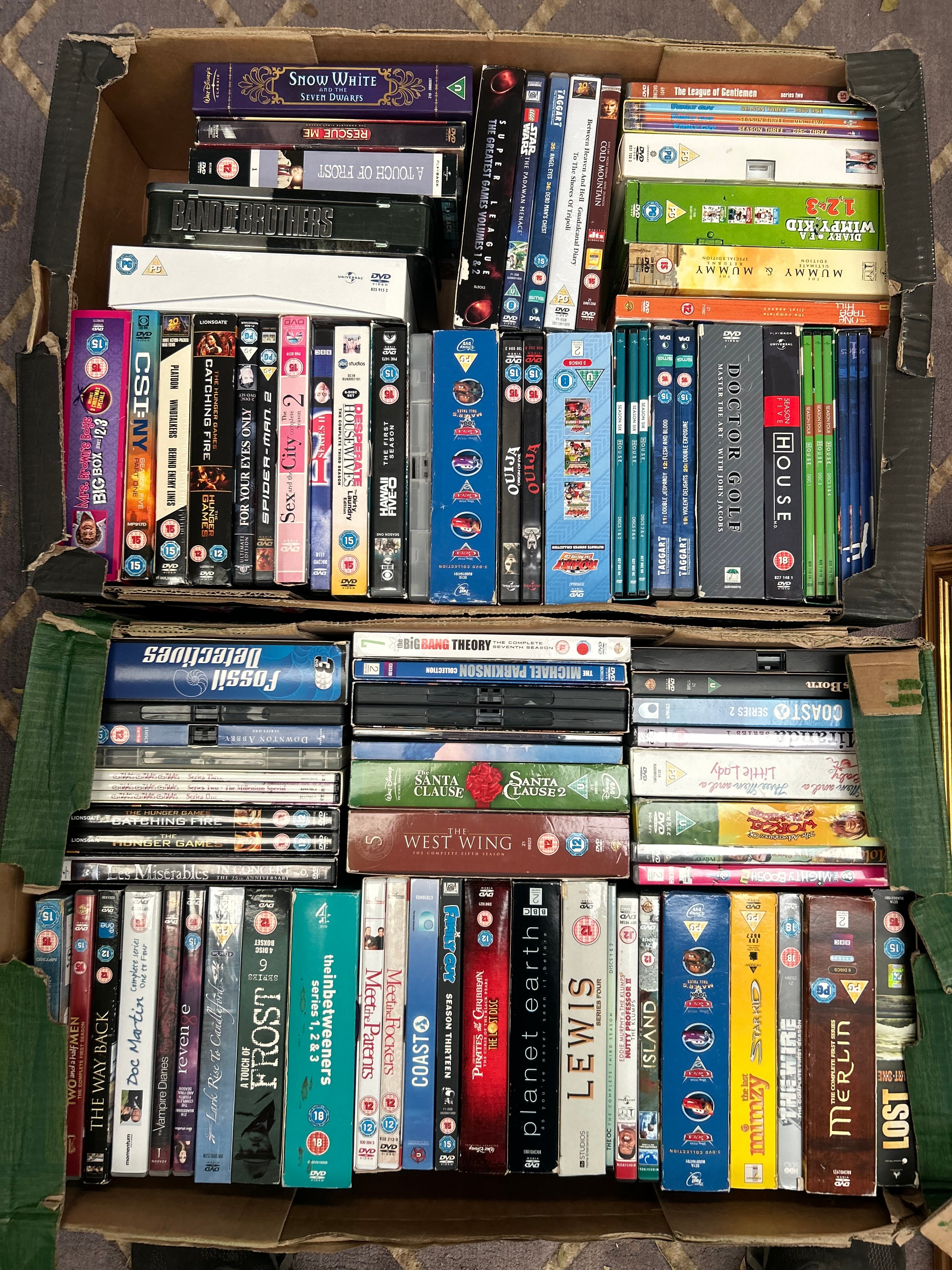 A large collection of packaged home entertainment media, predominantly DVDs, organized within two open cardboard storage boxes. The collection comprises a wide array of films, television series (often marked as “The Complete Season” or “Series”), and some documentaries. Visible titles include “Snow White,” “Band of Brothers,” “The Hunger Games,” “House M.D.,” “The Big Bang Theory,” “The West Wing,” and “Merlin.” Each item is contained within its original packaging, primarily standard plastic DVD cases or cardboard sleeves, and frequently displays UK BBFC age ratings (U, PG, 12, 15, 18). The primary material composition is plastic, paper, and cardboard. All visible text is in English.