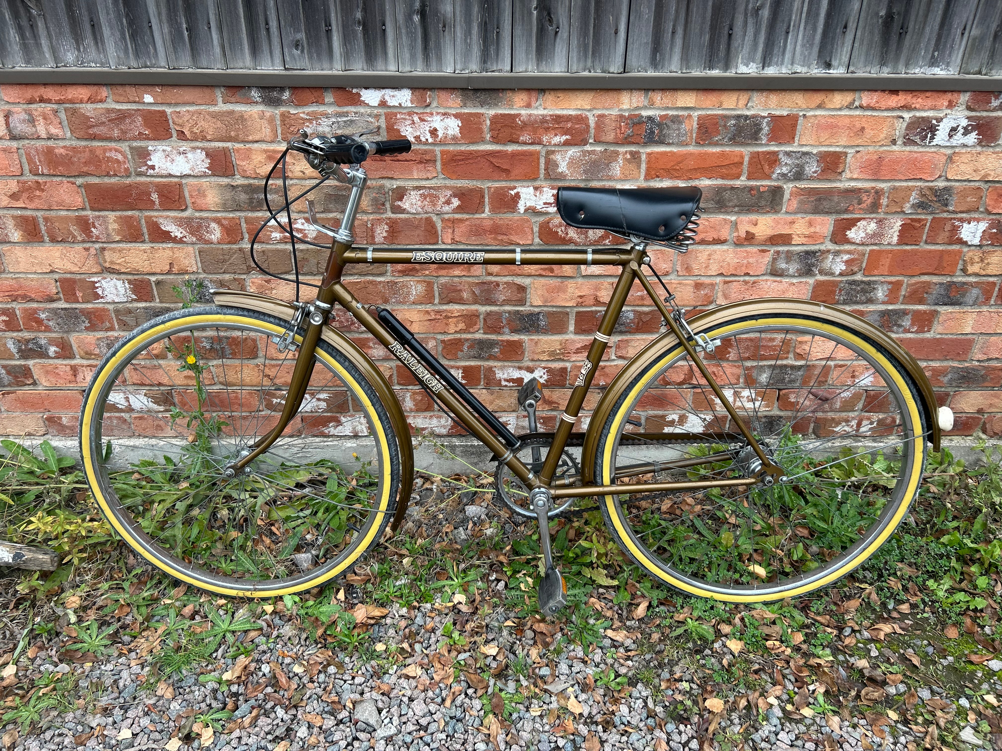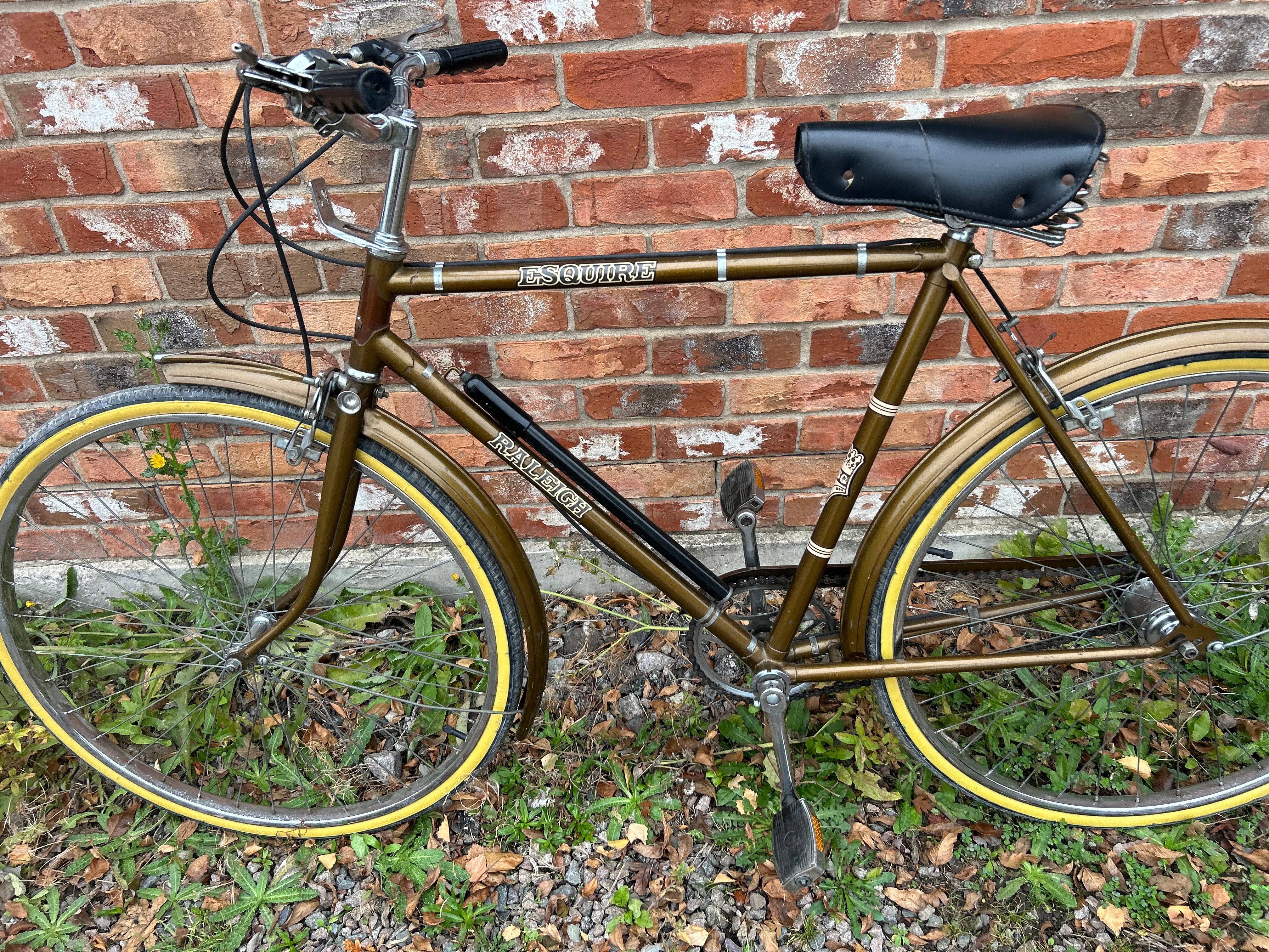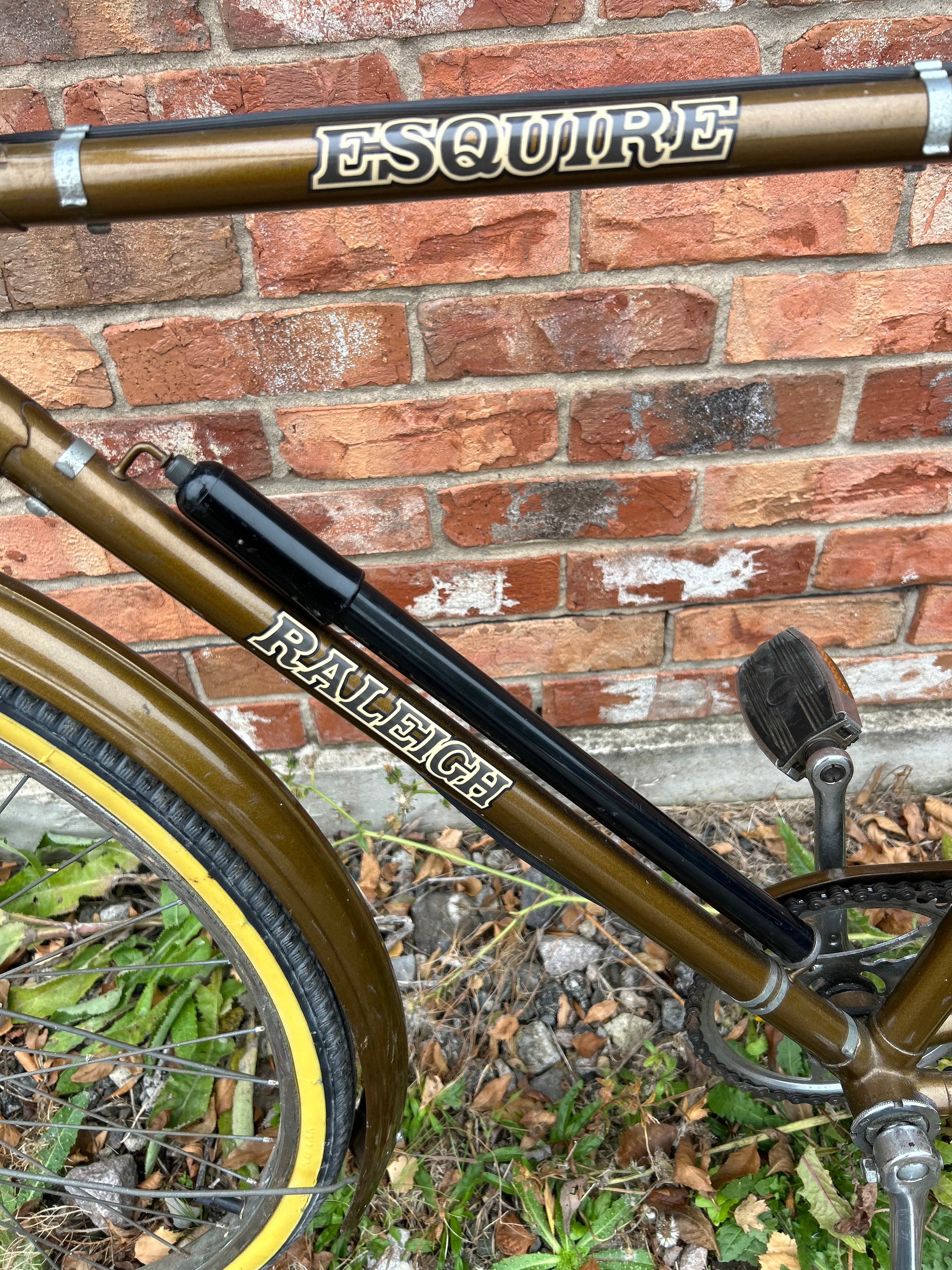 A vintage Raleigh Esquire bicycle, circa 1974. The bicycle features a metallic olive-green or bronze-colored steel frame, adorned with “ESQUIRE” on the top tube, “RALEIGH” on the down tube, and a crowned “SQ” emblem on the seat tube. It is equipped with full fenders, a black sprung saddle, chrome-plated handlebars and various components, and yellow-accented tires. A frame-mounted air pump is also present.