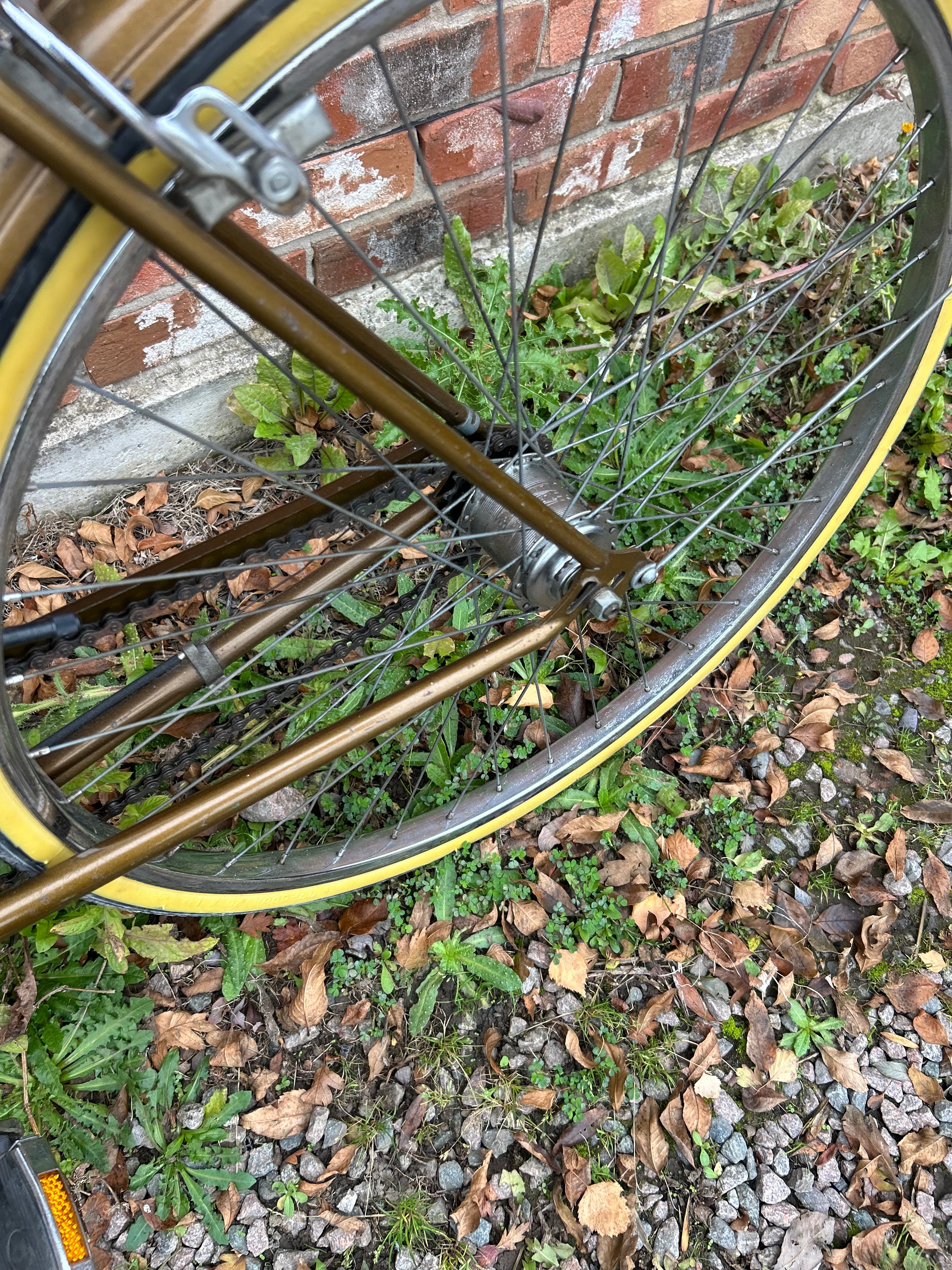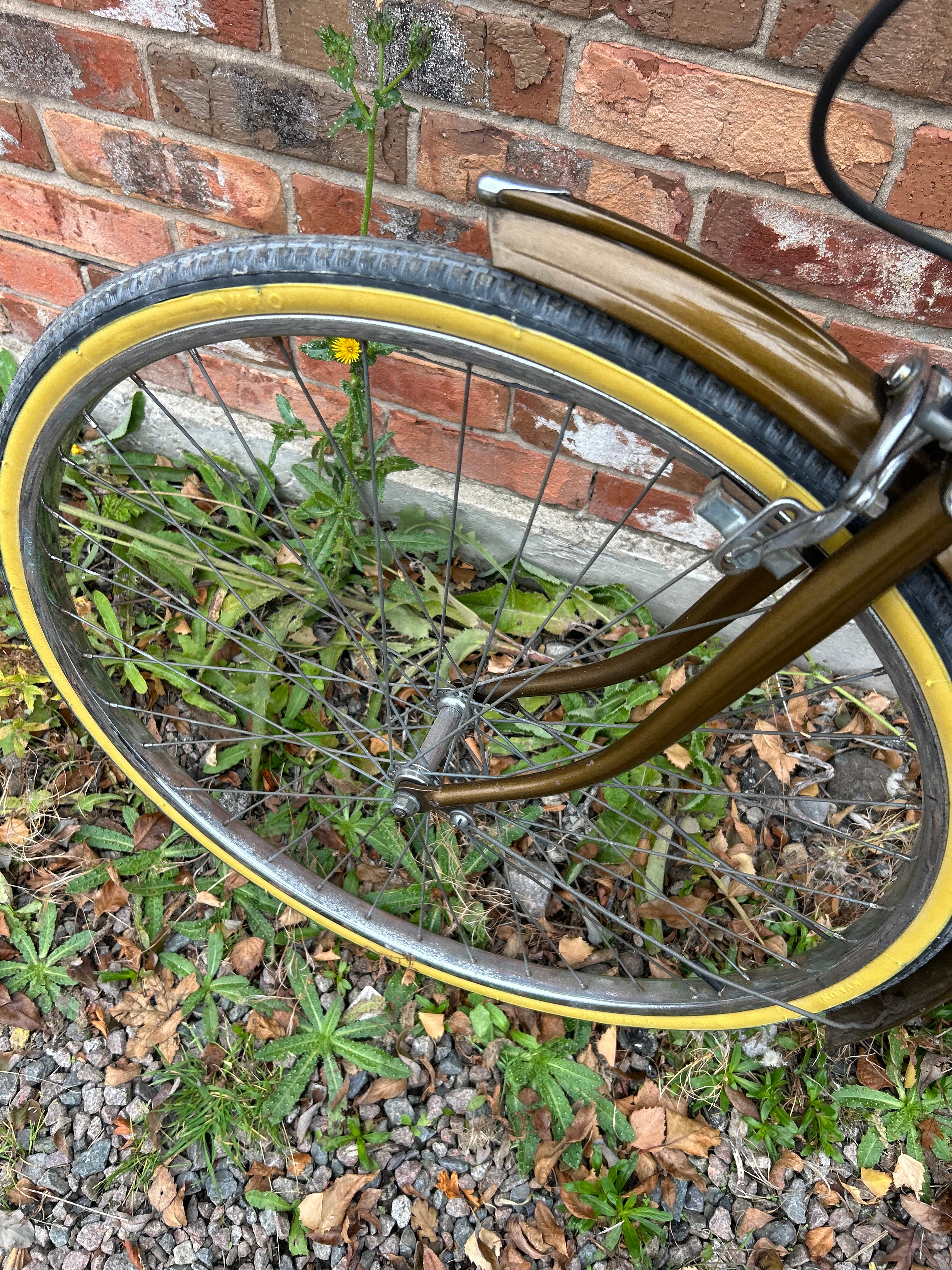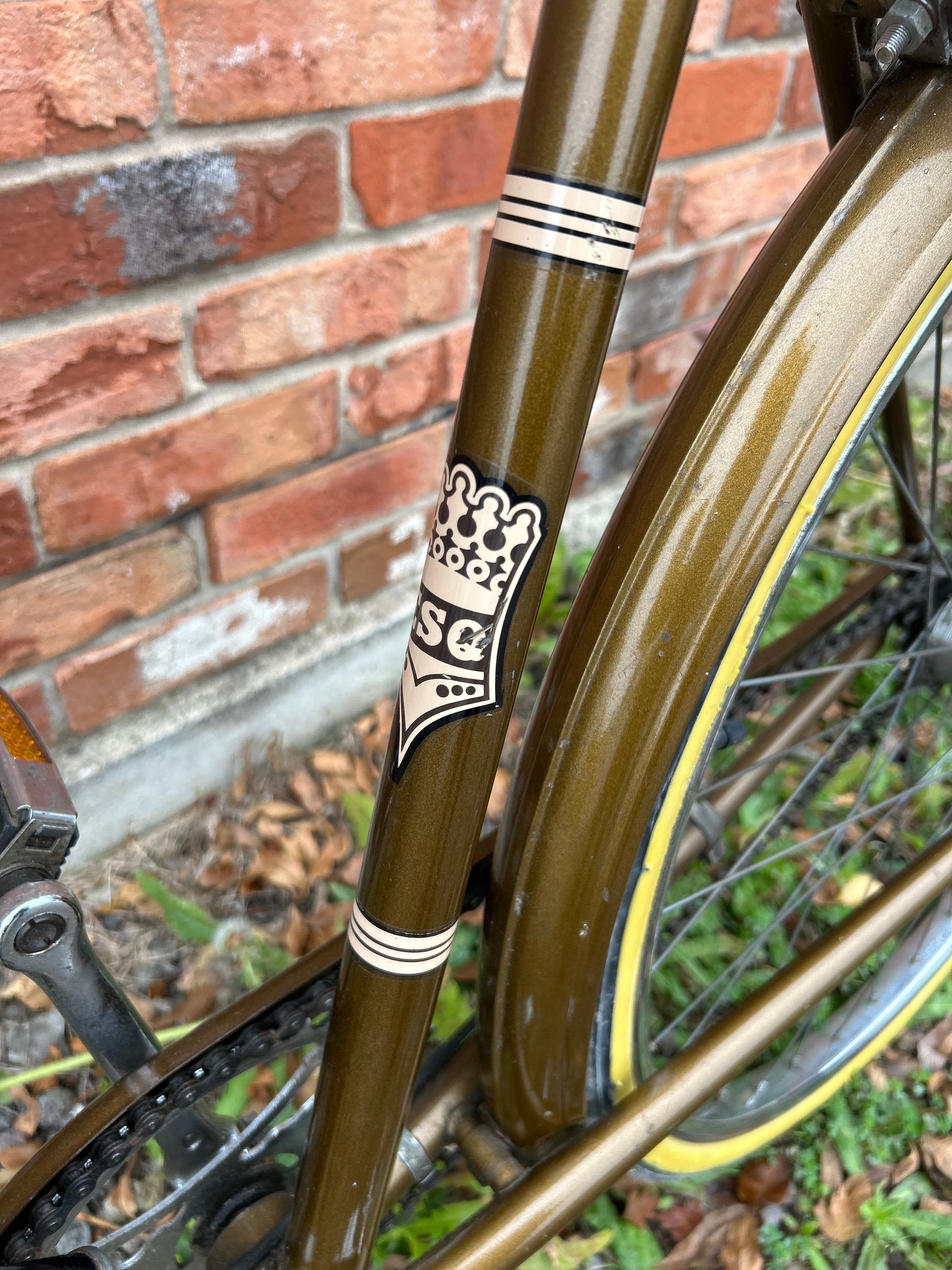 A vintage Raleigh Esquire bicycle, circa 1974. The bicycle features a metallic olive-green or bronze-colored steel frame, adorned with “ESQUIRE” on the top tube, “RALEIGH” on the down tube, and a crowned “SQ” emblem on the seat tube. It is equipped with full fenders, a black sprung saddle, chrome-plated handlebars and various components, and yellow-accented tires. A frame-mounted air pump is also present.