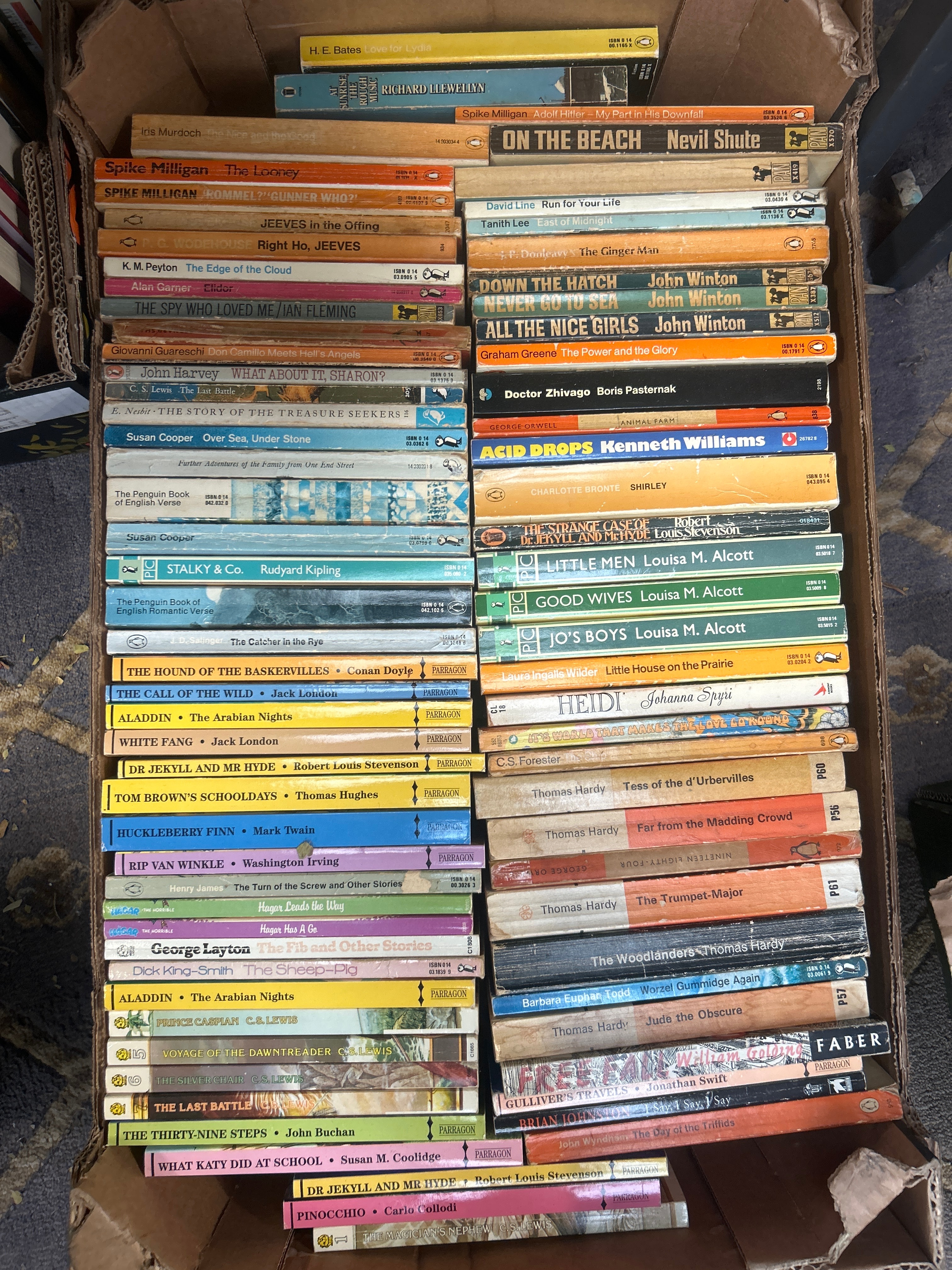 A collection of approximately 70-80 paperback books, predominantly fiction and classics, housed within a corrugated cardboard box. The books generally date from the mid-to-late 20th century and include numerous titles published by Penguin, Pan, Parragon, Faber, and Puffin, often identified by their distinctive publisher logos and series numbering. Visible authors include Spike Milligan, Iris Murdoch, Nevil Shute, P.G. Wodehouse, Ian Fleming, C.S. Lewis, Susan Cooper, Rudyard Kipling, J.D. Salinger, Jack London, Robert Louis Stevenson, Mark Twain, Washington Irving, Thomas Hardy, William Golding, George Orwell, Boris Pasternak, and Louisa M. Alcott. The titles encompass a range from popular adventure and spy novels to foundational literary works, children’s classics, and historical fiction.