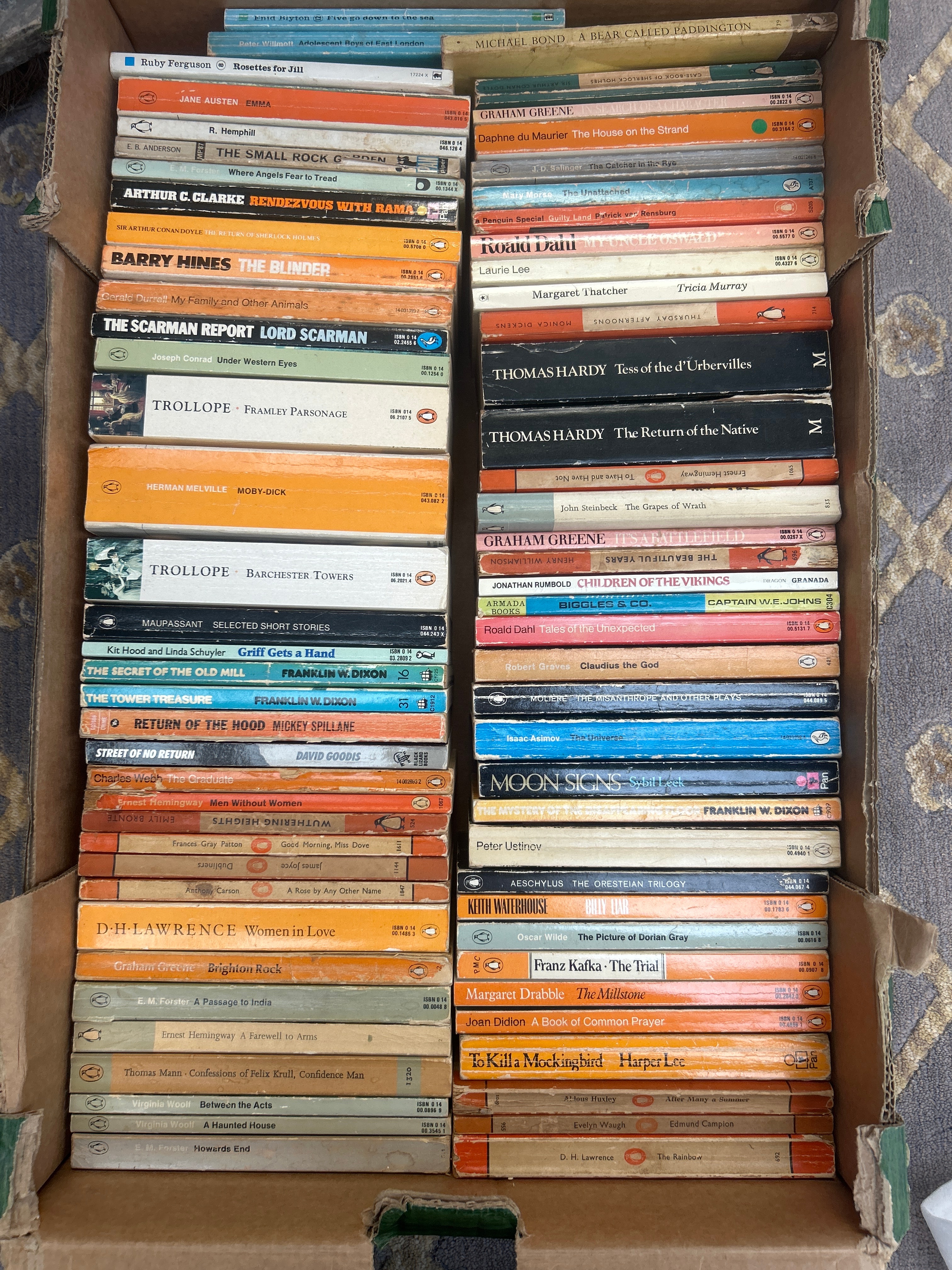 A large collection of approximately 60-70 vintage paperback books, predominantly published by Penguin Books. The collection features a wide array of authors spanning classic literature to 20th-century figures, including Jane Austen, Herman Melville, Graham Greene, Roald Dahl, Arthur C. Clarke, and Harper Lee. The Penguin titles are identifiable by their characteristic colored spines (orange, green, blue, white, and black) and prominent Penguin logo. Other publishers present include Black Lizard Books, Granada, and Armada. The books primarily date from the mid-to-late 20th century, with visible titles, author names, publisher imprints, and ISBNs.