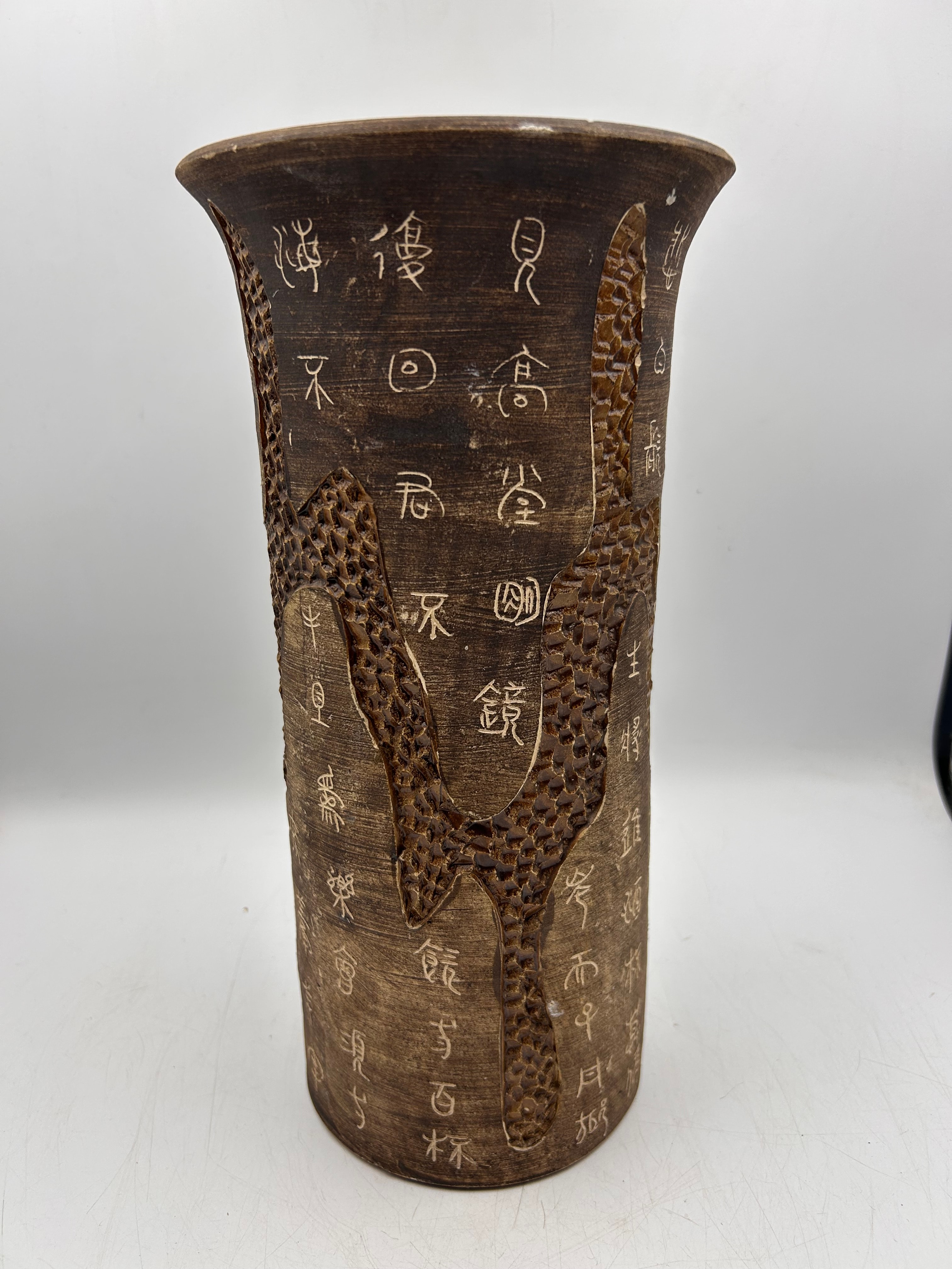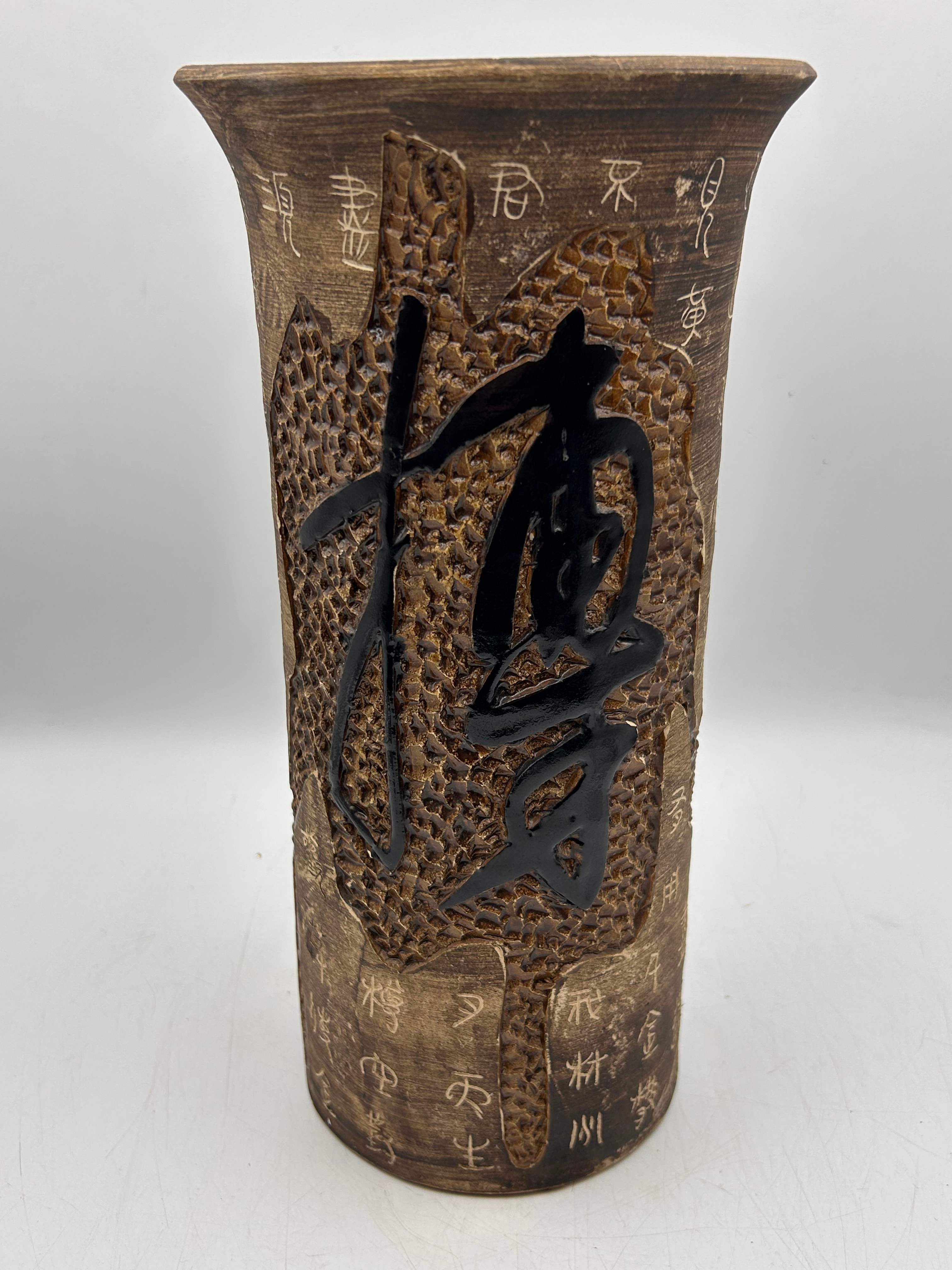 A tall, cylindrical ceramic vessel, likely a vase or brush pot, crafted from a dark brown, unglazed or matte-finished earthenware or stoneware. Its exterior is extensively decorated with deeply carved Chinese characters, forming a textured surface that incorporates a prominent, stylized, and dimpled pattern resembling a dragon or abstract natural element. On one side, a large, calligraphic character “福” (fú), meaning “fortune,” “blessing,” or “good luck,” is highlighted in black against the brown textured background. Other carved characters, including “德” (dé – virtue) and “鏡” (jìng – mirror), appear to form a continuous text, suggesting poetry or a philosophical passage.
