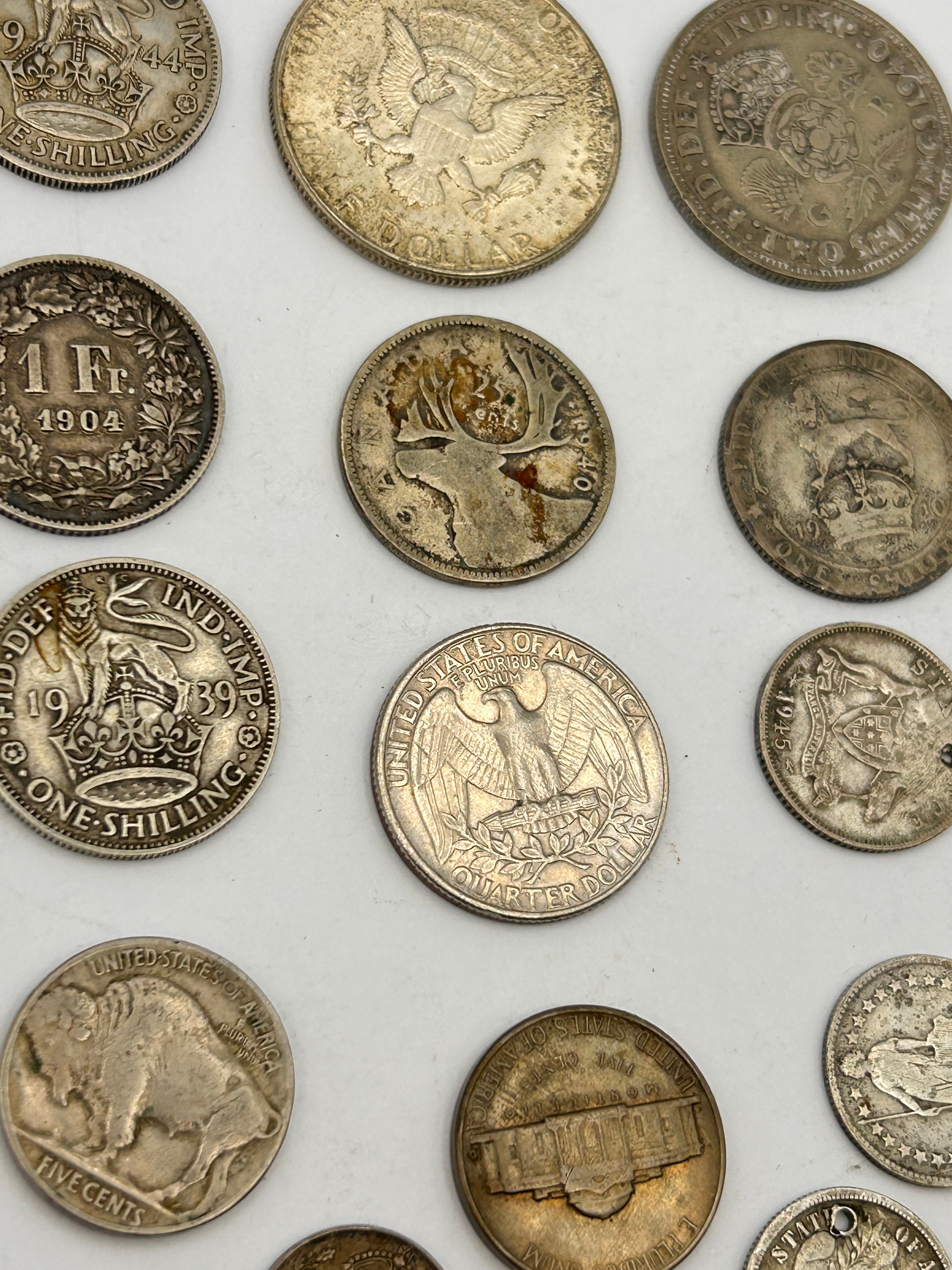 A collection comprising approximately 17 coins from various countries and periods, primarily in silver-toned metals, with some copper/bronze examples. The collection includes British coinage such as shillings dated 1902 (Edward VII, inscribed “EDWARDUS VII D:G: BRITT:OMN:REX F:D:IND:IMP.”), 1939, and 1944 (George VI, inscribed “GEORGIVS VI D:G: BR:OMN:REX F:D:IND:IMP.”). Also present is a French 1 Franc coin dated 1904. American coinage in the collection features a Buffalo nickel (dated 1940), a Jefferson nickel (dated 1944), a Barber dime (early 1900s), a Standing Liberty quarter (1920s), and other quarters, all bearing “UNITED STATES OF AMERICA” and “E PLURIBUS UNUM.” A Canadian coin with a moose design, dated in the 1940s, is also visible. The visible dates across the collection range from the early 1900s up to 1944. Notably, the collection includes several United States quarters. Research indicates that certain minting errors on quarters from this period, such as die errors, missing words, or off-center strikes, can significantly enhance their numismatic value, with comparable examples achieving substantial prices in the market.