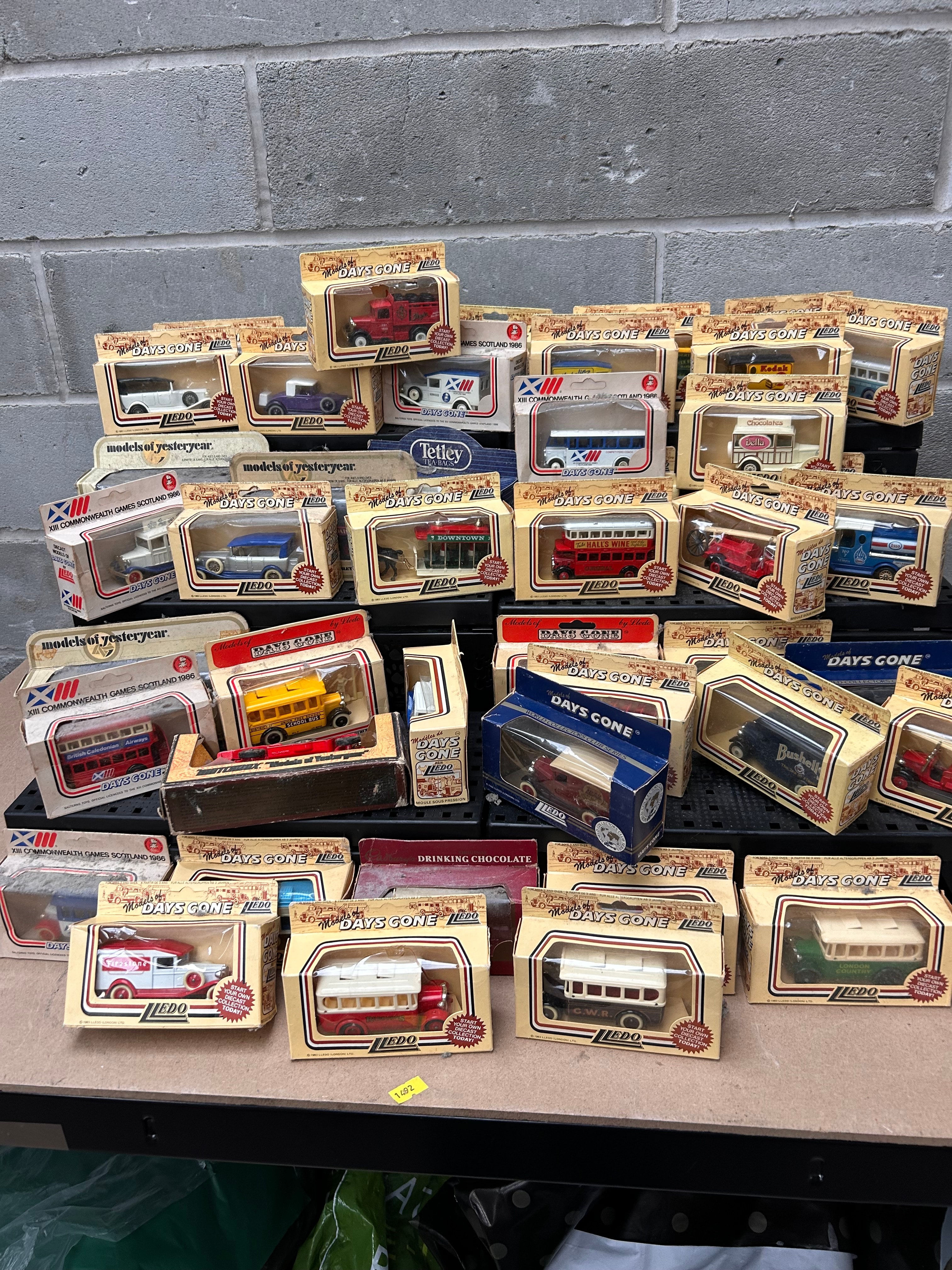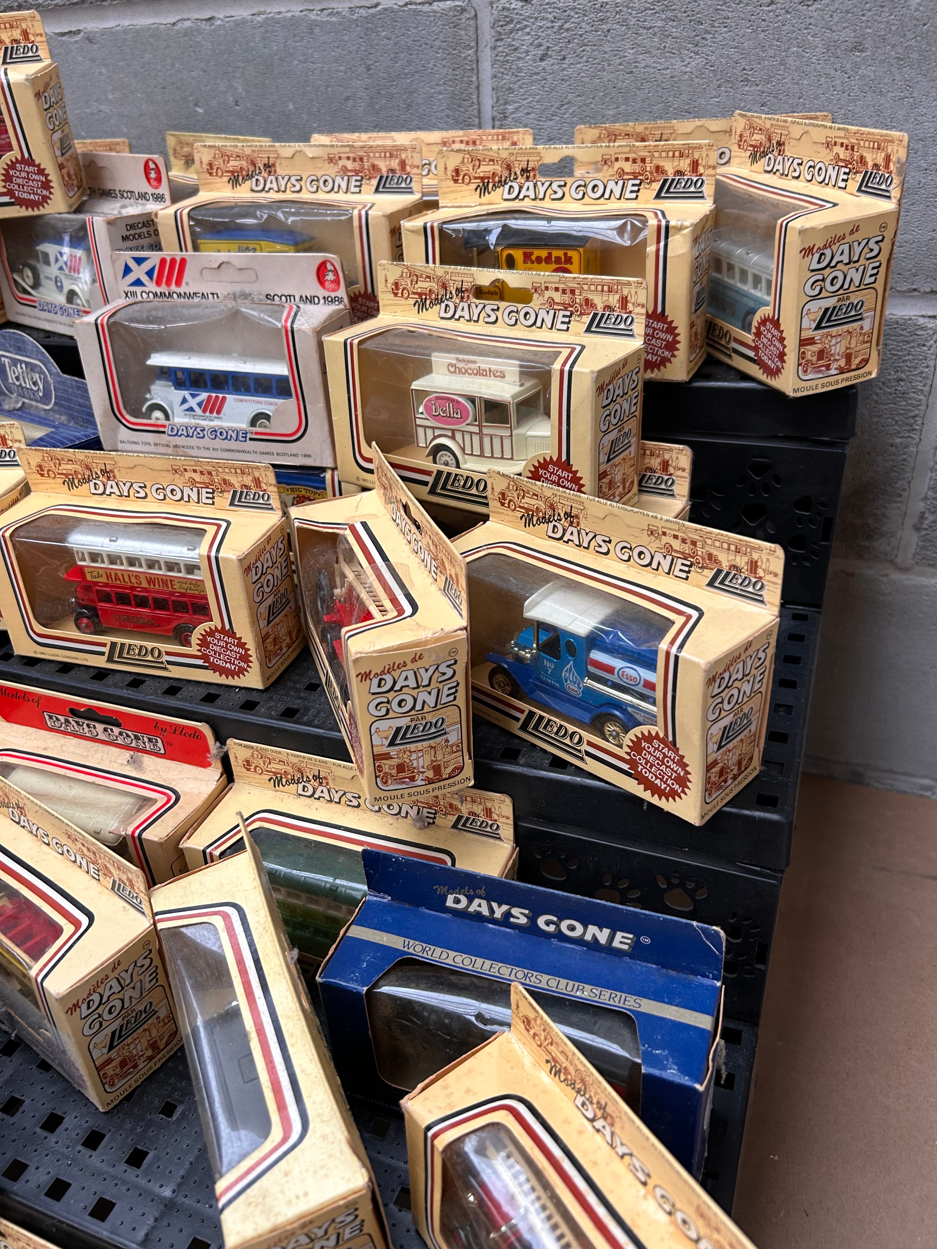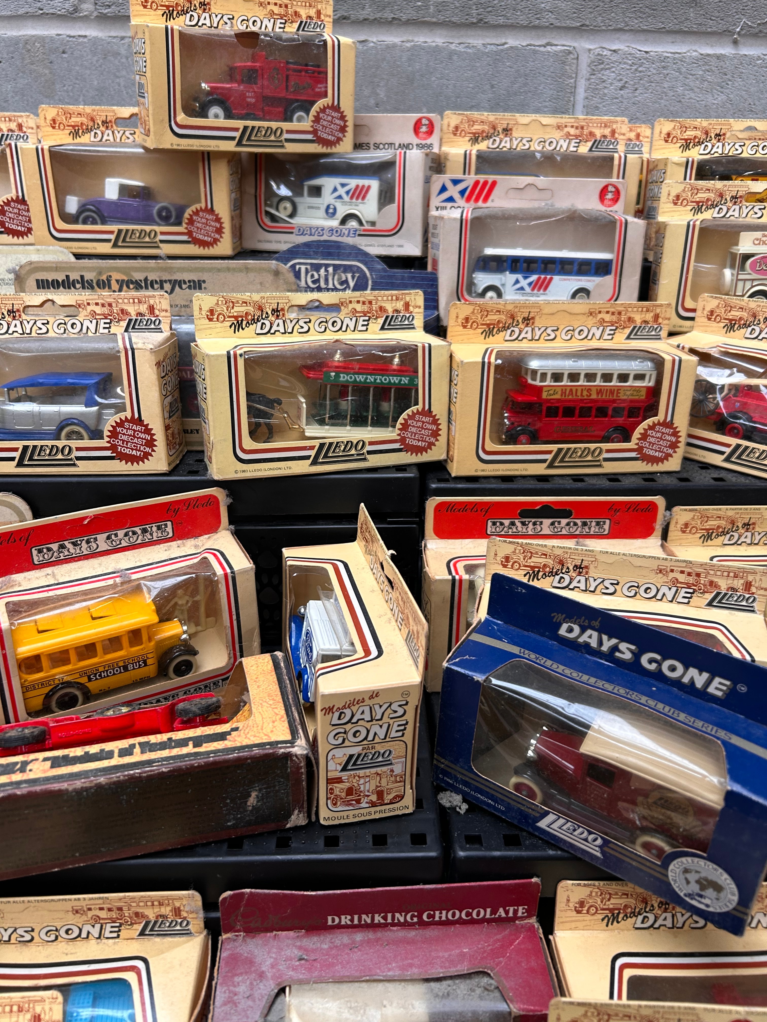 A collection of Lledo Days Gone die-cast model vehicles, many being promotional issues. The collection comprises numerous die-cast model vehicles, primarily cars, vans, buses, and trucks, predominantly from the “Lledo Days Gone” series, alongside some “models of yesteryear” and “World Collectors Club Series.” Crafted from die-cast metal and plastic, these miniatures depict vintage designs evoking earlier 20th-century eras, presented in their original cardboard packaging with clear plastic windows. Visible markings include “Lledo,” “Days Gone,” and “Made in England.” Many vehicles feature specific liveries such as “Kodak,” “Tetley,” “Halls Wine,” “Drinking Chocolate,” “Chocolates,” “Downtown,” and “XII Commonwealth Games Scotland 1986.” One box also displays the French text “MOULÉ SOUS PRESSION.”