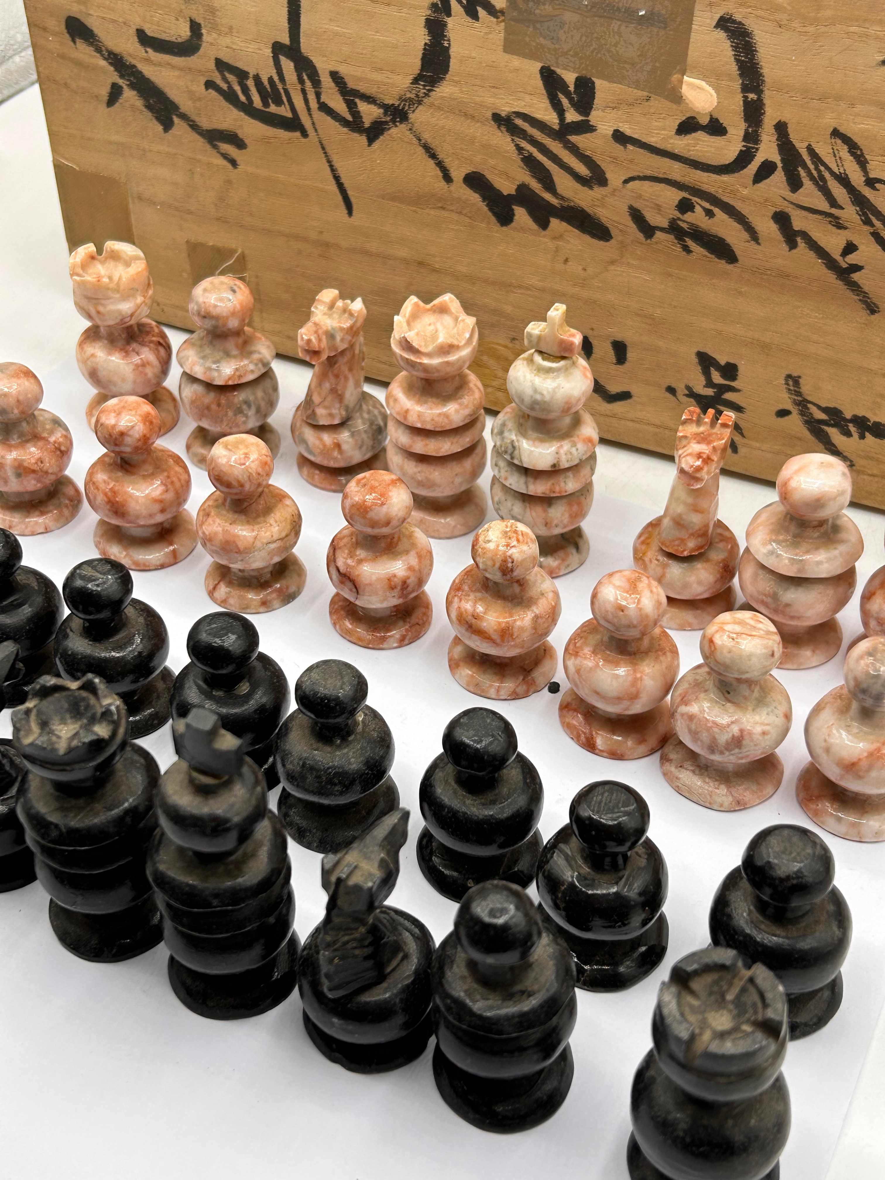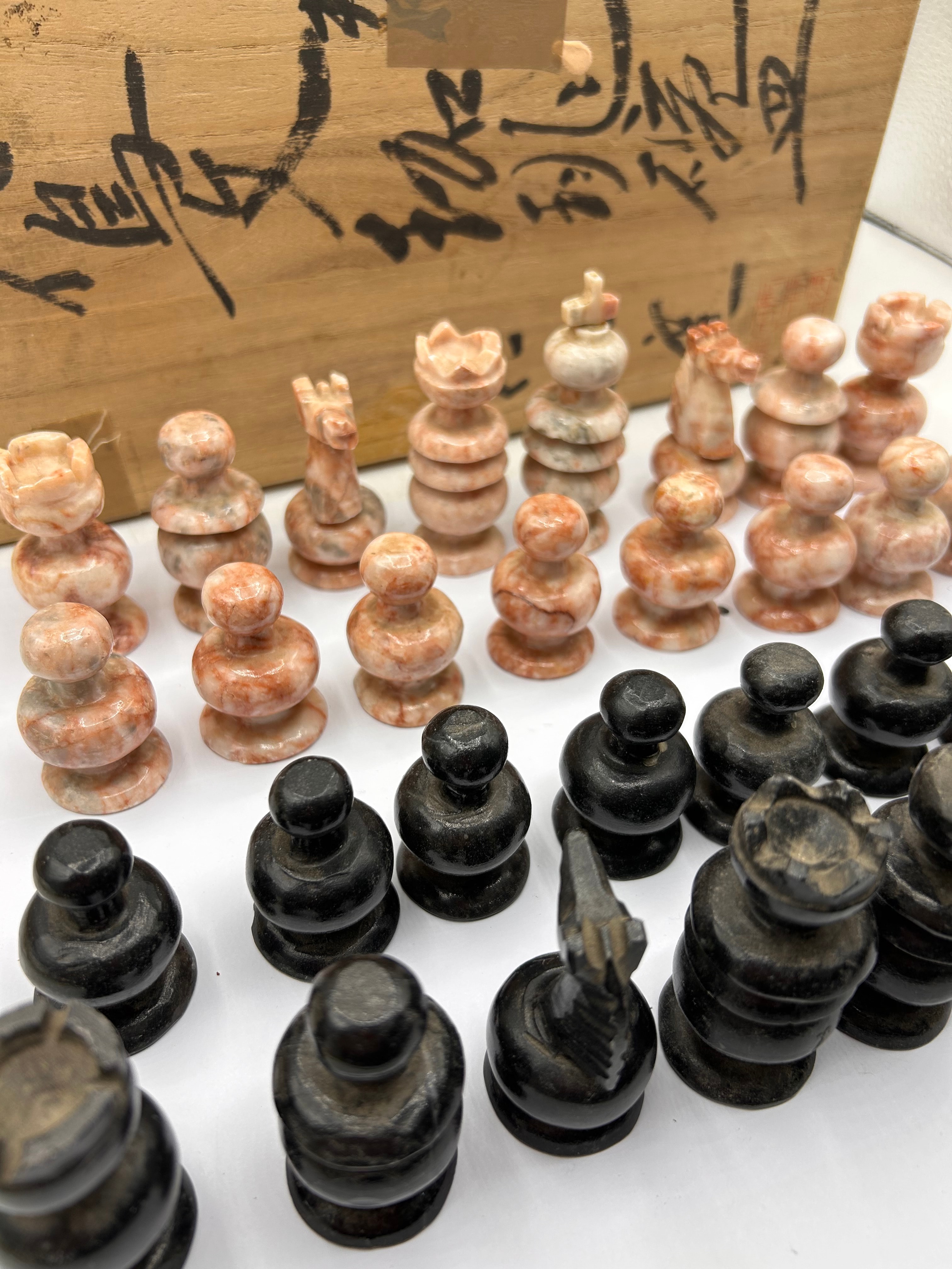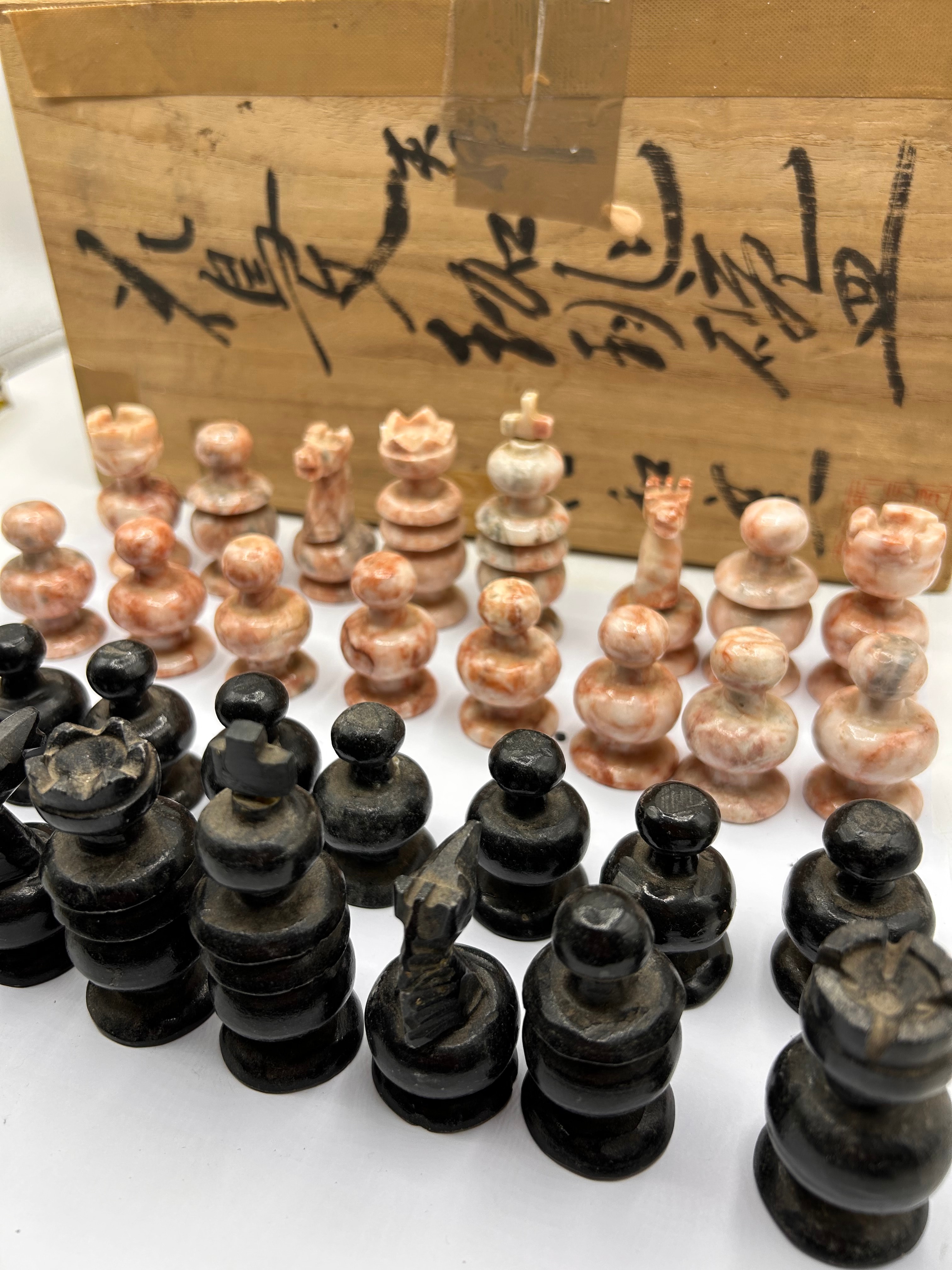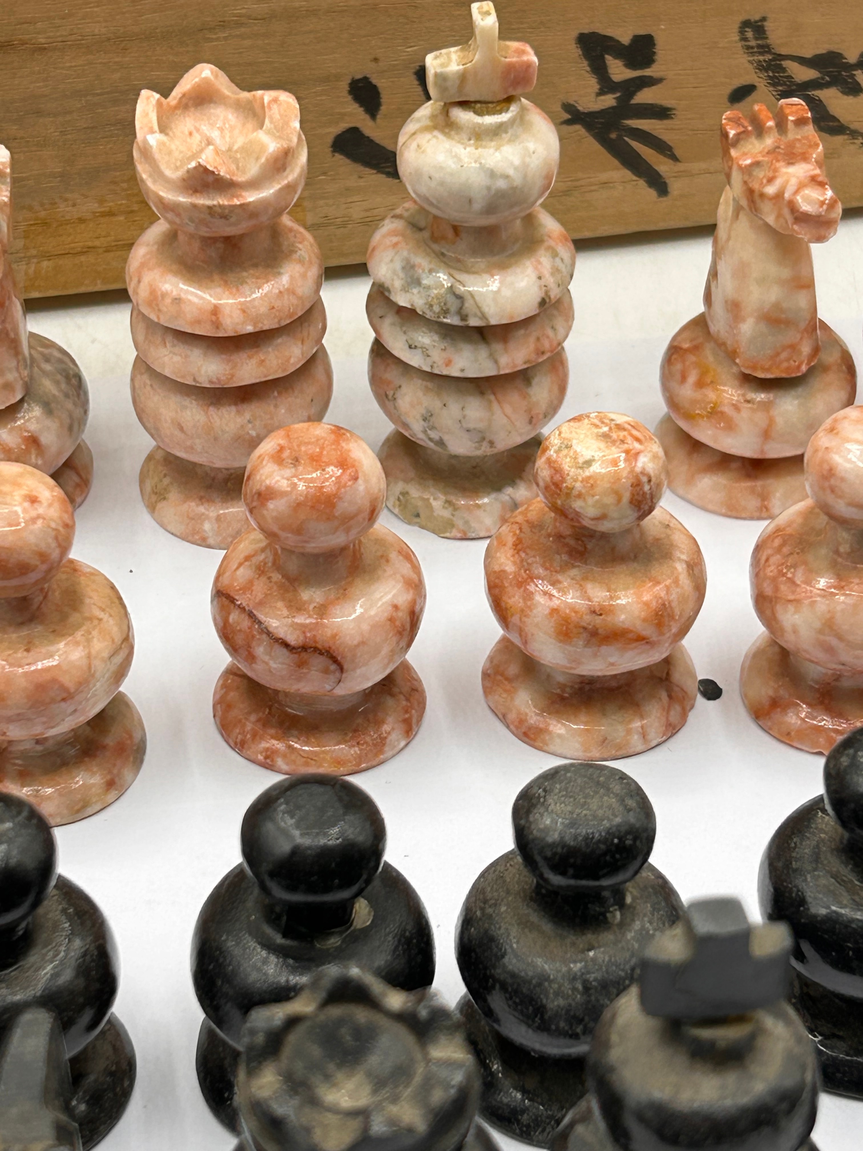 A Mexican Aztec hand-carved onyx marble chess set. This complete set comprises 32 chess pieces, hand-carved from onyx marble, with one set in dark, likely black or dark grey, and the opposing set exhibiting variegated pink, white, and beige tones, both finished with a polish. The pieces feature a simplified, traditional Staunton-like design. The set is accompanied by a light-colored wooden storage box. The wooden box bears prominent black brush script, which translates from Japanese as ‘御影石’ (granite), ‘黒御影’ (black granite), and ‘紅御影’ (red granite).