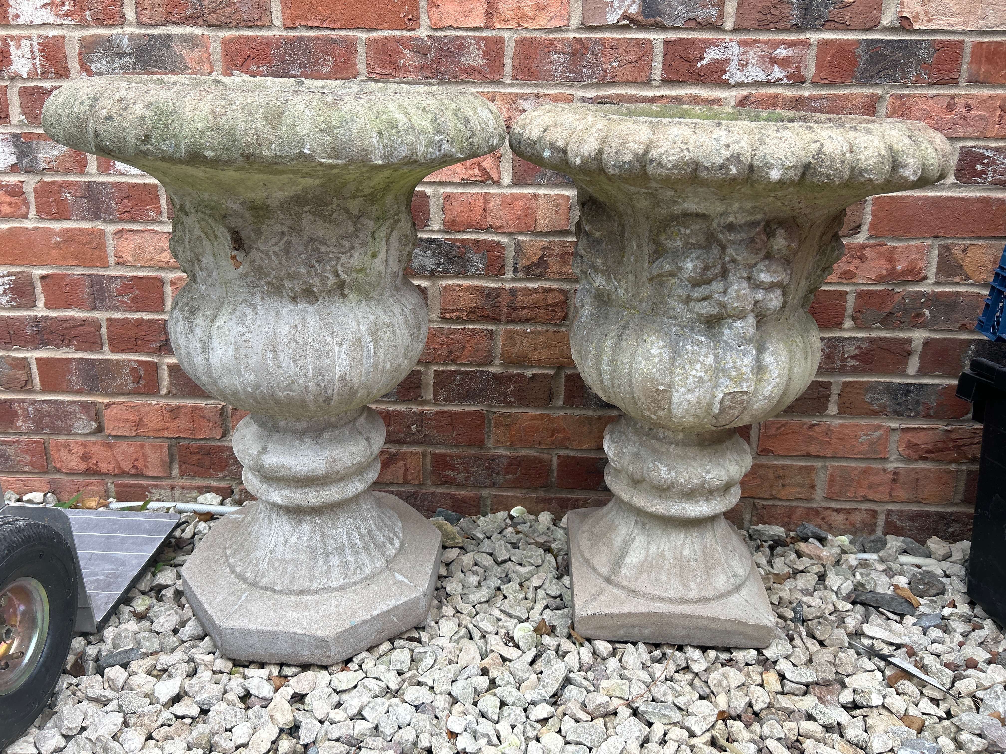 A pair of classical-style garden urns or planters, crafted from Stone. Each urn features a broad, shallow bowl with a fluted or gadrooned rim, a bulbous body adorned with partially obscured relief decoration, and a ribbed pedestal. They stand on substantial plinths, one octagonal and the other square.
