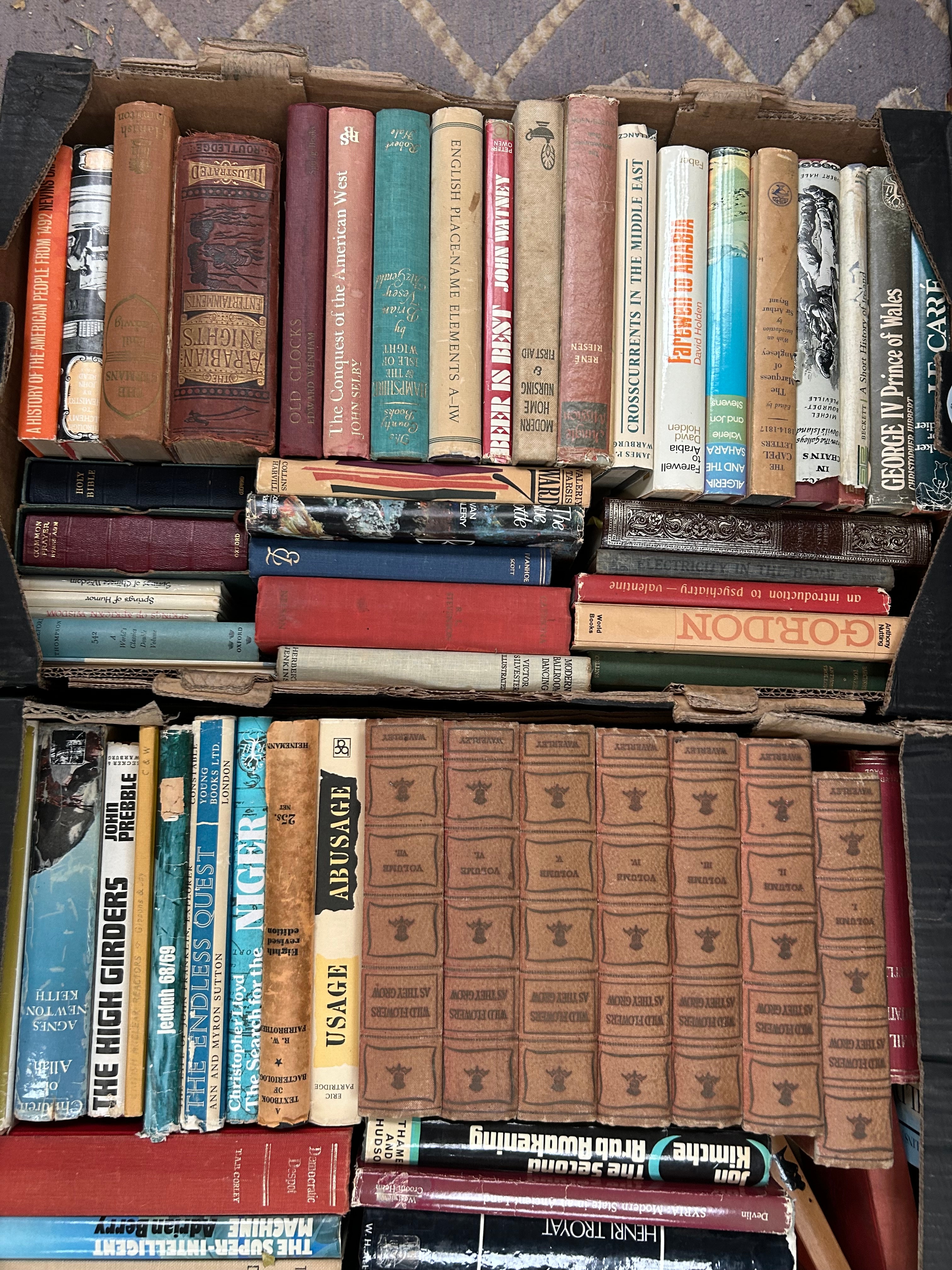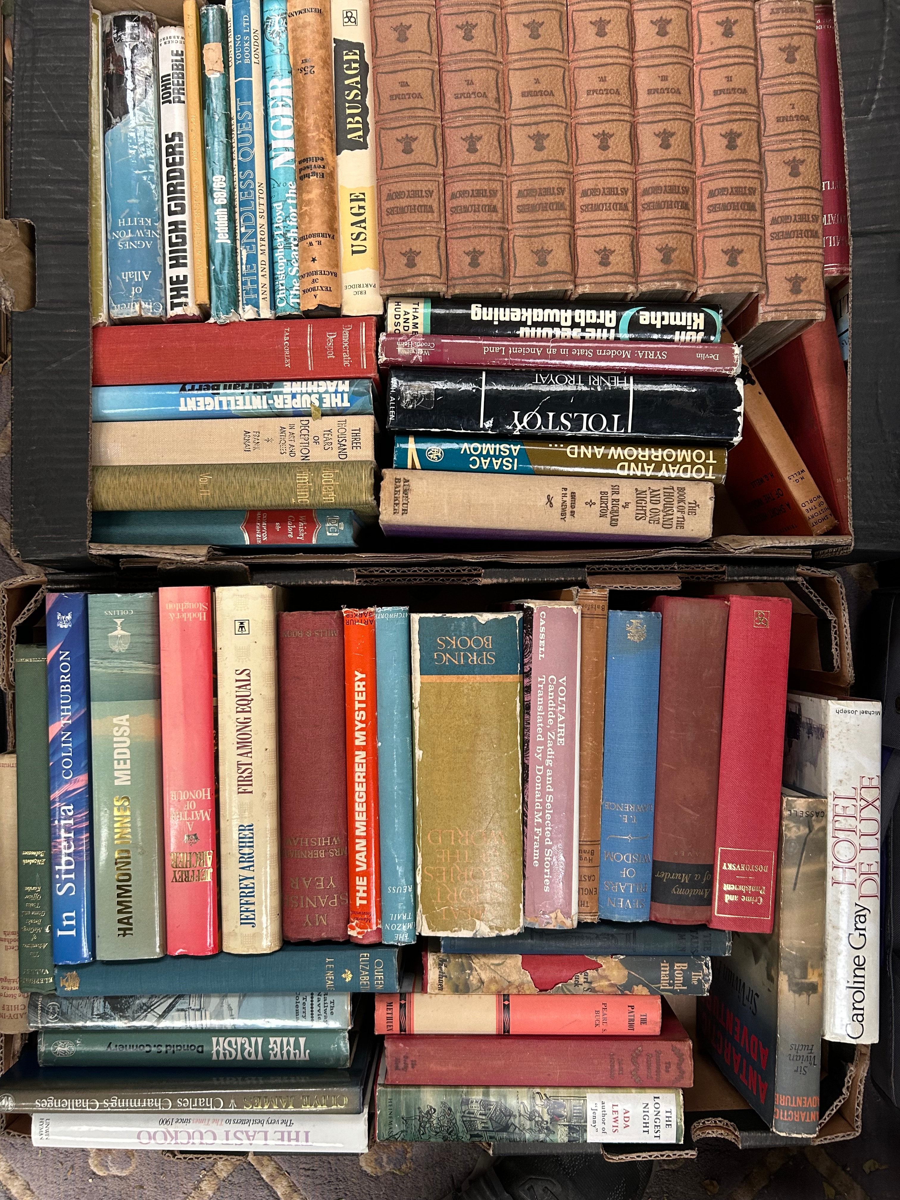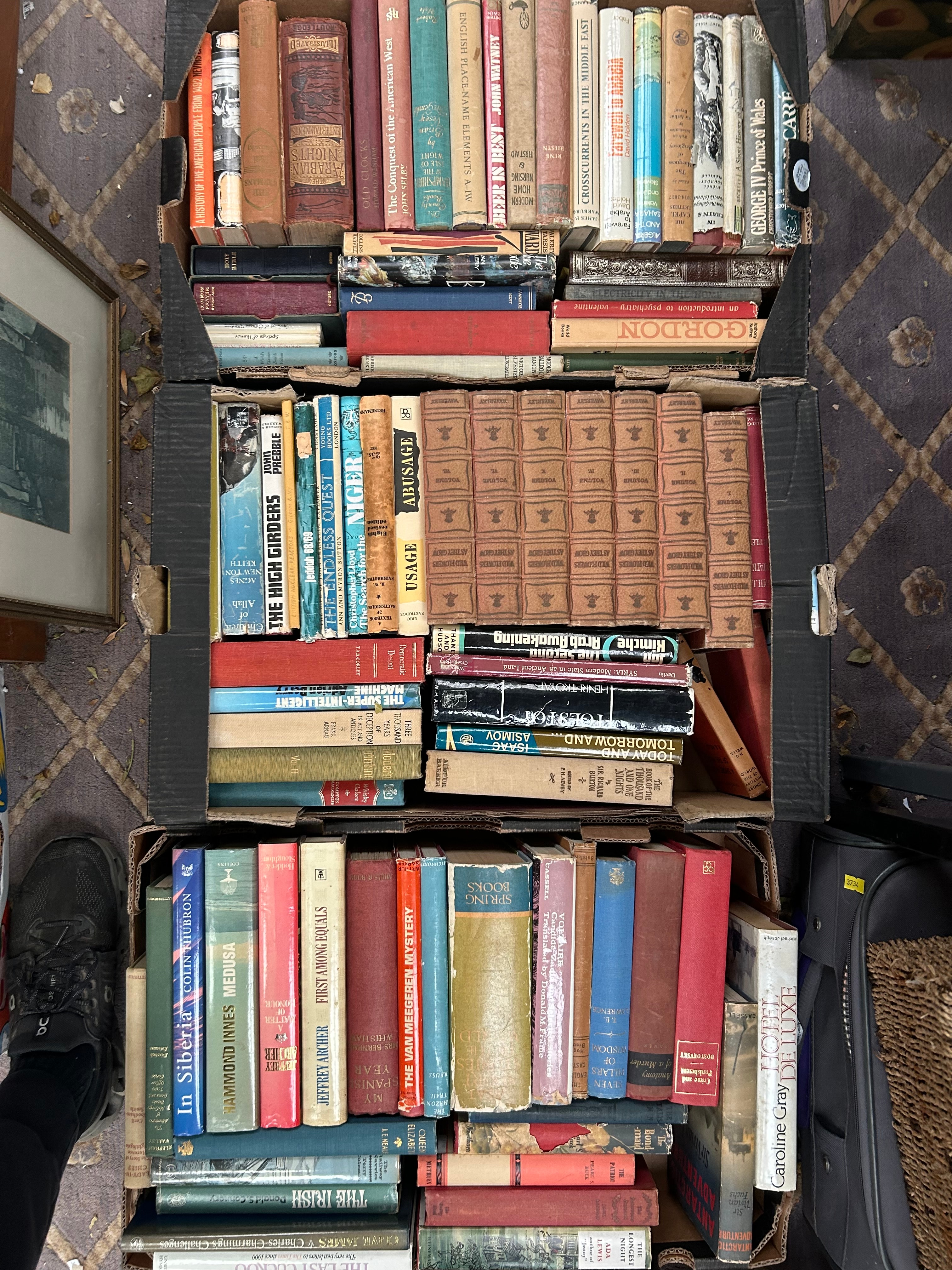 A collection of general interest books, presented in two cardboard boxes. This substantial collection of used hardback books spans various periods, largely 20th-century, and covers a diverse range of subject matter. Prominent authors and titles include Isaac Asimov, Tolstoy, Jeffrey Archer, Colin Thubron (“In Siberia”), and John Prebble (“The High Girders”). Also present is a significant uniform set of approximately twenty reddish-brown embossed volumes titled “WILD FLOWERS AS THEY GROW” and marked “VOLUMES.” Materials primarily consist of cloth or paper-covered boards, with some bindings suggesting older construction, possibly leather. Visible foreign language text includes the German title “KIRCHE KRAB BEWEHUNG” and potential Hebrew transliterations such as “HAGINE” and “SYNRI.”