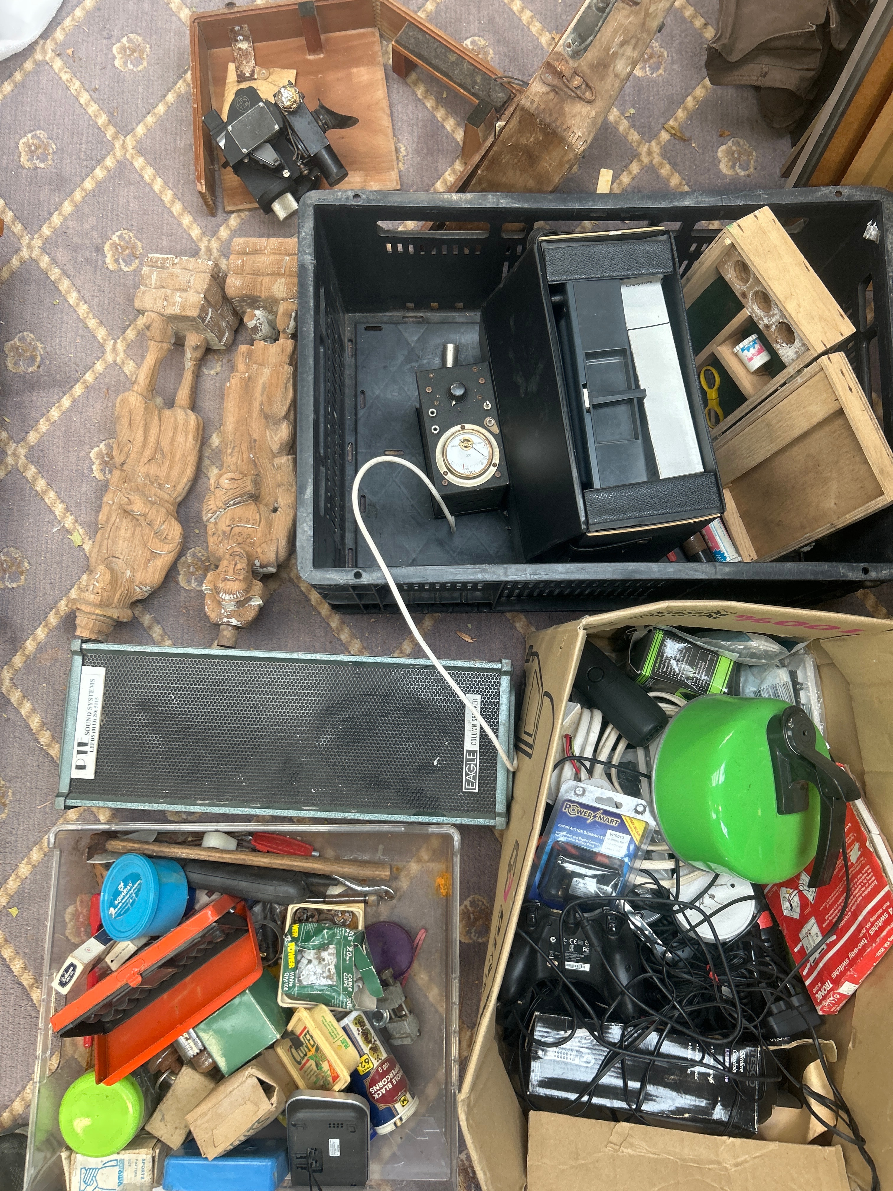 This lot comprises a varied assortment of goods. Key among these is a Kodak Carousel 860H Slide Projector, identified through web intelligence. Also present is a black metal vintage camera component marked “VOIGTLÄNDER BRAUNSCHWEIG GERMANY,” housed near a wooden case. The lot includes two ornately carved light-wood figures, possibly corbels or architectural elements, and a grey-grille “EAGLE COLUMN SPEAKER” bearing “DIL SOUND SYSTEMS LEEDS” branding. Further items include a black metal electrical device with a “VOLTS” meter, a black case marked “Made in Germany,” and a collection of modern and vintage electronics, cables, a green lantern-like object, and various household items such as “Whole Black Peppercorns” and “Aquafresh” within a cardboard box.