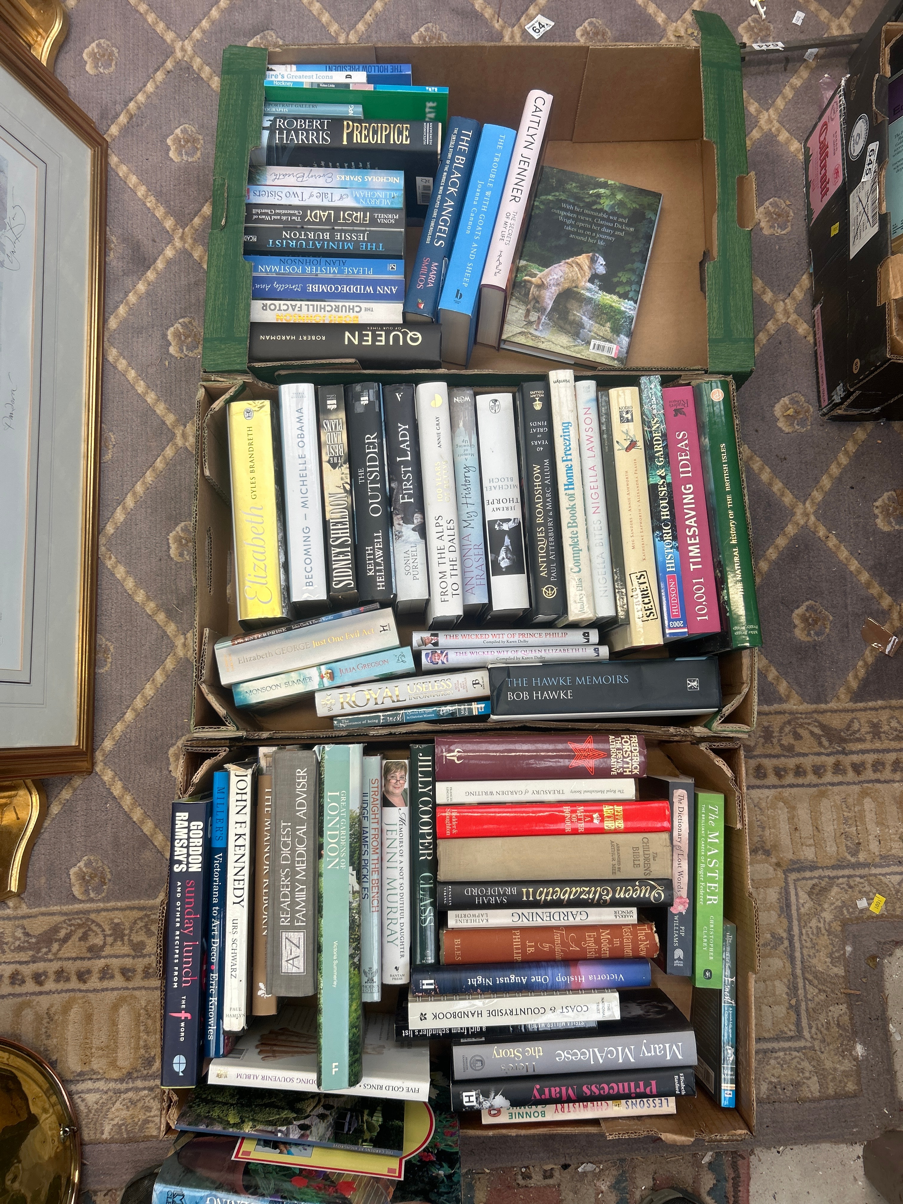 This lot comprises a large collection of English-language books, predominantly hardback and paperback editions, contained within three utilitarian cardboard boxes. One of the boxes features a green-painted internal divider. The collection spans various genres including contemporary biography (e.g., Caitlyn Jenner, Michelle Obama, Queen Elizabeth II, John F. Kennedy), historical non-fiction, fiction, cookbooks (e.g., Nigella Lawson, Gordon Ramsay), gardening, nature, and general reference works, suggesting a period primarily from the late 20th to 21st centuries. Visible titles include “Precipice” by Robert Harris, “The Black Angels,” “Becoming” by Michelle Obama, “Caitlyn Jenner: The Secrets of My Life,” and “Antiques Roadshow,” among many others. Publisher imprints such as Penguin, Orion, and Hutchinson are identifiable throughout the collection.