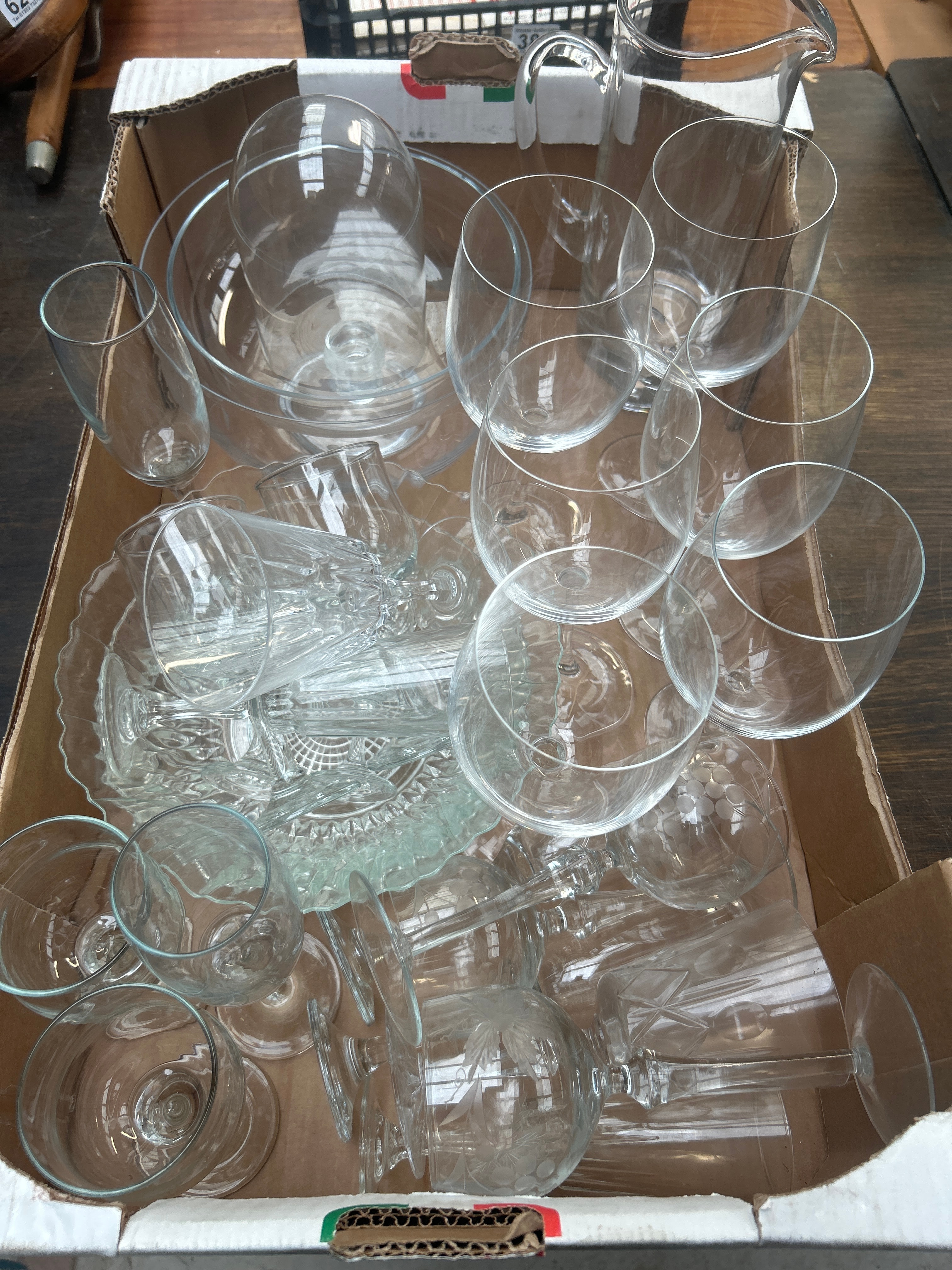 A group of approximately 25-30 pieces of clear glass domestic glassware. The collection encompasses various drinking vessels such as stemmed wine glasses, tumblers, and possibly champagne flutes, alongside a large serving bowl, a pitcher or carafe, and at least one decorative glass plate with a scalloped edge. Styles range from plain blown glass to pieces featuring etched designs, specifically a prominent grape and vine motif on some stemmed glasses, and others exhibiting cut or pressed geometric patterns. The items are loosely contained within a standard corrugated cardboard box, which bears a ’30’ marking on one flap, accompanied by a visual motif resembling the Italian flag (green, white, and red vertical stripes).