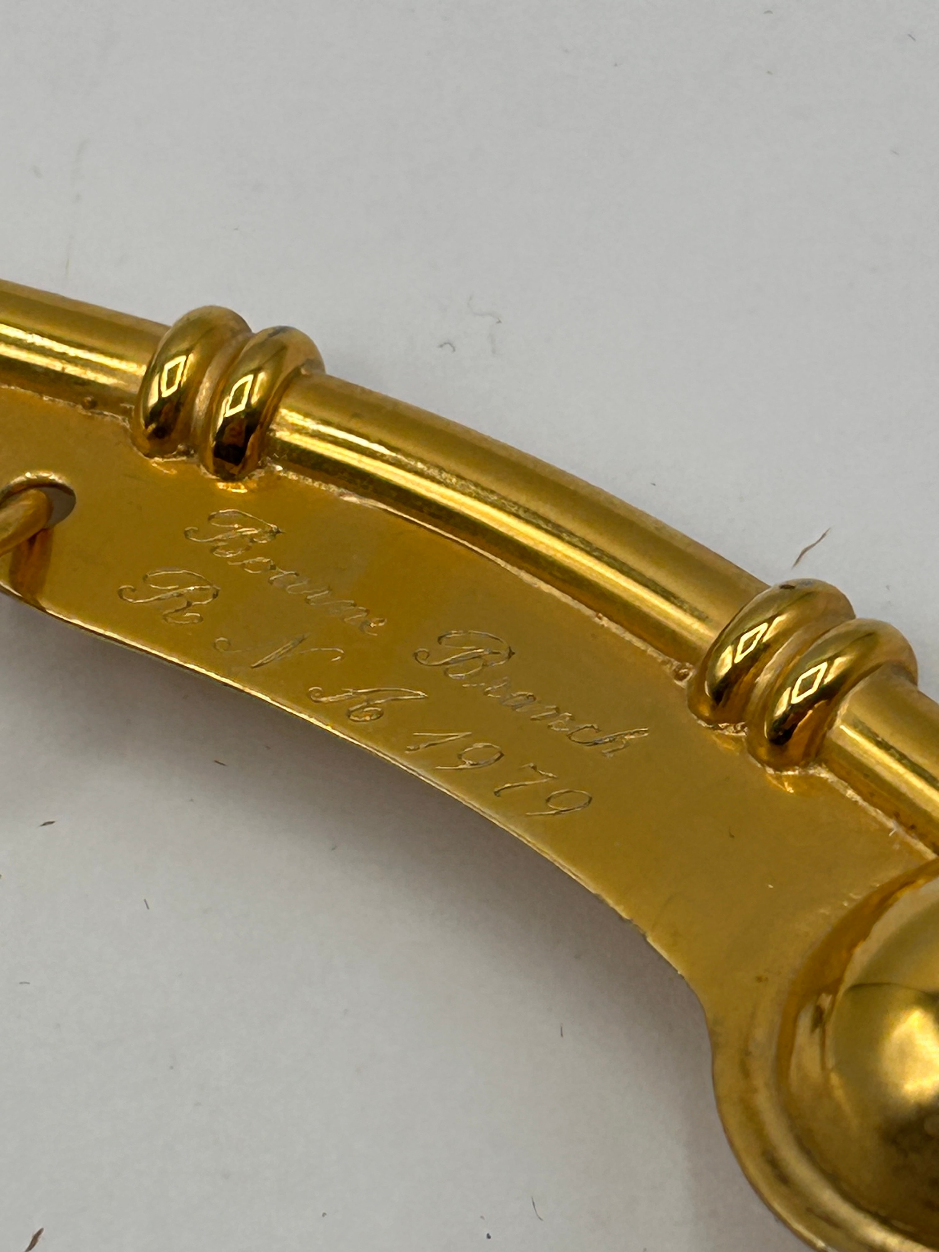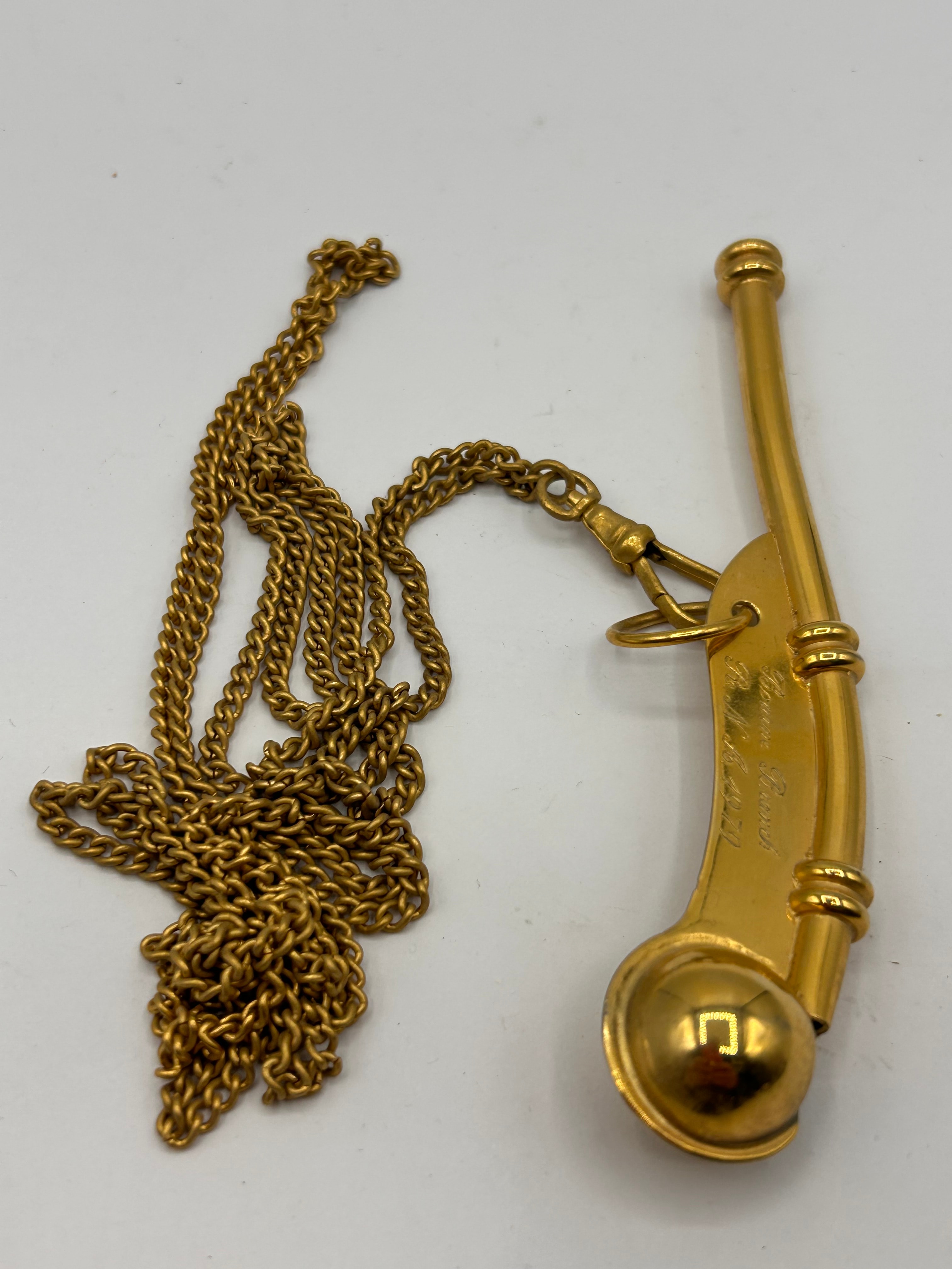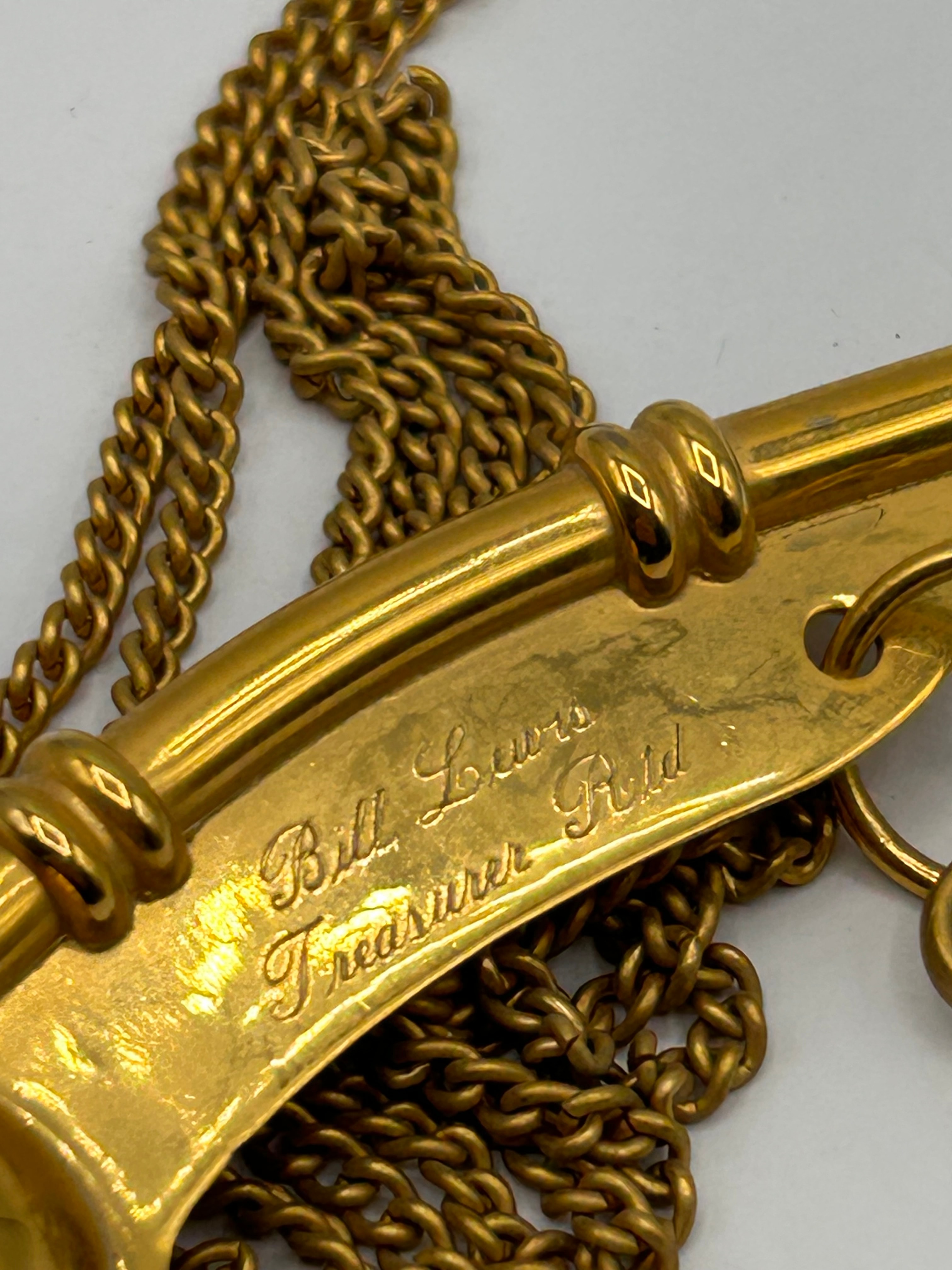 A brass Bosun’s Call whistle, gold-toned, featuring a traditional, polished design and suspended from a matching fine-link chain with a lobster clasp. Engraved on the body are the inscriptions ‘Forum Branch’, ‘2.1.1979’, ‘Bill Lewis’, and ‘Treasurer Rtd’ (Treasurer Retired), indicating its likely commemorative purpose.