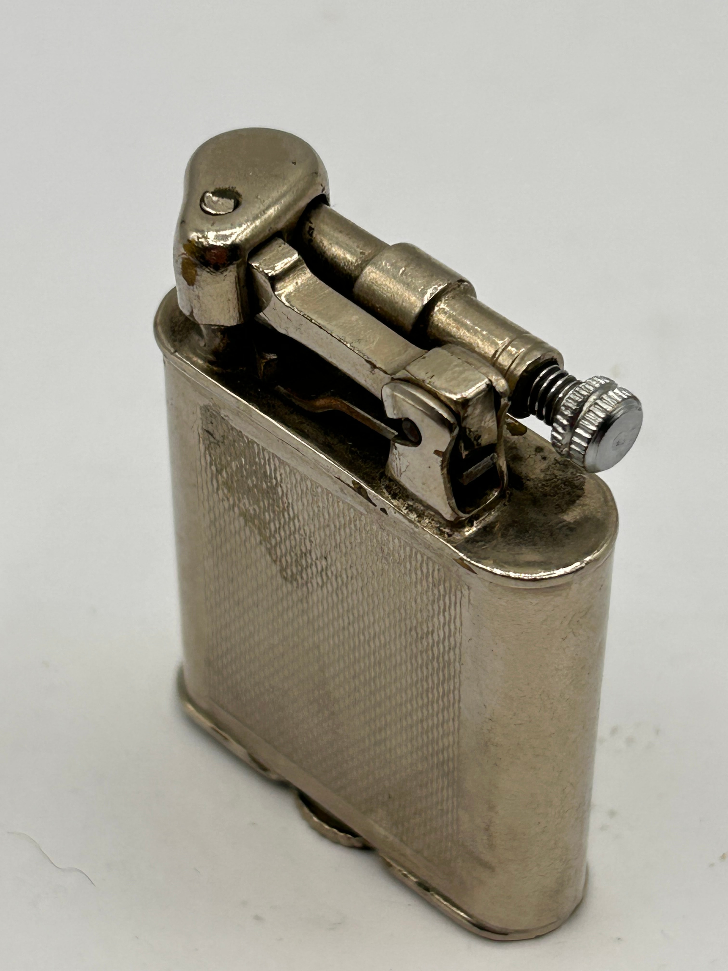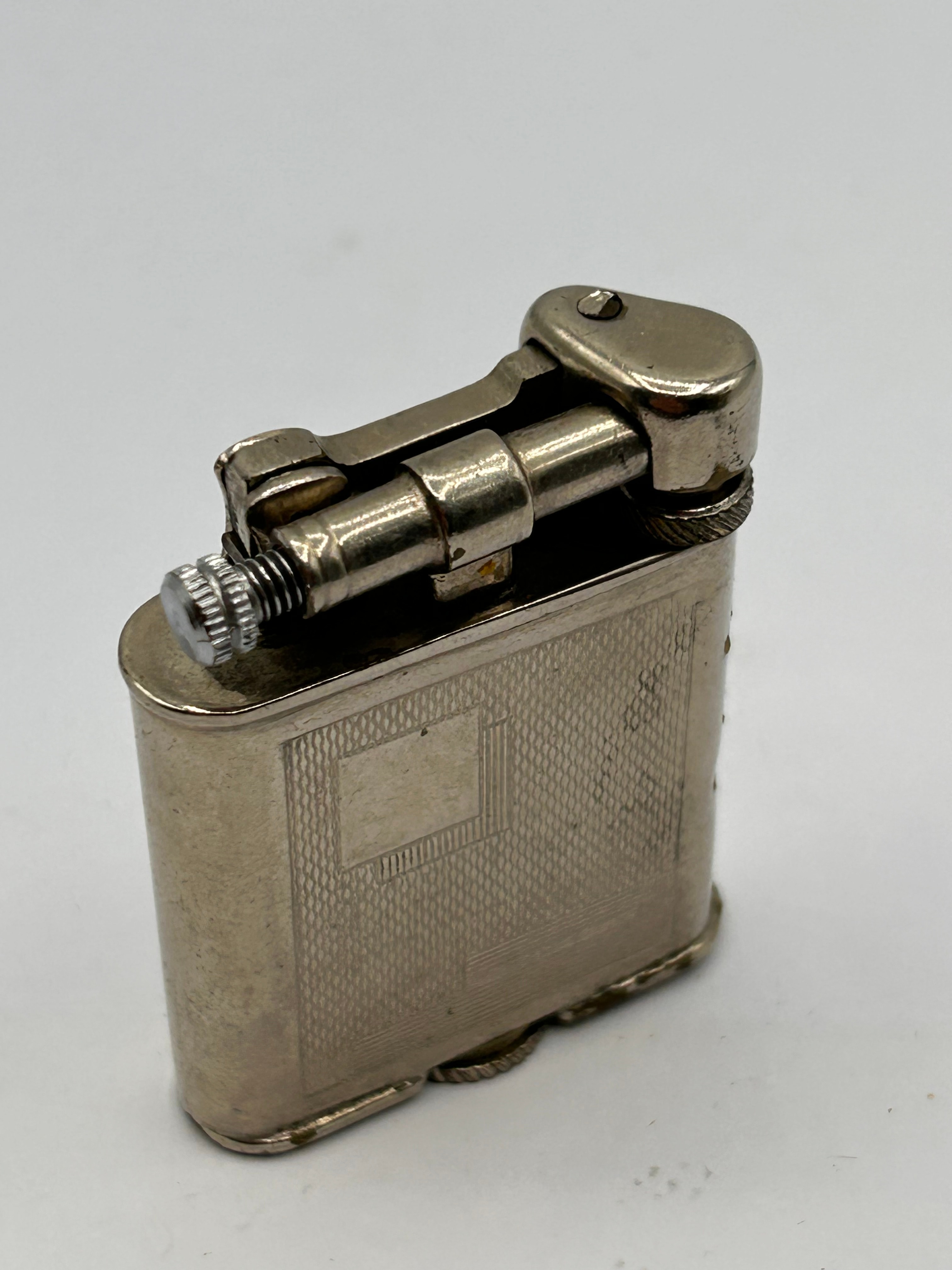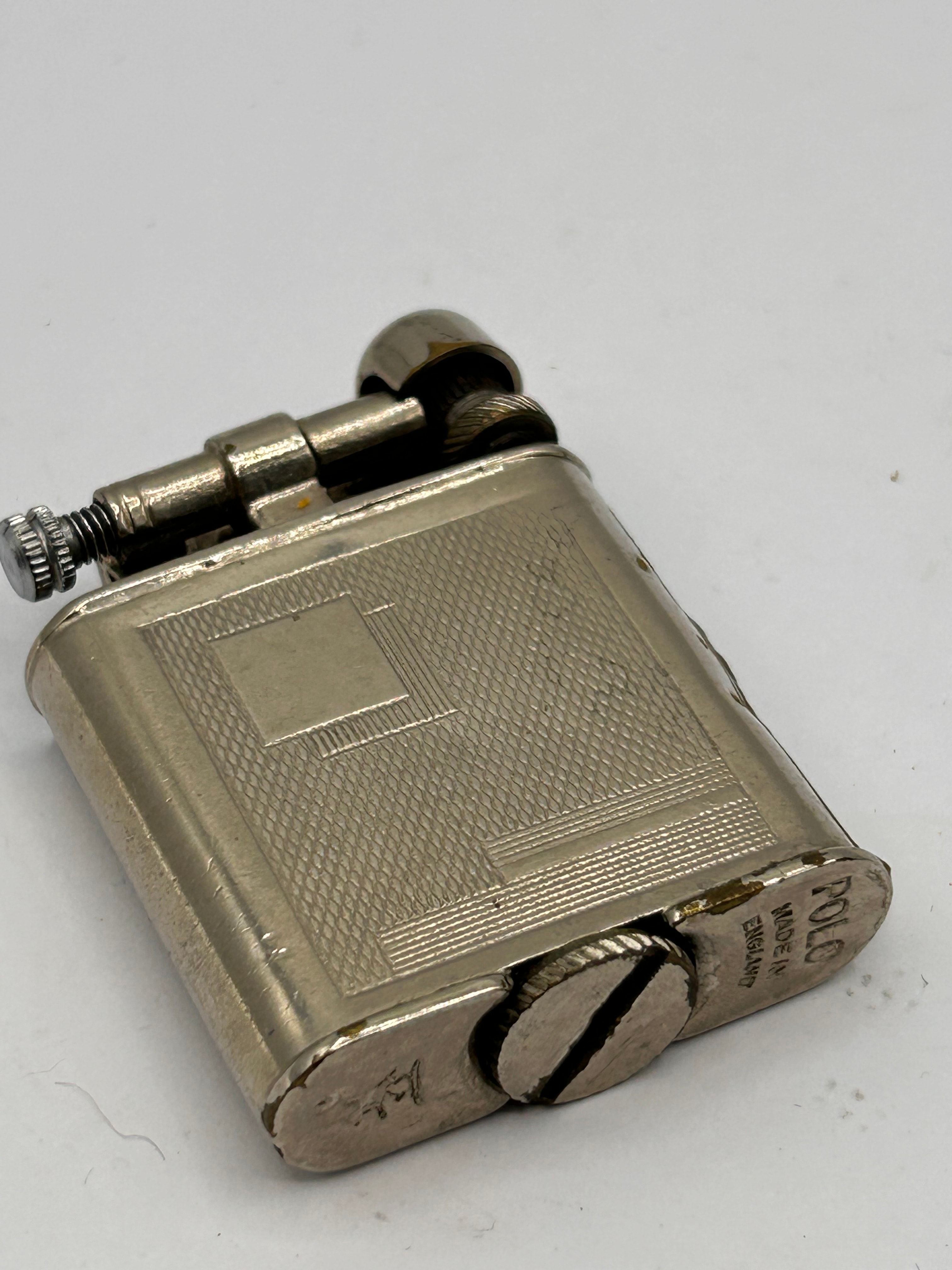 A Polo Art Deco lift-arm lighter, made in England. Crafted from a silver-toned metal, likely plated, with a rectangular form and gently rounded edges. Both primary faces are adorned with an engraved geometric pattern, featuring a central cross-hatched rectangle bordered by linear and cross-hatched designs, consistent with engine-turned decoration typical of mid-20th-century decorative styles. Visible markings on the base include “POLO” and “MADE IN ENGLAND.” A smaller, stylized, and currently illegible mark or initial is also present near the large slotted fuel screw.